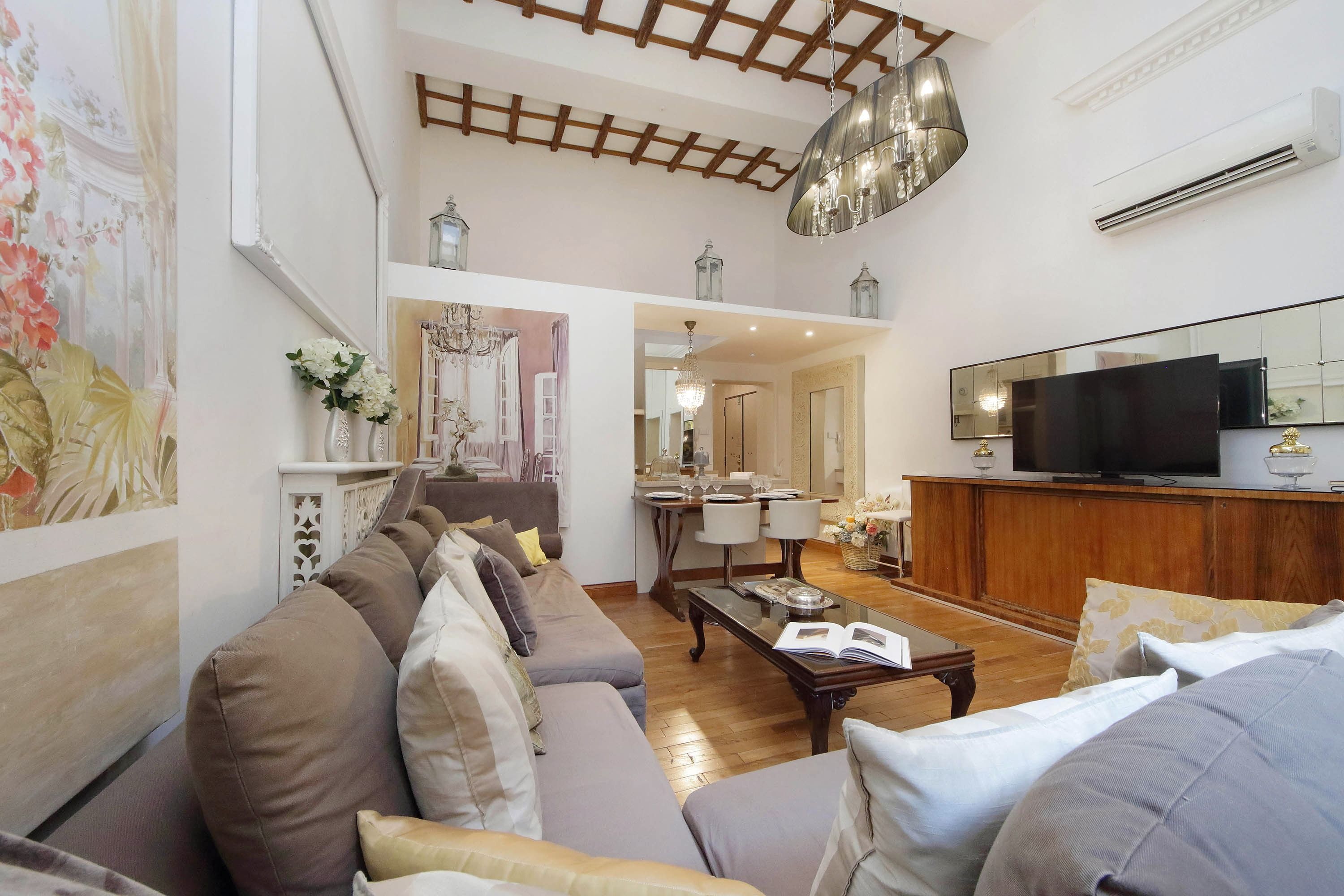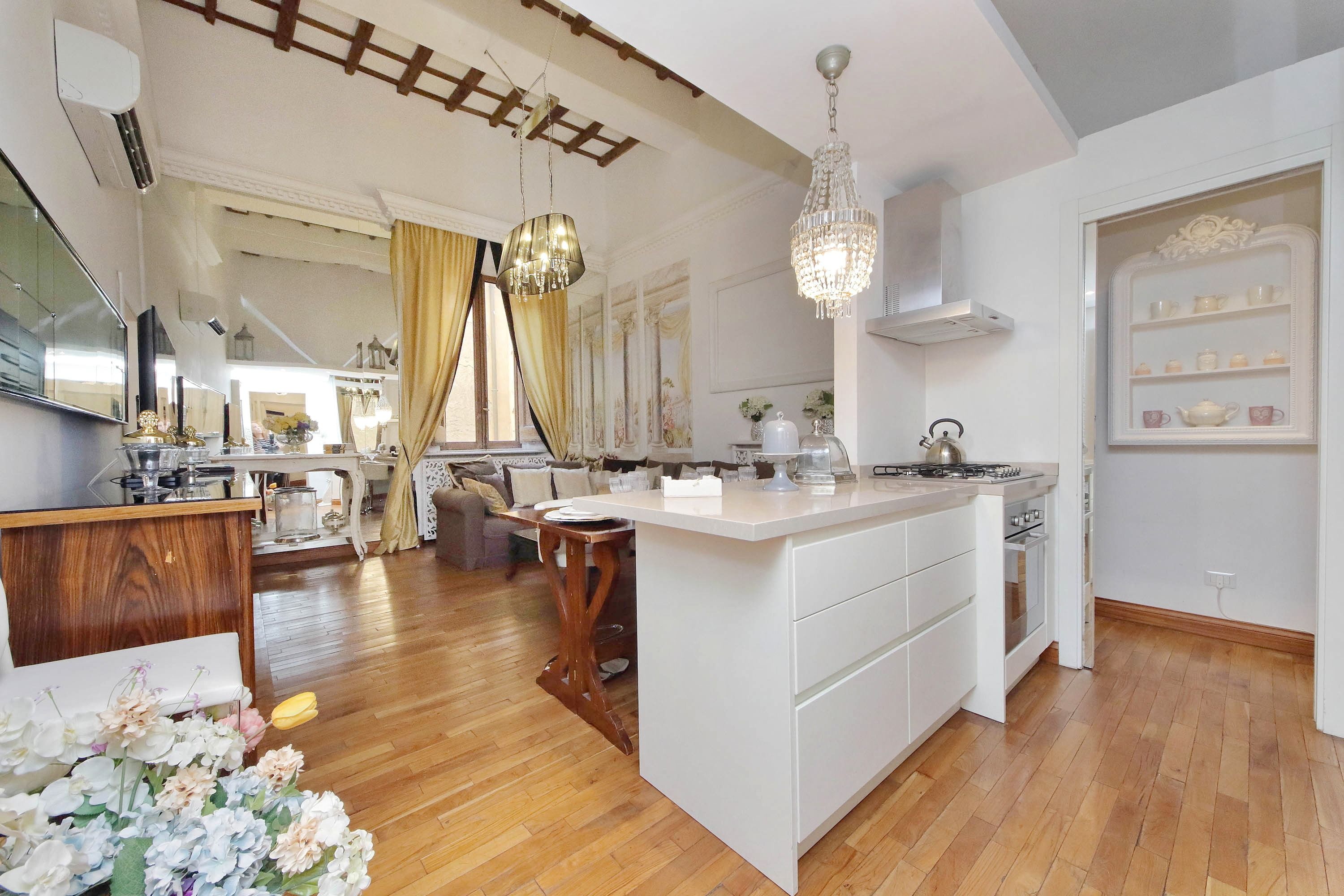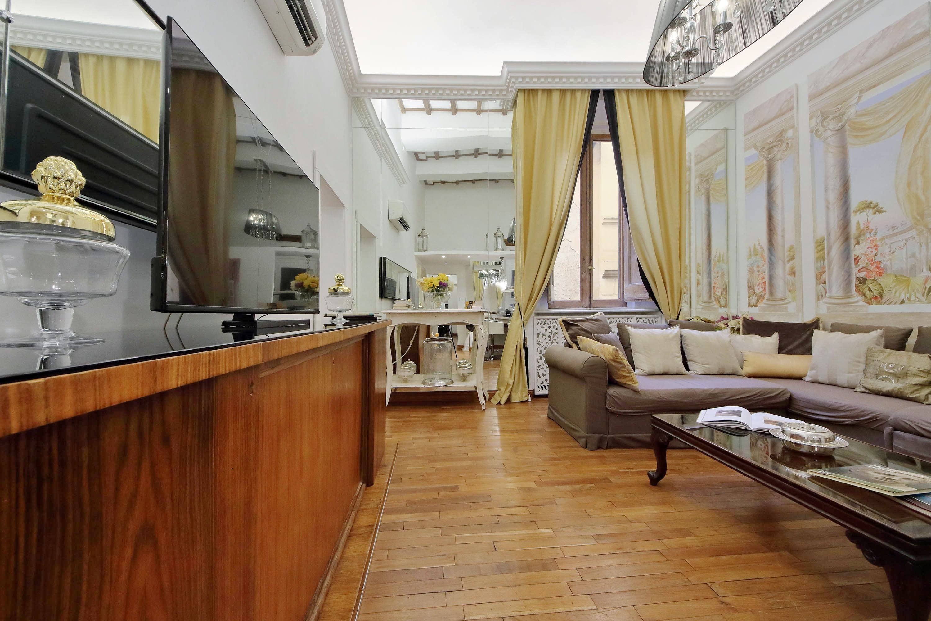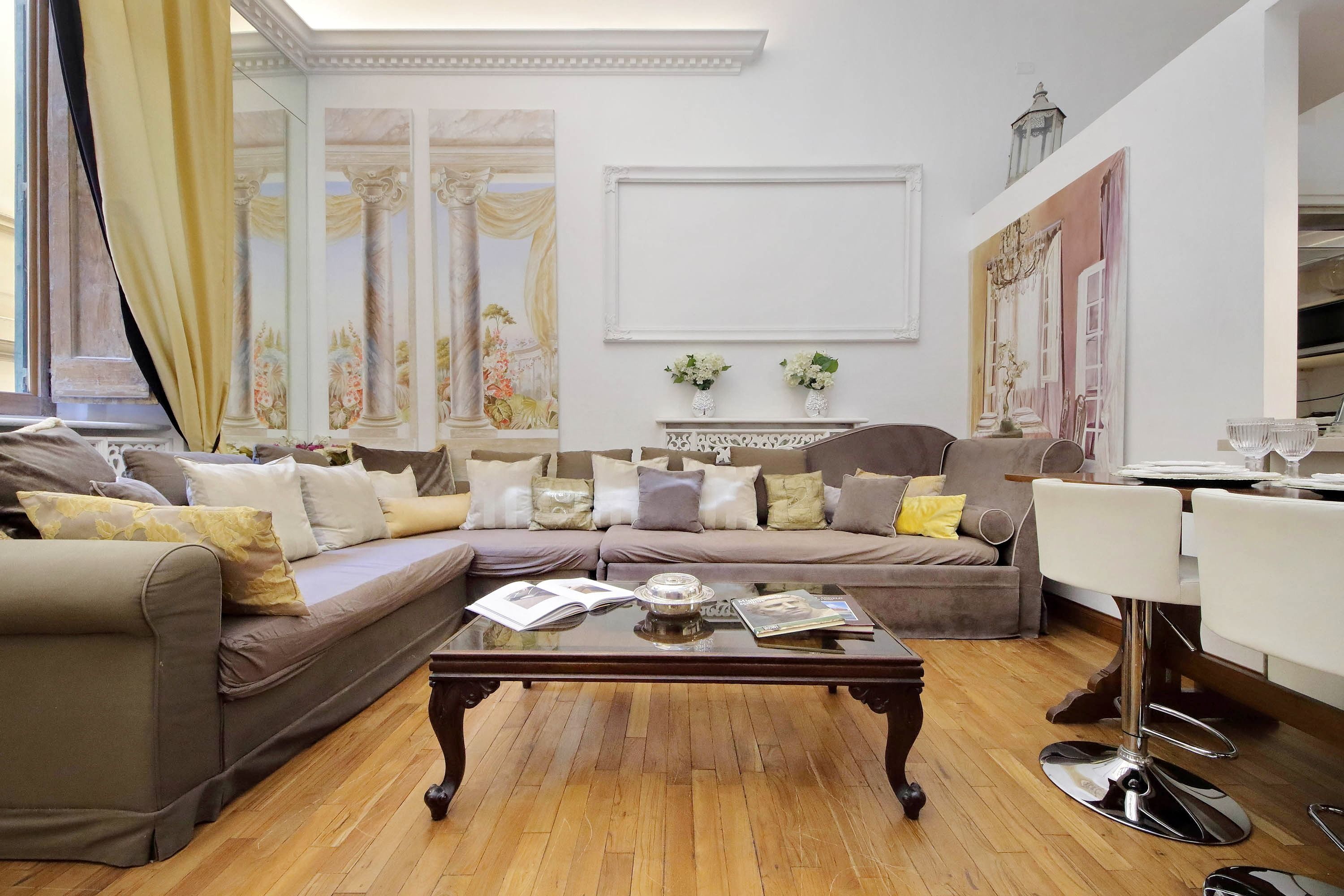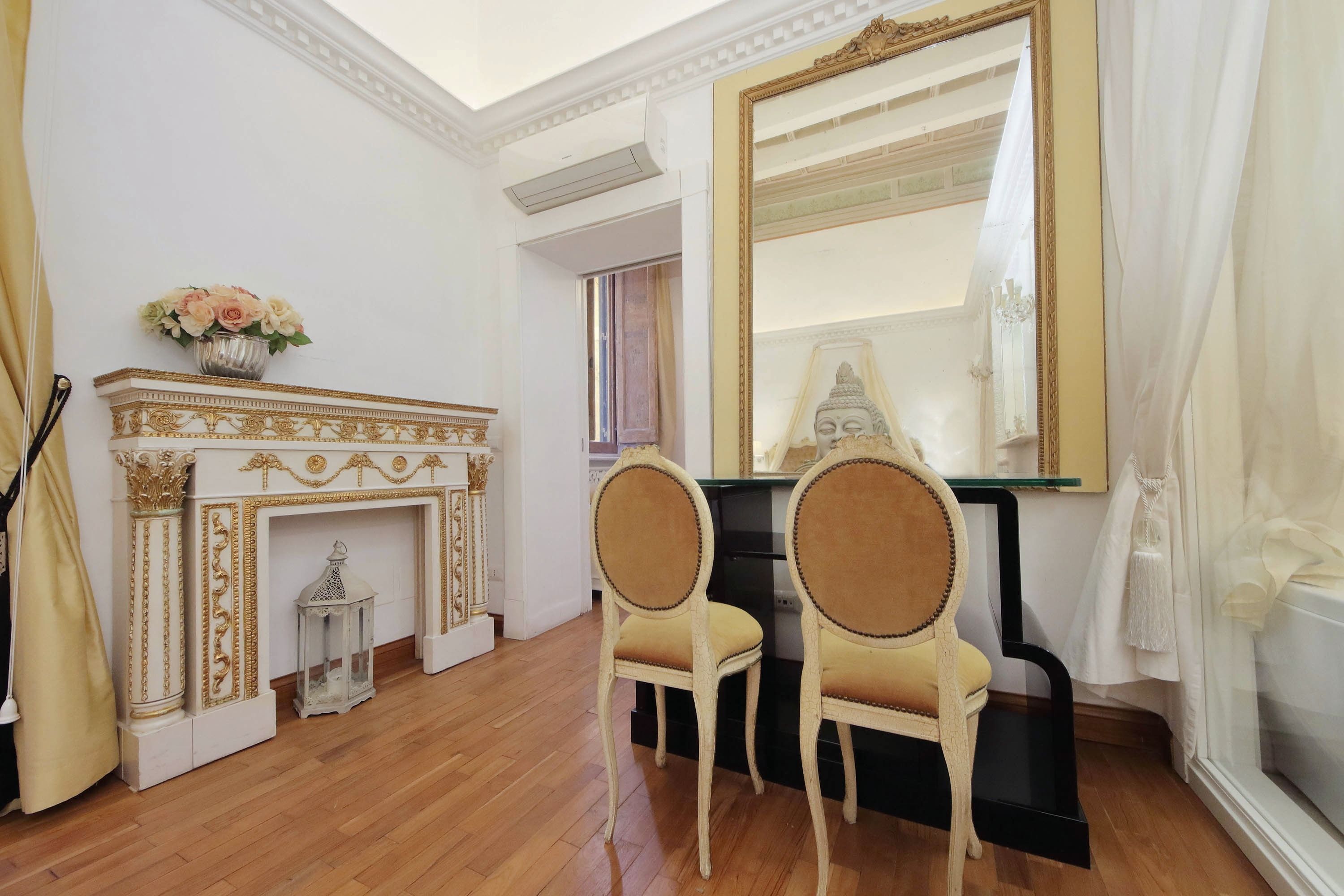 Adorned with hand-painted frescoes, gilded finishes and vibrant furnishings, this large apartment near Piazza Navona is full of character. While there are only two recognised bedrooms, the home can fit up to eight guests thanks to two sofa beds in the living area, which itself flows into a narrow kitchen area which doesn't afford much space for the dining table. The bedrooms themselves are adorned with mirrors, makeup chairs, fireplaces and other expressive design touches, with both offering en-suite bathrooms (though the primary bedroom's stands apart with its decadent corner bathtub). Stepping out of the building, you'll be right in the historic heart of Rome, with Campo de' Fiori less than five minutes away and the Forum reachable in twenty.
