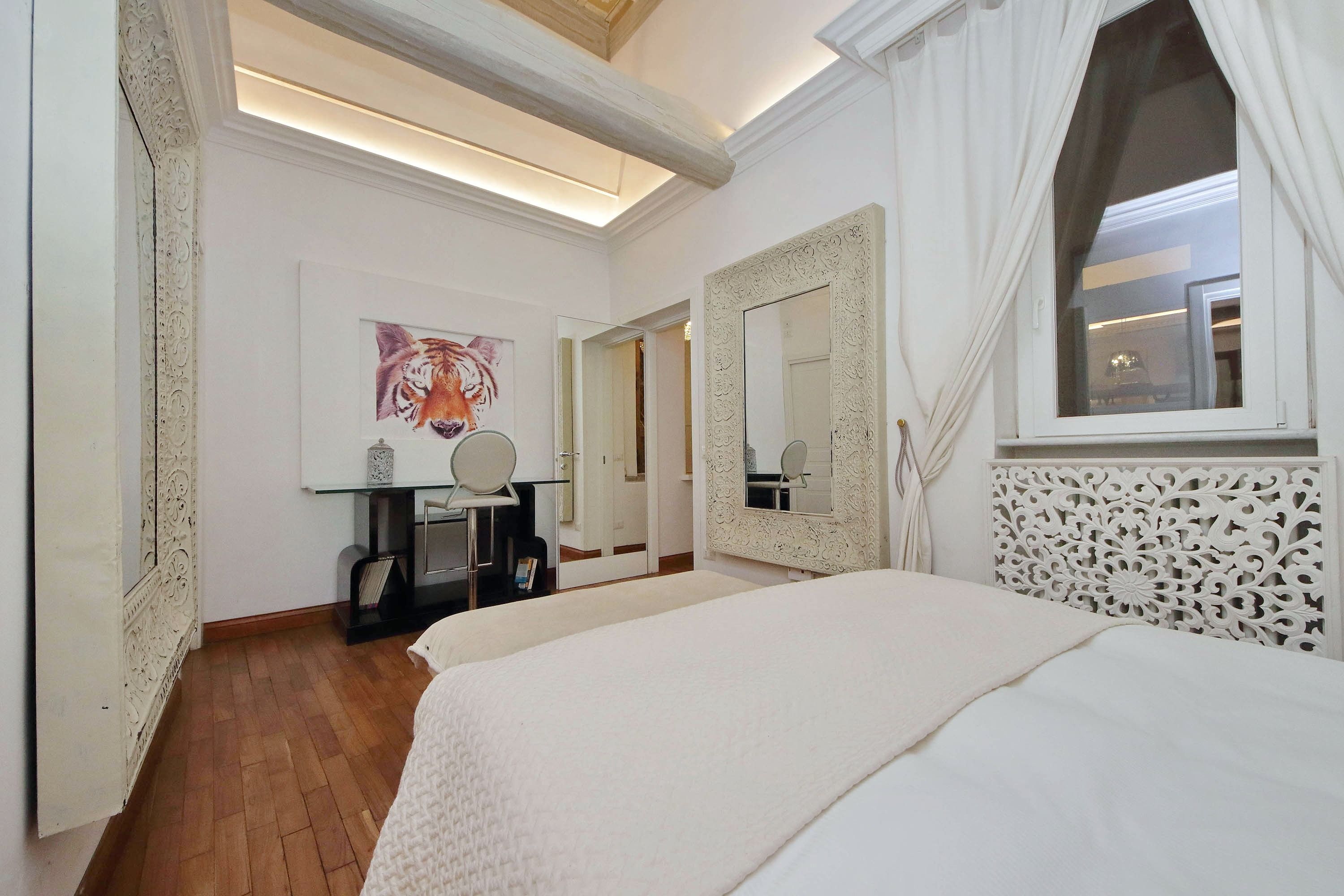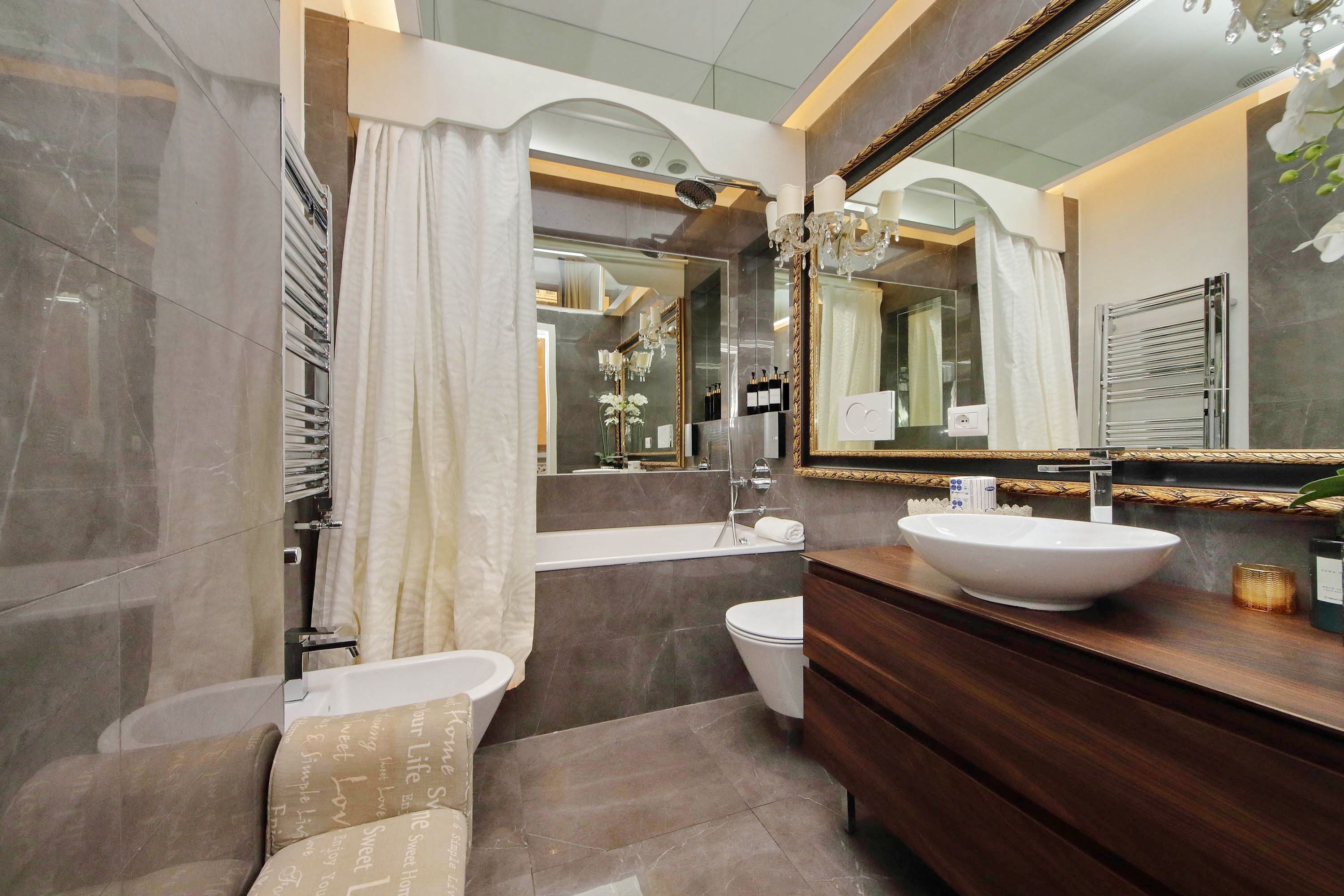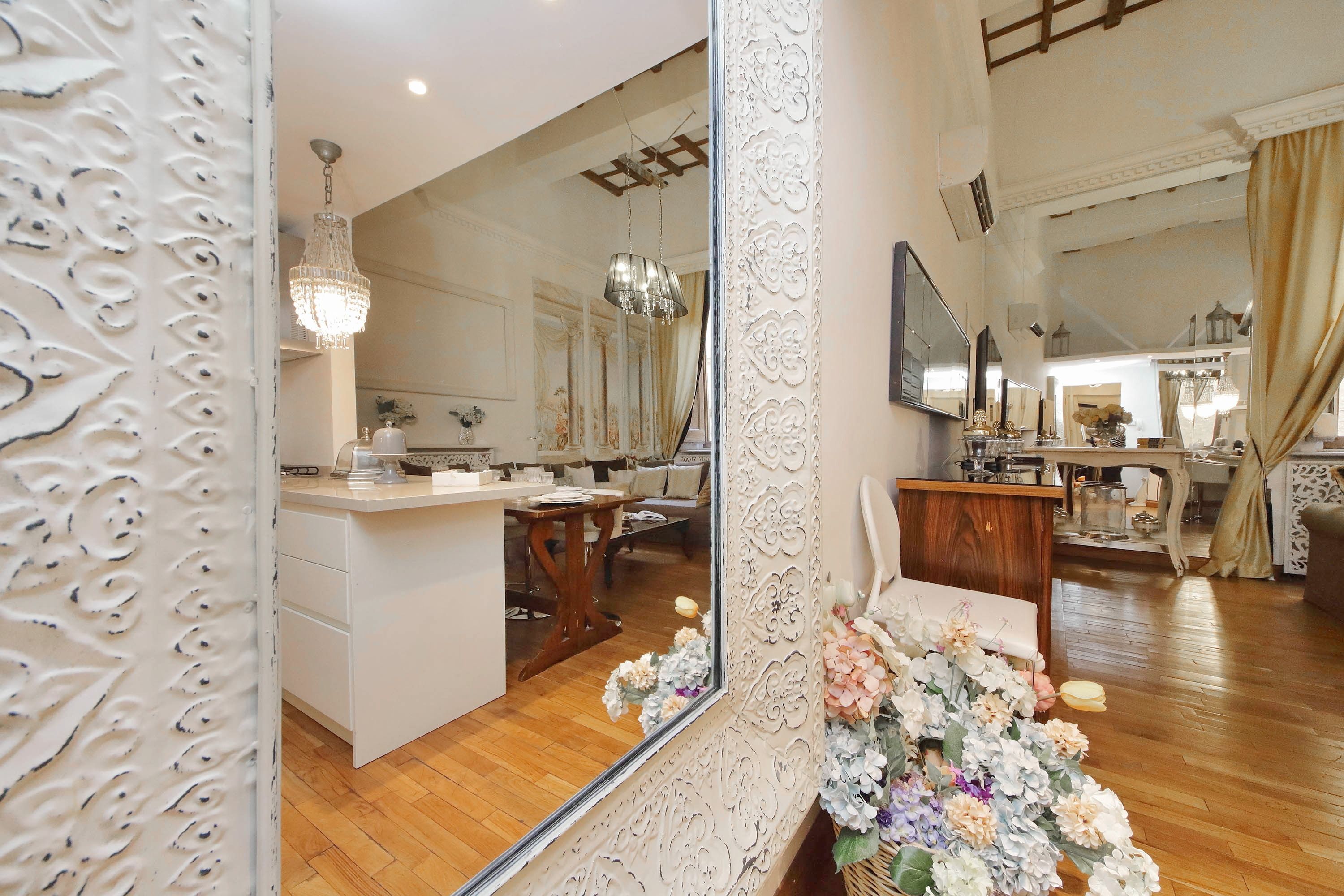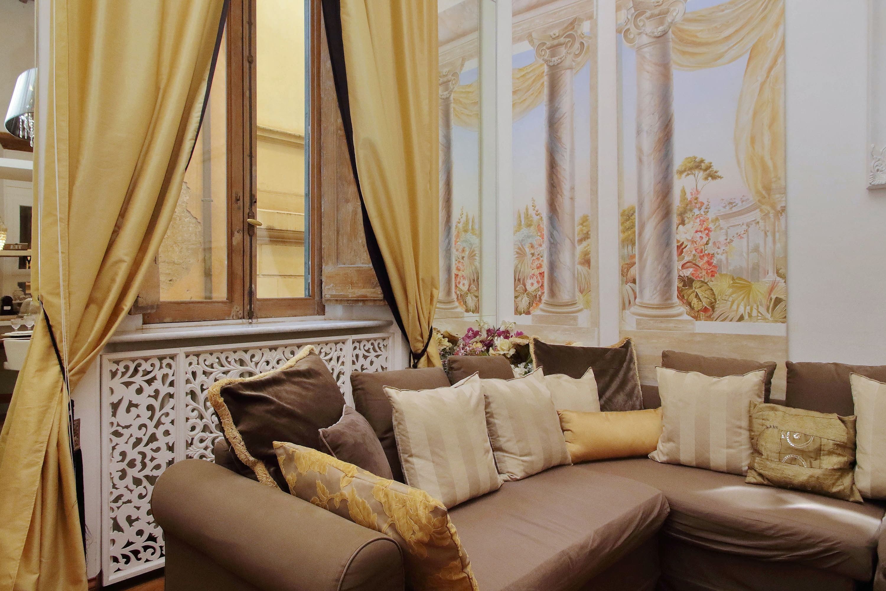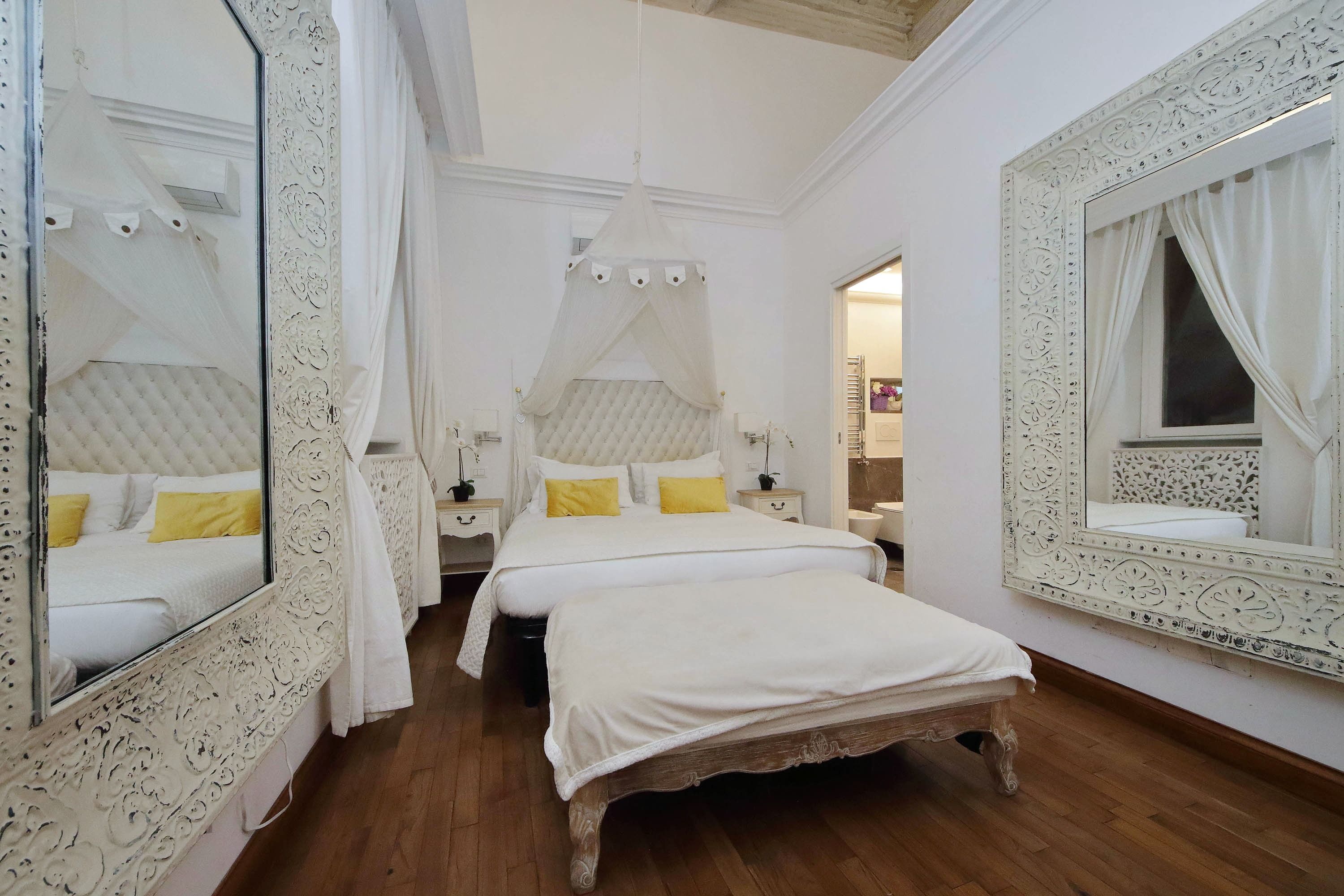 Adorned with hand-painted frescoes, gilded finishes and vibrant furnishings, this large apartment near Piazza Navona is full of character. While there are only two recognised bedrooms, the home can fit up to eight guests thanks to two sofa beds in the living area, which itself flows into a narrow kitchen area which doesn't afford much space for the dining table. The bedrooms themselves are adorned with mirrors, makeup chairs, fireplaces and other expressive design touches, with both offering en-suite bathrooms (though the primary bedroom's stands apart with its decadent corner bathtub). Stepping out of the building, you'll be right in the historic heart of Rome, with Campo de' Fiori less than five minutes away and the Forum reachable in twenty.