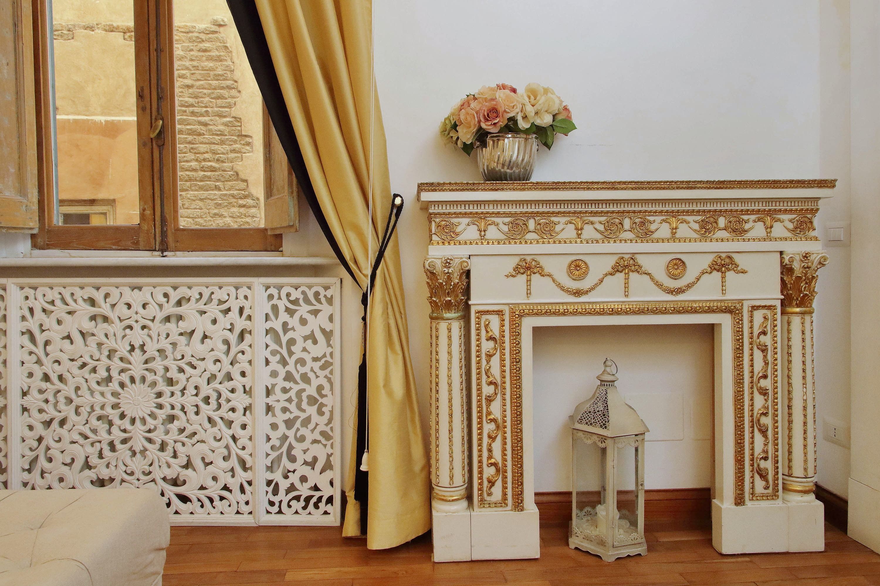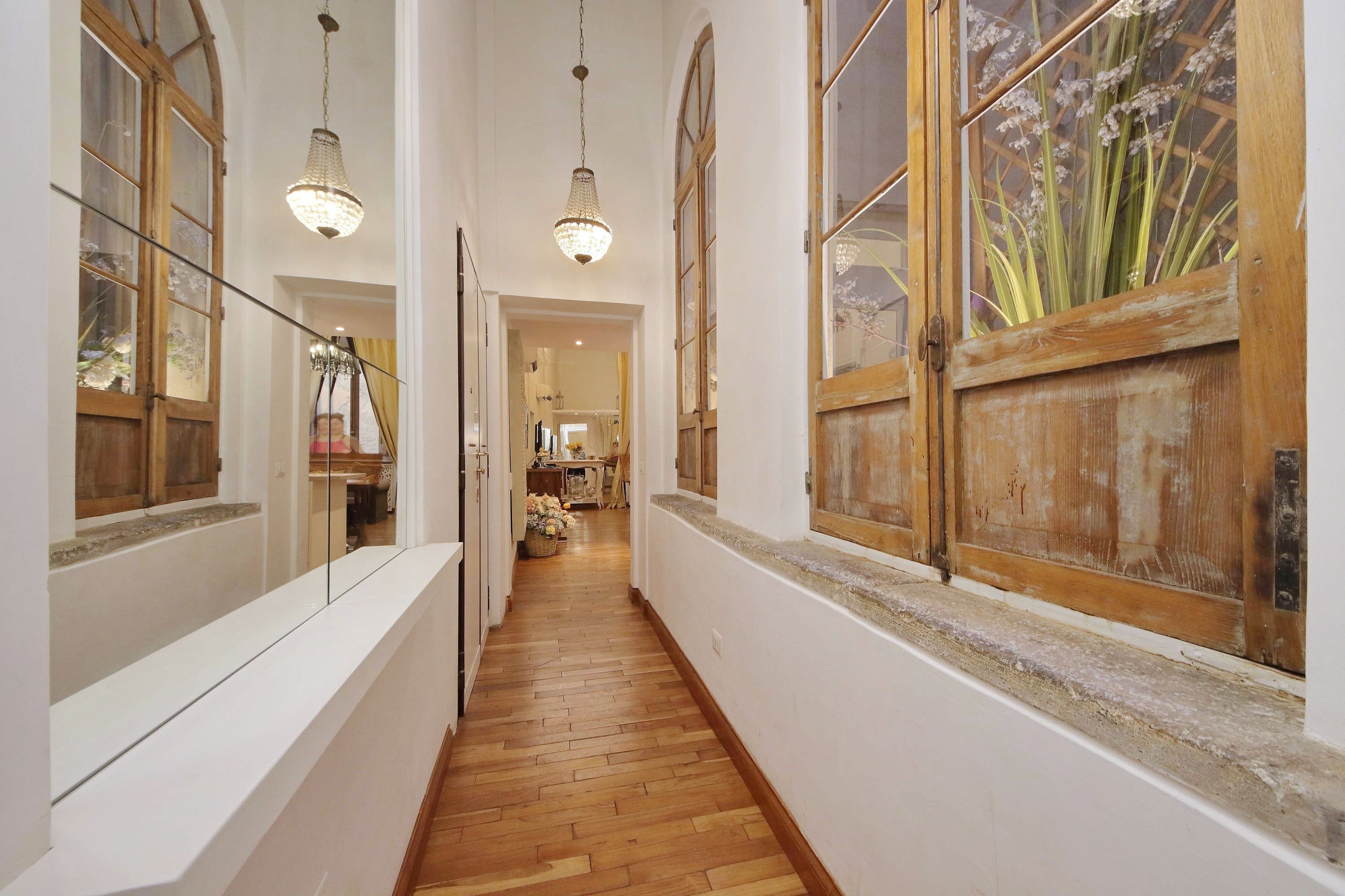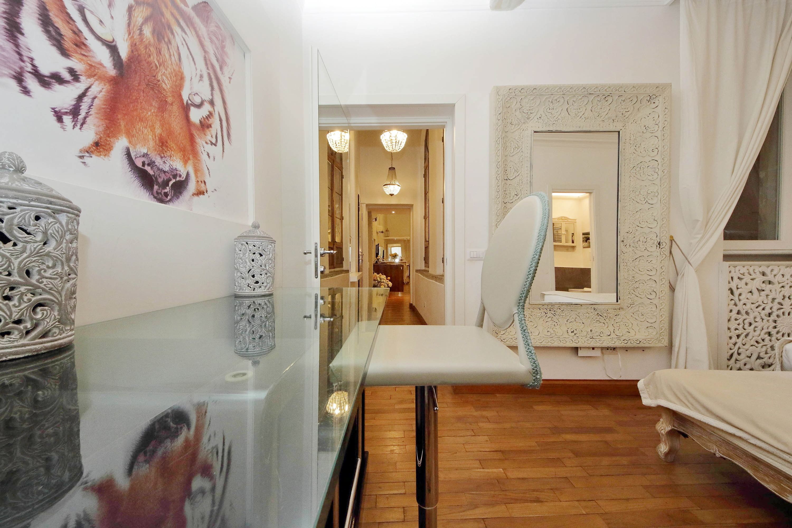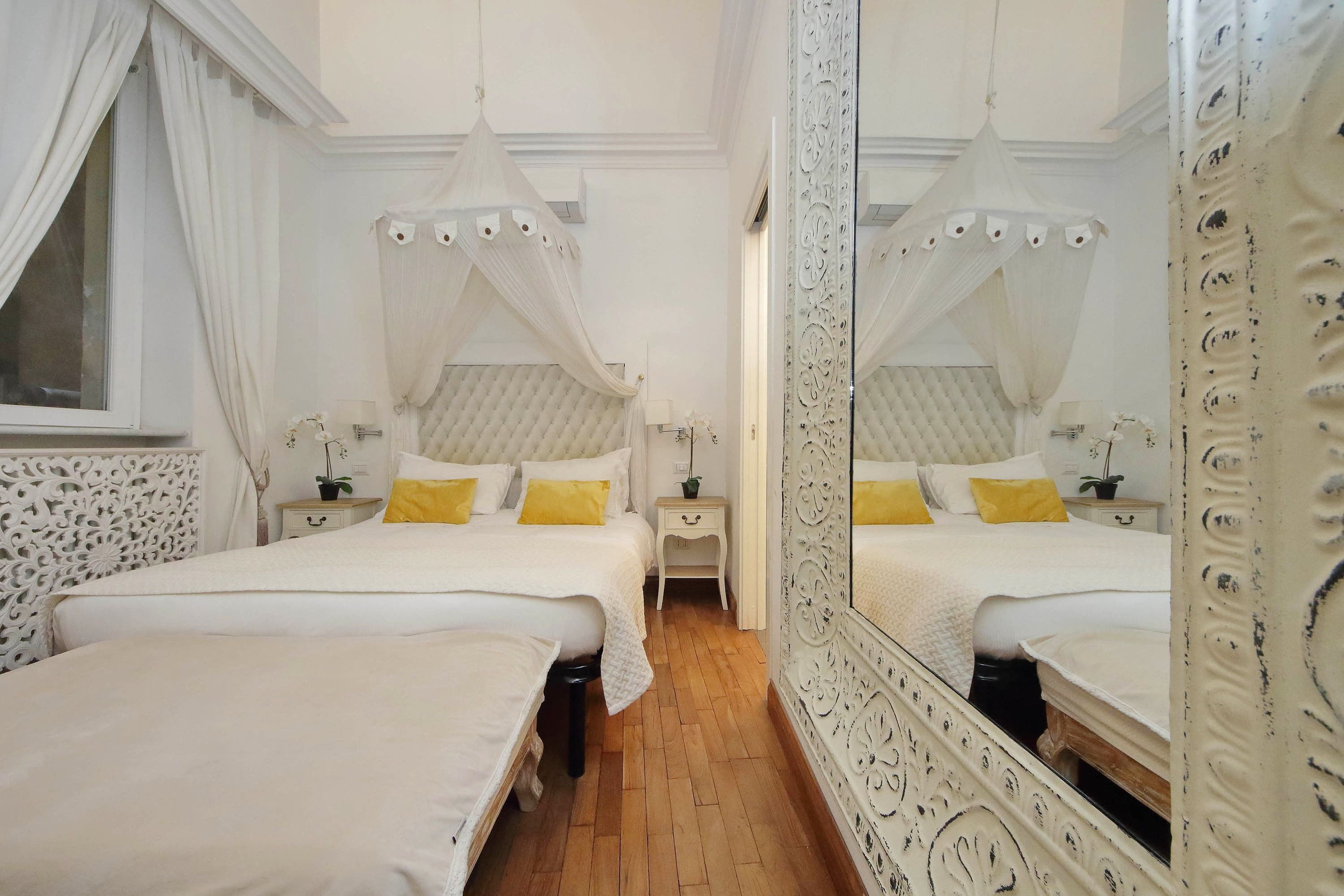 Adorned with hand-painted frescoes, gilded finishes and vibrant furnishings, this large apartment near Piazza Navona is full of character. While there are only two recognised bedrooms, the home can fit up to eight guests thanks to two sofa beds in the living area, which itself flows into a narrow kitchen area which doesn't afford much space for the dining table. The bedrooms themselves are adorned with mirrors, makeup chairs, fireplaces and other expressive design touches, with both offering en-suite bathrooms (though the primary bedroom's stands apart with its decadent corner bathtub). Stepping out of the building, you'll be right in the historic heart of Rome, with Campo de' Fiori less than five minutes away and the Forum reachable in twenty.