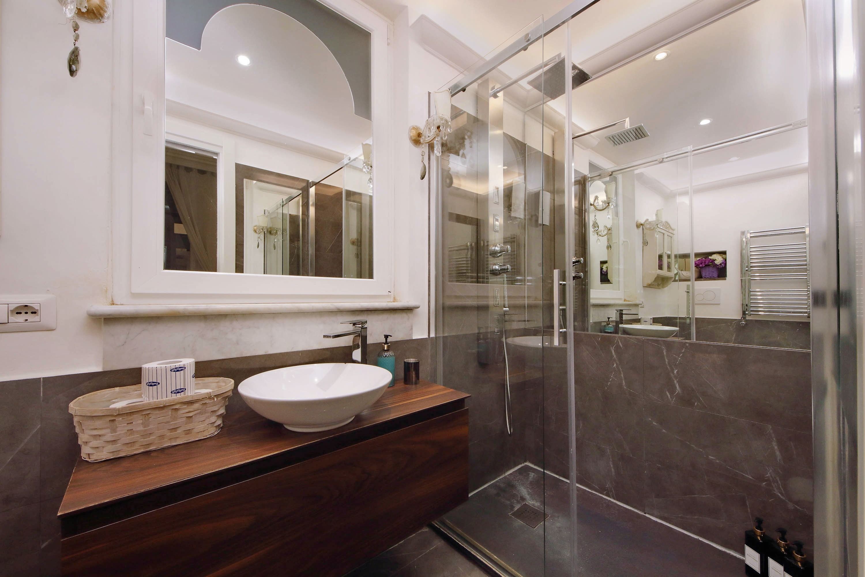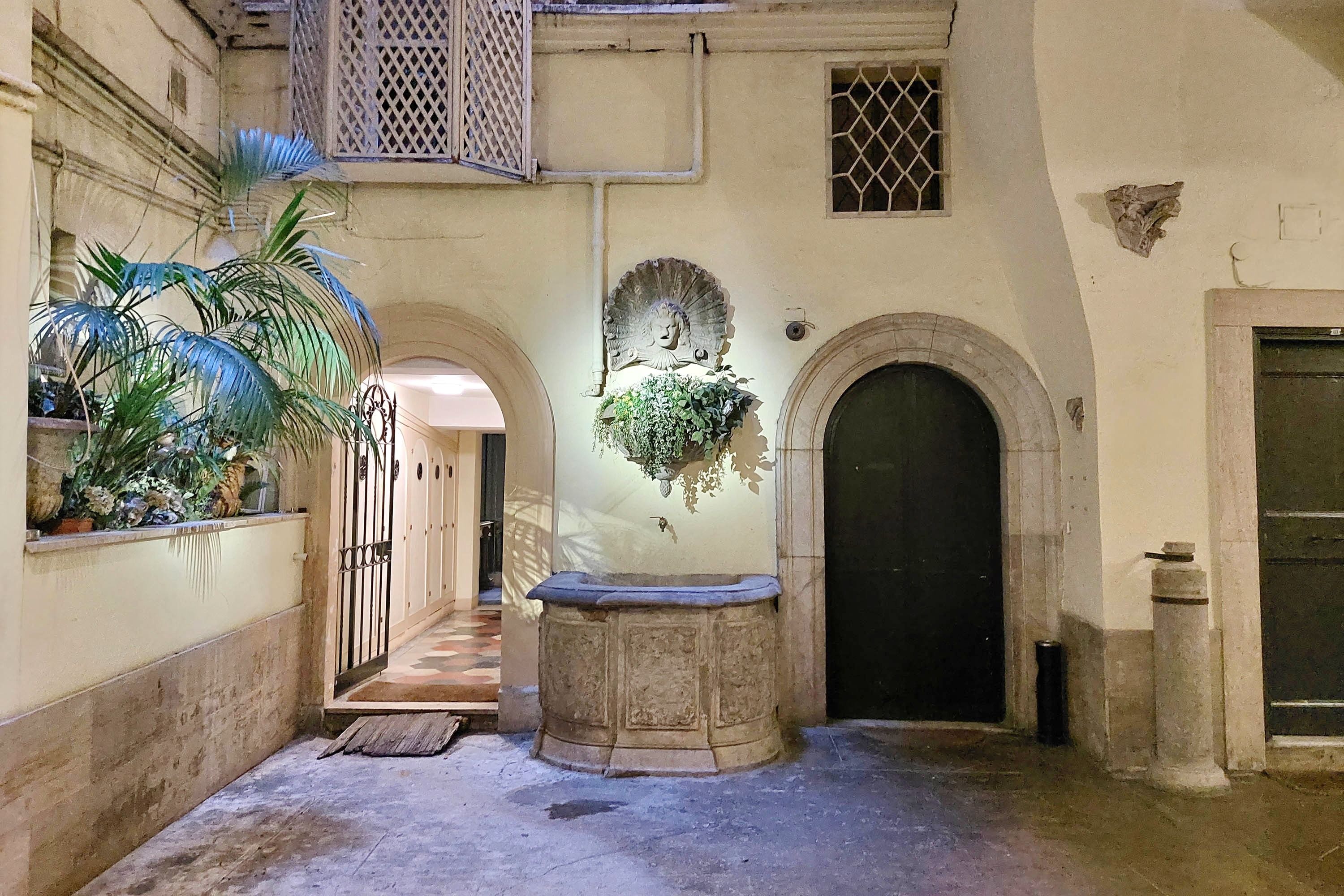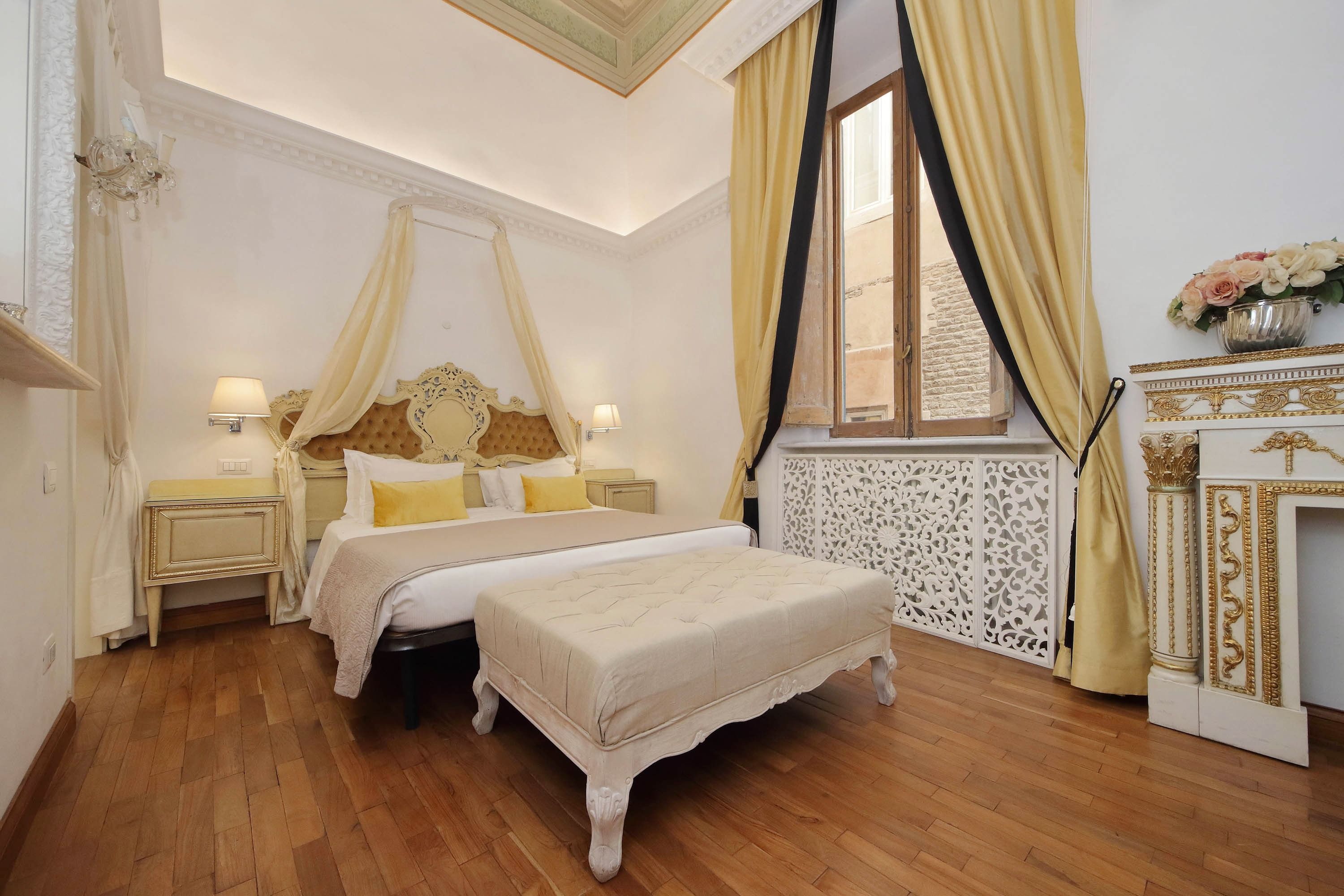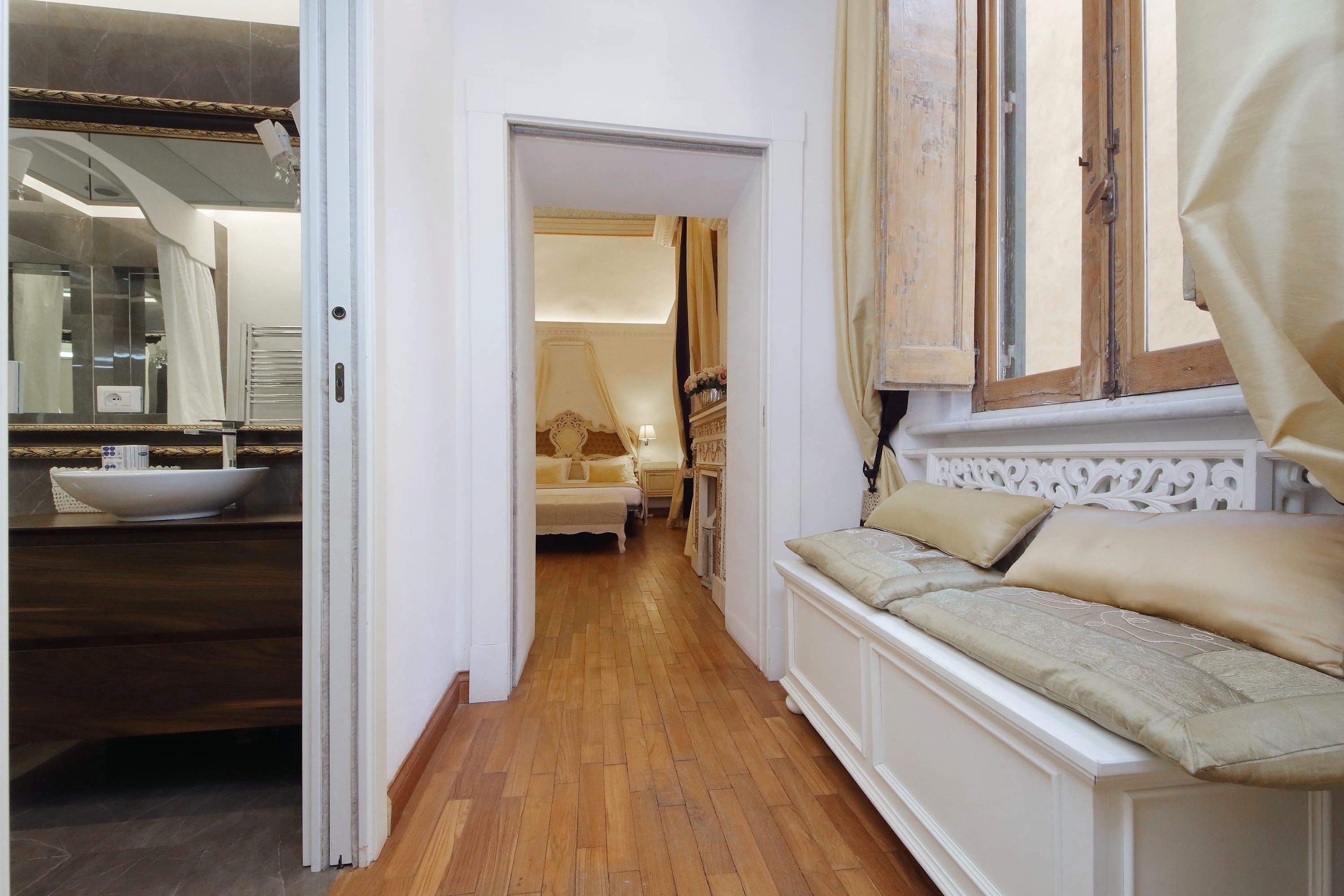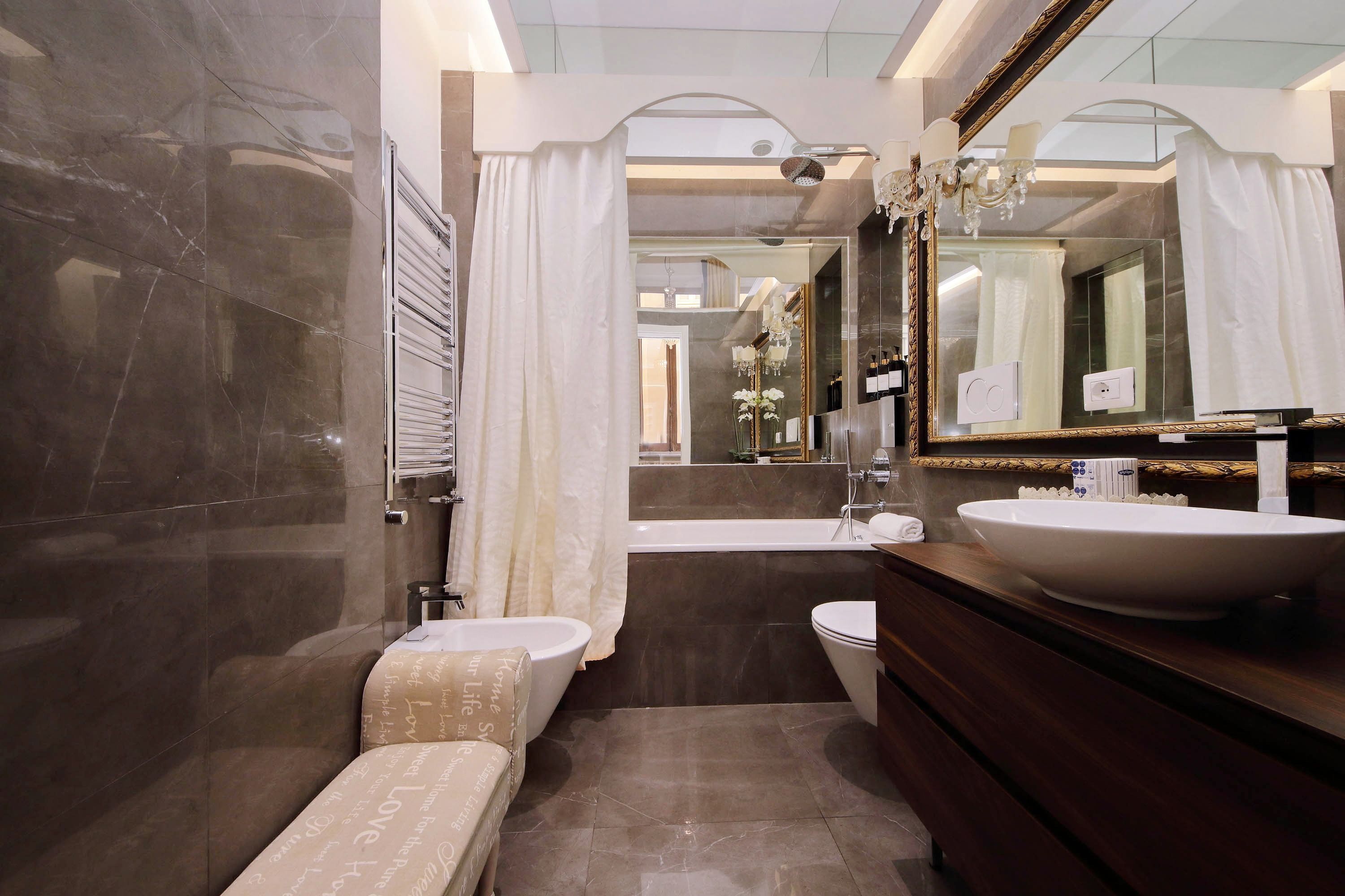 Adorned with hand-painted frescoes, gilded finishes and vibrant furnishings, this large apartment near Piazza Navona is full of character. While there are only two recognised bedrooms, the home can fit up to eight guests thanks to two sofa beds in the living area, which itself flows into a narrow kitchen area which doesn't afford much space for the dining table. The bedrooms themselves are adorned with mirrors, makeup chairs, fireplaces and other expressive design touches, with both offering en-suite bathrooms (though the primary bedroom's stands apart with its decadent corner bathtub). Stepping out of the building, you'll be right in the historic heart of Rome, with Campo de' Fiori less than five minutes away and the Forum reachable in twenty.