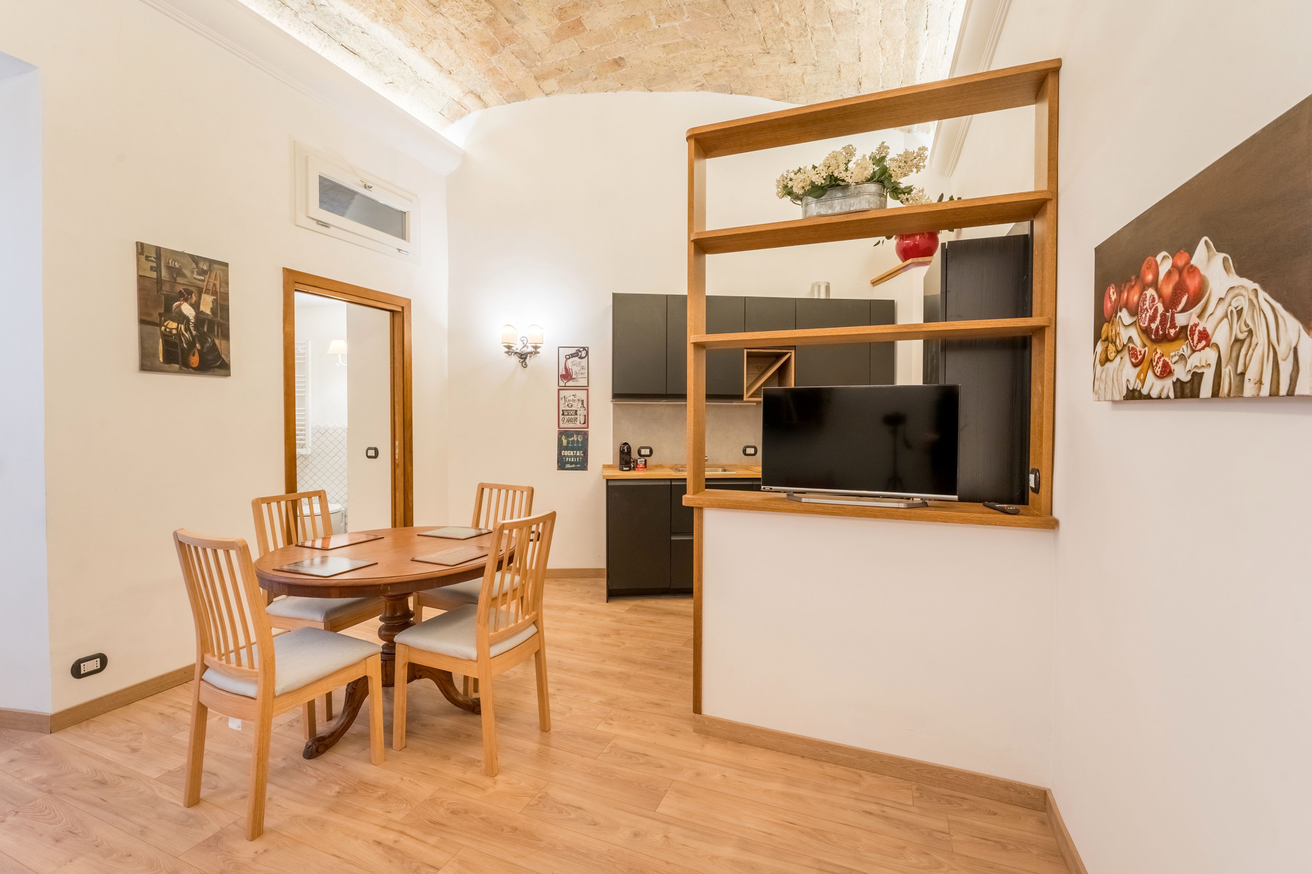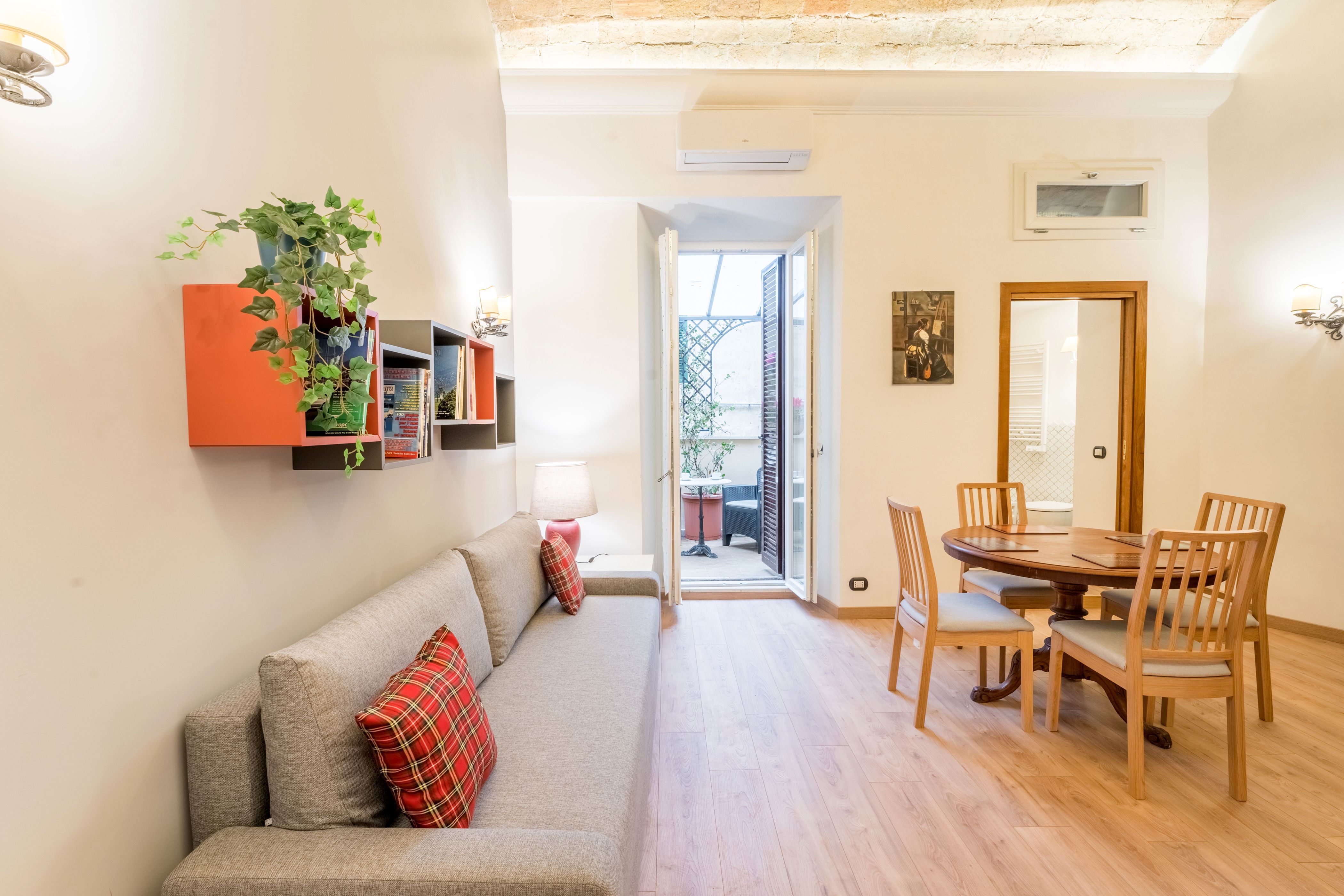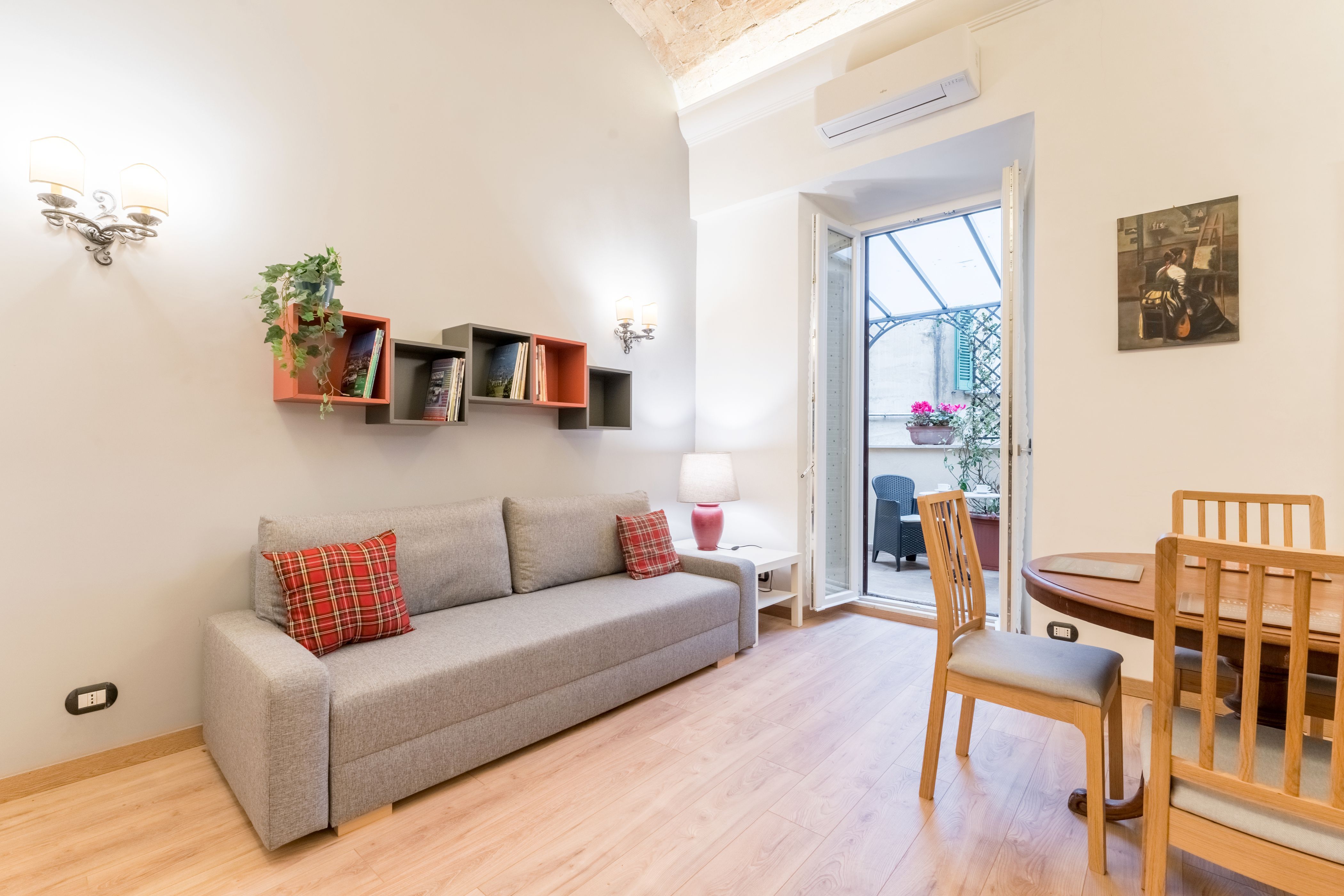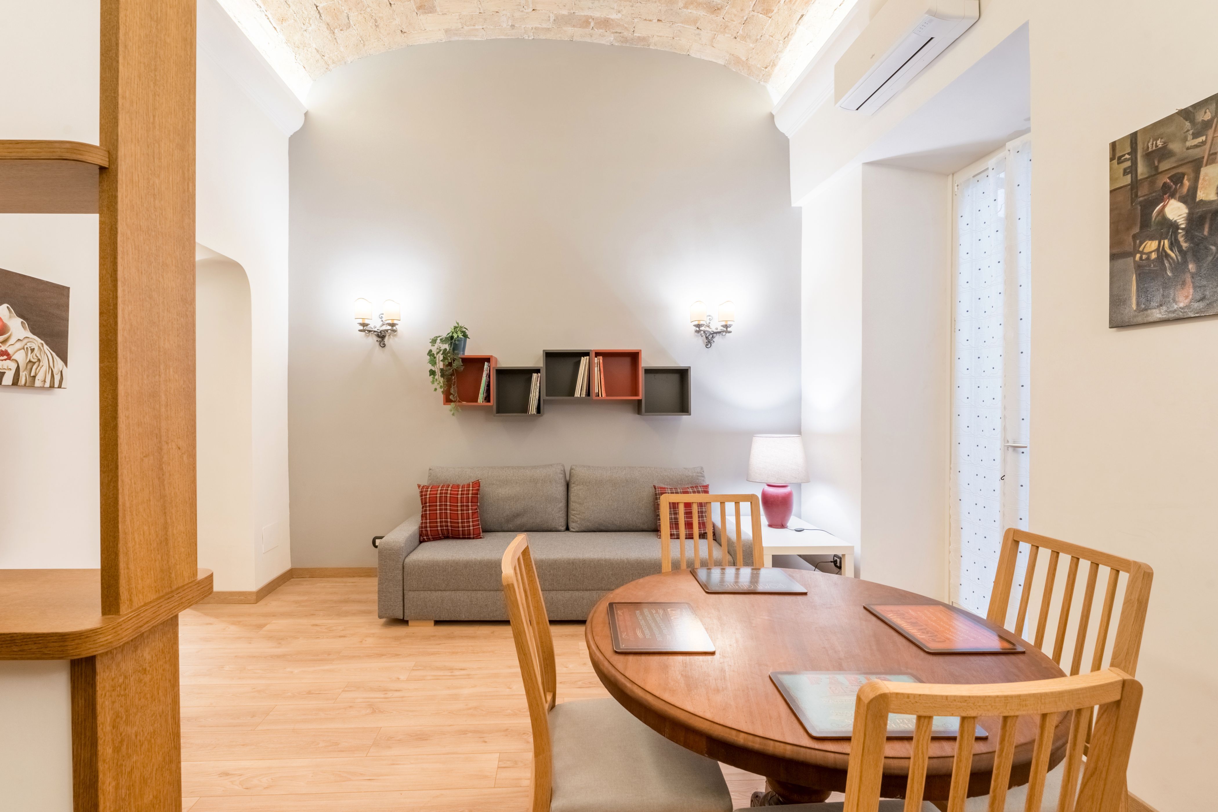 This apartment is within walking distance of many of Rome’s main attractions. These include the Colosseum and the Roman Forum, to name just a few. You’ll find plenty of cafes and restaurants in the neighbourhood too. Or return to this home and dine on the terrace here – it’s a great place to relax in the shade. And although the apartment doesn’t have a lot of natural light, you’ll be surrounded by the owner’s vibrant artworks. We love the original features, such as the barrel-vaulted ceiling in the living space, as well. This room also sleeps two guests on a sofa bed at full occupancy. The apartment offers a unique experience in the Eternal City.
