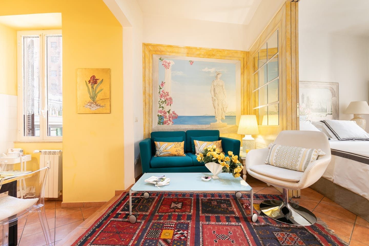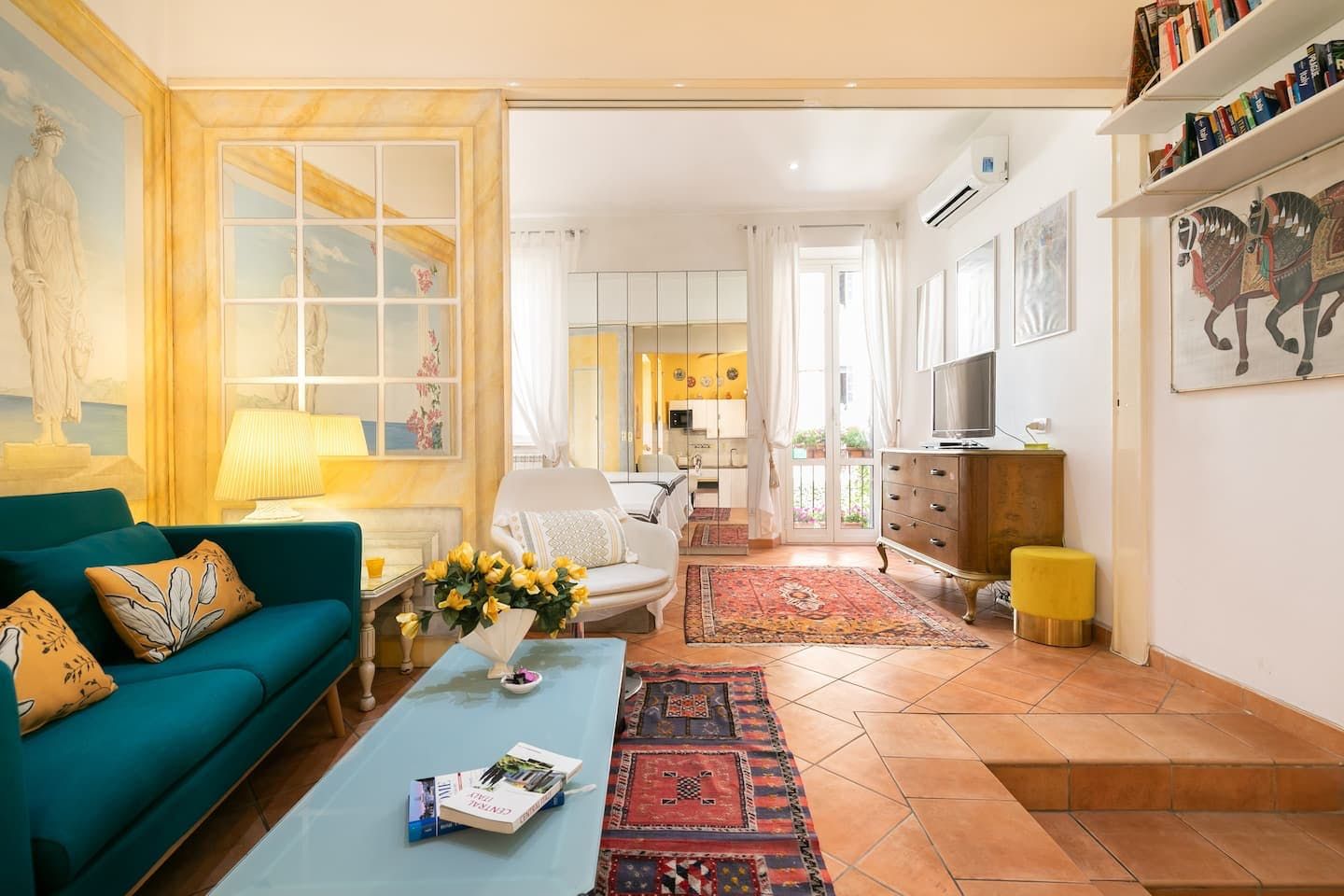 It’s easy to work out where the owner found inspiration for this gallery-like apartment – all you need to do is wander around the local neighbourhood of Monti. Bustling cafés, ornate architecture, and ancient grandeur is all around. A nine-minute stroll in either direction will take you to two of the city’s most majestic sights – the Colosseum and the Foro Romano. With antiquity and arts all around you, the theme continues as you return home.