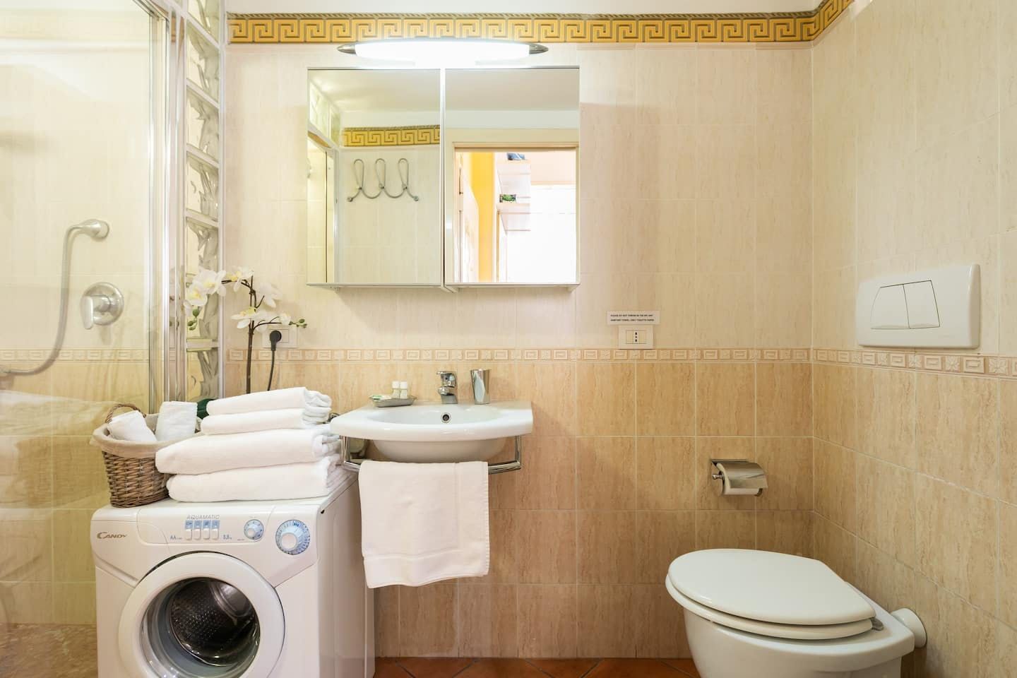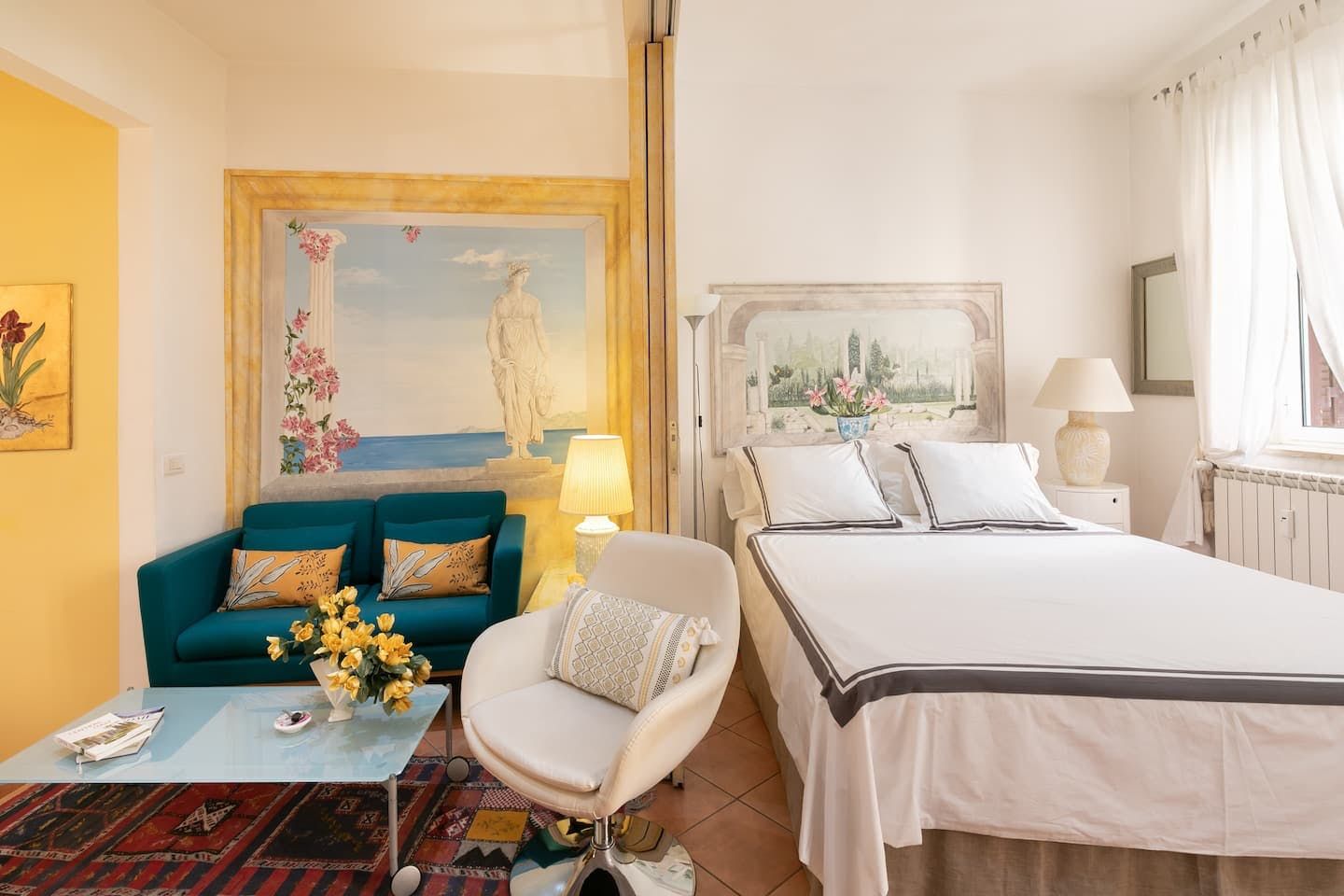 We love the terracotta-coloured tilework, adorned by vintage pieces of furniture dotted throughout the living space and bedroom. Pad across tiles and decorative rugs towards the double doors – this scene isn’t an optical illusion. You’ve got a private balconette with colourful flowers and scenes of Roman streets below. Is there any better spot for a chilled glass of prosecco?