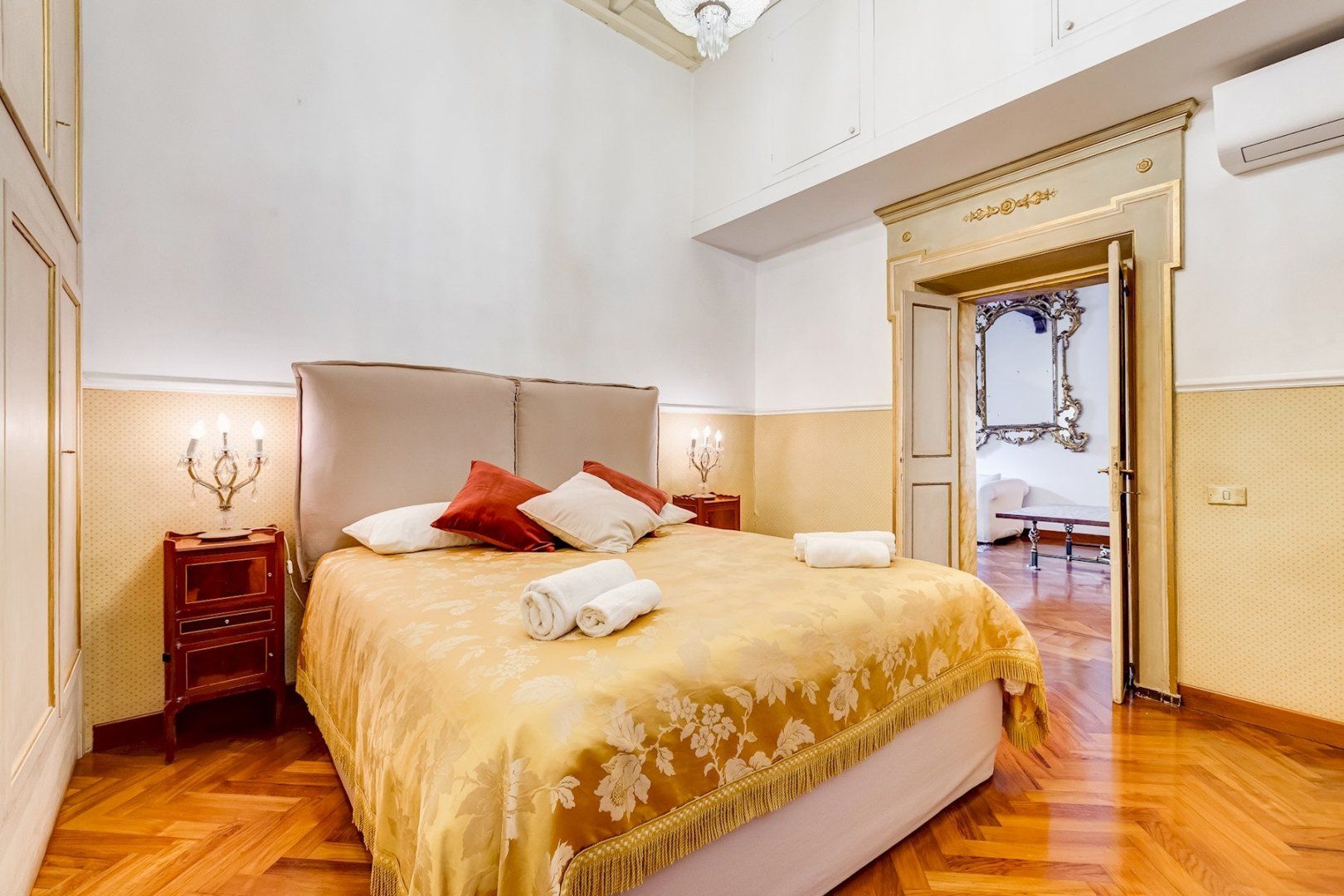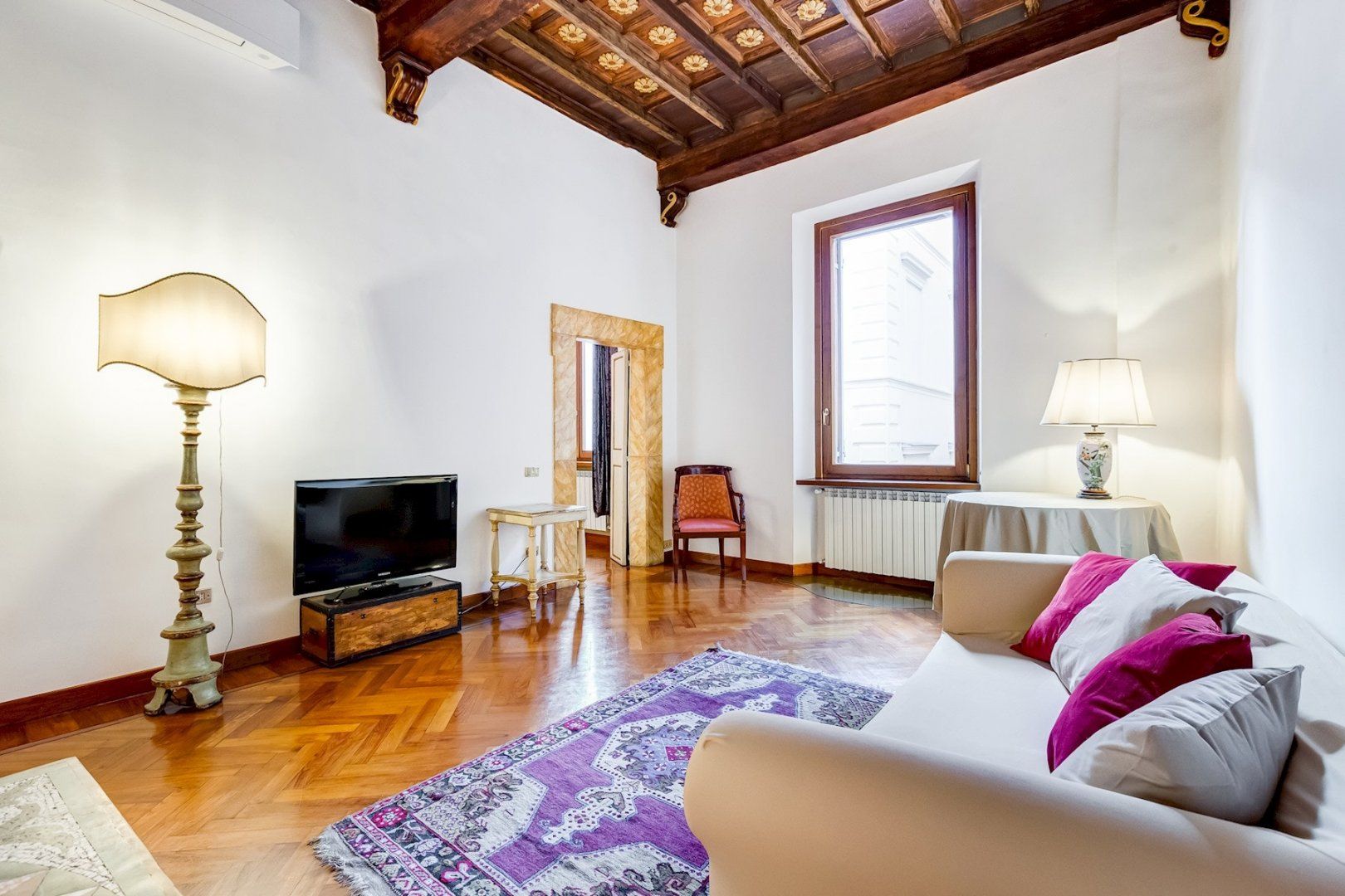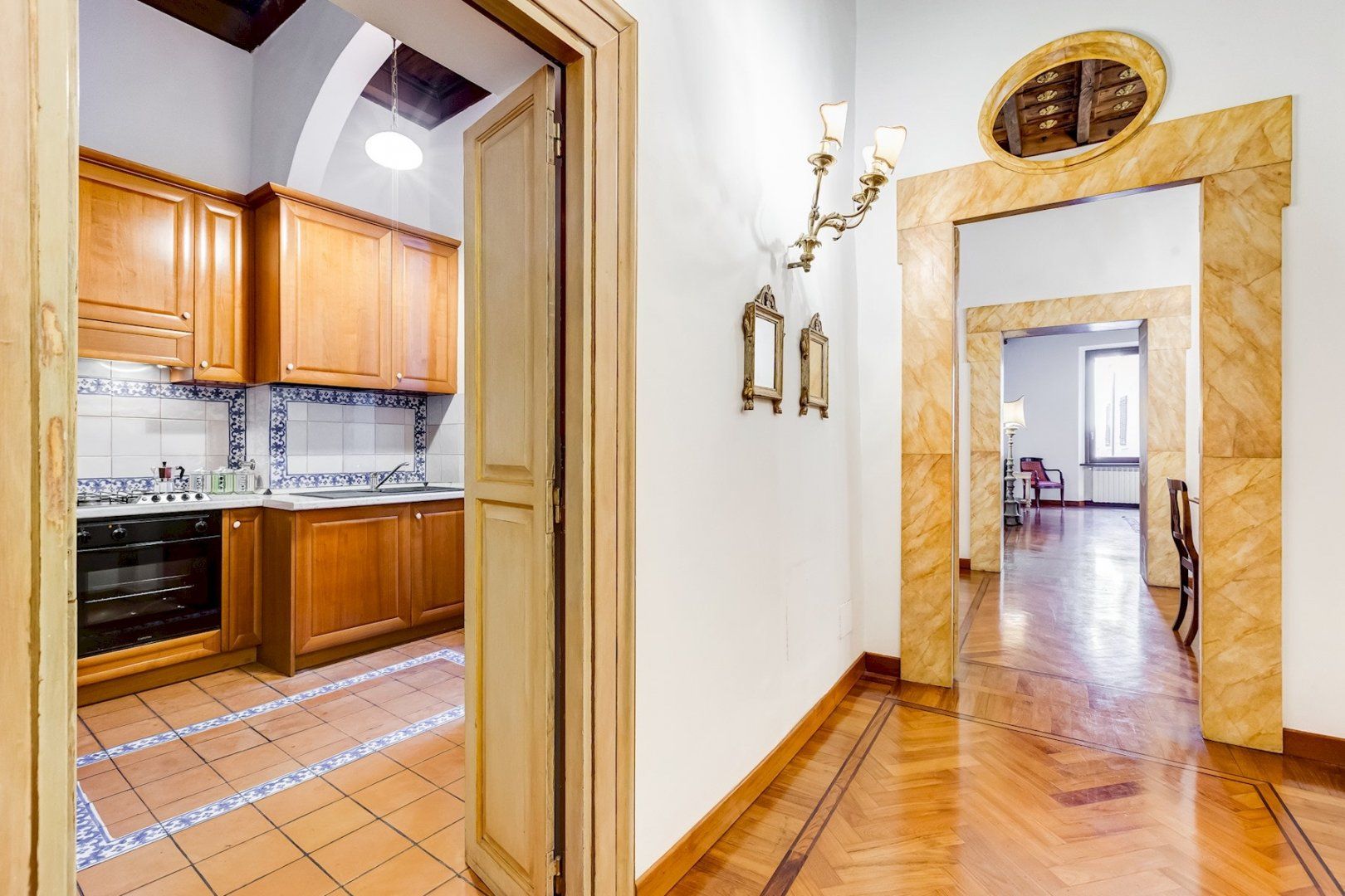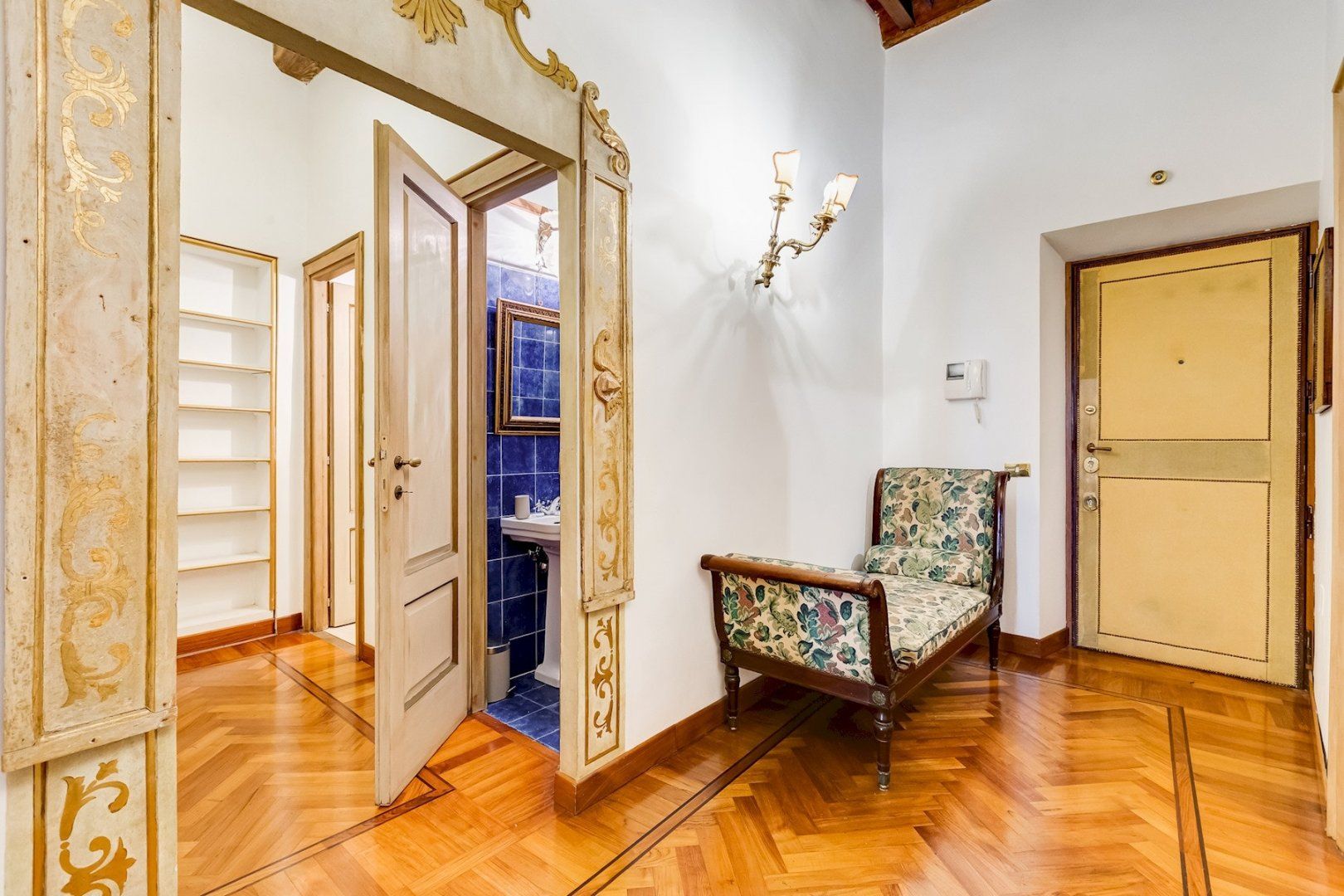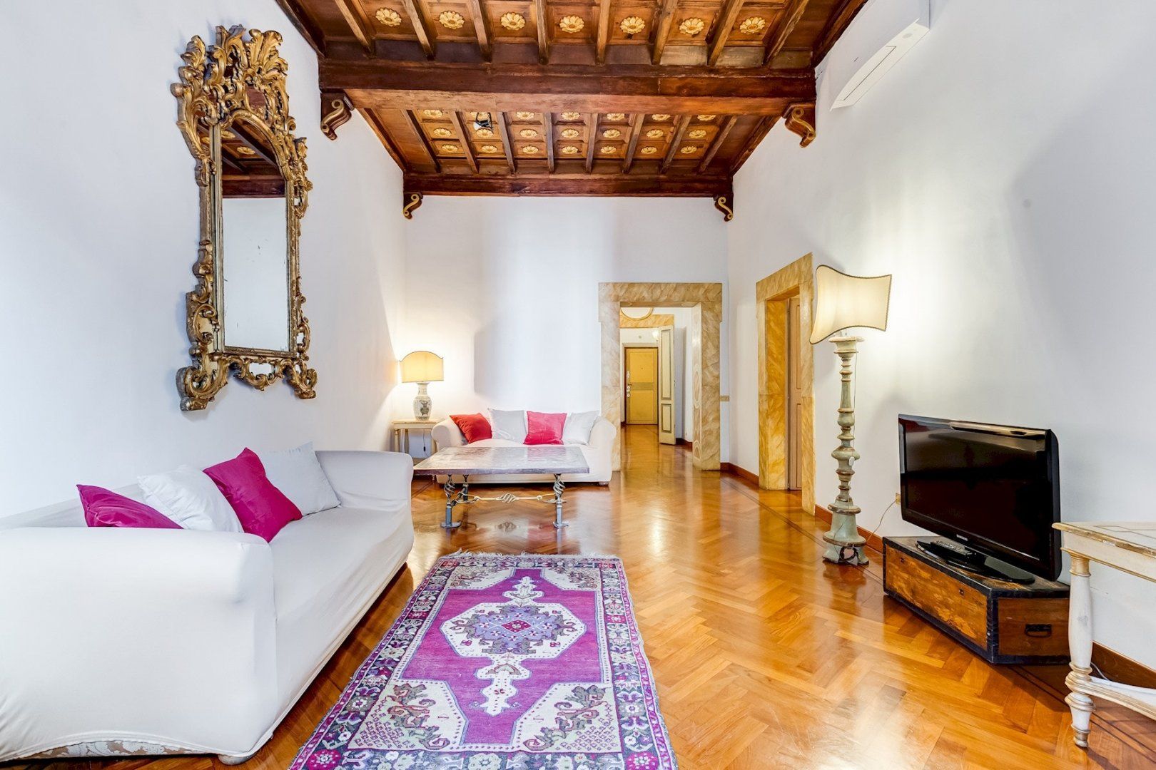 You’ll find this charming apartment on the narrow, atmospheric Via dei Coronari (officially one of the world’s ten most beautiful streets), right in Rome’s historic centre. It’s just a two-minute stroll to buzzing Piazza Navona where cafés and restaurants spill out onto to pavement and ancient fountains still trickle away. Just across the River Tiber, a fifteen-minute walk takes you to the endless museums and Sistine Chapel at The Vatican. Housed in a building dating back to the 1500s, this apartment still radiates old-world charm which can immediately be felt by the 19th-century aedicule at the entrance. The wooden coffered ceiling and herringbone floor harks back to a bygone age and gilded mirrors and antique furnishings complete the feeling that you’ve stepped into an opulent home in the 19th century. Though it may seem like you’re staying in a museum, the practicalities have been thought of as well, with a full kitchen for your morning espresso, and comfy sofas around the flatscreen TV in the lounge.