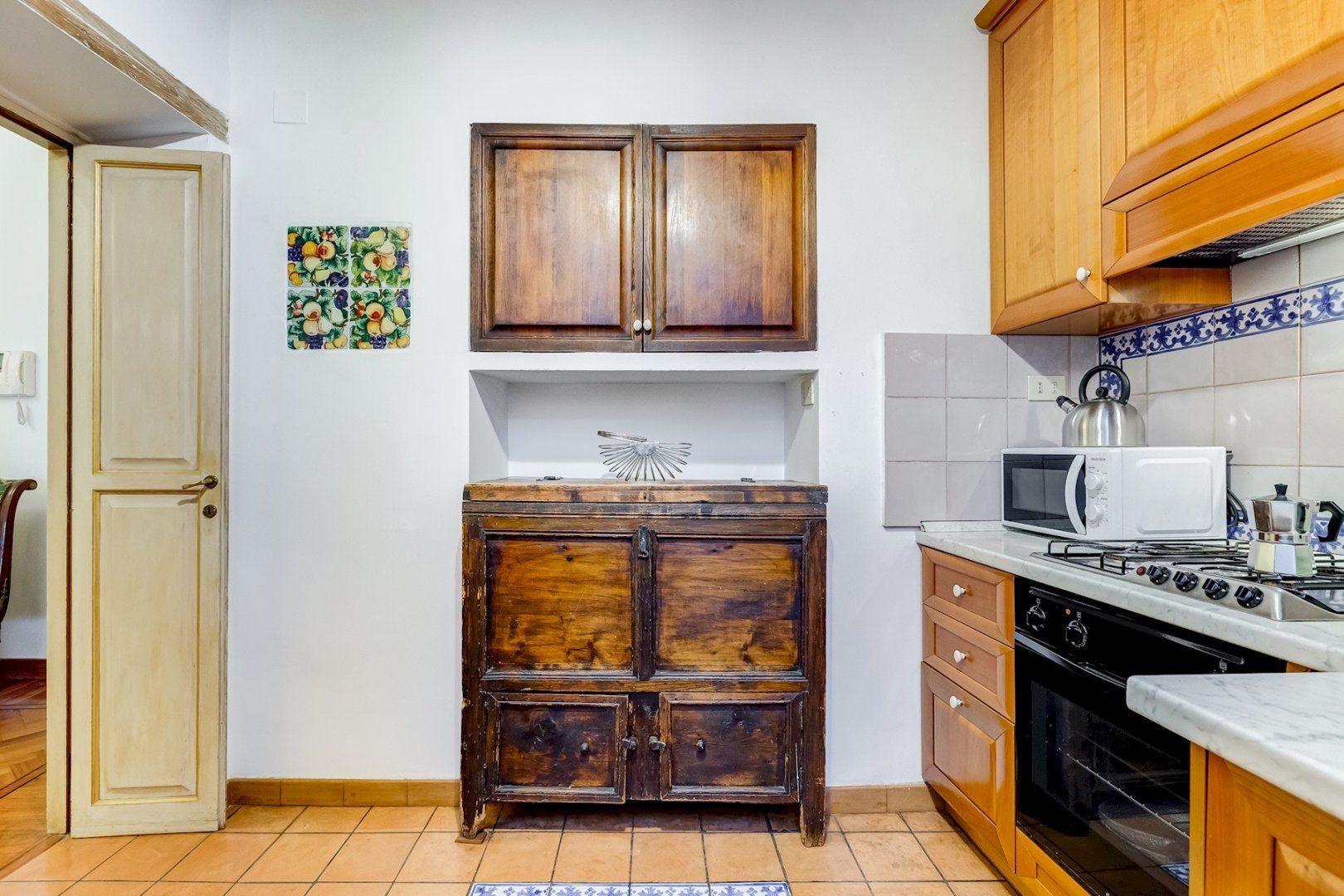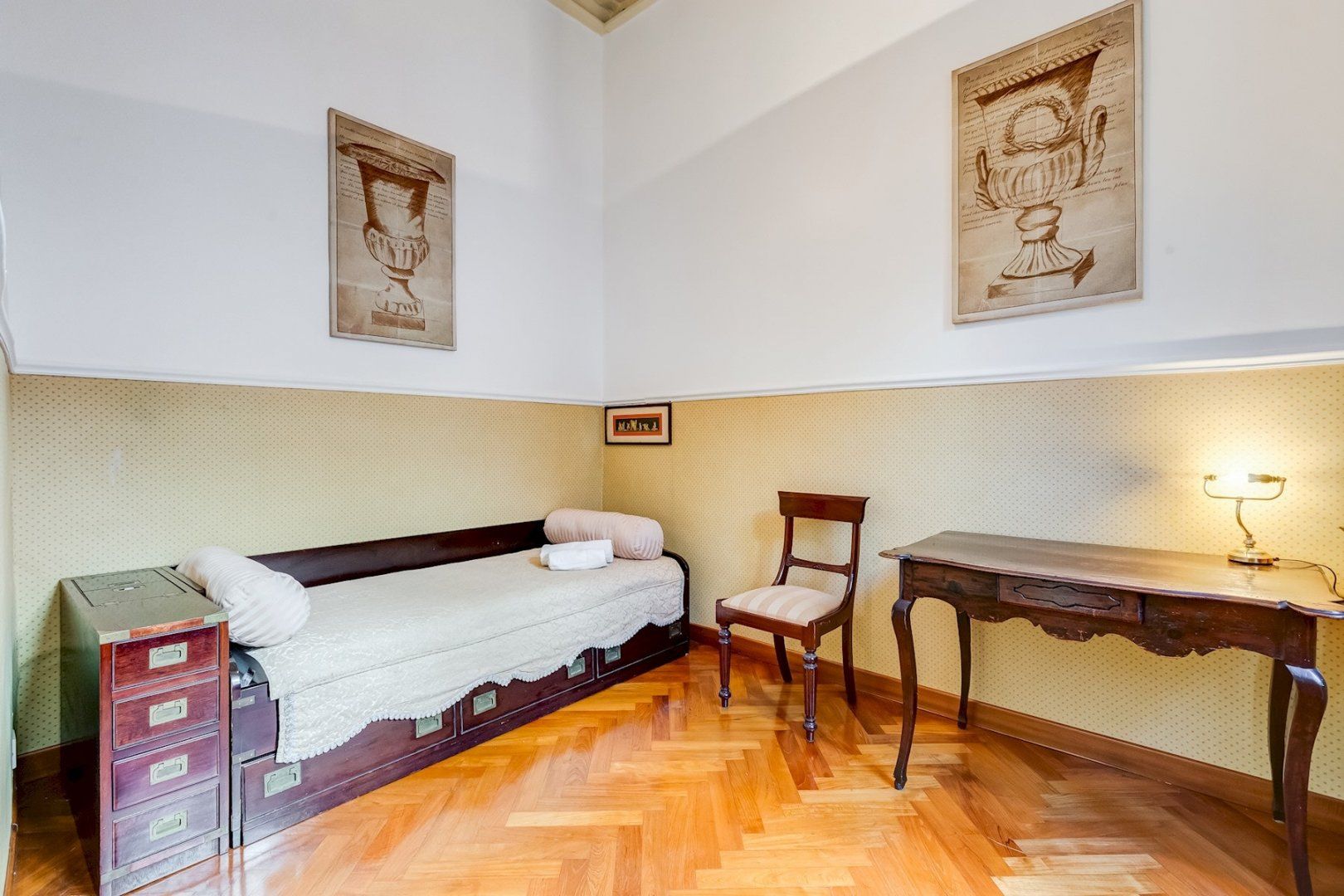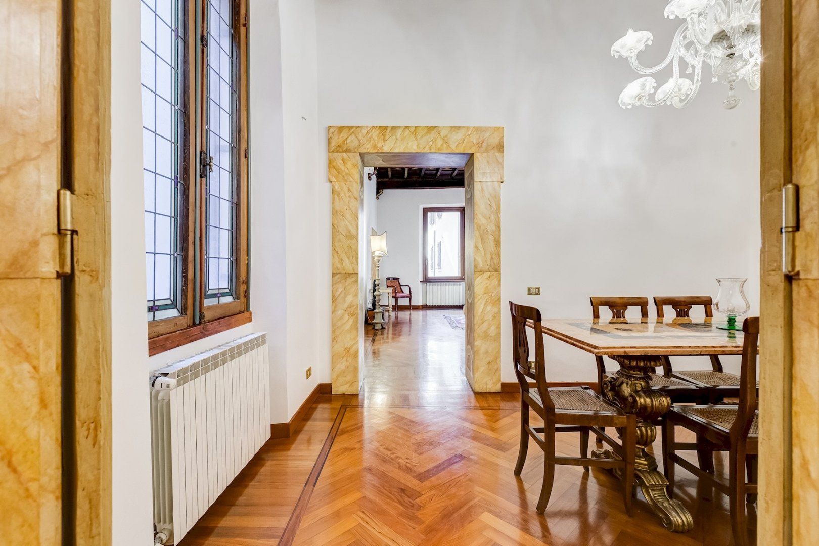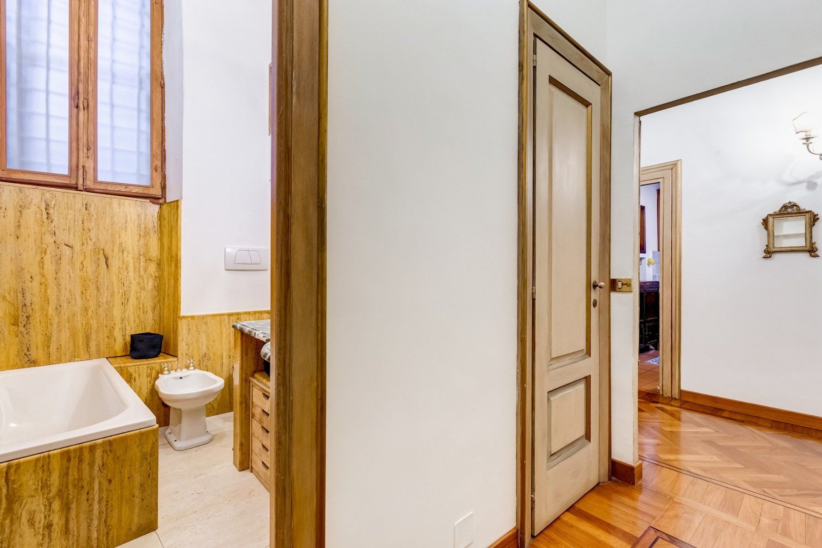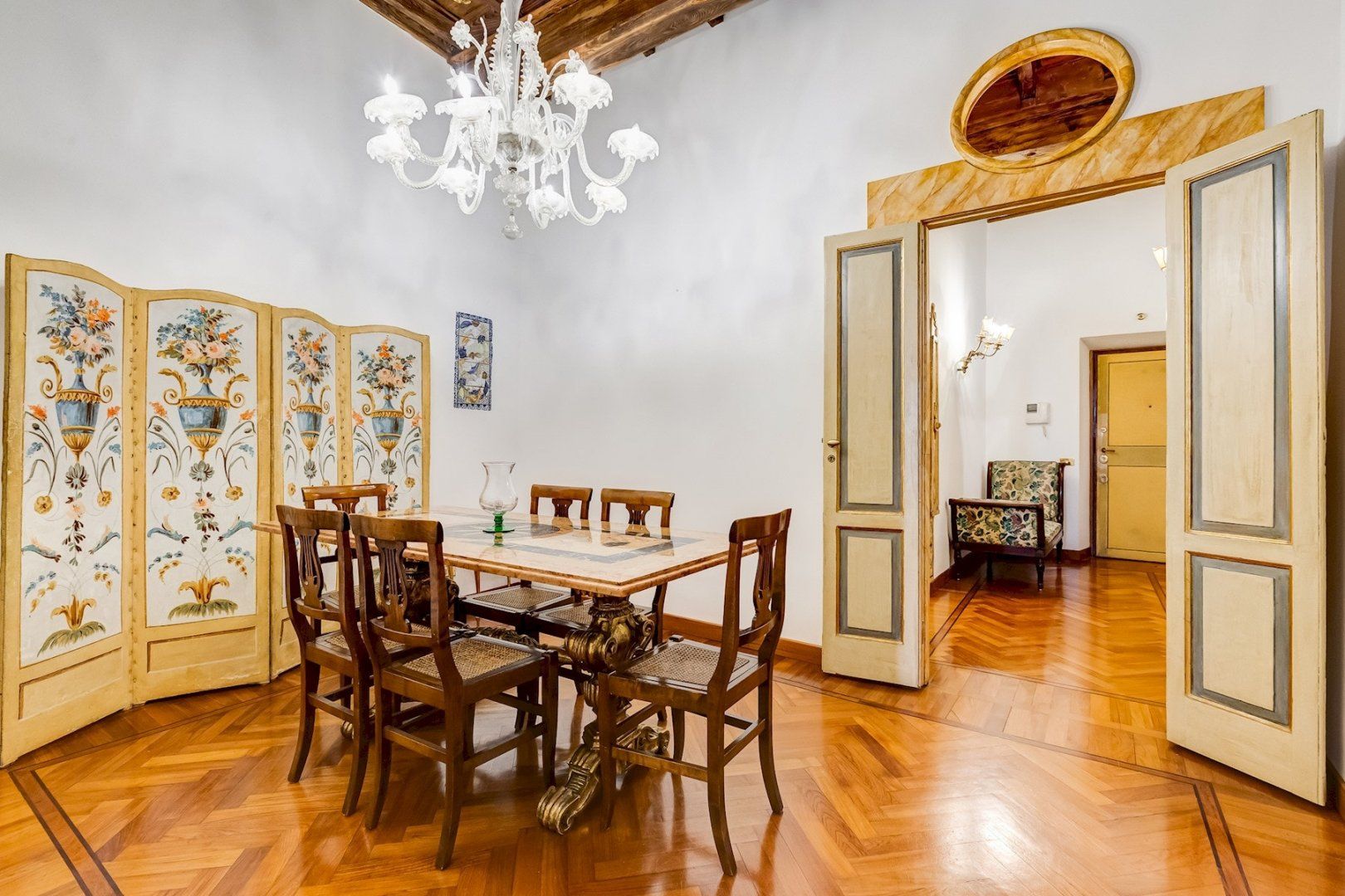 You’ll find this charming apartment on the narrow, atmospheric Via dei Coronari (officially one of the world’s ten most beautiful streets), right in Rome’s historic centre. It’s just a two-minute stroll to buzzing Piazza Navona where cafés and restaurants spill out onto to pavement and ancient fountains still trickle away. Just across the River Tiber, a fifteen-minute walk takes you to the endless museums and Sistine Chapel at The Vatican. Housed in a building dating back to the 1500s, this apartment still radiates old-world charm which can immediately be felt by the 19th-century aedicule at the entrance. The wooden coffered ceiling and herringbone floor harks back to a bygone age and gilded mirrors and antique furnishings complete the feeling that you’ve stepped into an opulent home in the 19th century. Though it may seem like you’re staying in a museum, the practicalities have been thought of as well, with a full kitchen for your morning espresso, and comfy sofas around the flatscreen TV in the lounge.