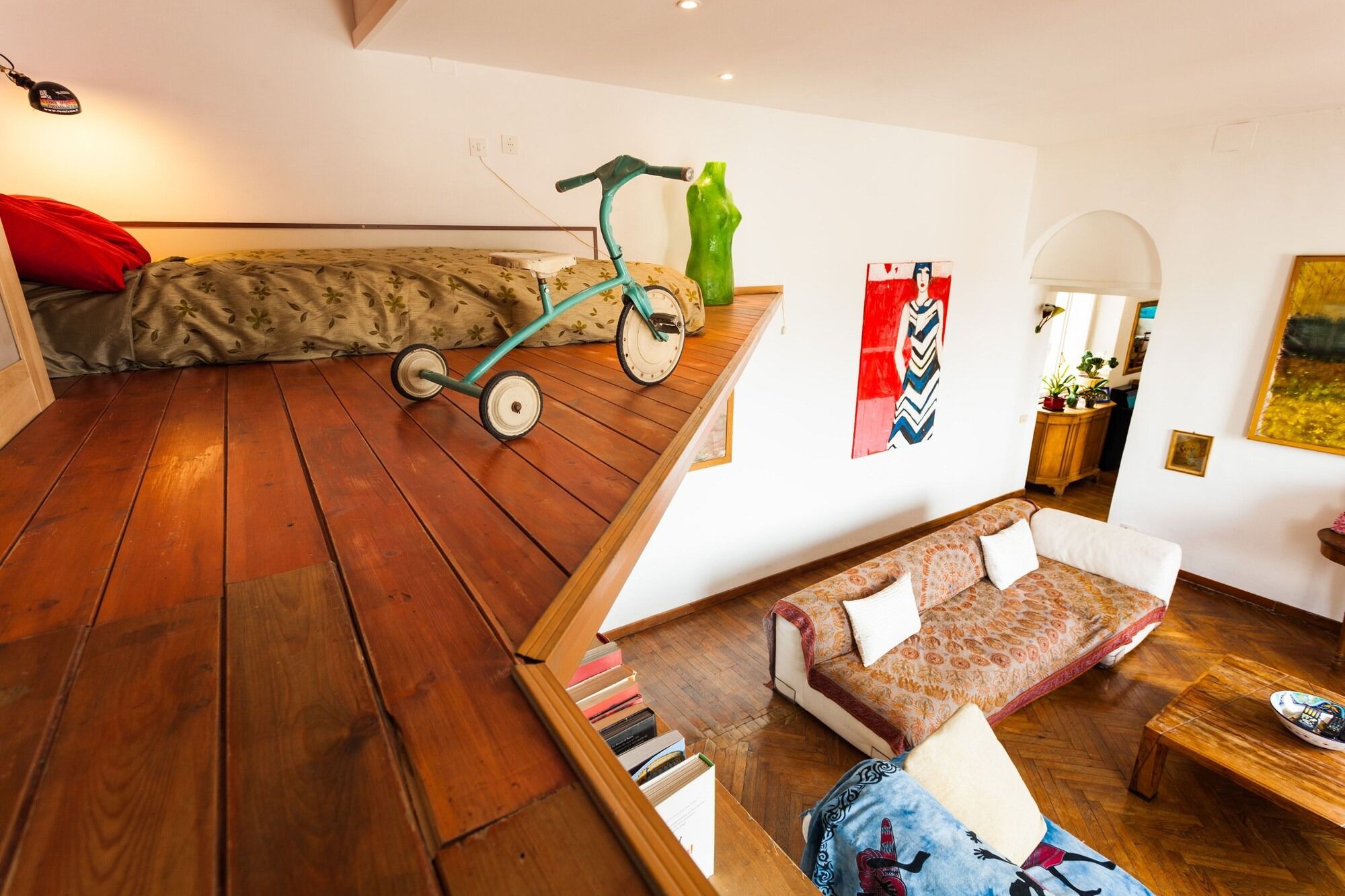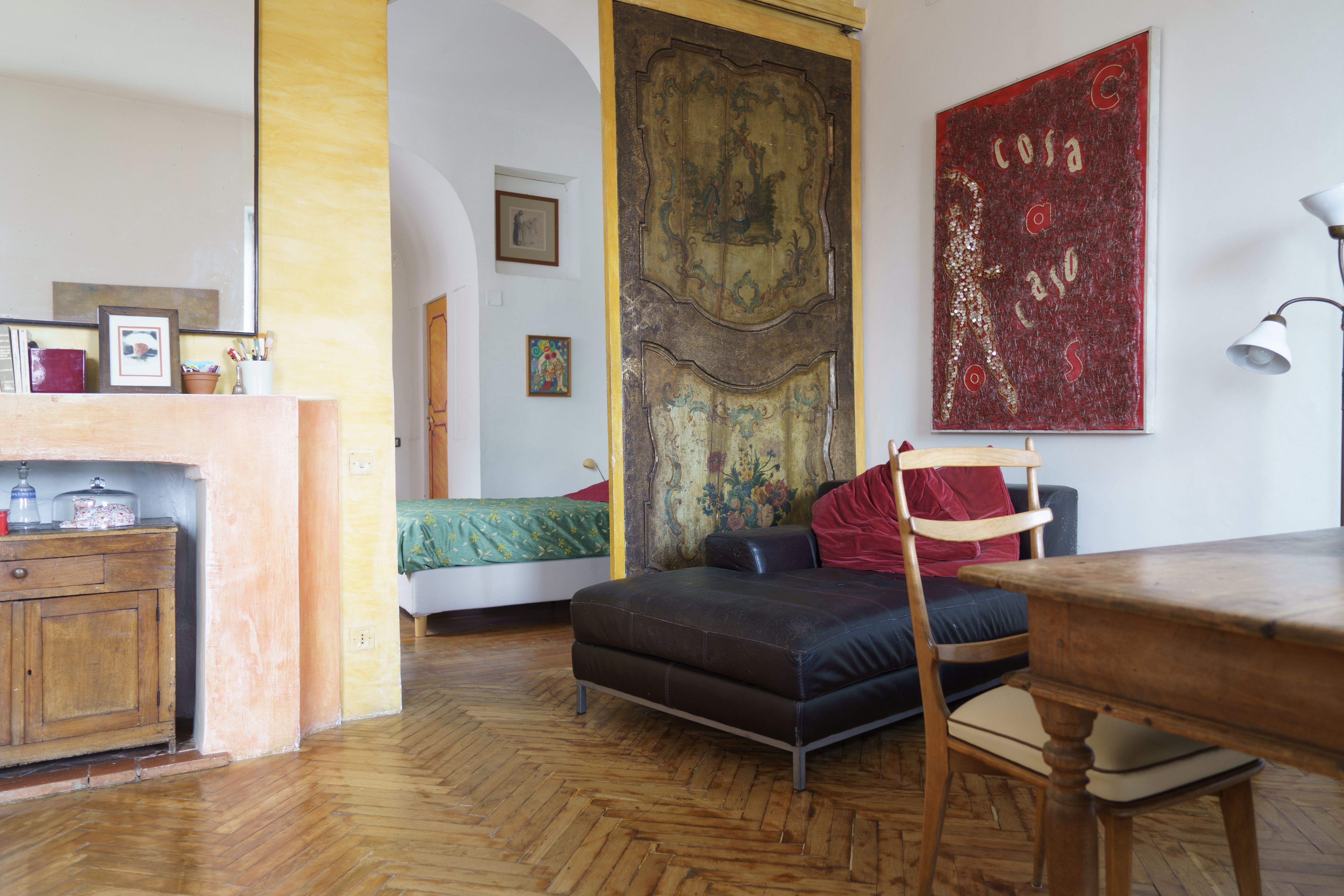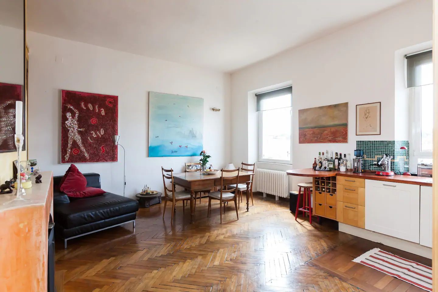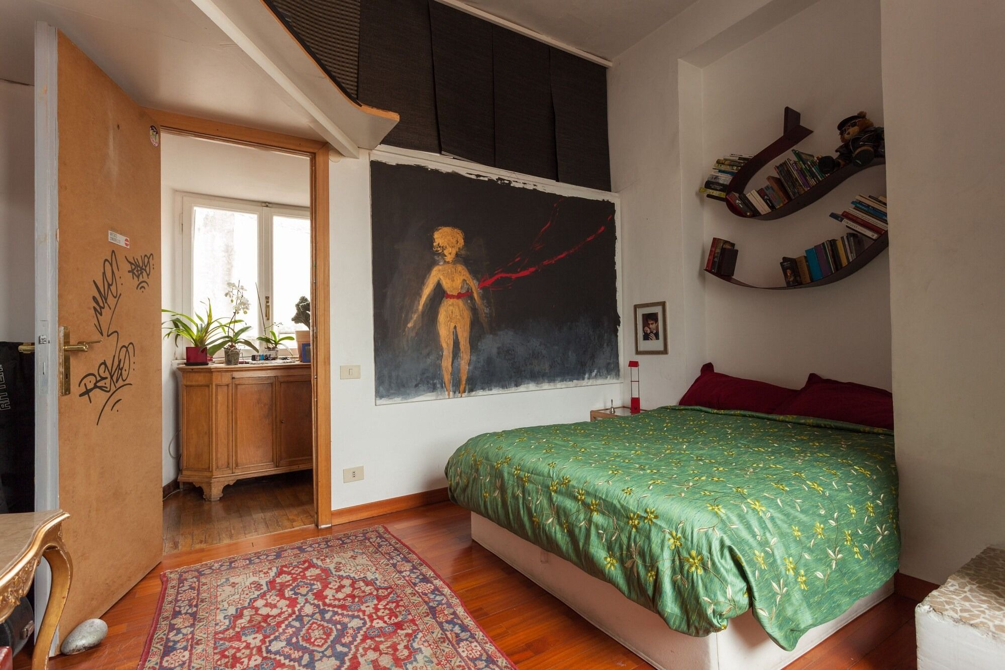 This home is right in the heart of Trastevere, one of the most vibrant parts of Rome. You’ve got bars, restaurants, and nightlife all around, but the apartment itself is surprisingly quiet. Set on the fifth floor of a classic building with a doorman and a lift, it also boasts large windows, high ceilings, and a terrace with sweeping views. Plus, fun fact: the terrace was designed by famed architect Tomaso Buzzi. Inside, it’s more bohemian than polished, with a lived-in, artistic feel. At full capacity, two guests will brave the sleeping platform in the living room, and one bedroom connects to shared spaces, including the terrace, so expect a little overlap. Still, with this central location and those views, it’s hard to beat.