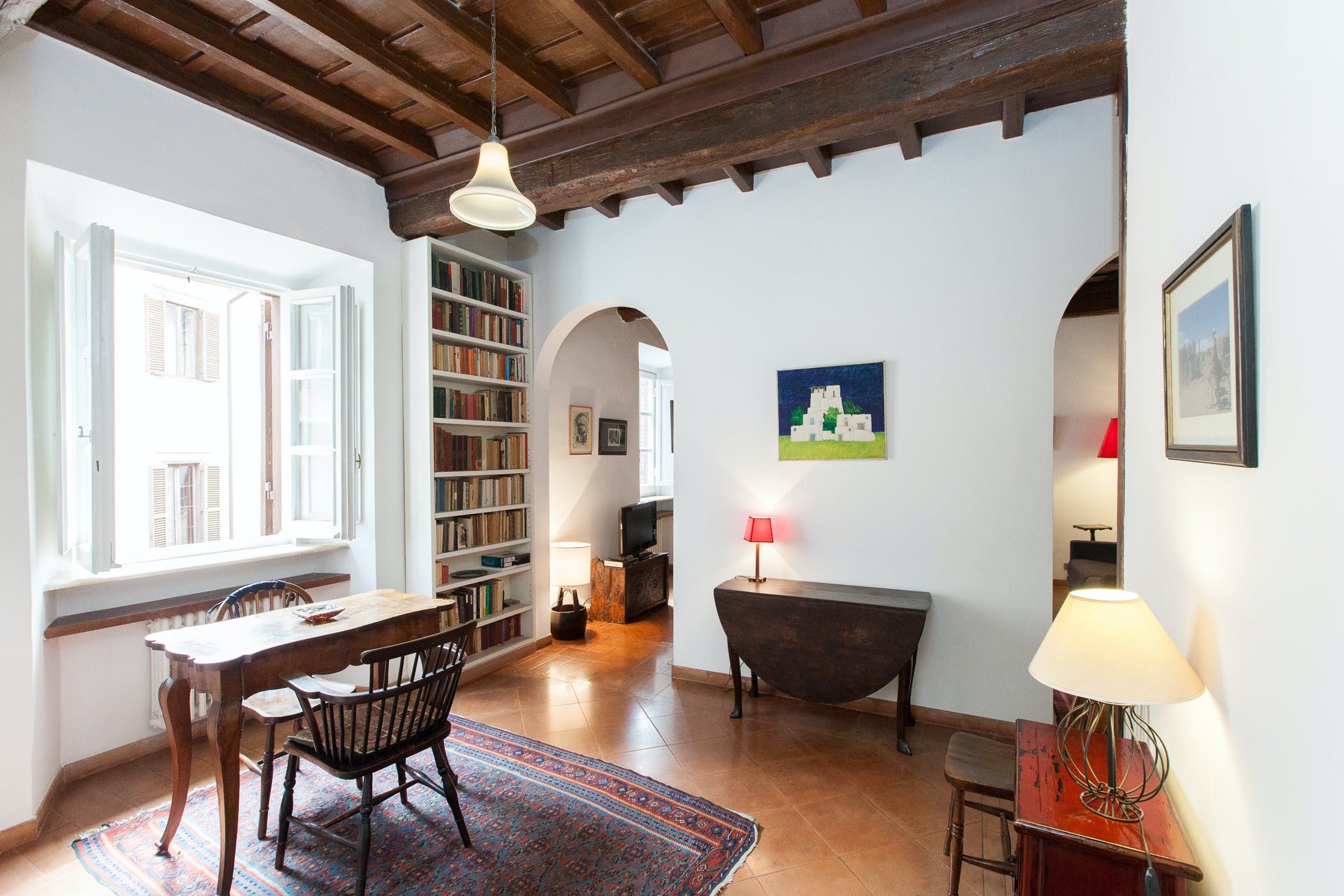 After exploring, come home to this characterful flat, where beamed wooden ceilings, traditional tile floors and vintage furniture create an authentic ambience. Rest weary legs on the sofa, a glass of wine in hand, then rustle up dinner in the glossy kitchen. The bedroom is comfortable and features a quaint Juliet balcony overlooking the courtyard, but our favourite room has to be the study – we adore the floor-to-ceiling bookshelves stuffed with well-thumbed tomes. The antique desk facing the square is the perfect place to get down to business – there's nothing quite like checking your inbox while admiring the hustle and bustle in Largo dei Librari outside.