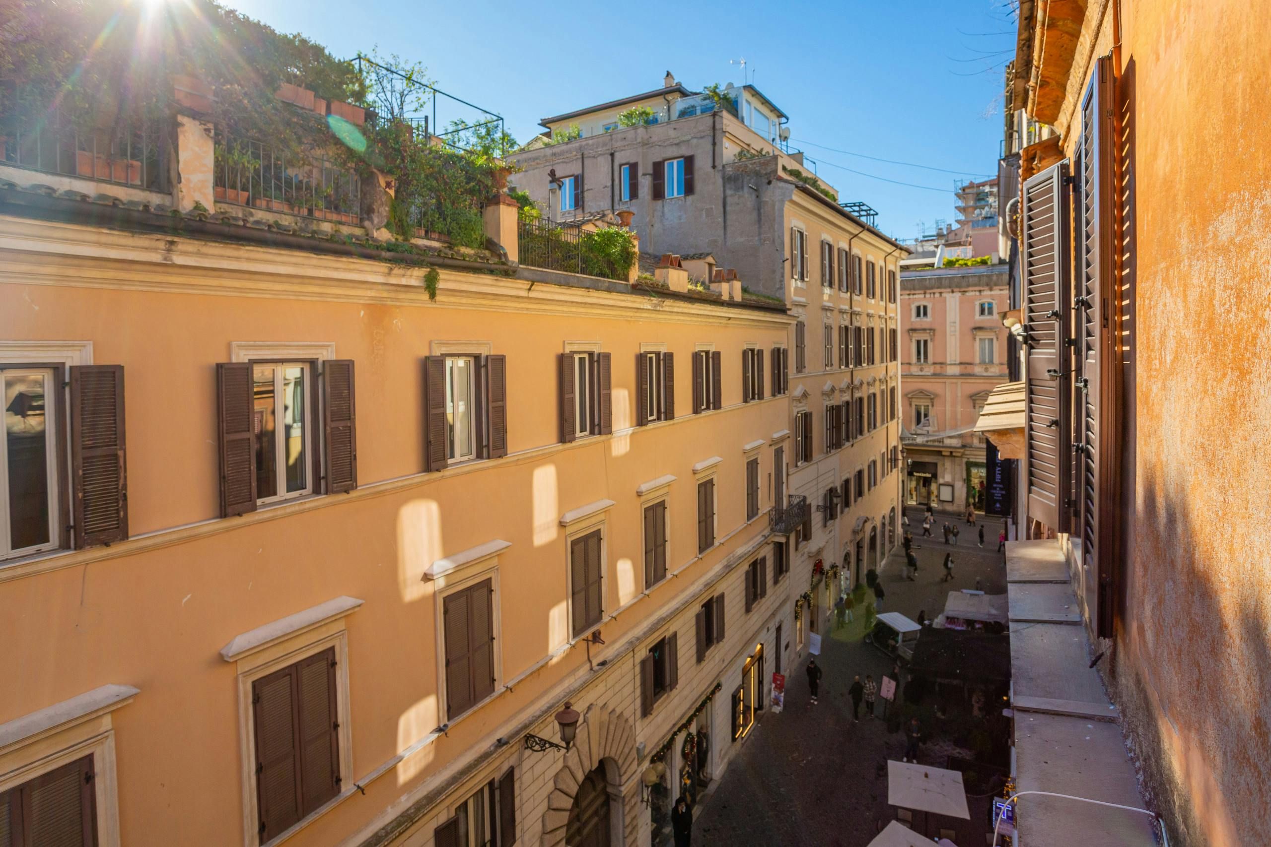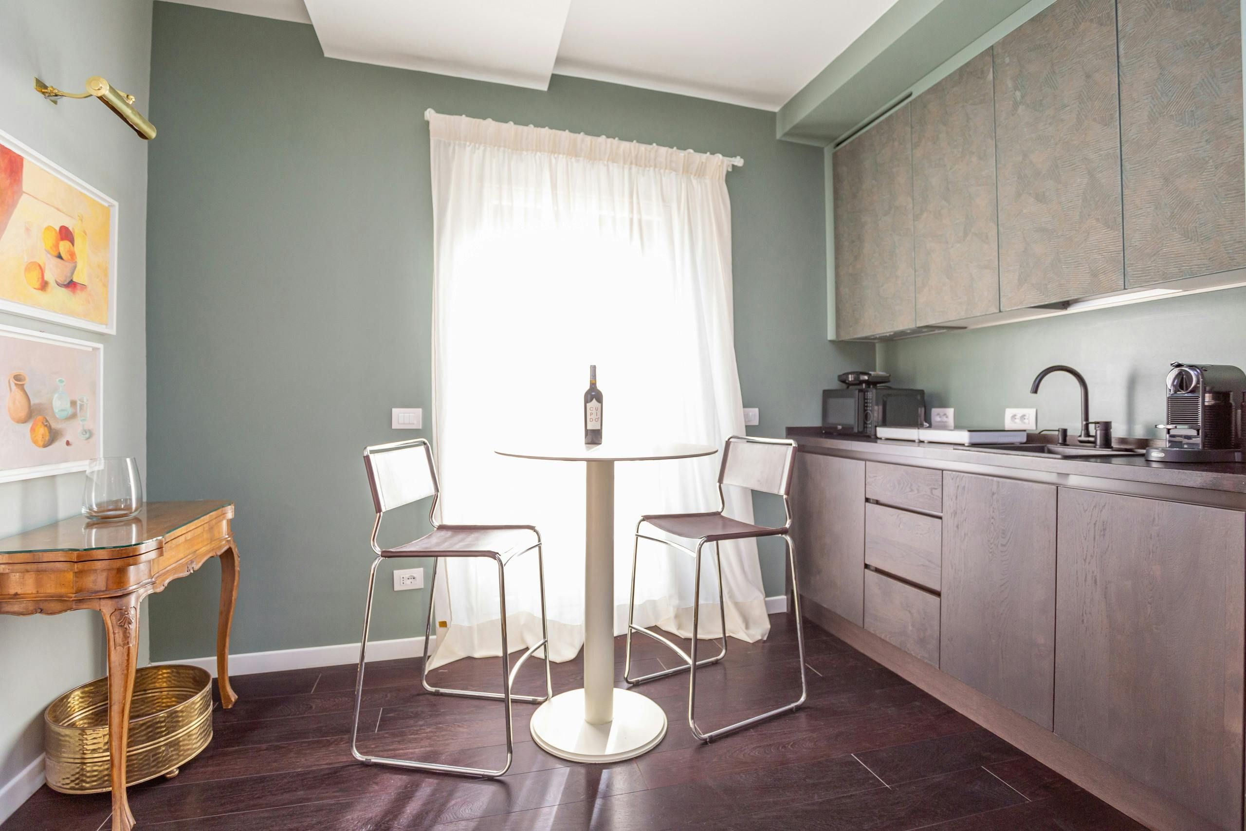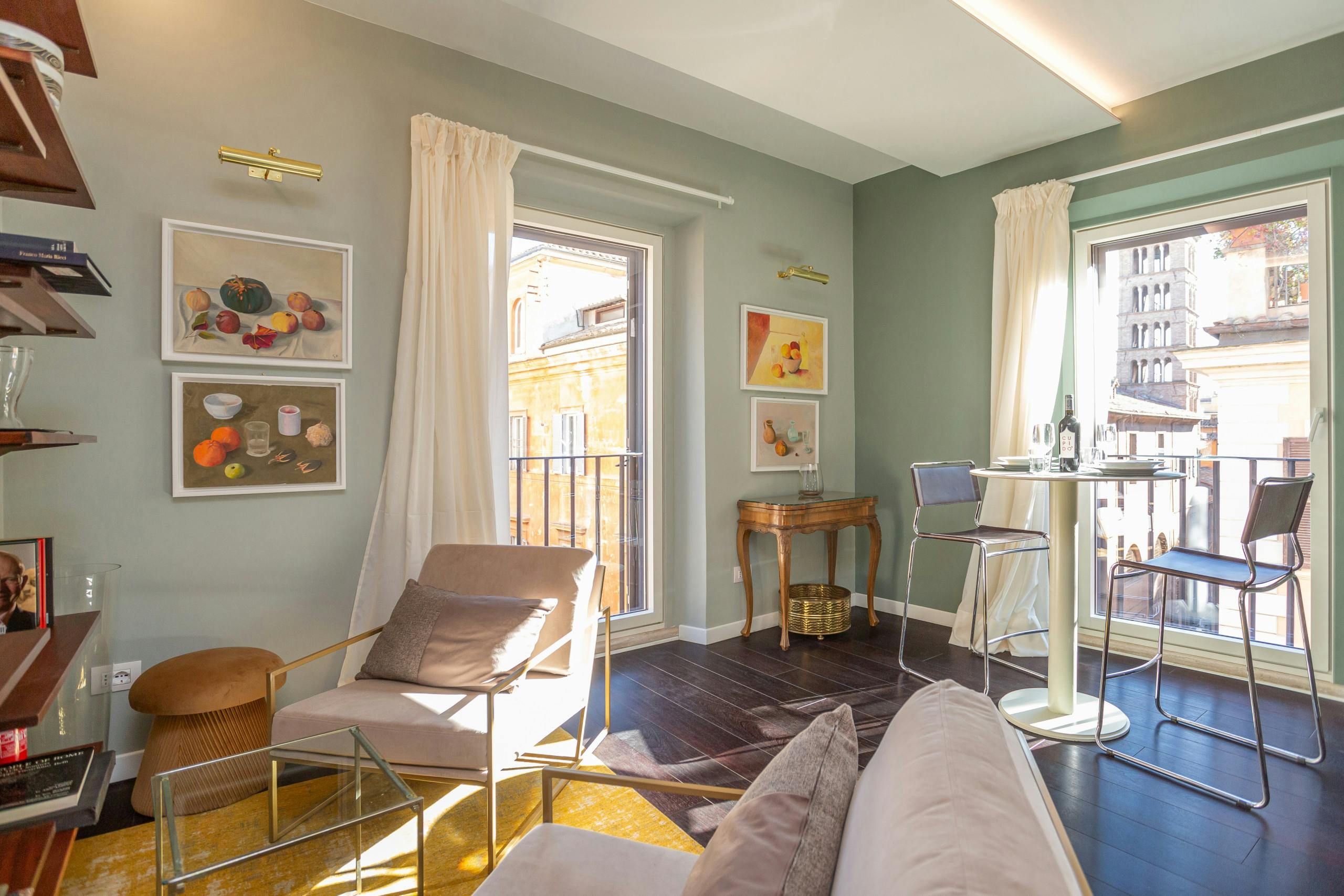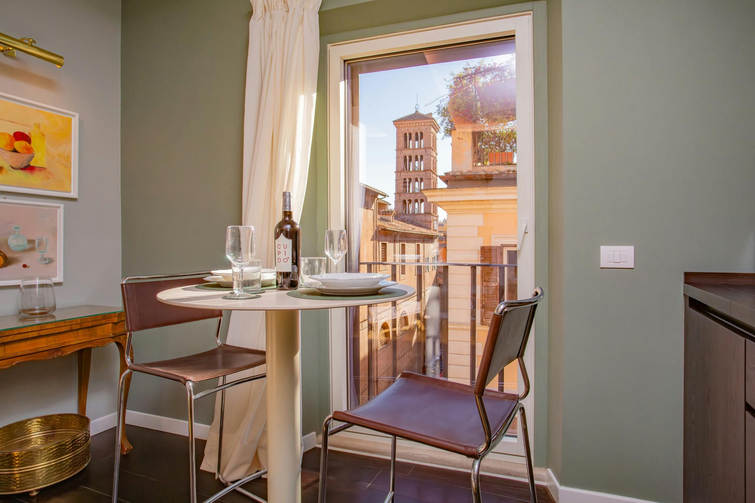 Situated a short stroll from both the Spanish Steps and the Trevi Fountain, this apartment has a fantastic location for exploring Rome. The Pantheon, the Roman Forum and much more are also within walking distance. There are a variety of shops, cafes and restaurants in the neighbourhood to enjoy too. From this home’s open-plan living space, there are wonderful views of the Basilica of Saint Mary in Cosmedin. You can take in the vistas from the dining table. The kitchen area is quite compact, we would say – there’s no oven, but there’s a hob and a microwave. But, with an address as great as this, will you be spending much time at the apartment?