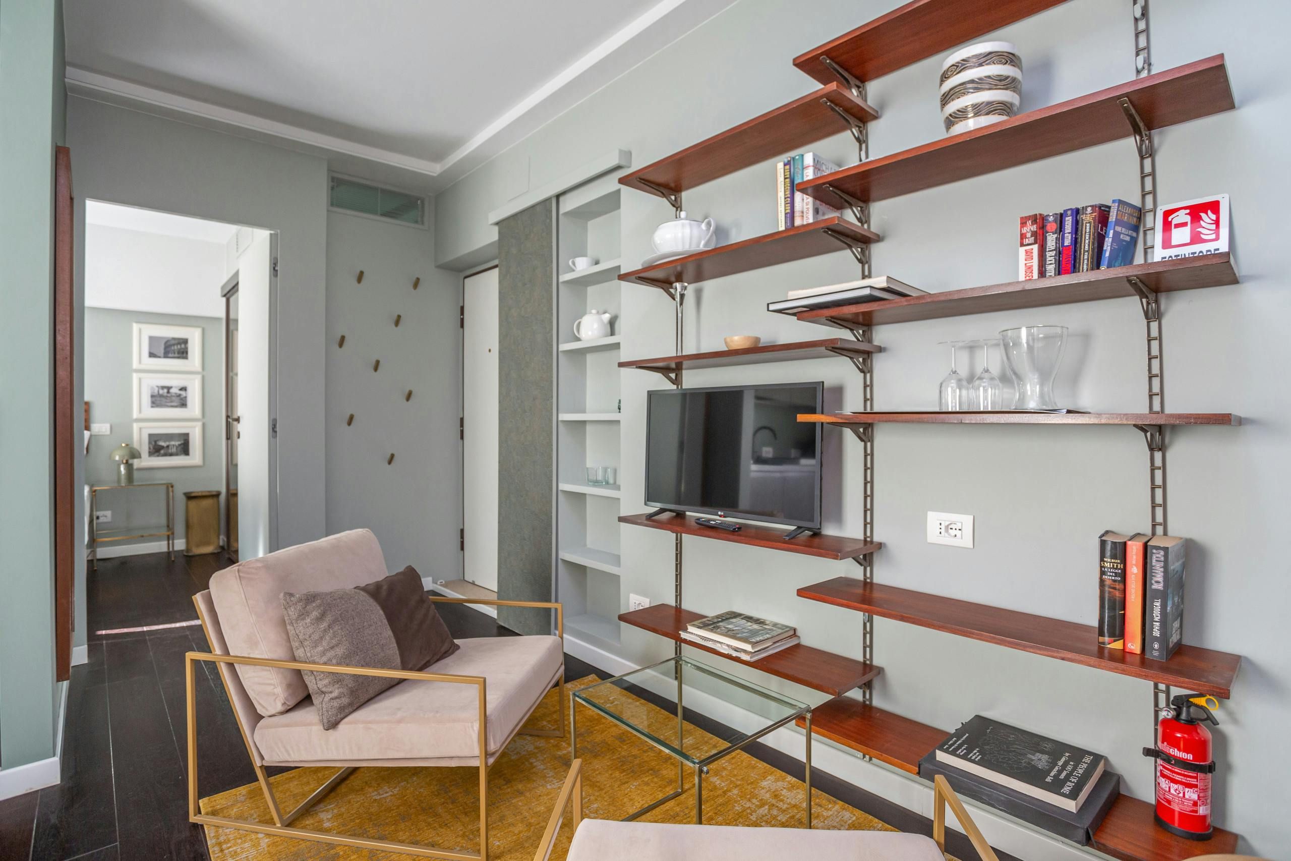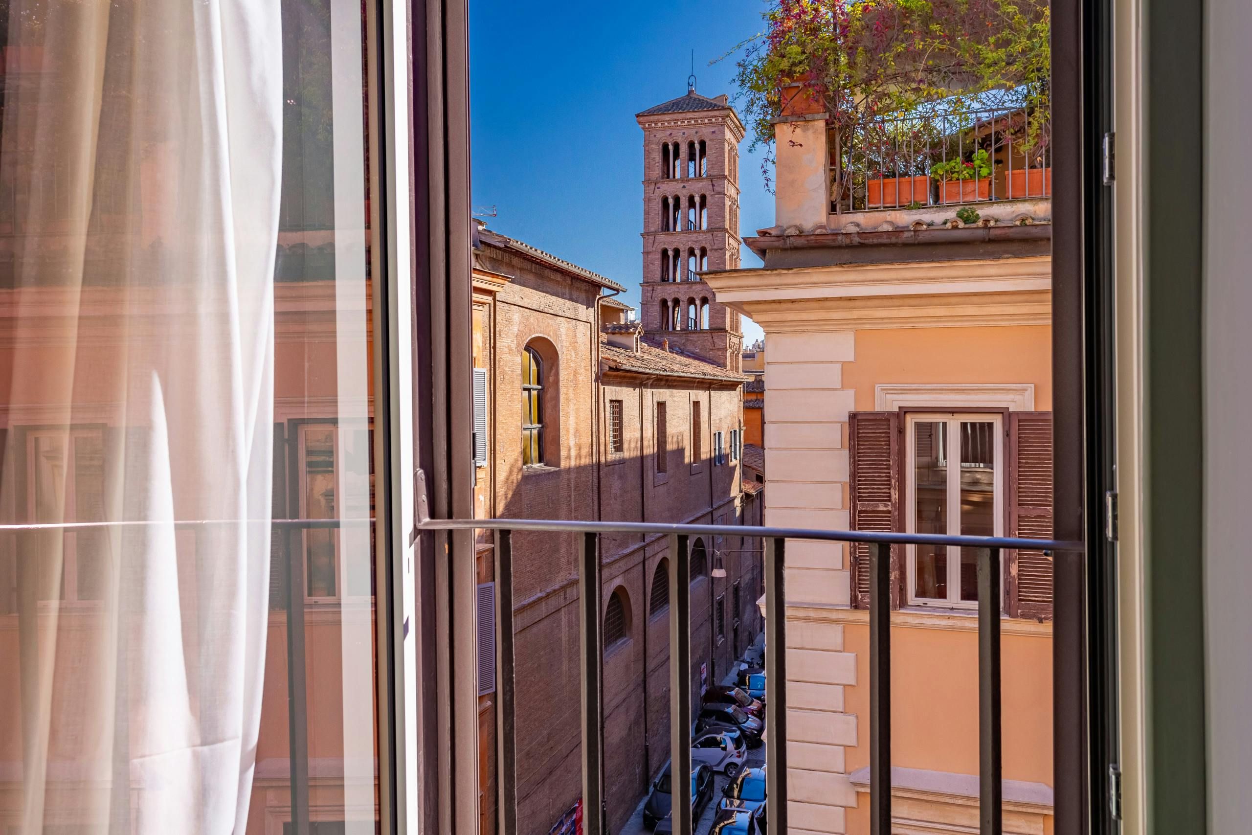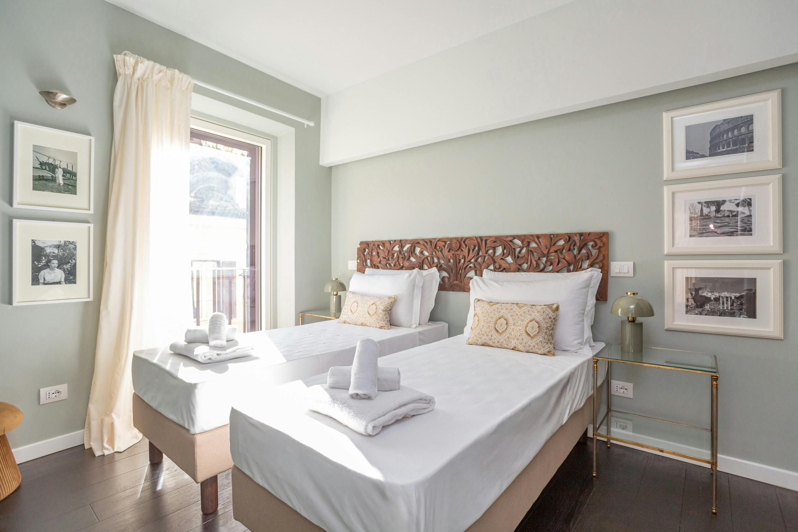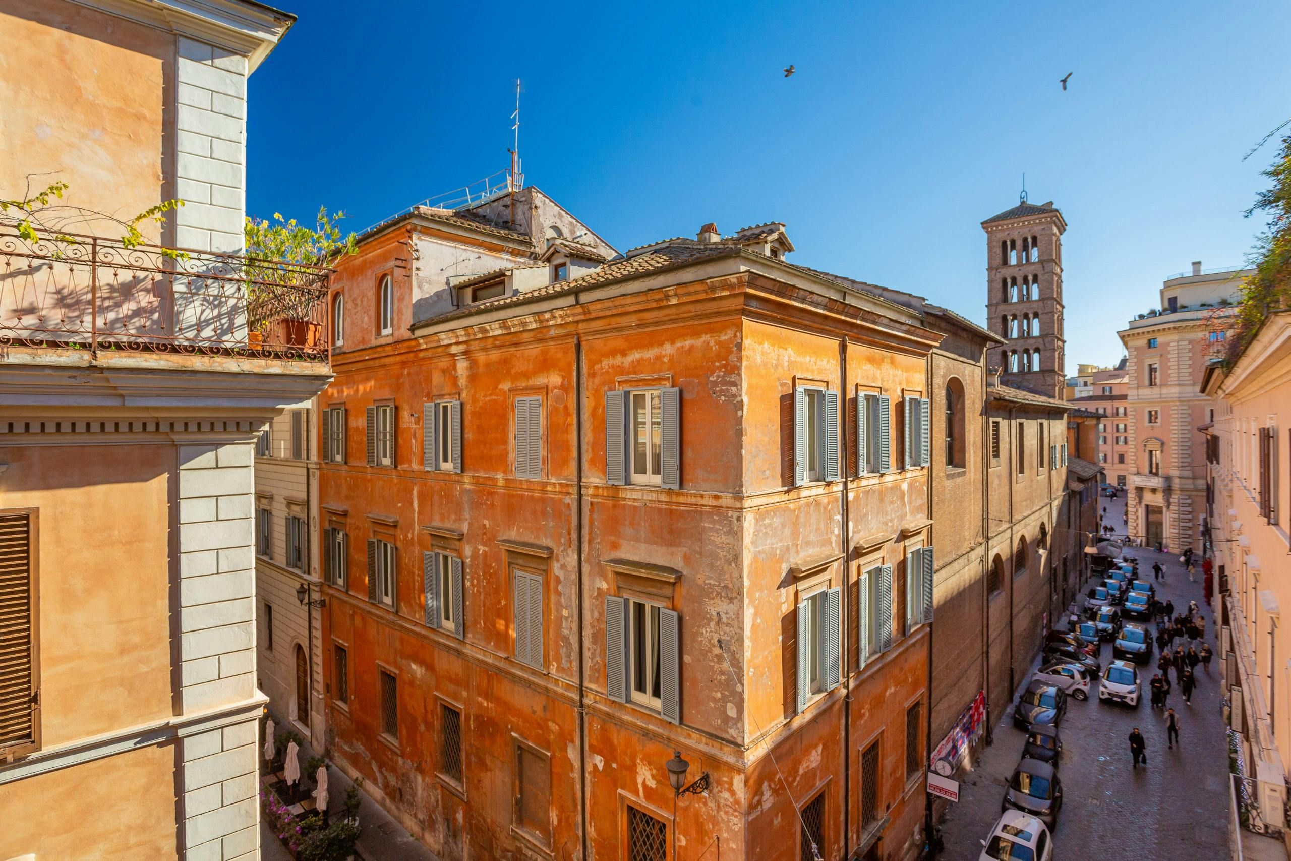 Situated a short stroll from both the Spanish Steps and the Trevi Fountain, this apartment has a fantastic location for exploring Rome. The Pantheon, the Roman Forum and much more are also within walking distance. There are a variety of shops, cafes and restaurants in the neighbourhood to enjoy too. From this home’s open-plan living space, there are wonderful views of the Basilica of Saint Mary in Cosmedin. You can take in the vistas from the dining table. The kitchen area is quite compact, we would say – there’s no oven, but there’s a hob and a microwave. But, with an address as great as this, will you be spending much time at the apartment?