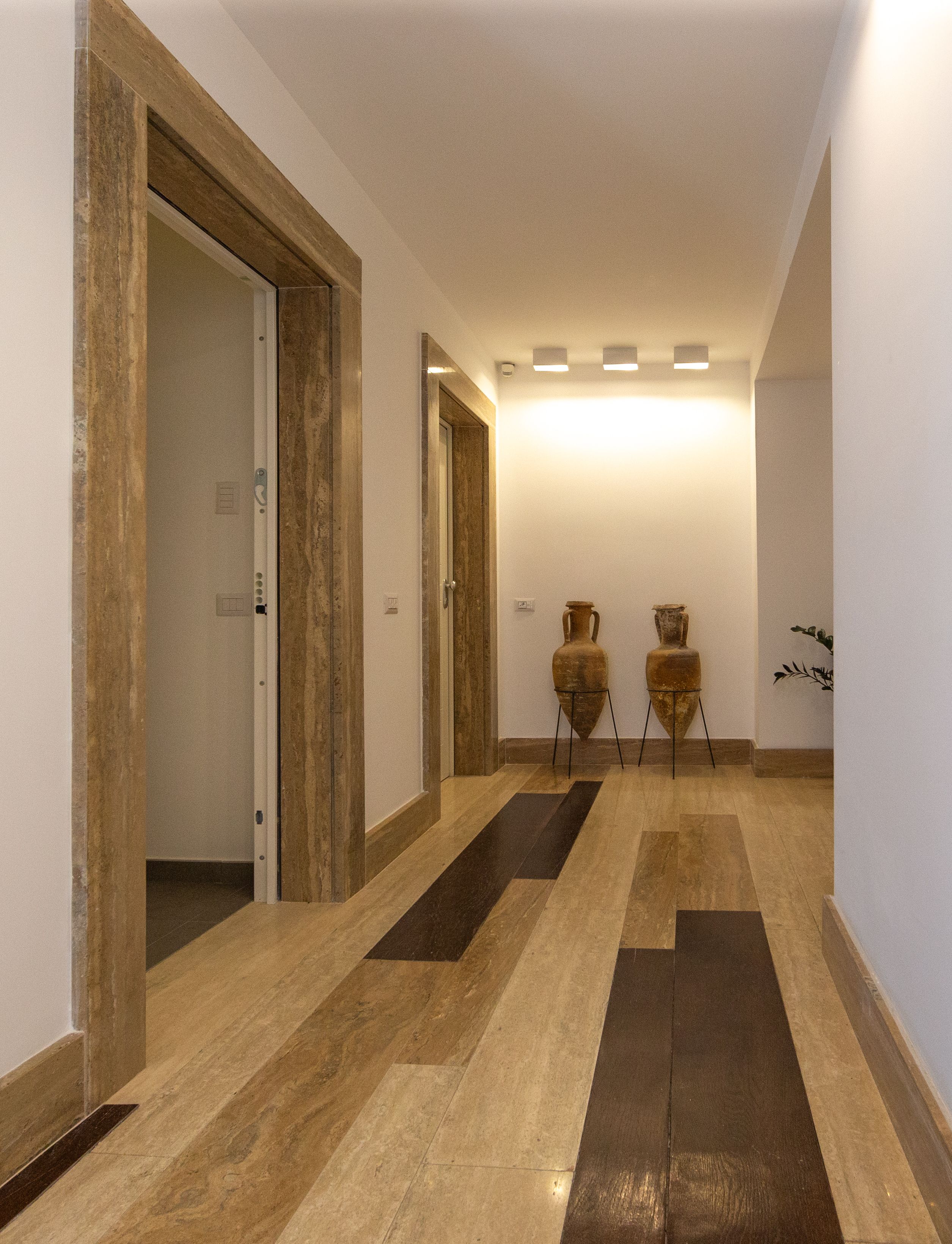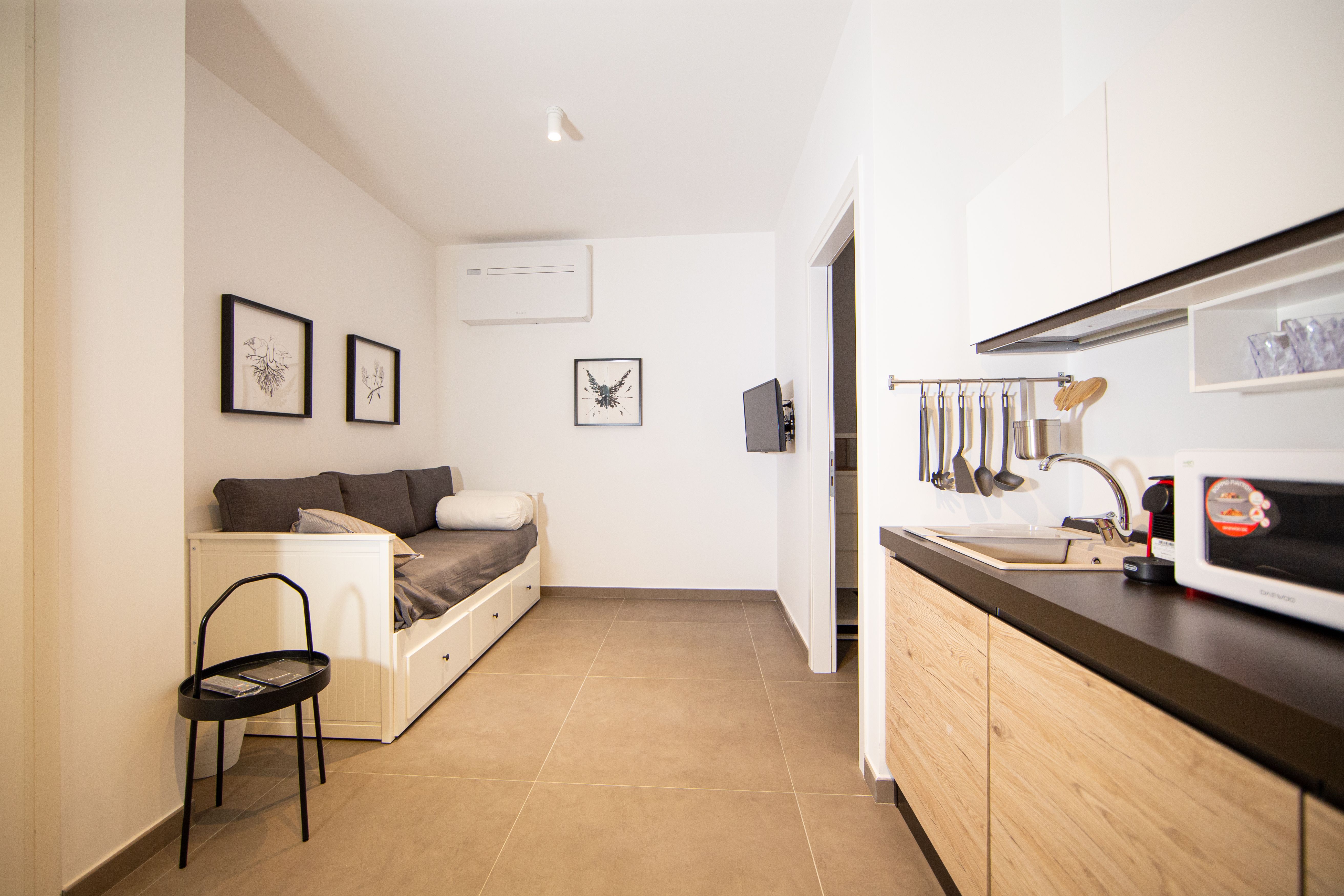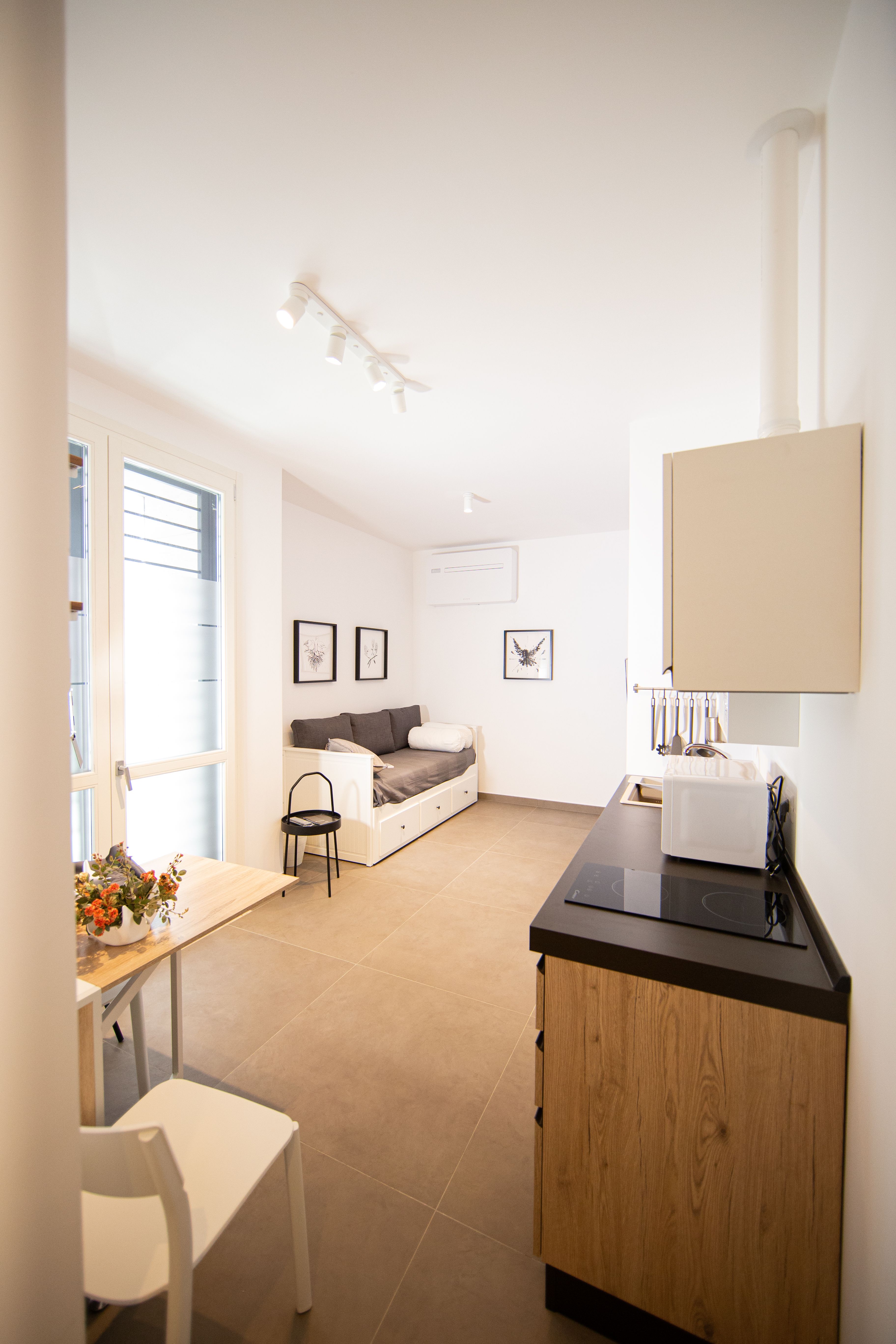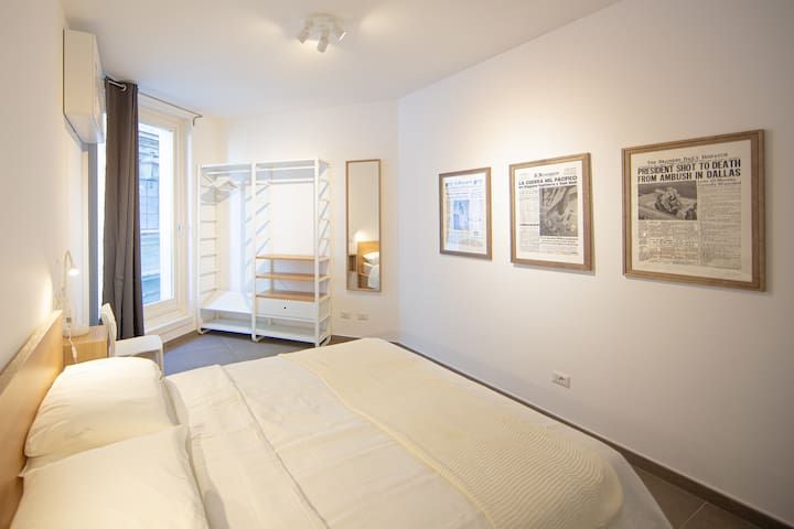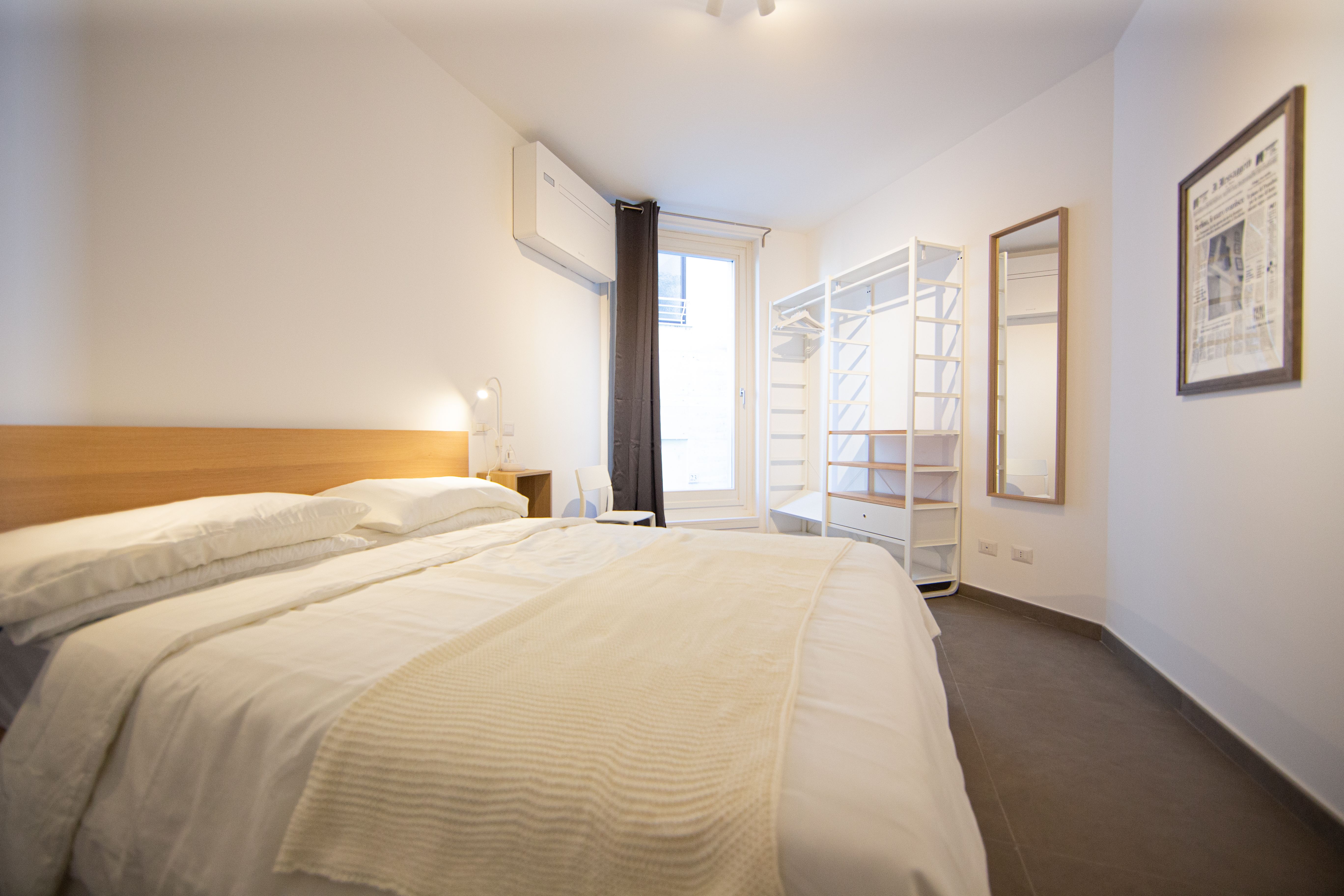 The apartment itself is a pristine white haven from the buzzing city surroundings. The monochrome palette of slate-grey, white and black is only broken by wooden accents, courtesy of the compact kitchenette. Newspaper prints from Italy’s history complete the black and white filter effect in the calming bedroom.