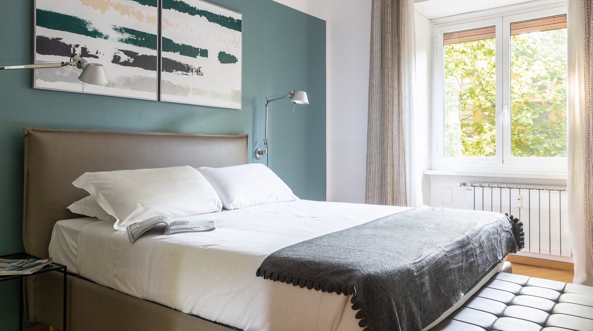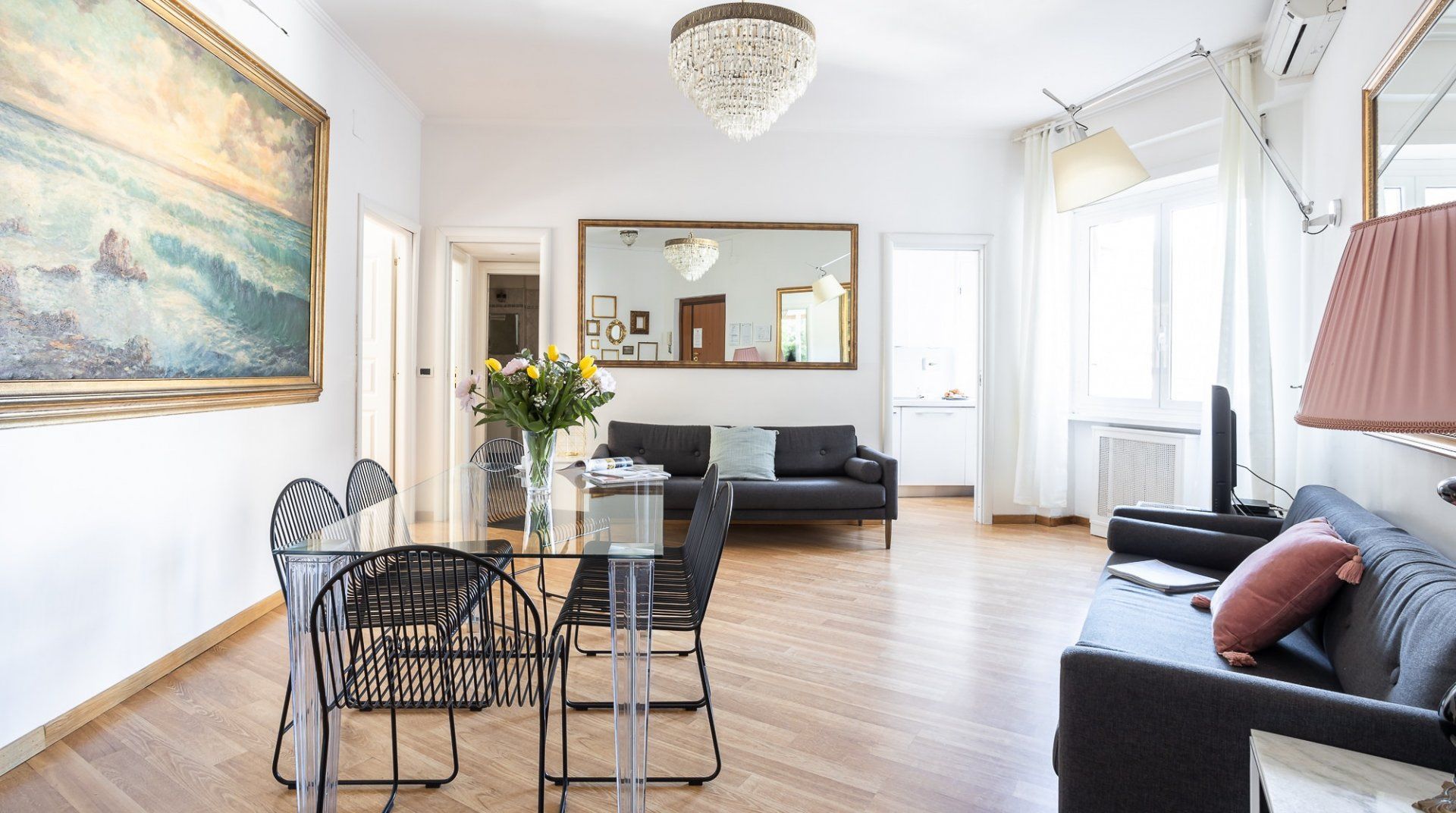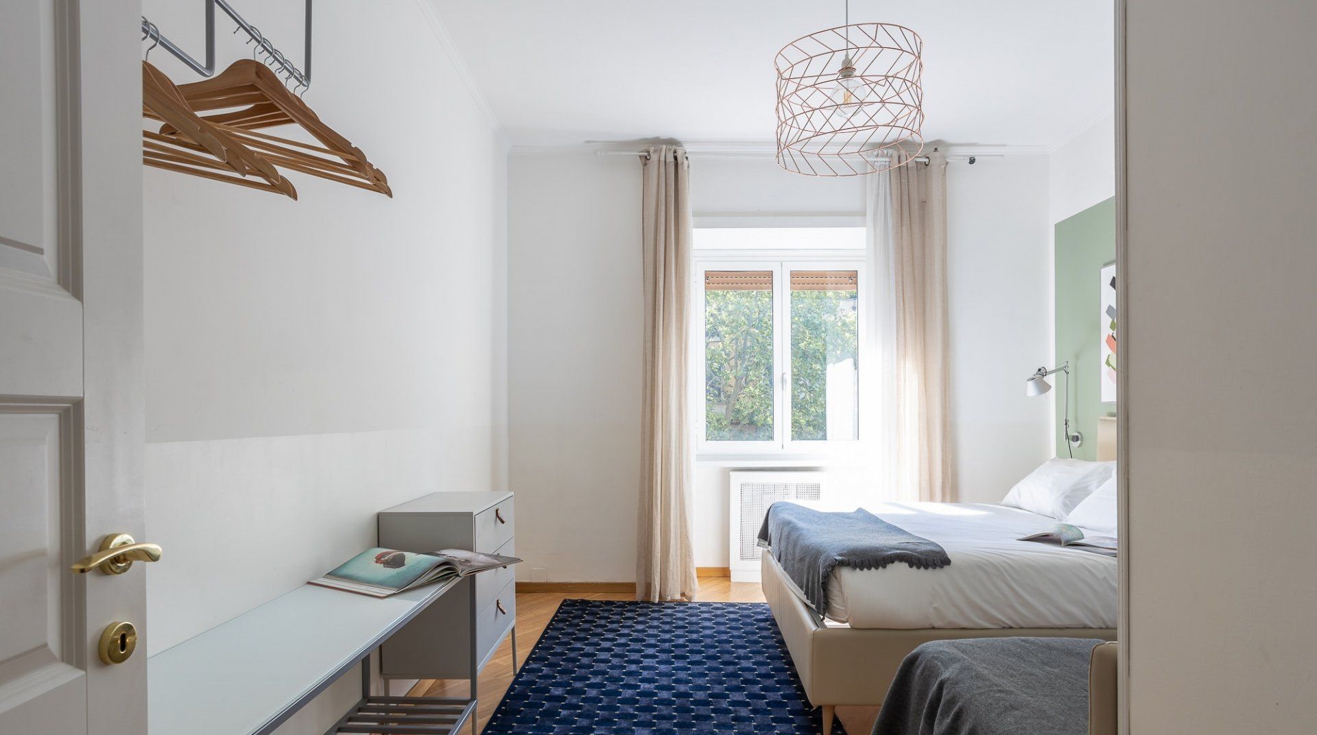 Uniting Rome past and present, this bright apartment offers modern comfort and style in the heart of the old-world Trastevere neighbourhood. Inside, it’s all high ceilings, parquet floors, big windows and vibrant feature walls. A cosy balcony sits among the treetops – it’s the perfect spot for a cappuccino after breakfast. Cook up Roman classics in the kitchen and dine together in the light-filled living space. Or, leave it to the professionals and hole up in a traditional trattoria. Explore the labyrinthine cobbled lanes, where spirited bars are cloaked by tumbling ivy and laidback cafes draw a bohemian crowd. Piazza di Santa Maria, a five-minute walk from your place, buzzes well into the evening. People-watch with an aperitivo or grab a gelato to go and stroll along the River Tiber. On the opposite side of the water, no more than a fifteen-minute stroll away, you’ll find the Galleria Spada, Palazzo Farnese and the Campo de' Fiori.