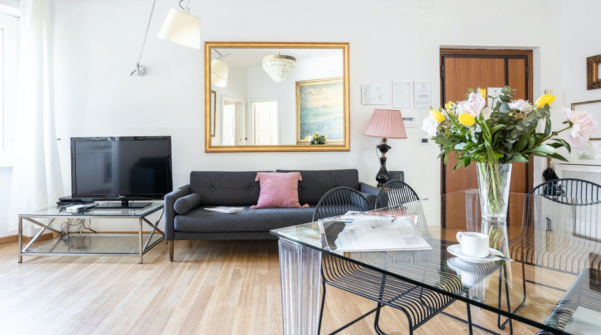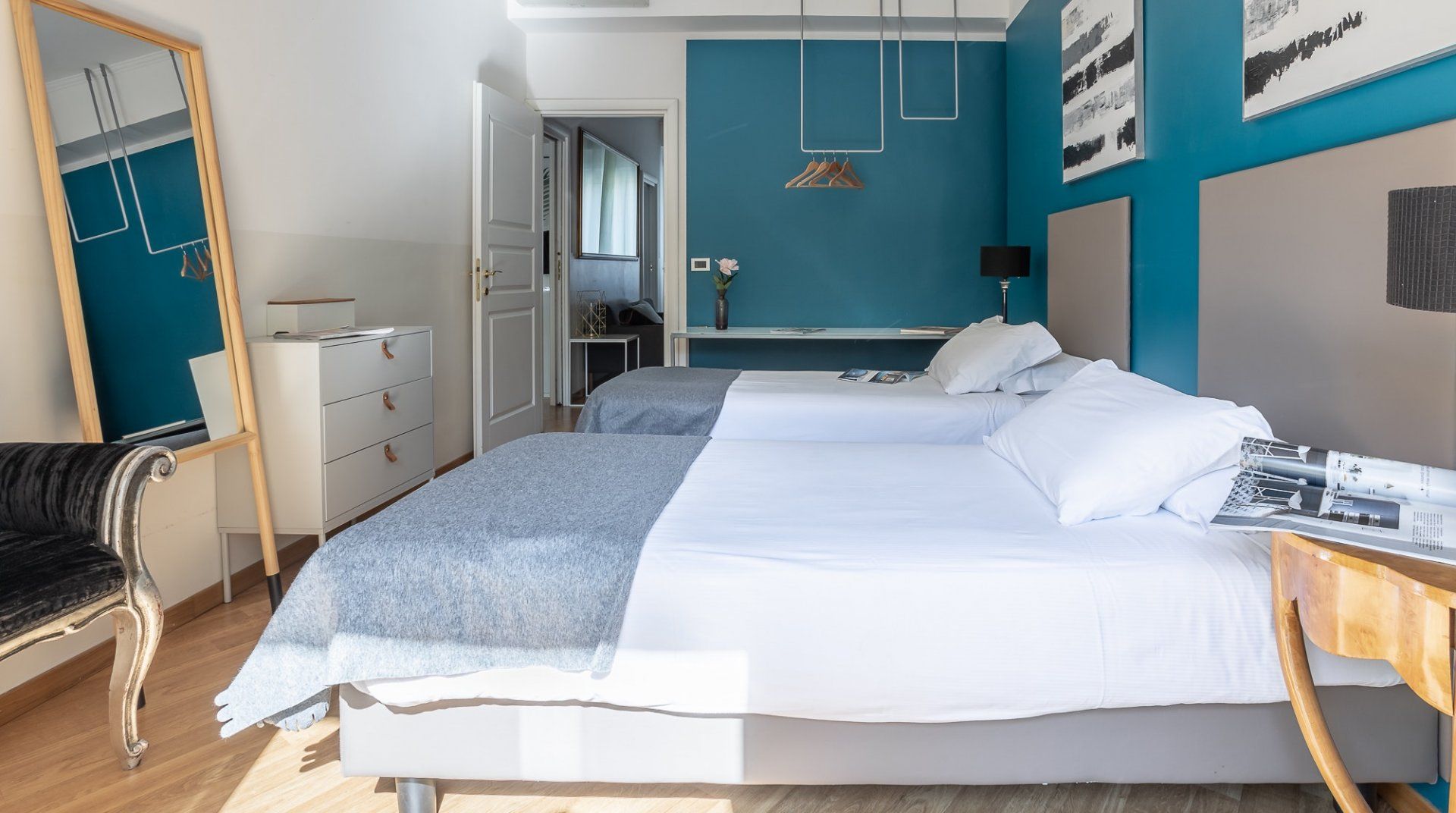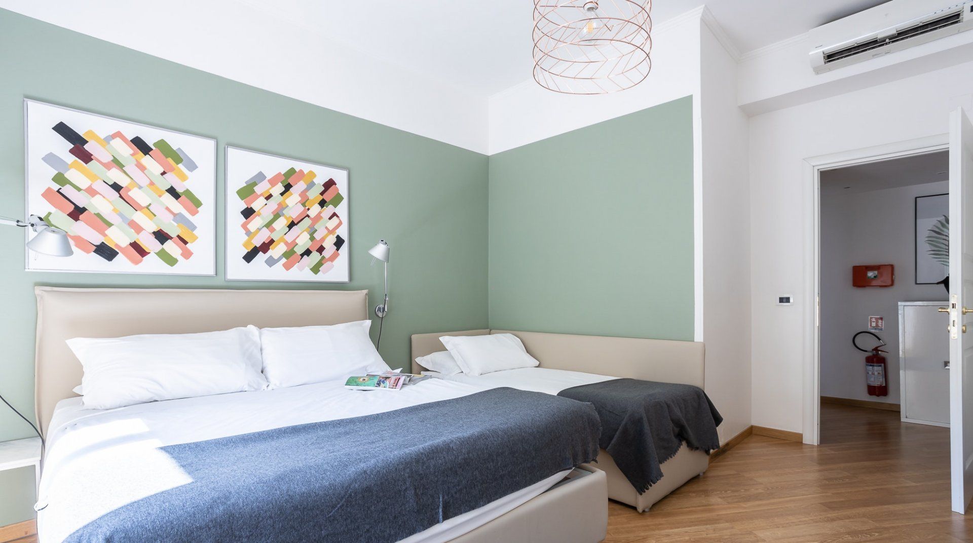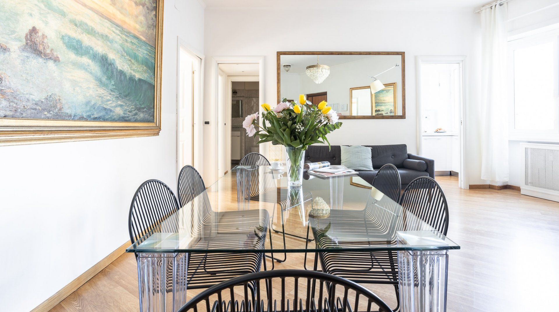 Uniting Rome past and present, this bright apartment offers modern comfort and style in the heart of the old-world Trastevere neighbourhood. Inside, it’s all high ceilings, parquet floors, big windows and vibrant feature walls. A cosy balcony sits among the treetops – it’s the perfect spot for a cappuccino after breakfast. Cook up Roman classics in the kitchen and dine together in the light-filled living space. Or, leave it to the professionals and hole up in a traditional trattoria. Explore the labyrinthine cobbled lanes, where spirited bars are cloaked by tumbling ivy and laidback cafes draw a bohemian crowd. Piazza di Santa Maria, a five-minute walk from your place, buzzes well into the evening. People-watch with an aperitivo or grab a gelato to go and stroll along the River Tiber. On the opposite side of the water, no more than a fifteen-minute stroll away, you’ll find the Galleria Spada, Palazzo Farnese and the Campo de' Fiori.