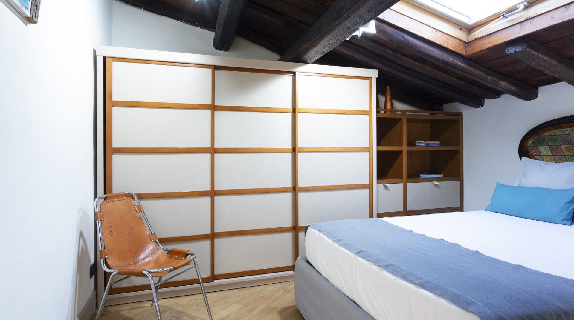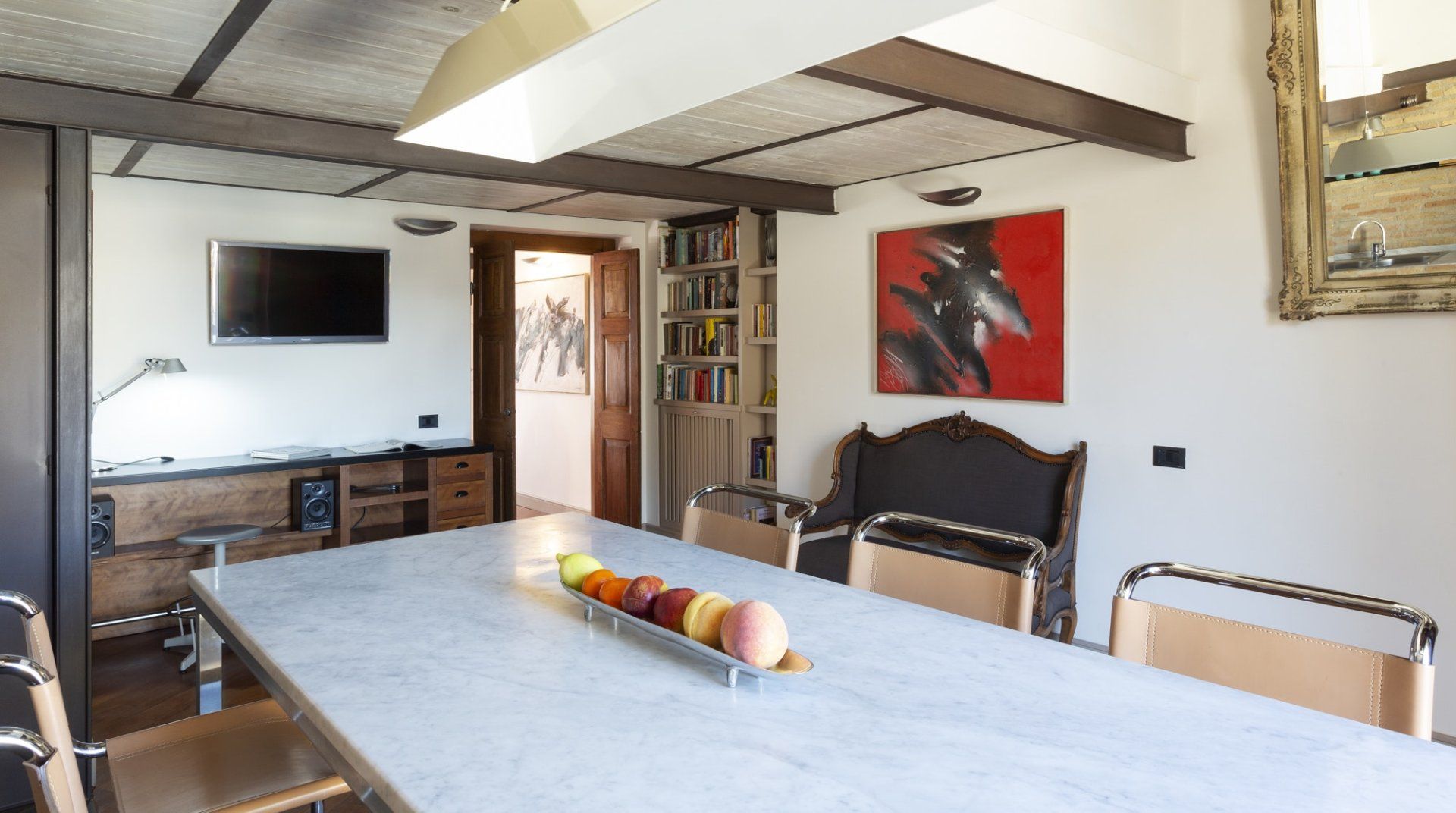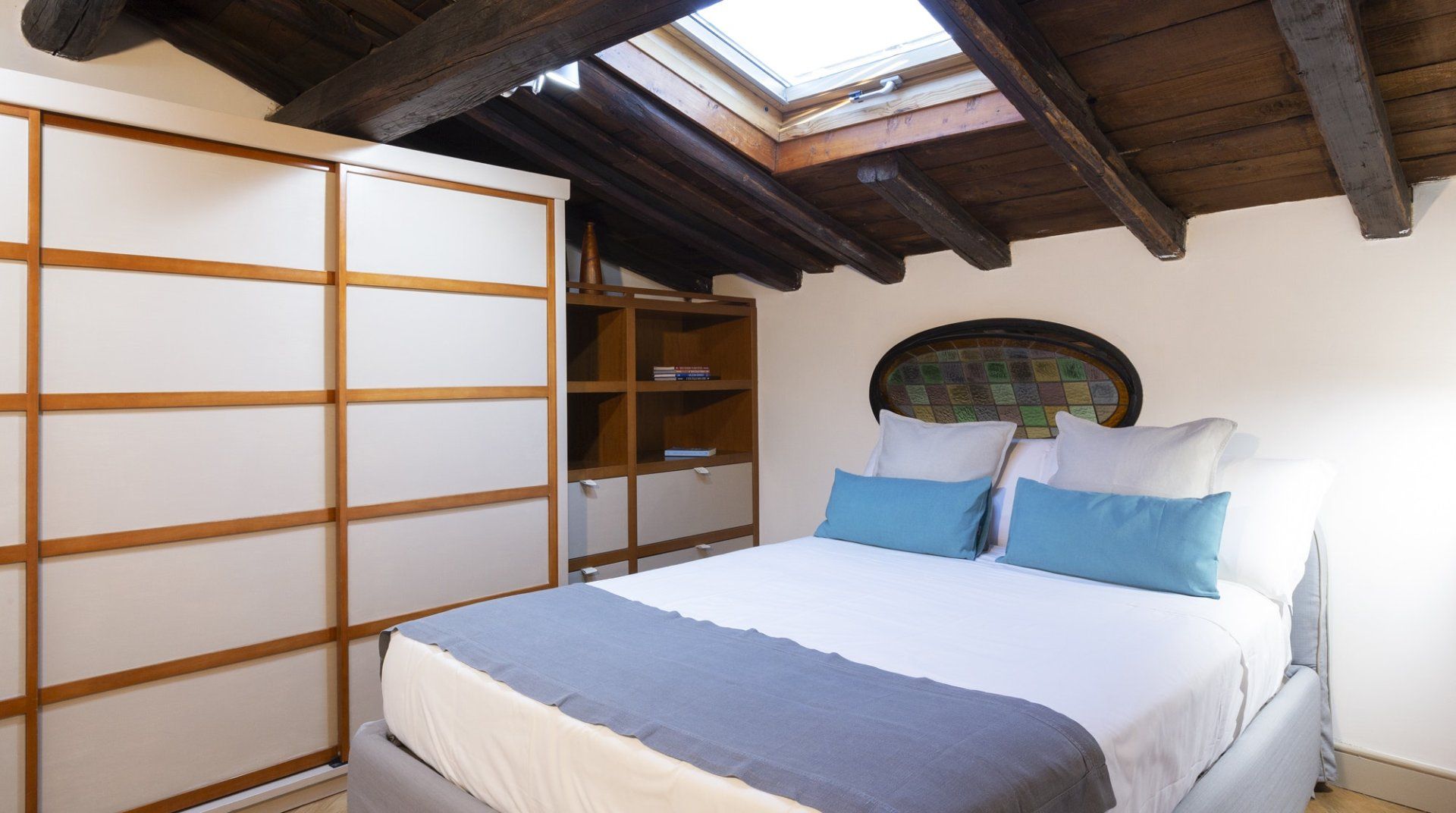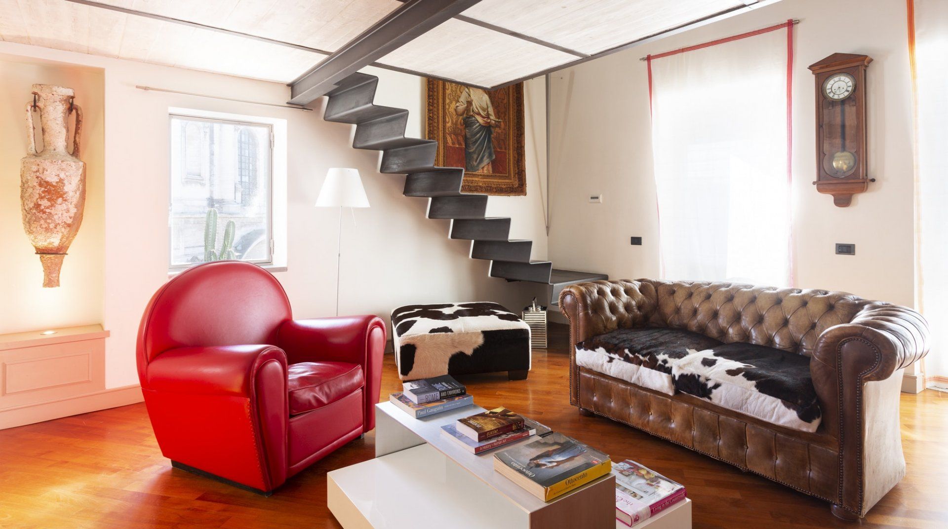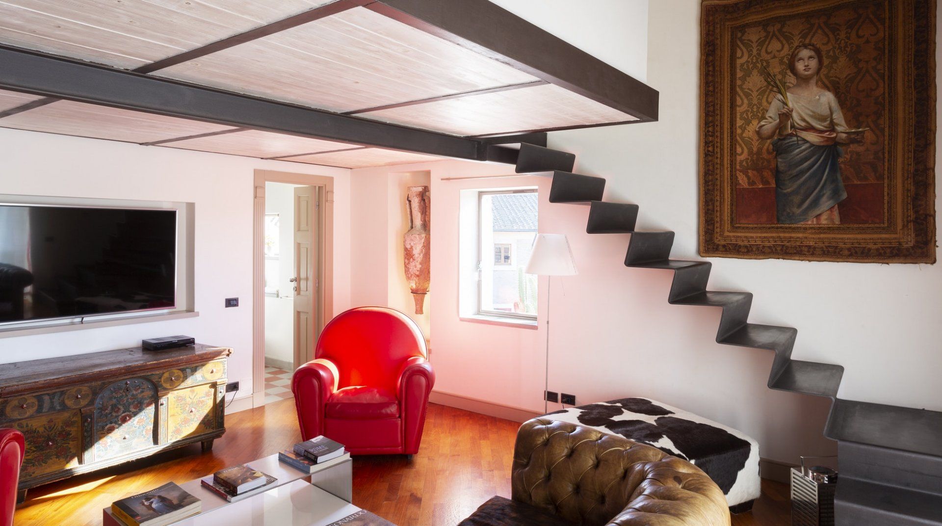 Combining antique pieces with modern details, this unique apartment on the top floor of a 16th-century aristocratic palace has plenty of character and Roman soul. Stepping into the living room, you'll find chic decor and vibrant pops of colours, with the red leather armchairs, an animal print chesterfield sofa and abstract artwork. While the statement design pieces really pack a punch, it's the antique objects, low beamed ceiling and floor-to-ceiling bookshelves that caught our attention. Choose a book from the extensive collection for a spot of bedtime reading. Ascend the floating staircase up to the cosy bedrooms, benefitting from sloped wooden ceilings and slatted screens that make for a private and homely space to unwind. Exposed brickwork in the kitchen contrasts nicely with the otherwise clean and modern design, making a great area to enjoy group meals. Elsewhere, those keeping one eye on work during their stay will notice the home office space in the corner of the living room. Emails seen to, it's out for a day spent taking in Rome's most beloved sights – pennies at the ready, Trevi Fountain is just a short four-minute stroll away. The home's position just off Via del Corso means it's easy to get to many of the attractions in the city on foot. Last, but certainly not least, round off a lovely day spent sightseeing with a tipple of limoncello from your private balcony, offering a spectacular view of the church of Sant’Ignazio – it's truly special.
