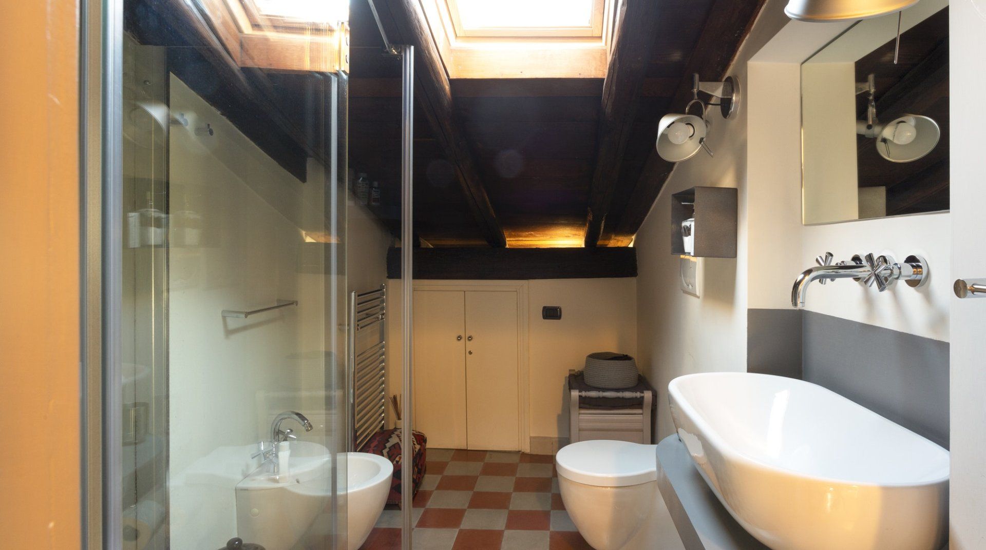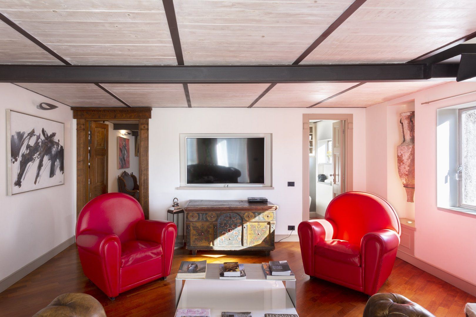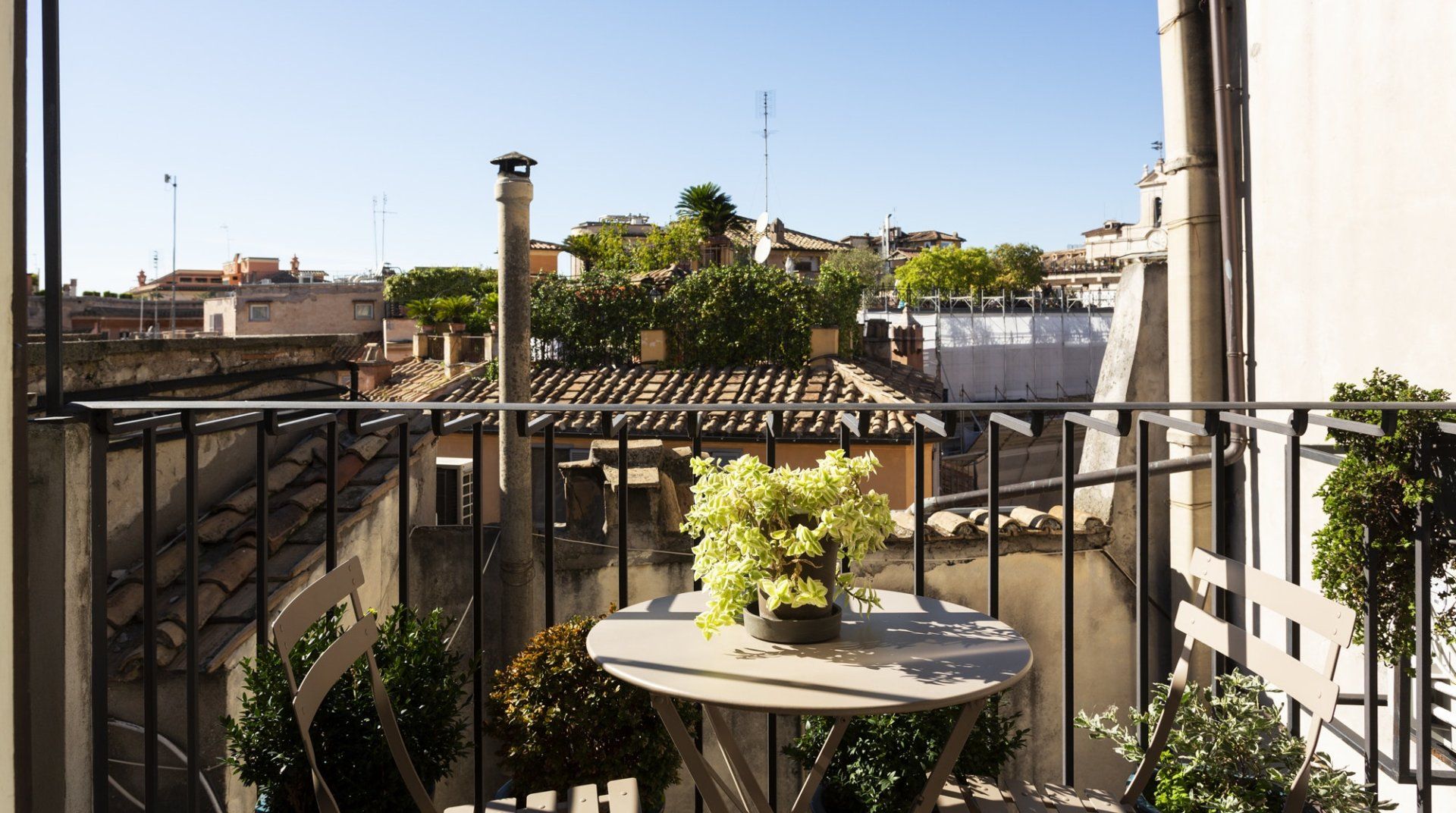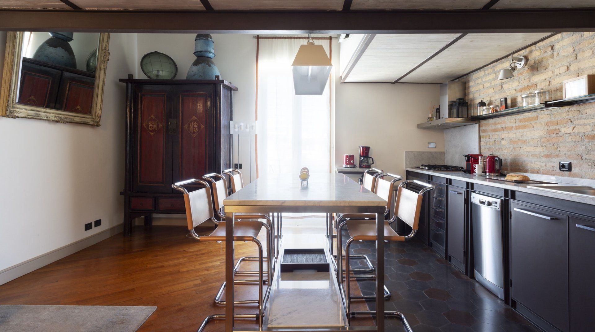 Combining antique pieces with modern details, this unique apartment on the top floor of a 16th-century aristocratic palace has plenty of character and Roman soul. Stepping into the living room, you'll find chic decor and vibrant pops of colours, with the red leather armchairs, an animal print chesterfield sofa and abstract artwork. While the statement design pieces really pack a punch, it's the antique objects, low beamed ceiling and floor-to-ceiling bookshelves that caught our attention. Choose a book from the extensive collection for a spot of bedtime reading. Ascend the floating staircase up to the cosy bedrooms, benefitting from sloped wooden ceilings and slatted screens that make for a private and homely space to unwind. Exposed brickwork in the kitchen contrasts nicely with the otherwise clean and modern design, making a great area to enjoy group meals. Elsewhere, those keeping one eye on work during their stay will notice the home office space in the corner of the living room. Emails seen to, it's out for a day spent taking in Rome's most beloved sights – pennies at the ready, Trevi Fountain is just a short four-minute stroll away. The home's position just off Via del Corso means it's easy to get to many of the attractions in the city on foot. Last, but certainly not least, round off a lovely day spent sightseeing with a tipple of limoncello from your private balcony, offering a spectacular view of the church of Sant’Ignazio – it's truly special.