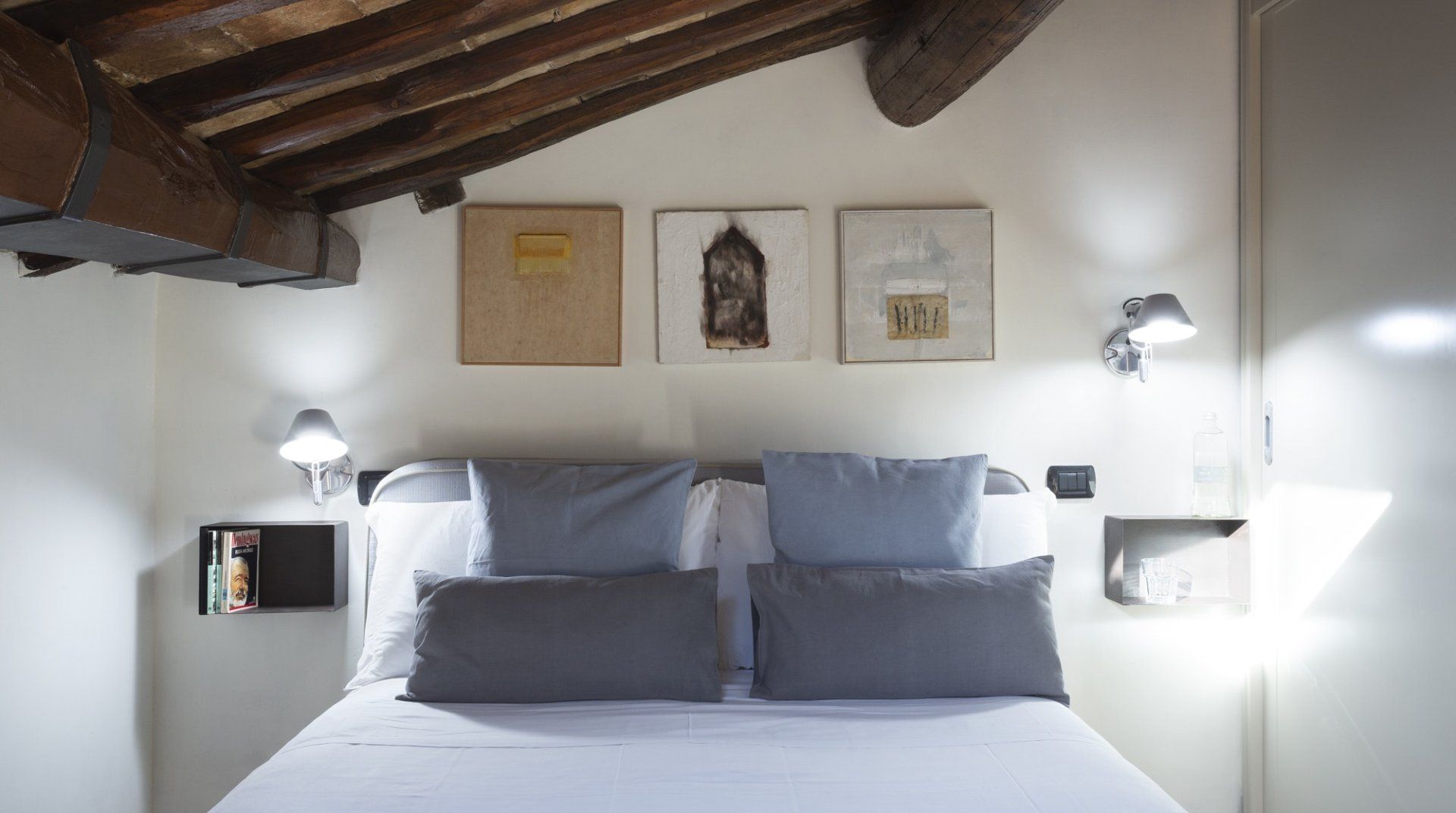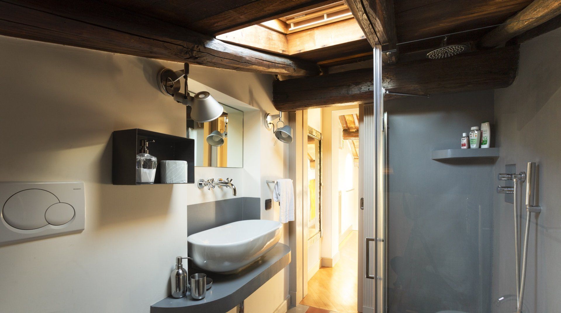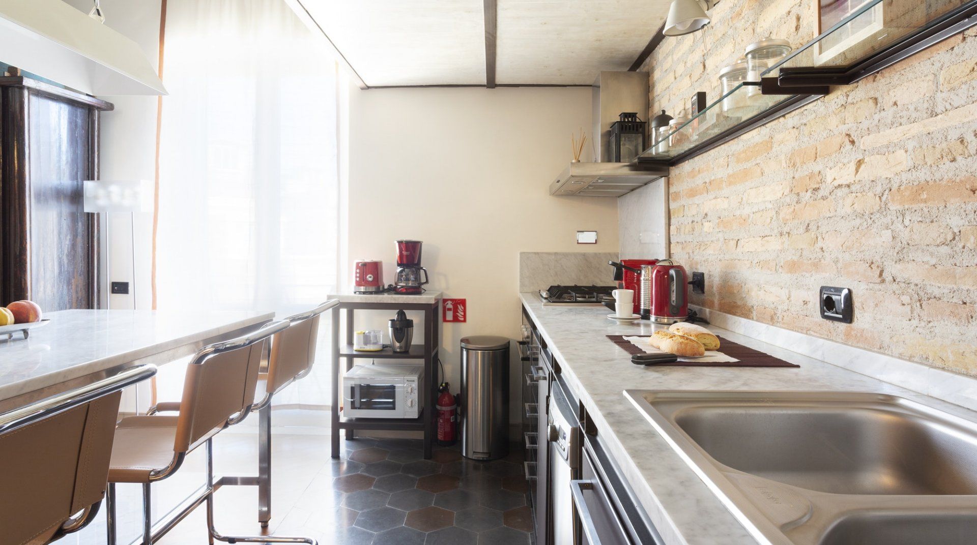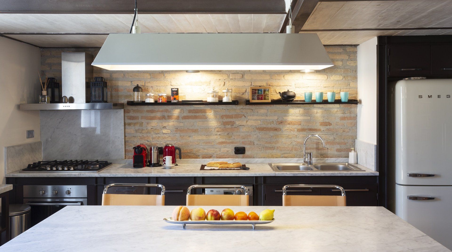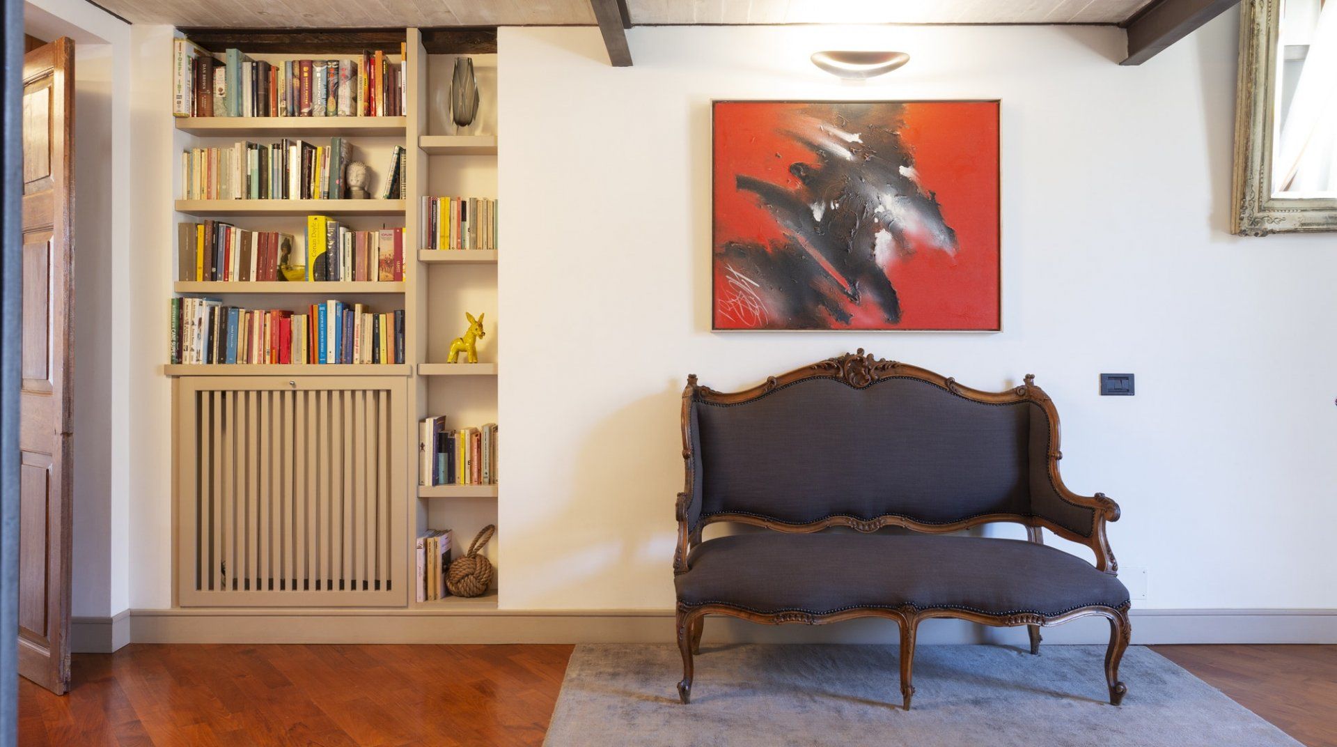 Combining antique pieces with modern details, this unique apartment on the top floor of a 16th-century aristocratic palace has plenty of character and Roman soul. Stepping into the living room, you'll find chic decor and vibrant pops of colours, with the red leather armchairs, an animal print chesterfield sofa and abstract artwork. While the statement design pieces really pack a punch, it's the antique objects, low beamed ceiling and floor-to-ceiling bookshelves that caught our attention. Choose a book from the extensive collection for a spot of bedtime reading. Ascend the floating staircase up to the cosy bedrooms, benefitting from sloped wooden ceilings and slatted screens that make for a private and homely space to unwind. Exposed brickwork in the kitchen contrasts nicely with the otherwise clean and modern design, making a great area to enjoy group meals. Elsewhere, those keeping one eye on work during their stay will notice the home office space in the corner of the living room. Emails seen to, it's out for a day spent taking in Rome's most beloved sights – pennies at the ready, Trevi Fountain is just a short four-minute stroll away. The home's position just off Via del Corso means it's easy to get to many of the attractions in the city on foot. Last, but certainly not least, round off a lovely day spent sightseeing with a tipple of limoncello from your private balcony, offering a spectacular view of the church of Sant’Ignazio – it's truly special.