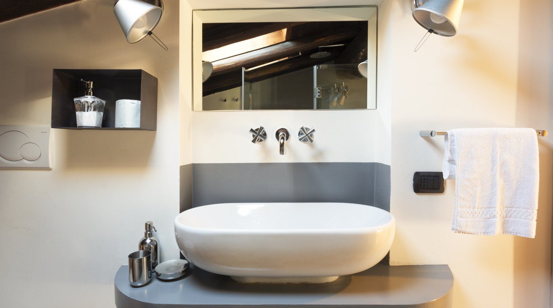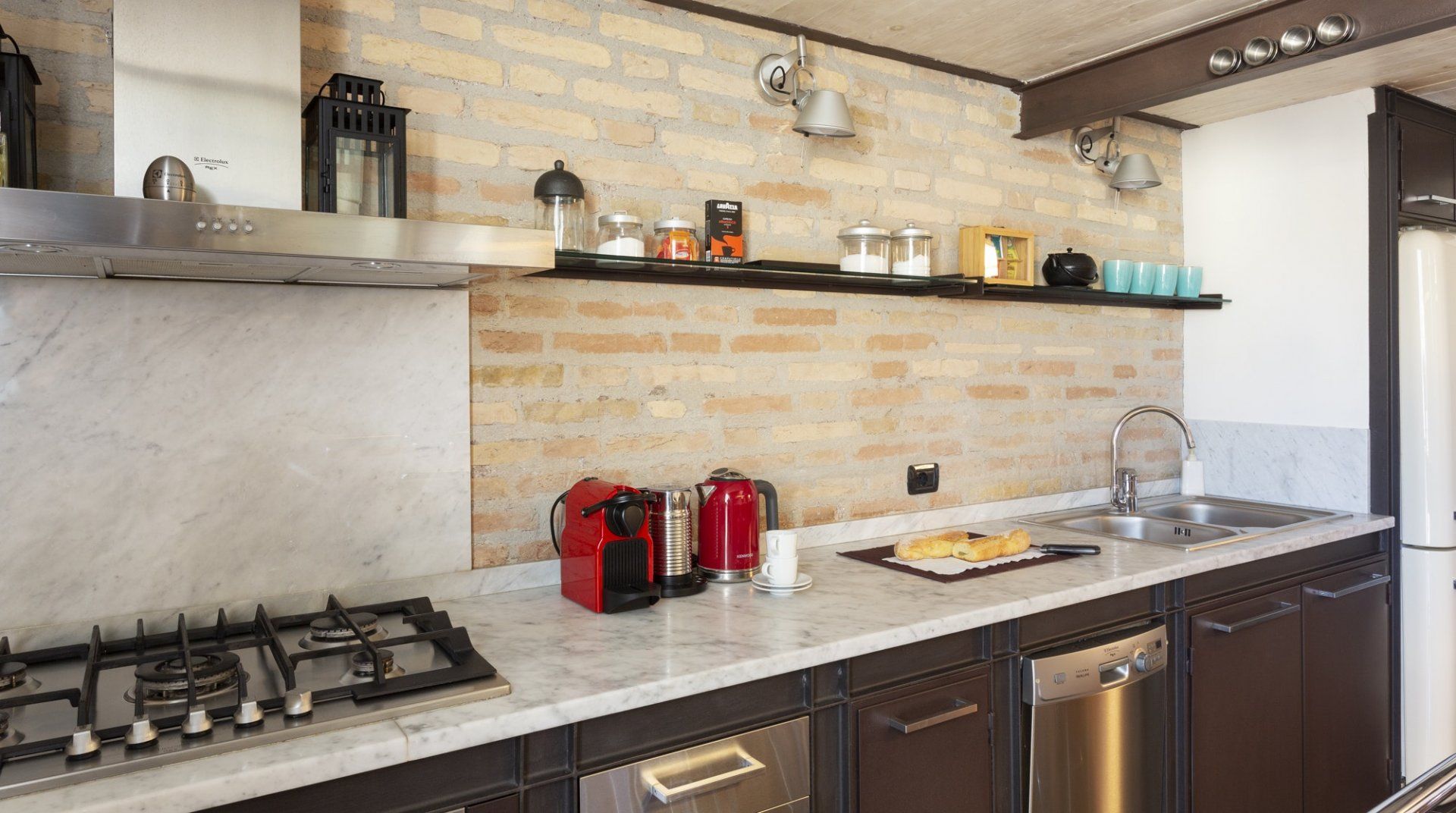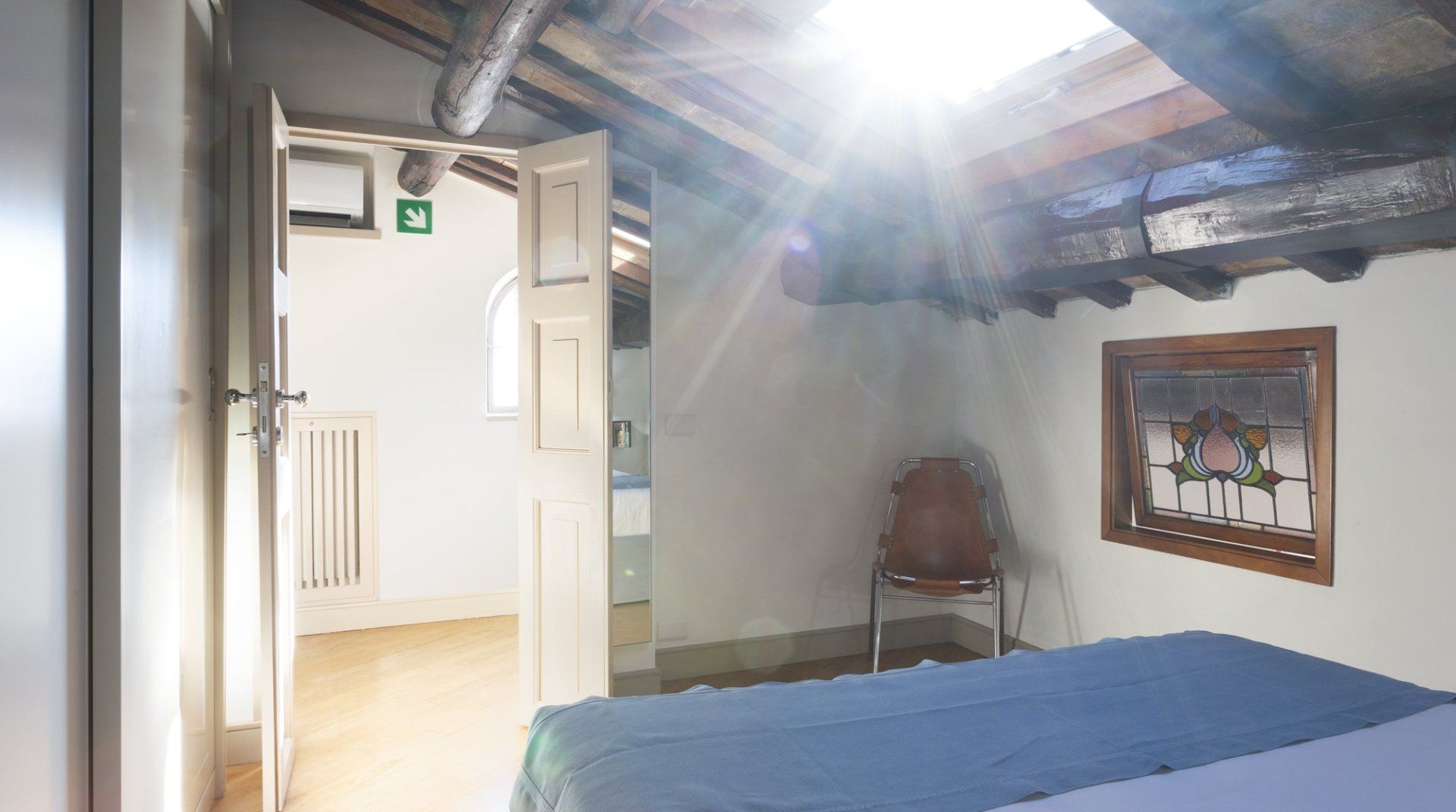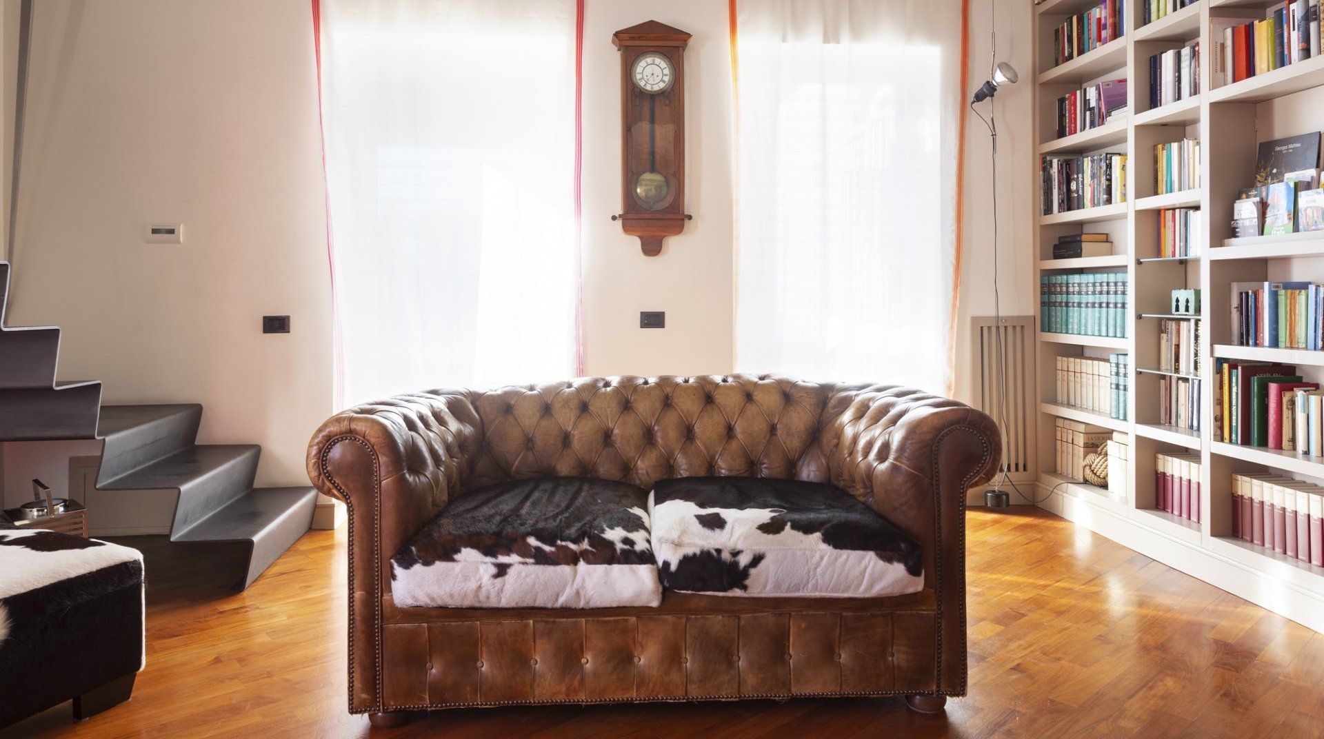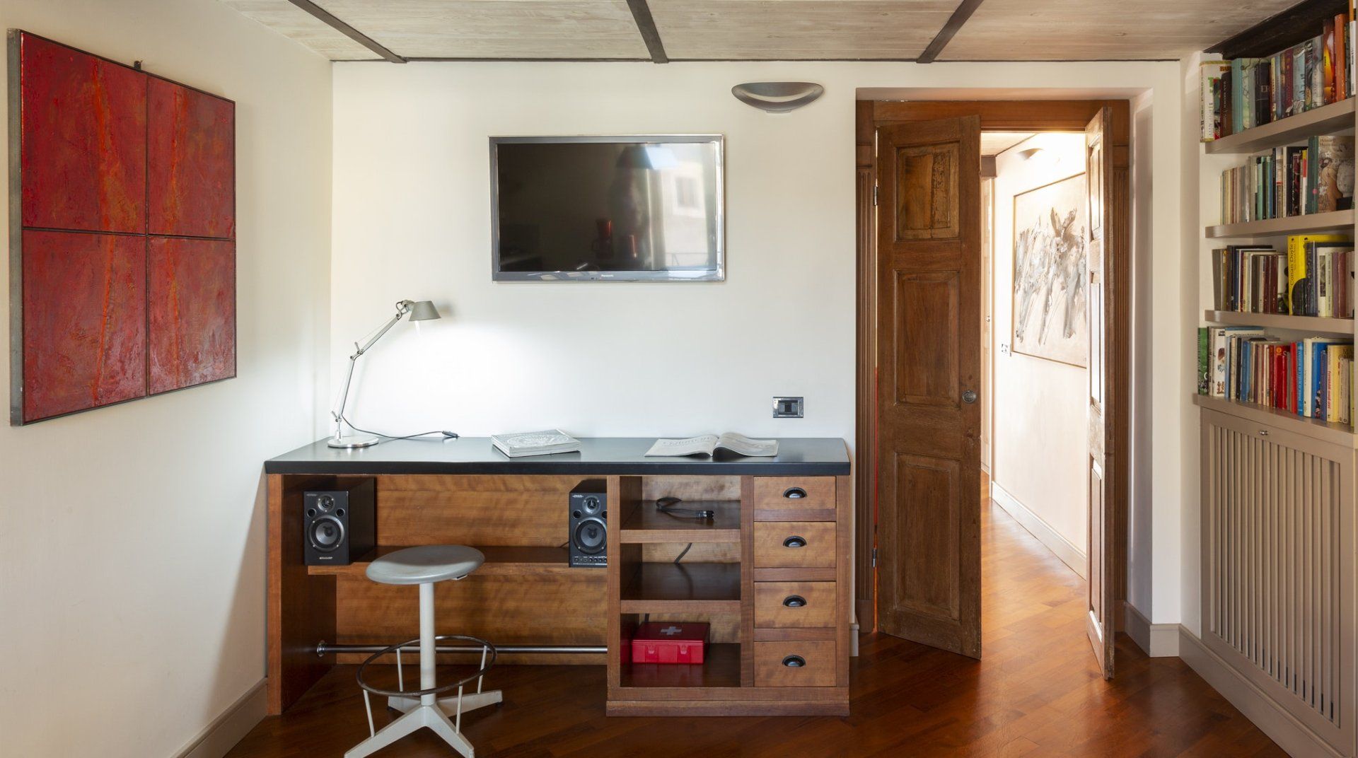 Combining antique pieces with modern details, this unique apartment on the top floor of a 16th-century aristocratic palace has plenty of character and Roman soul. Stepping into the living room, you'll find chic decor and vibrant pops of colours, with the red leather armchairs, an animal print chesterfield sofa and abstract artwork. While the statement design pieces really pack a punch, it's the antique objects, low beamed ceiling and floor-to-ceiling bookshelves that caught our attention. Choose a book from the extensive collection for a spot of bedtime reading. Ascend the floating staircase up to the cosy bedrooms, benefitting from sloped wooden ceilings and slatted screens that make for a private and homely space to unwind. Exposed brickwork in the kitchen contrasts nicely with the otherwise clean and modern design, making a great area to enjoy group meals. Elsewhere, those keeping one eye on work during their stay will notice the home office space in the corner of the living room. Emails seen to, it's out for a day spent taking in Rome's most beloved sights – pennies at the ready, Trevi Fountain is just a short four-minute stroll away. The home's position just off Via del Corso means it's easy to get to many of the attractions in the city on foot. Last, but certainly not least, round off a lovely day spent sightseeing with a tipple of limoncello from your private balcony, offering a spectacular view of the church of Sant’Ignazio – it's truly special.