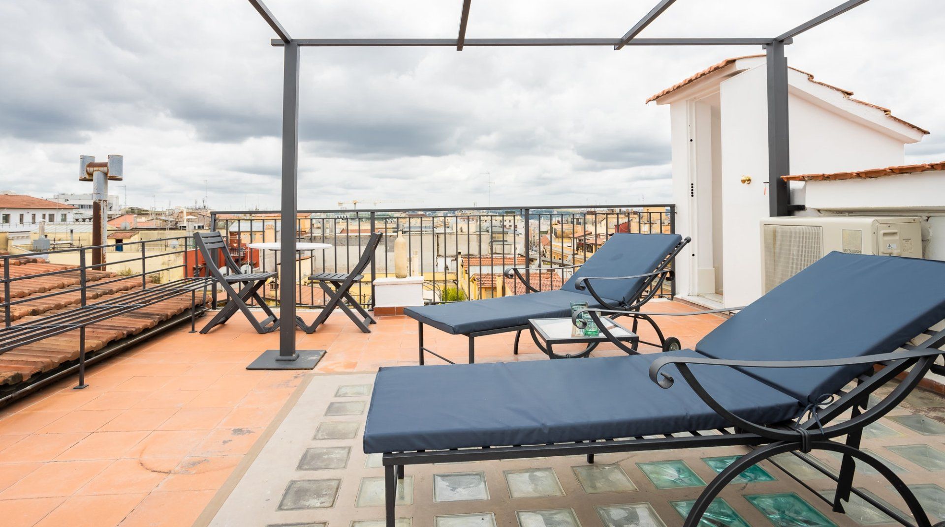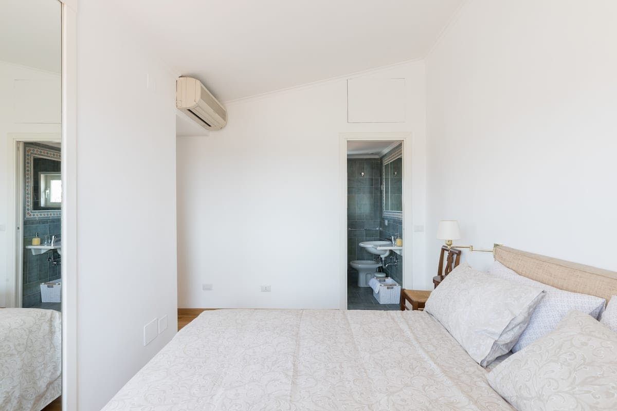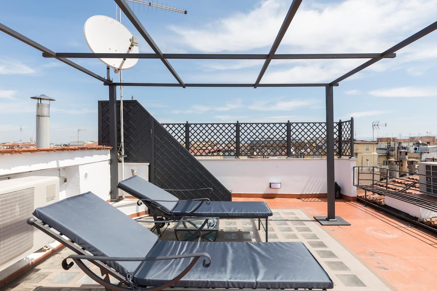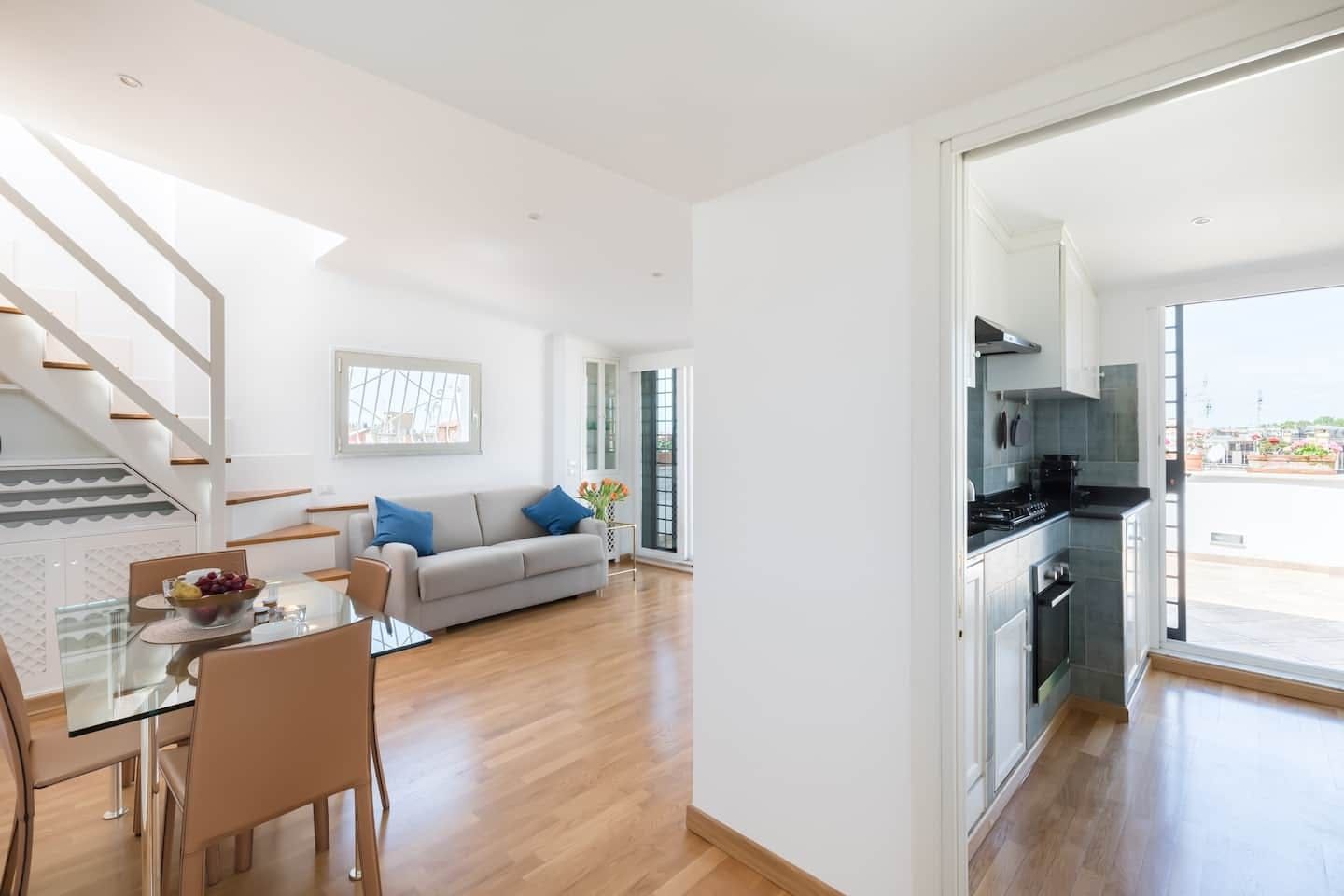 This beautiful penthouse apartment is just the ticket for those looking for a relaxing stay away from the tourist crowds. Located in Rome’s Sallustiano neighbourhood, you’re far enough away from the city’s heavily crowded areas while still being able to reach all the main sights on foot or by public transport. Inside, a neutral palette sets a calming scene with wood floors and pops of blue in the pared-back decor. You’ll immediately be struck by the dazzling amount of natural light in the living area, thanks to the large glass doors that open up onto the first of two terraces. This first one – off of the living room – is a whopping 538 square feet and boasts several tables and chairs, a covered seating area as well as an outdoor shower to enjoy. This is the ideal spot to congregate at sundown over aperitifs and alfresco meals, while the second terrace – up the flight of stairs in the living room – is a rooftop haven with its sun chairs and equally majestic rooftop vistas, ideal for catching those Italian afternoon rays. Back inside, the two bedrooms are simple yet elegant, offering dreamy canvases for a blissful night’s sleep. When you’re ready to head out and explore, make a beeline for Villa Borghese (a ten-minute walk) or stroll just twenty minutes to throw a coin in the Trevi Fountain. With plenty of pizzerias and traditional, family-friendly trattorias along Via Flavia (a one-minute walk), as well as a plethora of shops and historic buildings on your doorstep, you’ve got everything you need for a glorious Roman holiday.