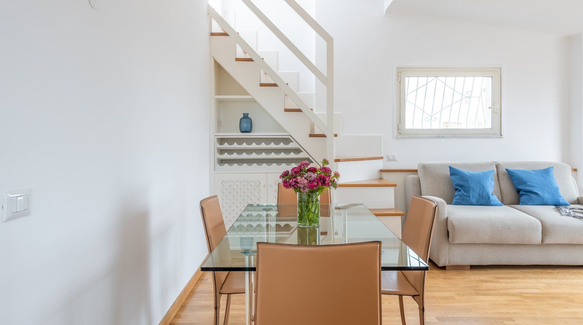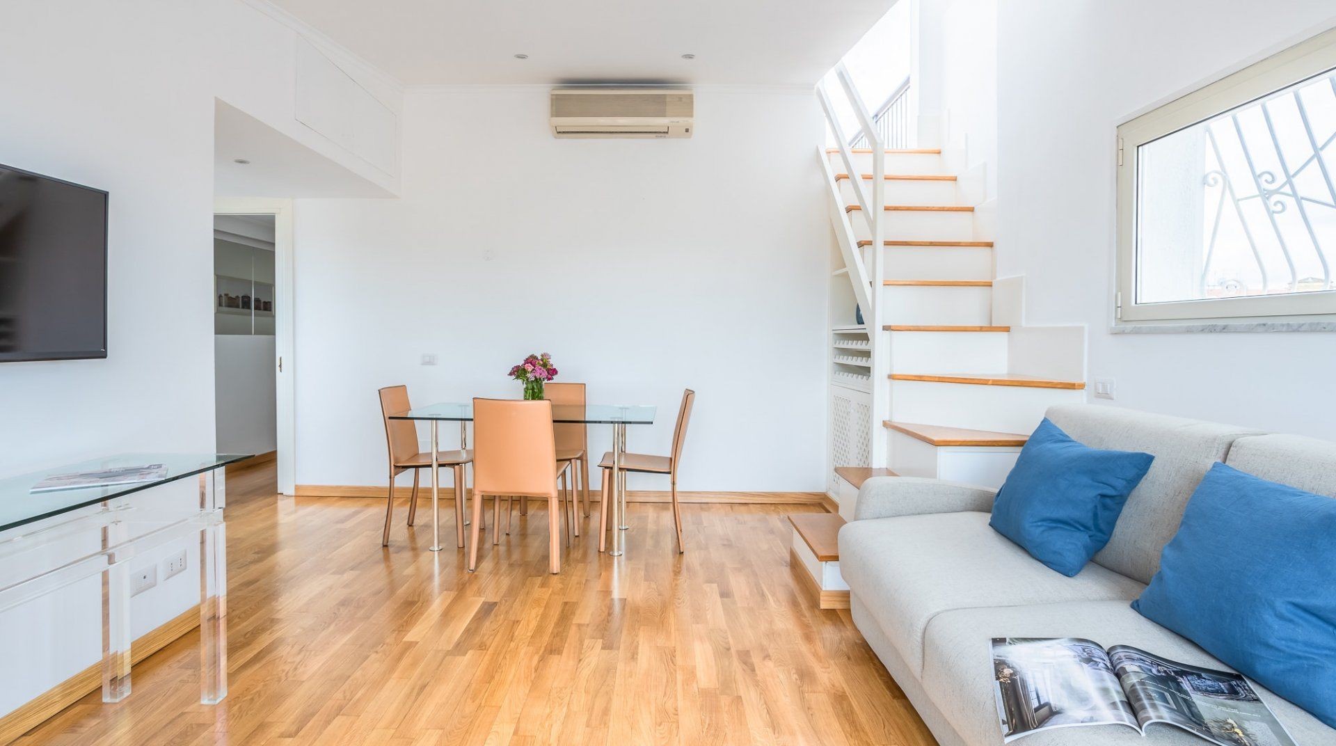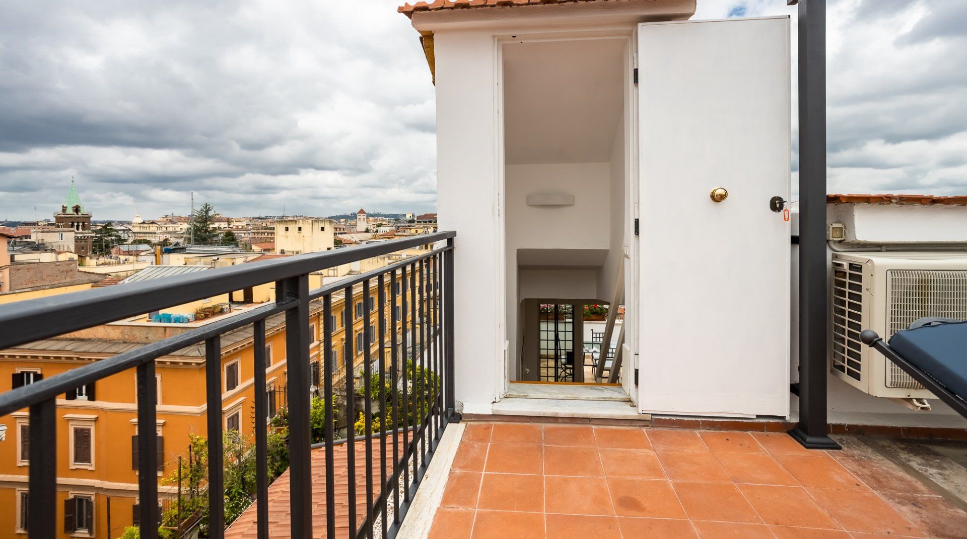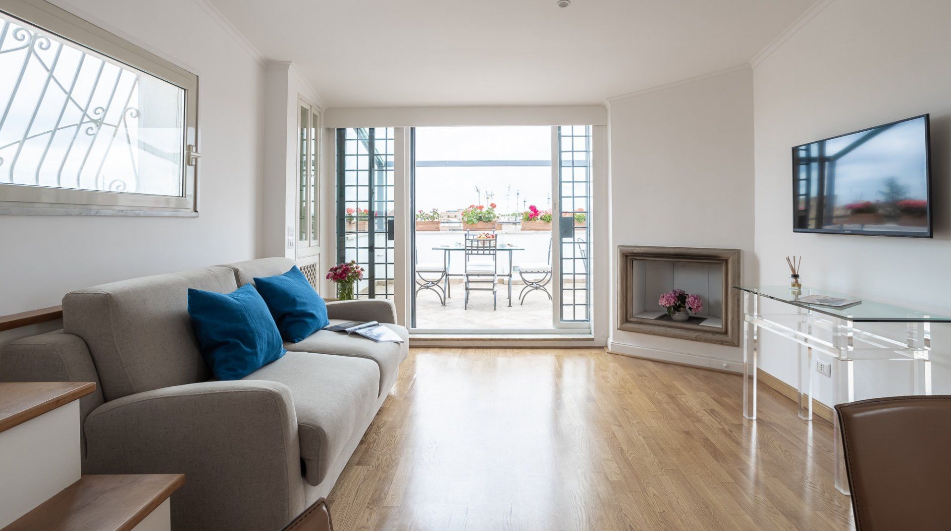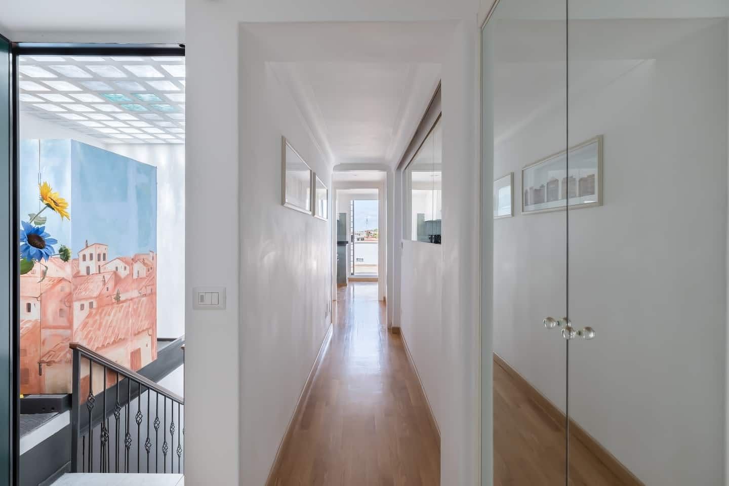 This beautiful penthouse apartment is just the ticket for those looking for a relaxing stay away from the tourist crowds. Located in Rome’s Sallustiano neighbourhood, you’re far enough away from the city’s heavily crowded areas while still being able to reach all the main sights on foot or by public transport. Inside, a neutral palette sets a calming scene with wood floors and pops of blue in the pared-back decor. You’ll immediately be struck by the dazzling amount of natural light in the living area, thanks to the large glass doors that open up onto the first of two terraces. This first one – off of the living room – is a whopping 538 square feet and boasts several tables and chairs, a covered seating area as well as an outdoor shower to enjoy. This is the ideal spot to congregate at sundown over aperitifs and alfresco meals, while the second terrace – up the flight of stairs in the living room – is a rooftop haven with its sun chairs and equally majestic rooftop vistas, ideal for catching those Italian afternoon rays. Back inside, the two bedrooms are simple yet elegant, offering dreamy canvases for a blissful night’s sleep. When you’re ready to head out and explore, make a beeline for Villa Borghese (a ten-minute walk) or stroll just twenty minutes to throw a coin in the Trevi Fountain. With plenty of pizzerias and traditional, family-friendly trattorias along Via Flavia (a one-minute walk), as well as a plethora of shops and historic buildings on your doorstep, you’ve got everything you need for a glorious Roman holiday.