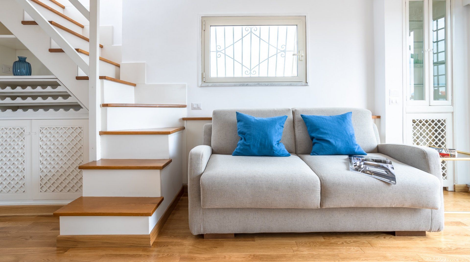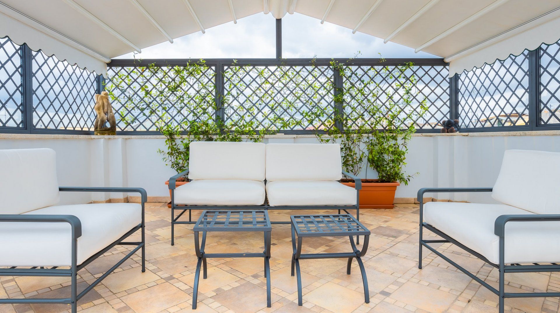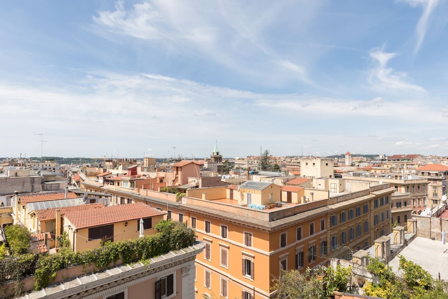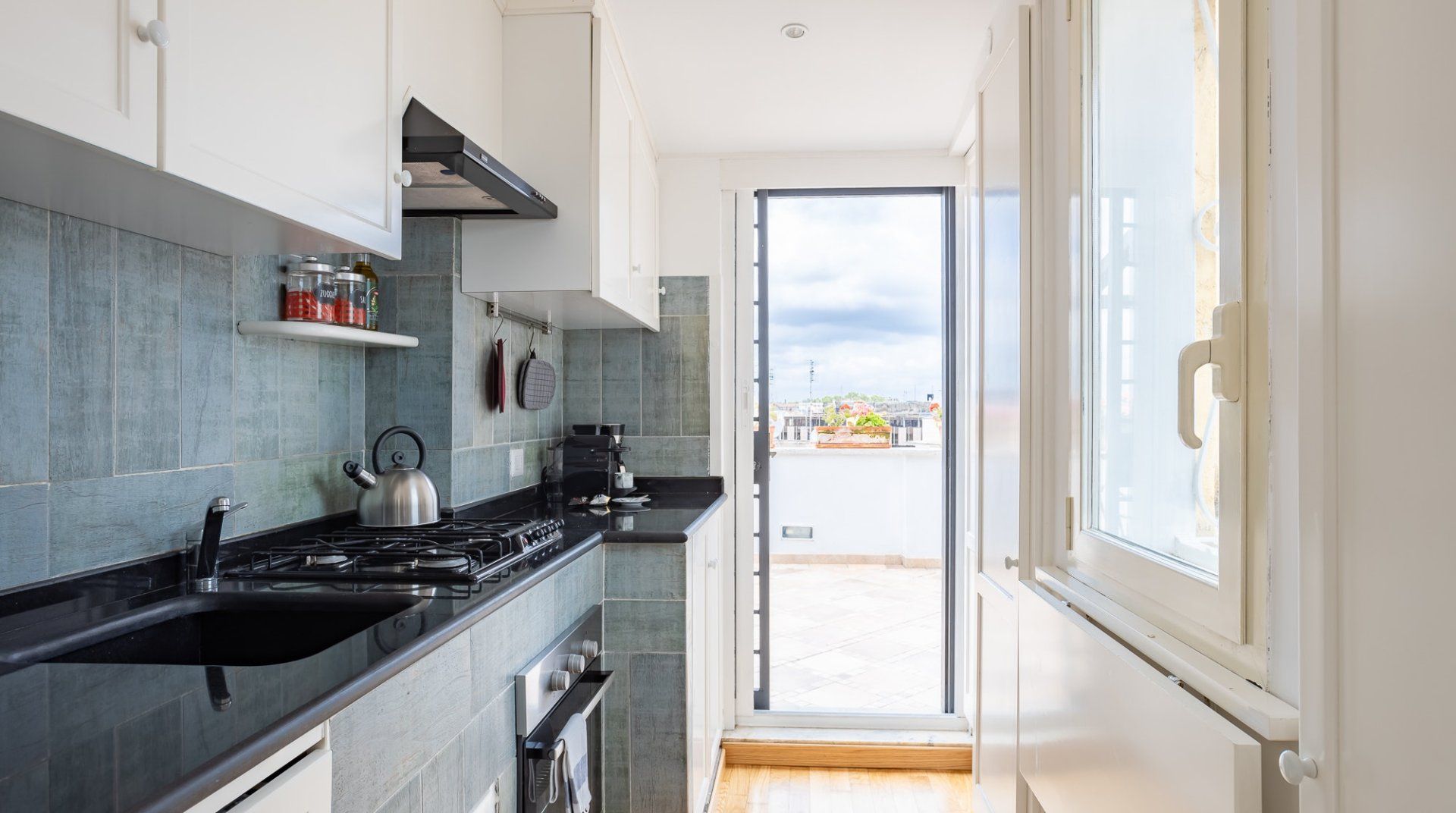 This beautiful penthouse apartment is just the ticket for those looking for a relaxing stay away from the tourist crowds. Located in Rome’s Sallustiano neighbourhood, you’re far enough away from the city’s heavily crowded areas while still being able to reach all the main sights on foot or by public transport. Inside, a neutral palette sets a calming scene with wood floors and pops of blue in the pared-back decor. You’ll immediately be struck by the dazzling amount of natural light in the living area, thanks to the large glass doors that open up onto the first of two terraces. This first one – off of the living room – is a whopping 538 square feet and boasts several tables and chairs, a covered seating area as well as an outdoor shower to enjoy. This is the ideal spot to congregate at sundown over aperitifs and alfresco meals, while the second terrace – up the flight of stairs in the living room – is a rooftop haven with its sun chairs and equally majestic rooftop vistas, ideal for catching those Italian afternoon rays. Back inside, the two bedrooms are simple yet elegant, offering dreamy canvases for a blissful night’s sleep. When you’re ready to head out and explore, make a beeline for Villa Borghese (a ten-minute walk) or stroll just twenty minutes to throw a coin in the Trevi Fountain. With plenty of pizzerias and traditional, family-friendly trattorias along Via Flavia (a one-minute walk), as well as a plethora of shops and historic buildings on your doorstep, you’ve got everything you need for a glorious Roman holiday.