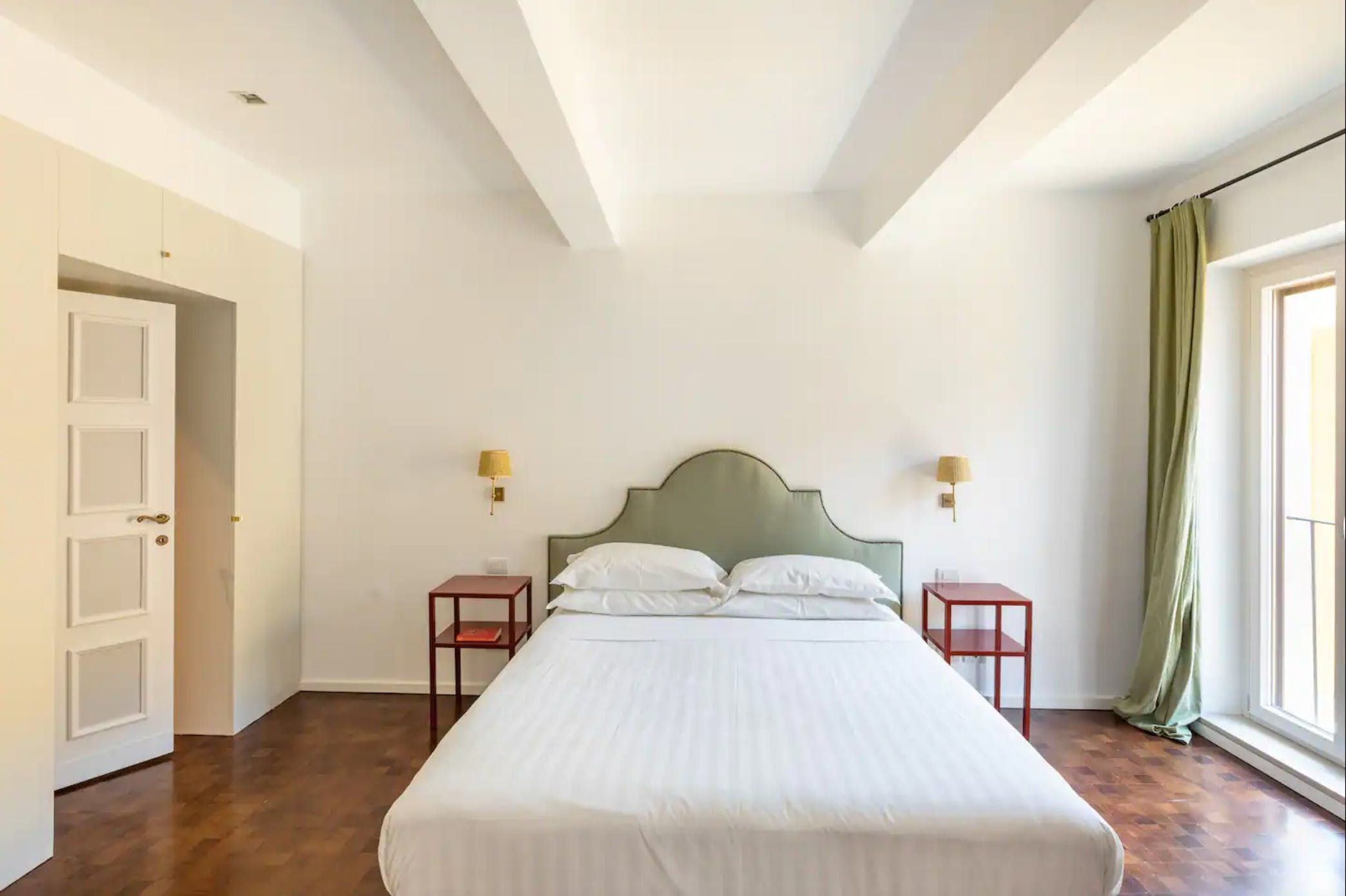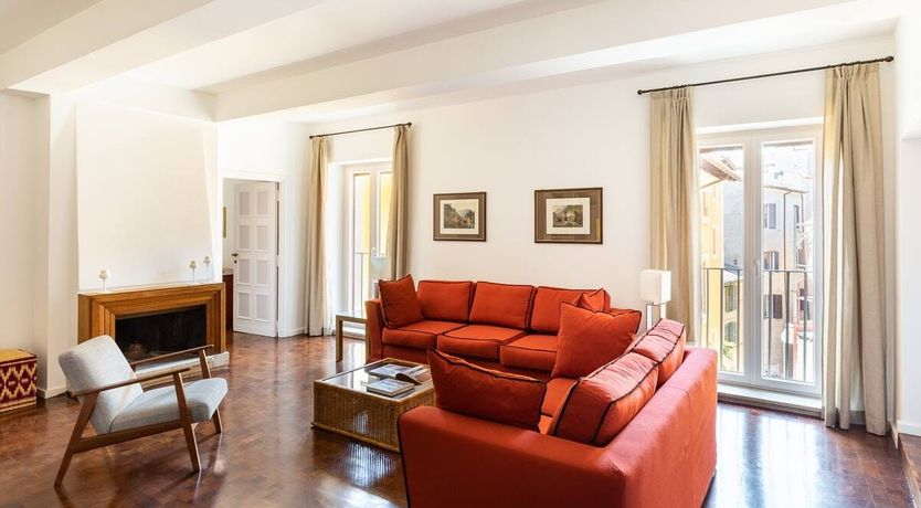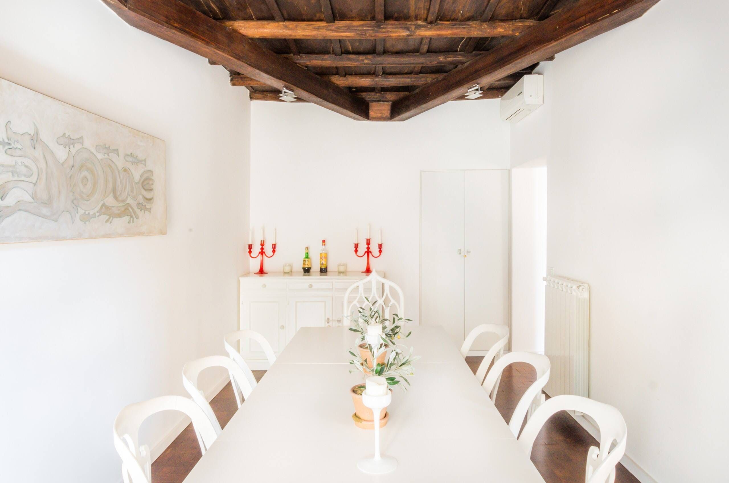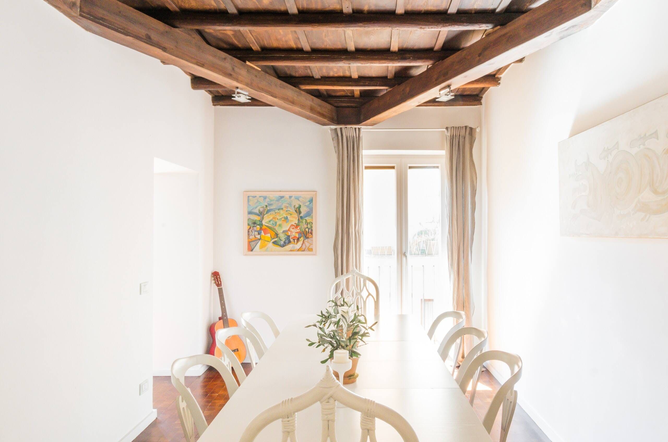 Horse-Drawn feels like a real home. It’s bright and welcoming, and as it’s been designed as a place to live, rather than one to rent, you don’t get the glitches that sometimes pop up in the latter. It also means that the kitchen is really well equipped – it's easy enough to whip up a decent meal to be enjoyed as a group in the charming, light-filled dining room. There are a few signs of age on the walls and floor, but these don’t detract in any way from the overall environment. In fact, we think that's what makes this 17th-century home – take in the original features from the get-go. Whether you're enjoying a good book by the fireplace or eating lunch under the exposed beams, you'll feel immersed in the heart of the world's most ancient city. We love how the pops of purple and green, abstract artwork and book-filled shelves make this spot so cosy and inviting after a day spent sightseeing. With the Castel Sant'Angelo and Piazza Navona right around the corner, as well as Trevi Fountain and the Spanish Steps under a twenty-minute walk away, the delights of Rome are right at your doorstep.