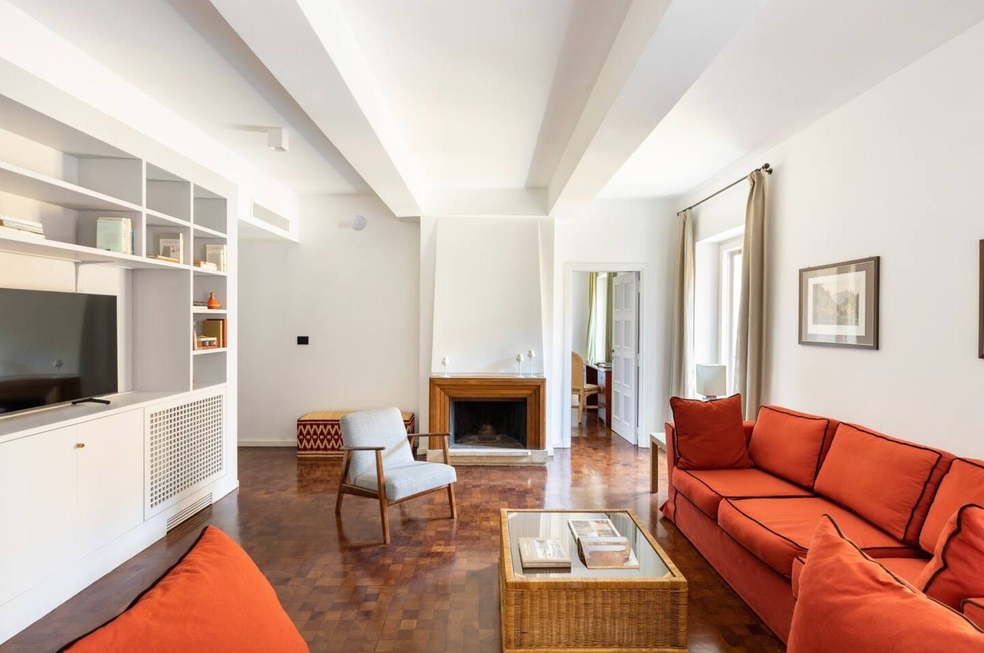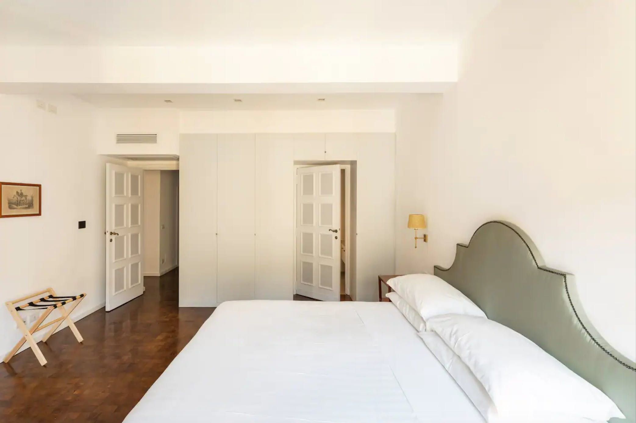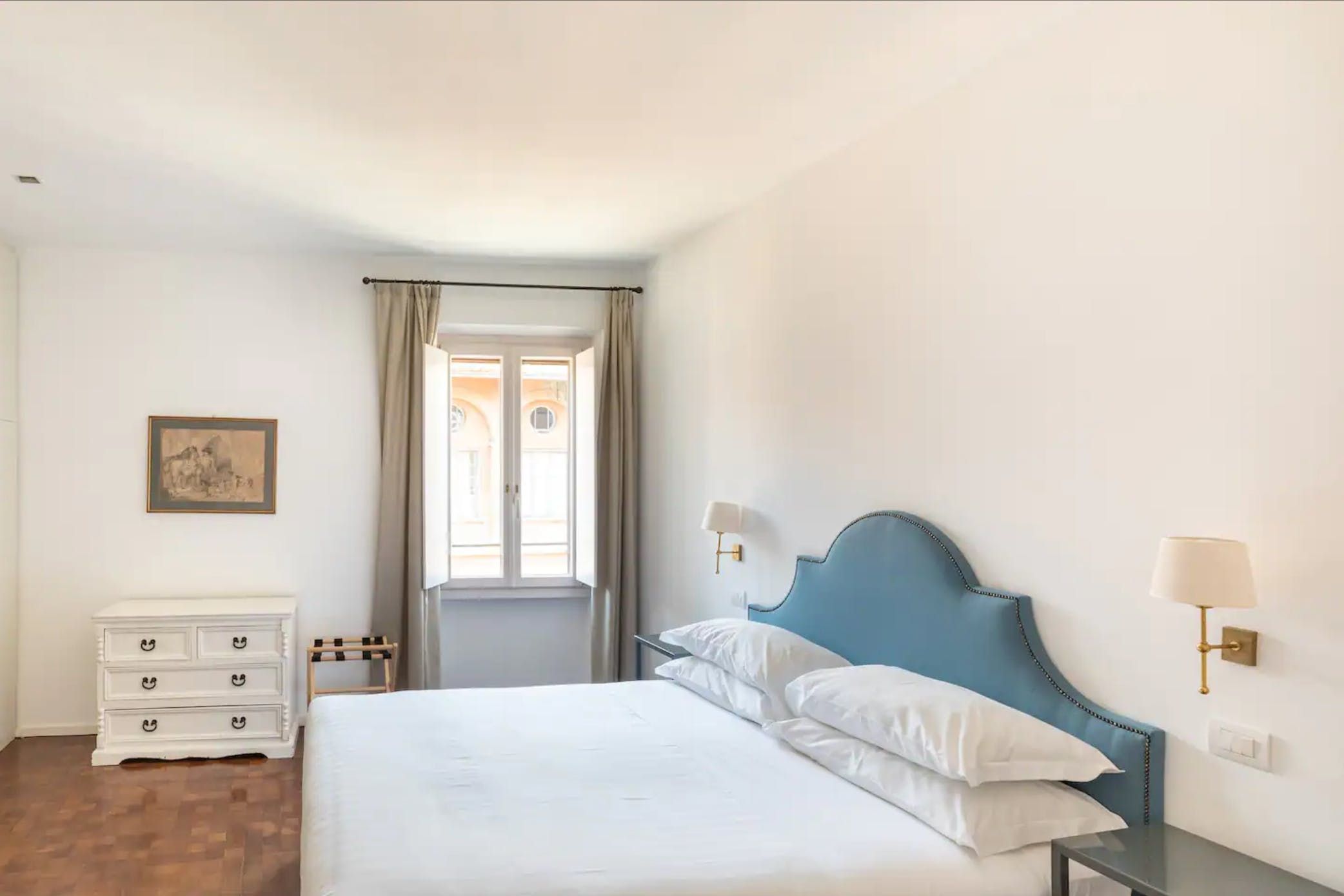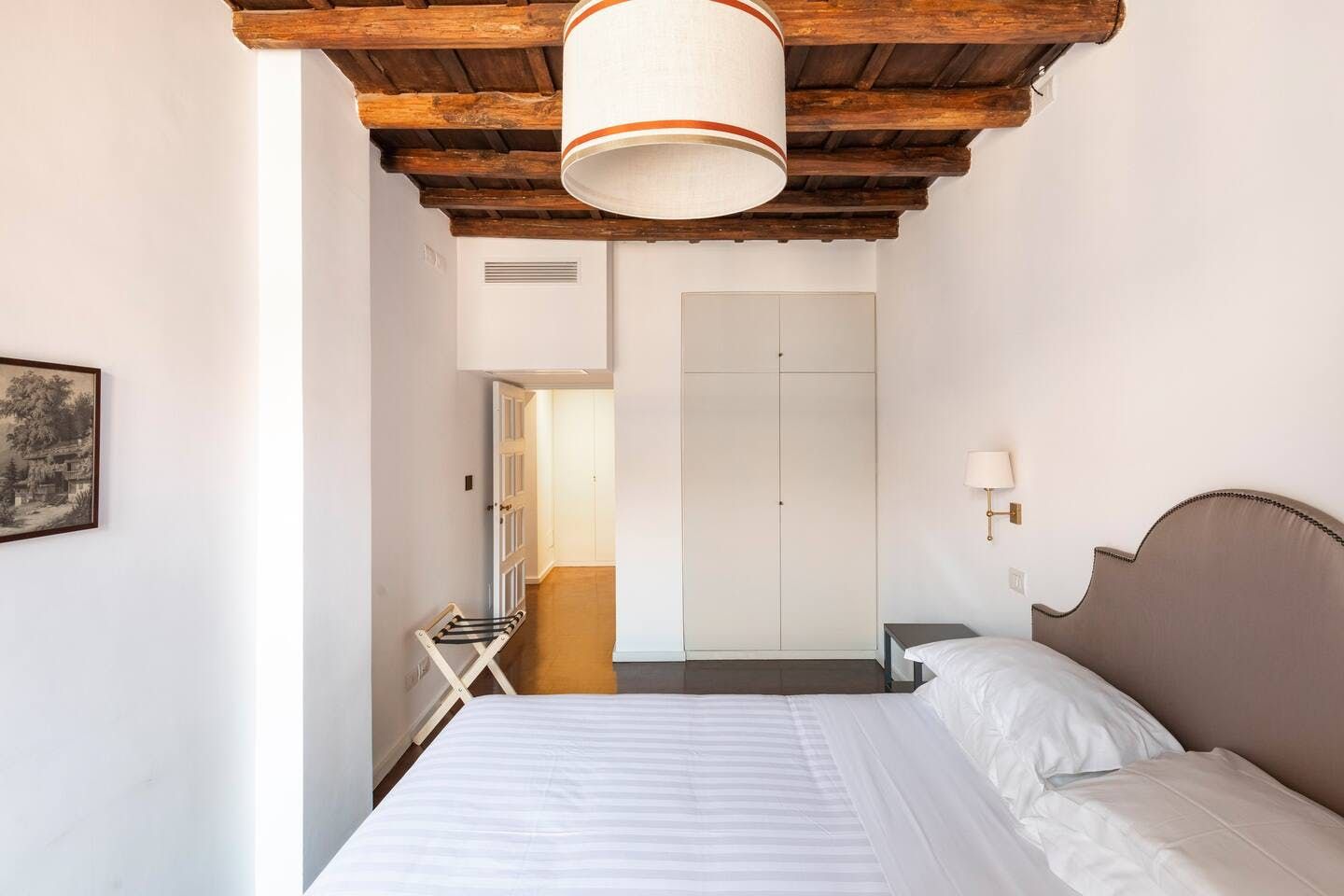 Horse-Drawn feels like a real home. It’s bright and welcoming, and as it’s been designed as a place to live, rather than one to rent, you don’t get the glitches that sometimes pop up in the latter. It also means that the kitchen is really well equipped – it's easy enough to whip up a decent meal to be enjoyed as a group in the charming, light-filled dining room. There are a few signs of age on the walls and floor, but these don’t detract in any way from the overall environment. In fact, we think that's what makes this 17th-century home – take in the original features from the get-go. Whether you're enjoying a good book by the fireplace or eating lunch under the exposed beams, you'll feel immersed in the heart of the world's most ancient city. We love how the pops of purple and green, abstract artwork and book-filled shelves make this spot so cosy and inviting after a day spent sightseeing. With the Castel Sant'Angelo and Piazza Navona right around the corner, as well as Trevi Fountain and the Spanish Steps under a twenty-minute walk away, the delights of Rome are right at your doorstep.