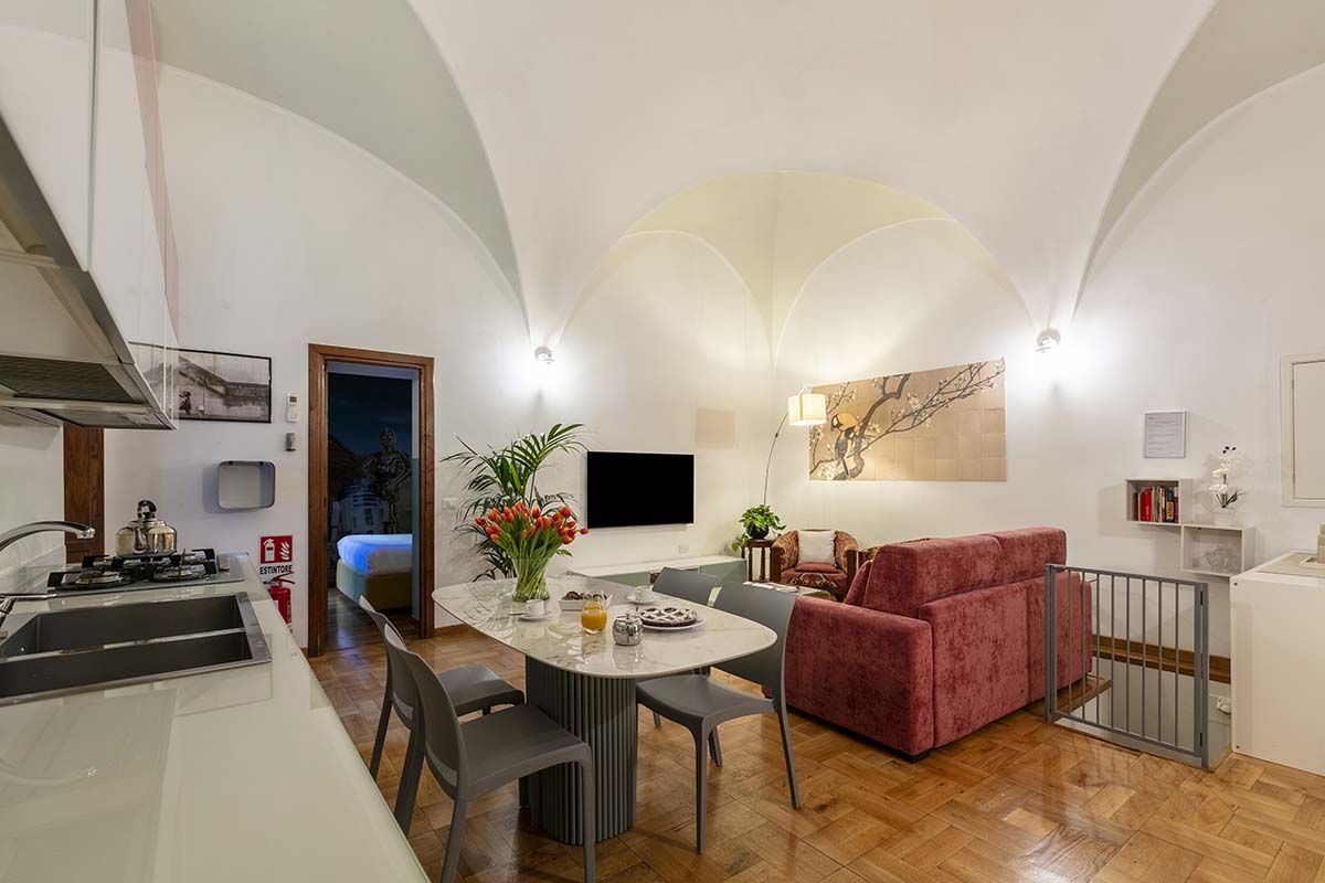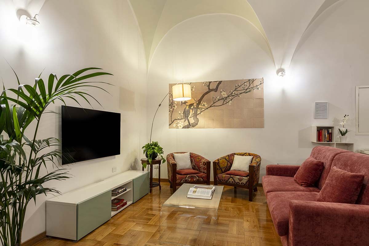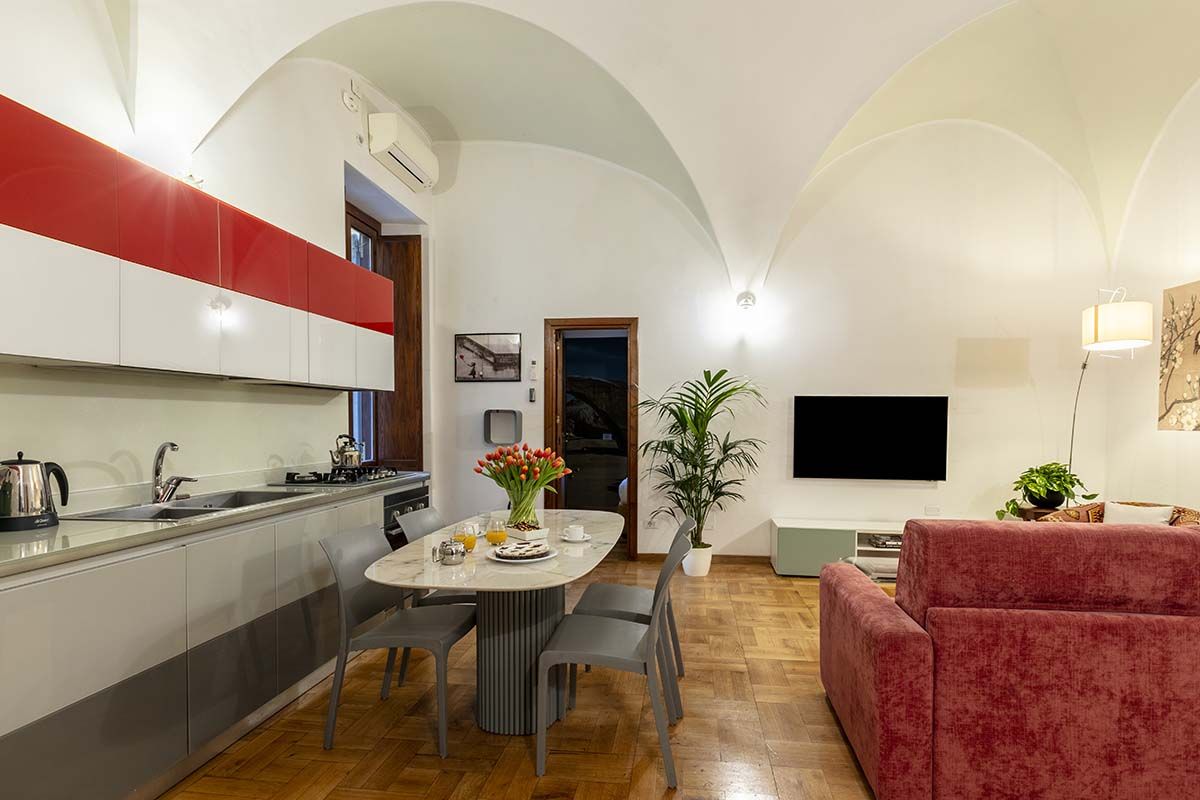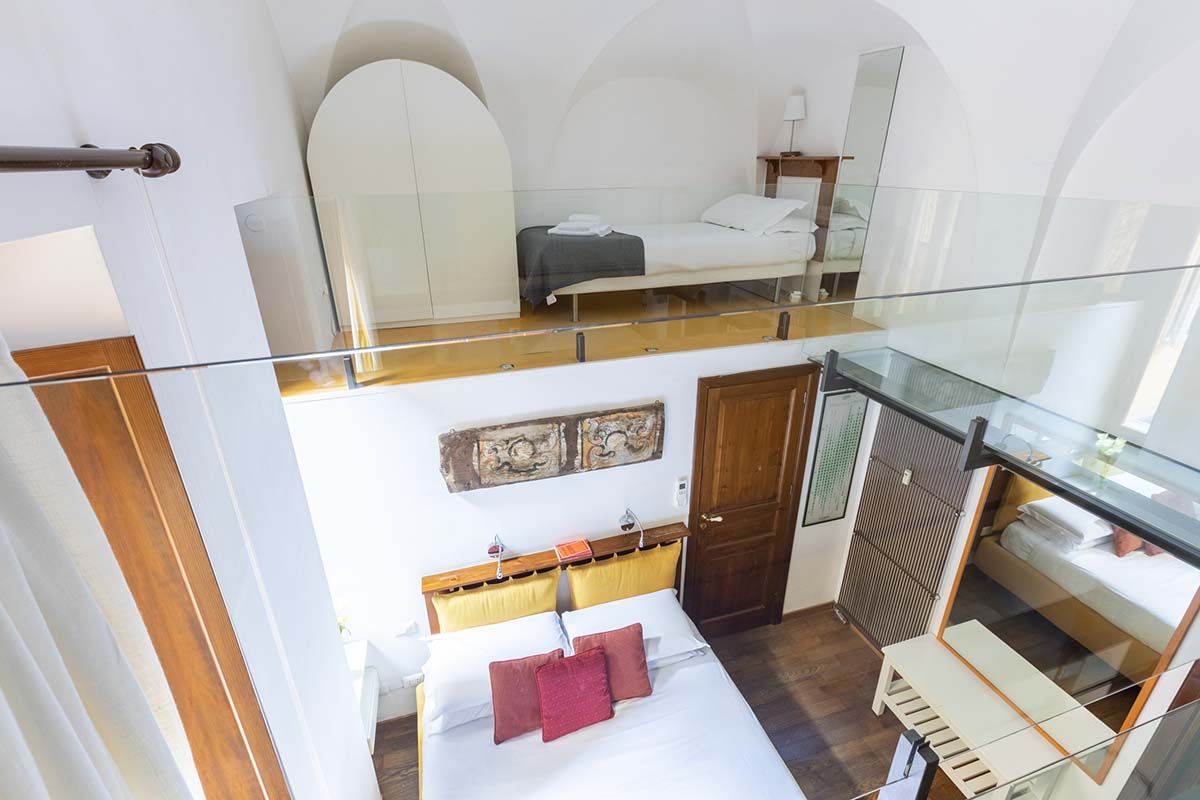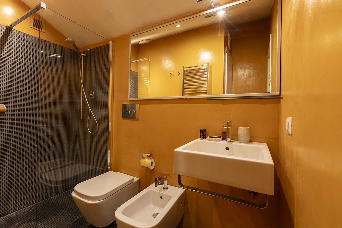 Though this roomy apartment is based in a seventeenth-century palazzo, rustic charm is not the only thing on offer. While there are plenty of characterful touches here (think vaulted ceilings, arched doorways, even an original spiral staircase made of Roman brick), what makes this home stand out are the twenty-first-century updates. We're talking a lofted glass mezzanine, a two-seater sauna in the downstairs bedroom (the perfect way to relax after a busy day exploring Rome), a separate fitness room with a treadmill for squeezing in workouts and a contemporary kitchen that makes cooking a breeze. There's even a shady patio – whether you're sipping espresso in the mornings or enjoying an alfresco dinner in the Italian sunshine, it's an excellent spot to unwind. And you couldn't ask for a better location to take it all in. Piazza Navona is just a three-minute stroll away, and other world-famous landmarks like the Trevi Fountain and the Pantheon are also within walking distance. Plus, you're surrounded by cafes, restaurants and a lively atmosphere, making this apartment a top-notch place to call home.