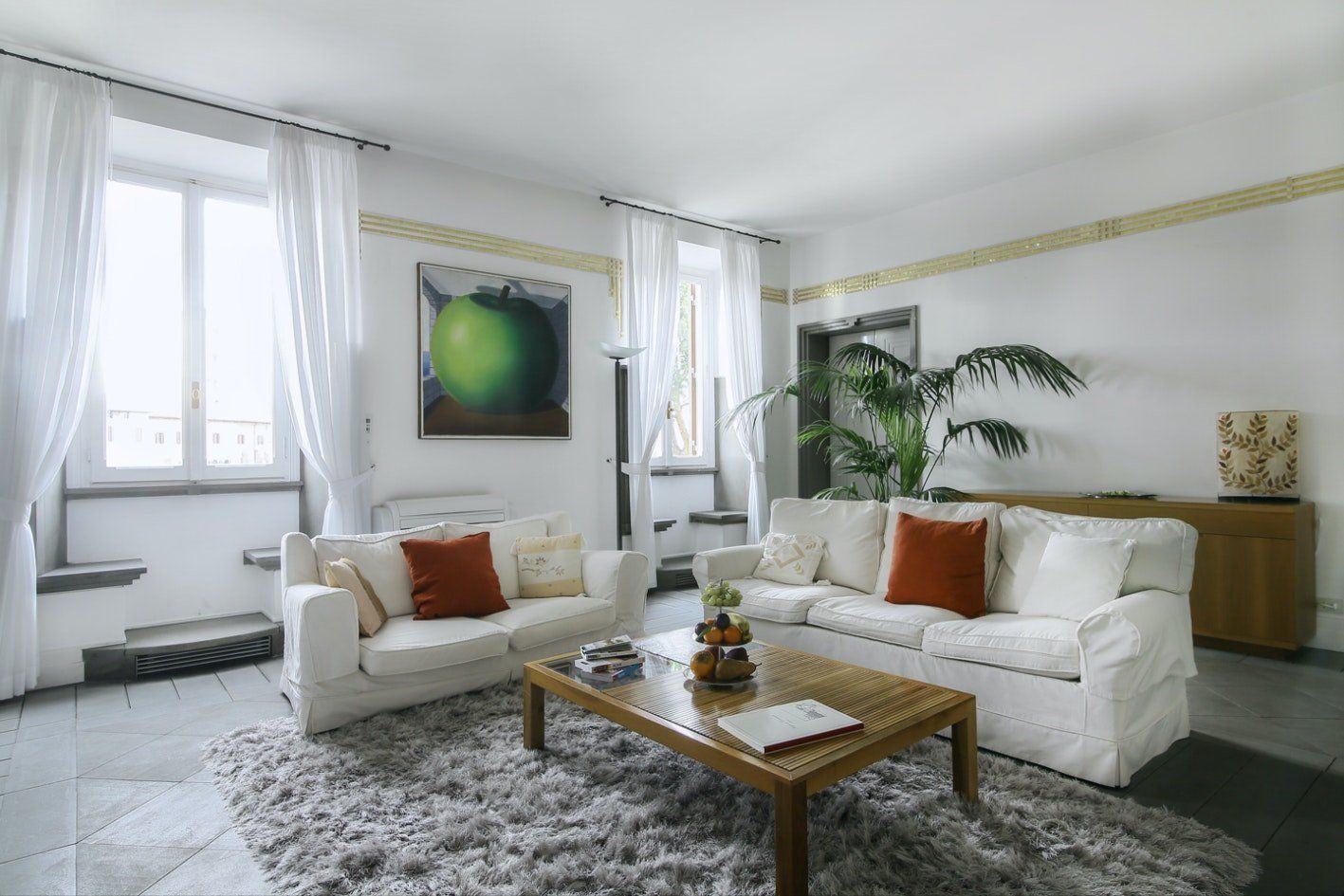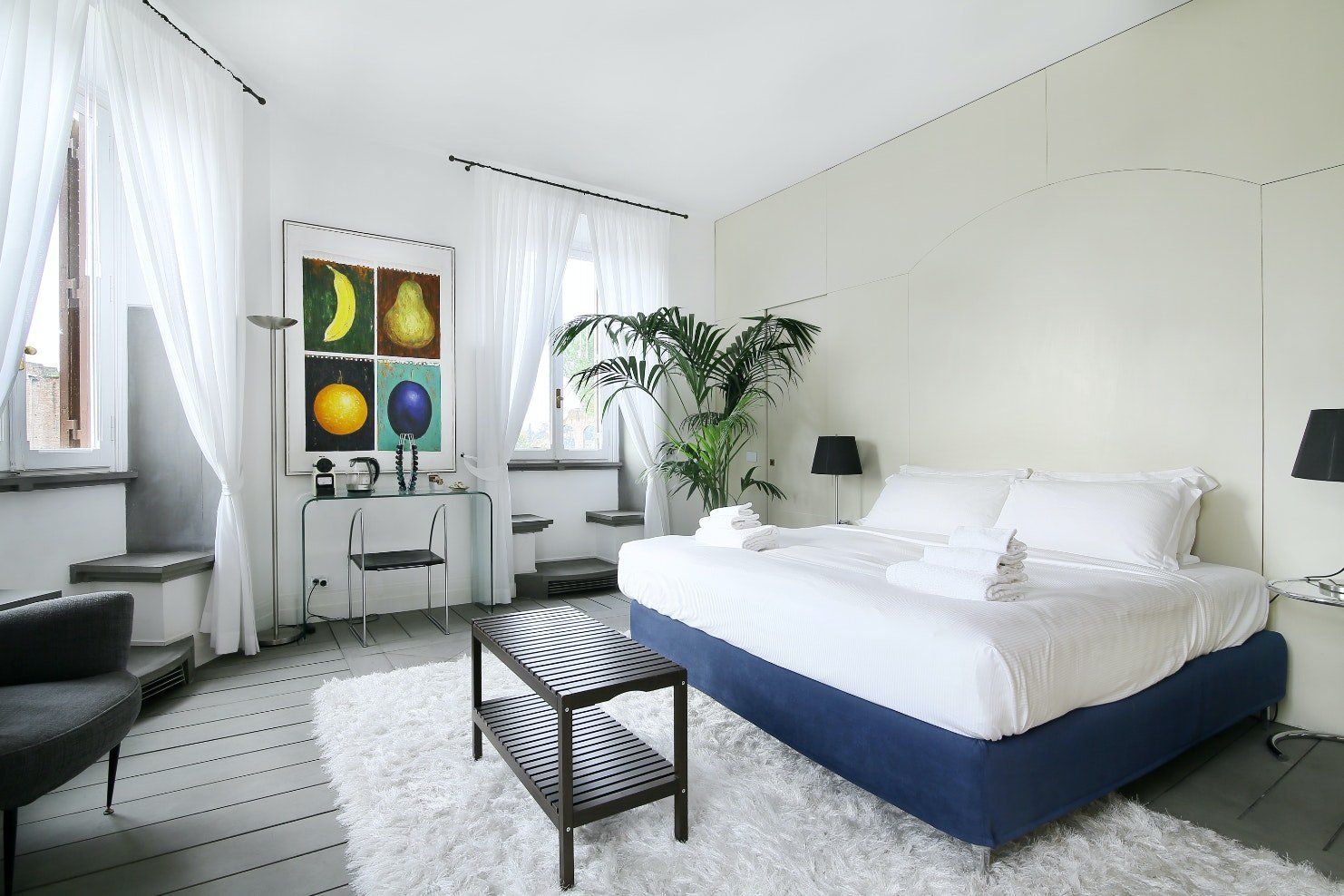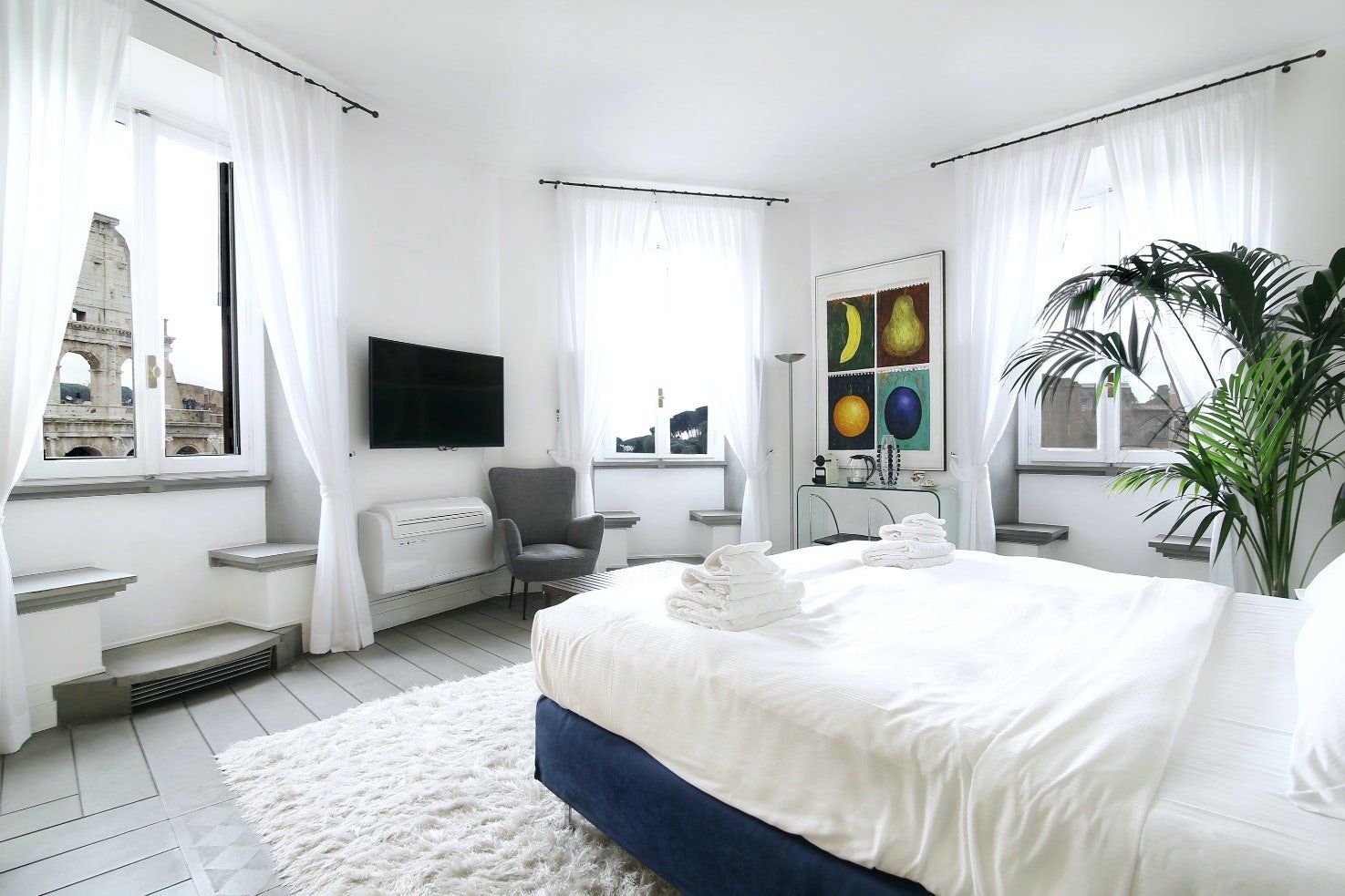 The views from this home are spectacular – it feels like you could reach out and touch centuries-old stones with your hands. Perhaps the most iconic sight in a city of iconic sights, the Colosseum is visible from nearly every room in the home. It goes without saying then, that you’ll be in a prime location – a quick four-minute walk to the Roman Forum, six minutes to the Arch of Constantine, seventeen minutes to the Trevi Fountain and twenty-one minutes to the Pantheon. You’ll have all the bars, restaurants and shopping of Monti nearby to keep you entertained, while line B of the underground metro is located just below to building, connecting you all around the city. Beyond the views, you’ll find a large and comfortable home perfectly designed for accommodating groups and families. The living room is large and bright, with fun pop art prints and vibrant plants. The bedrooms have comfortable beds and of course, great views. Plus, there’s a concierge available 24/7 for your convenience, offering hotel-level service in the warmth of your very own home.