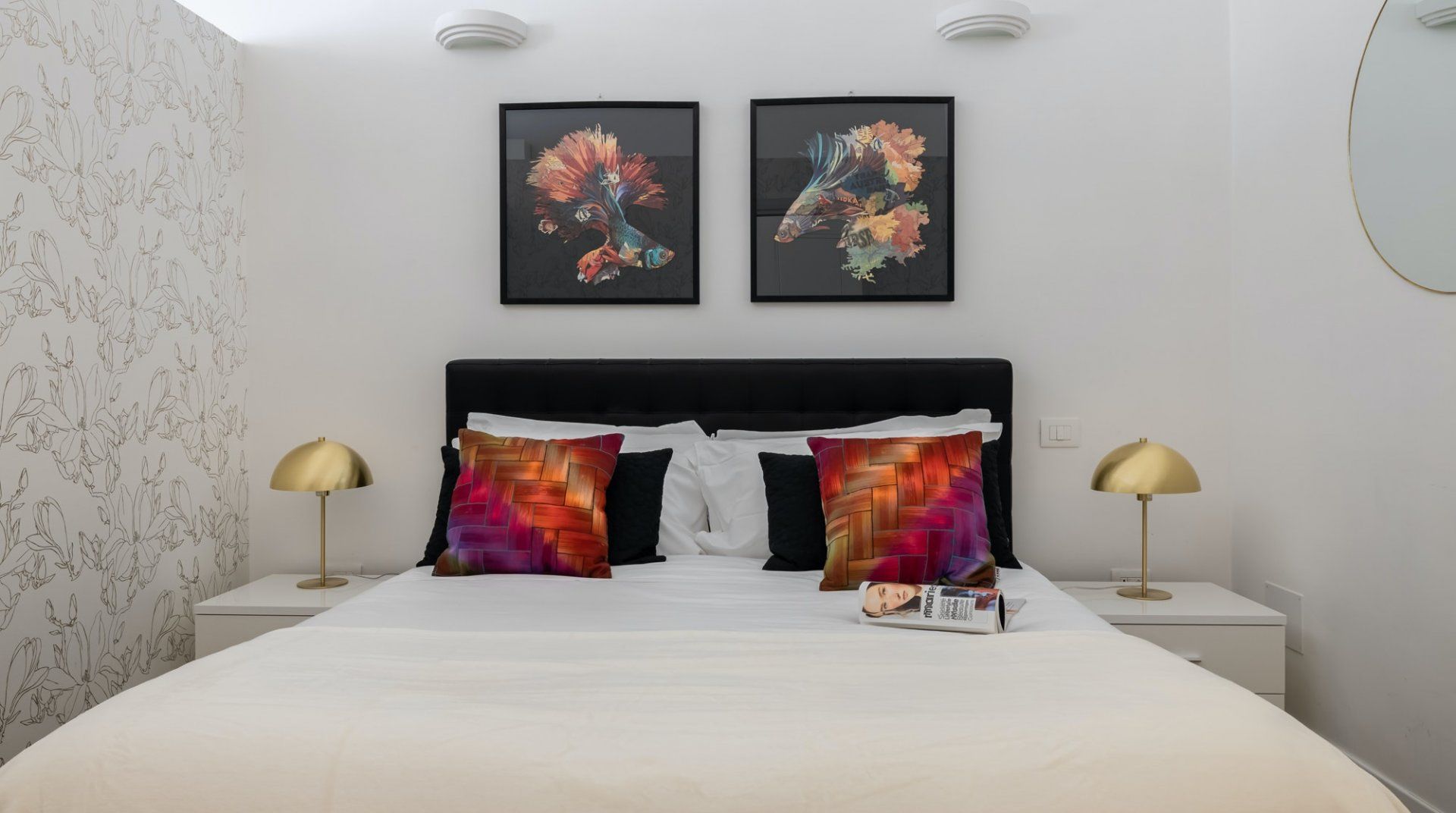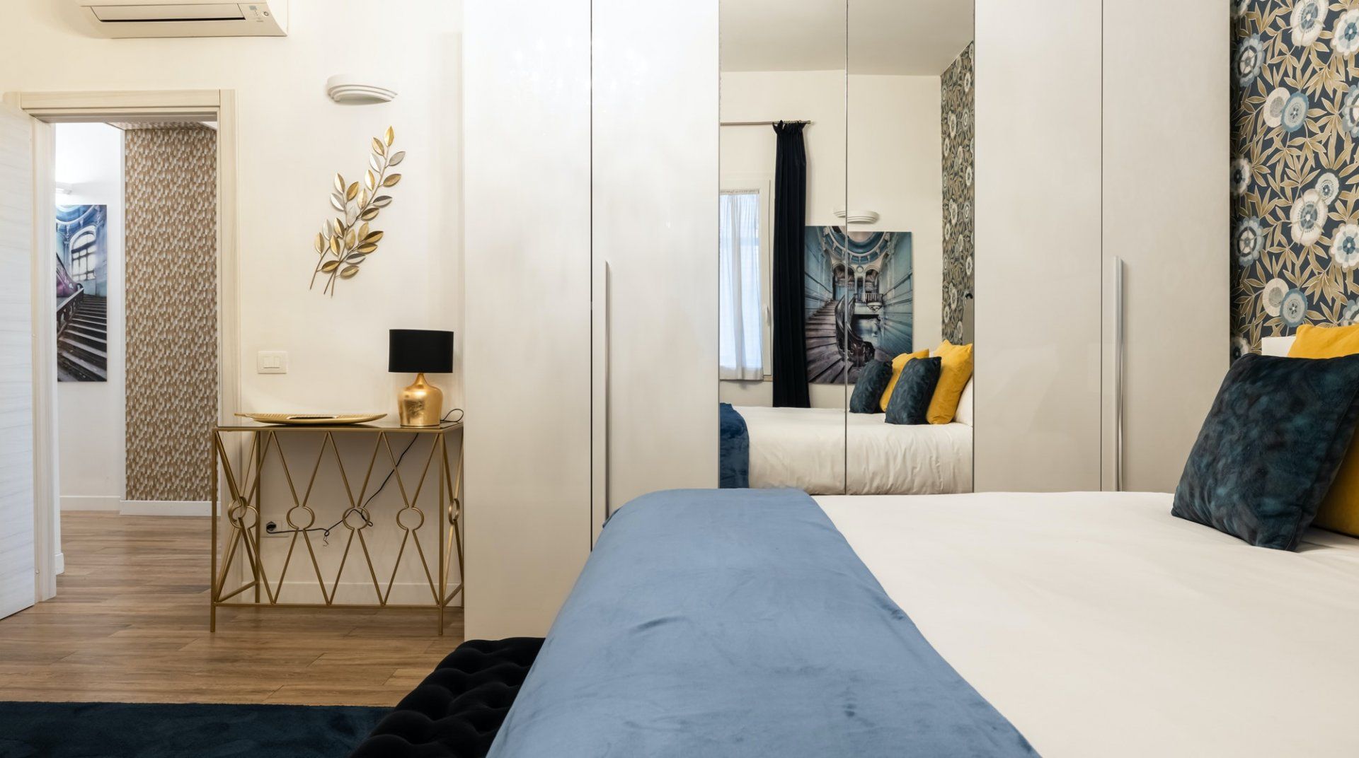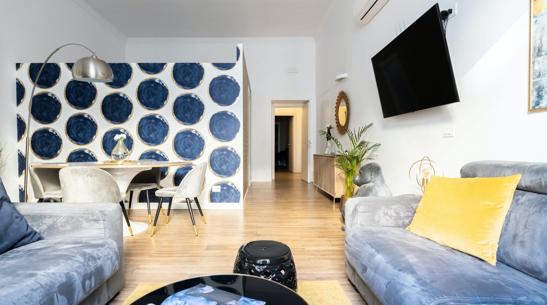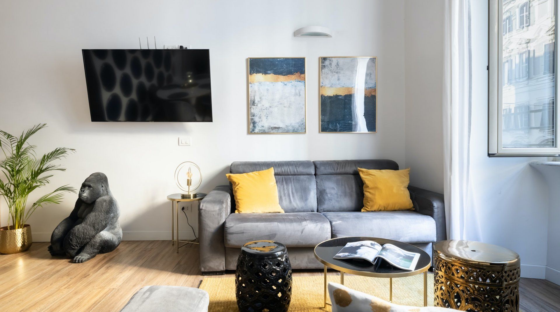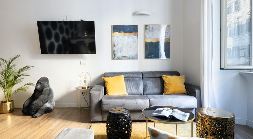 This second-floor apartment in a Prati building dating back to the 1940s illustrates how to incorporate some eccentricity into a home's interior design without going overboard. Colourful pieces of artwork, gold motifs and boldly patterned feature walls pop off satisfyingly against the white walls, while the silverback gorilla in the living room is a playful addition. The kitchen and bathrooms play it relatively simple in comparison but are equally notable for their high quality — we especially liked the whirlpool bathtub. The location is another plus point in our books. Castel Sant'Angelo and the surrounding Parco della Mole Adriana are only ten minutes' walk away, while Vatican City takes about a quarter of an hour to reach on foot.
