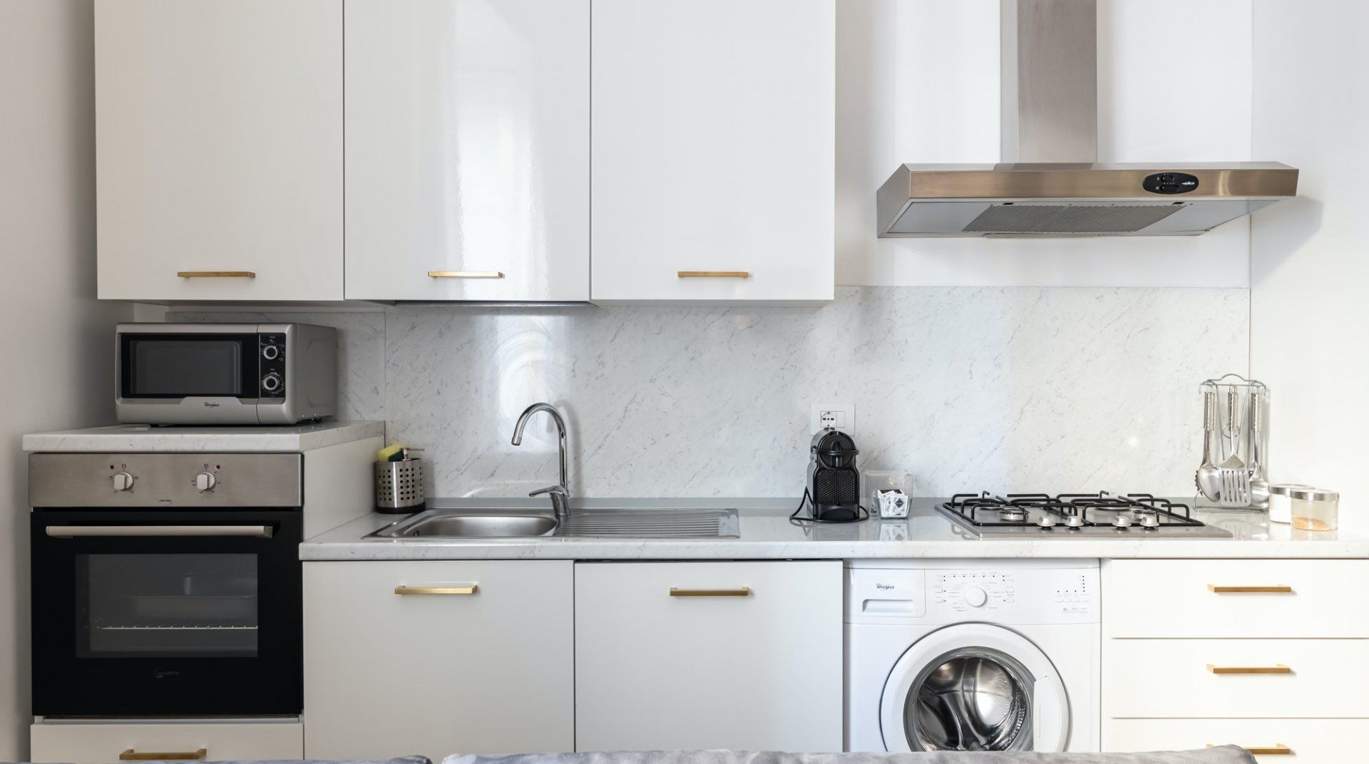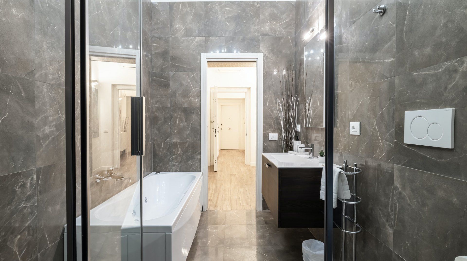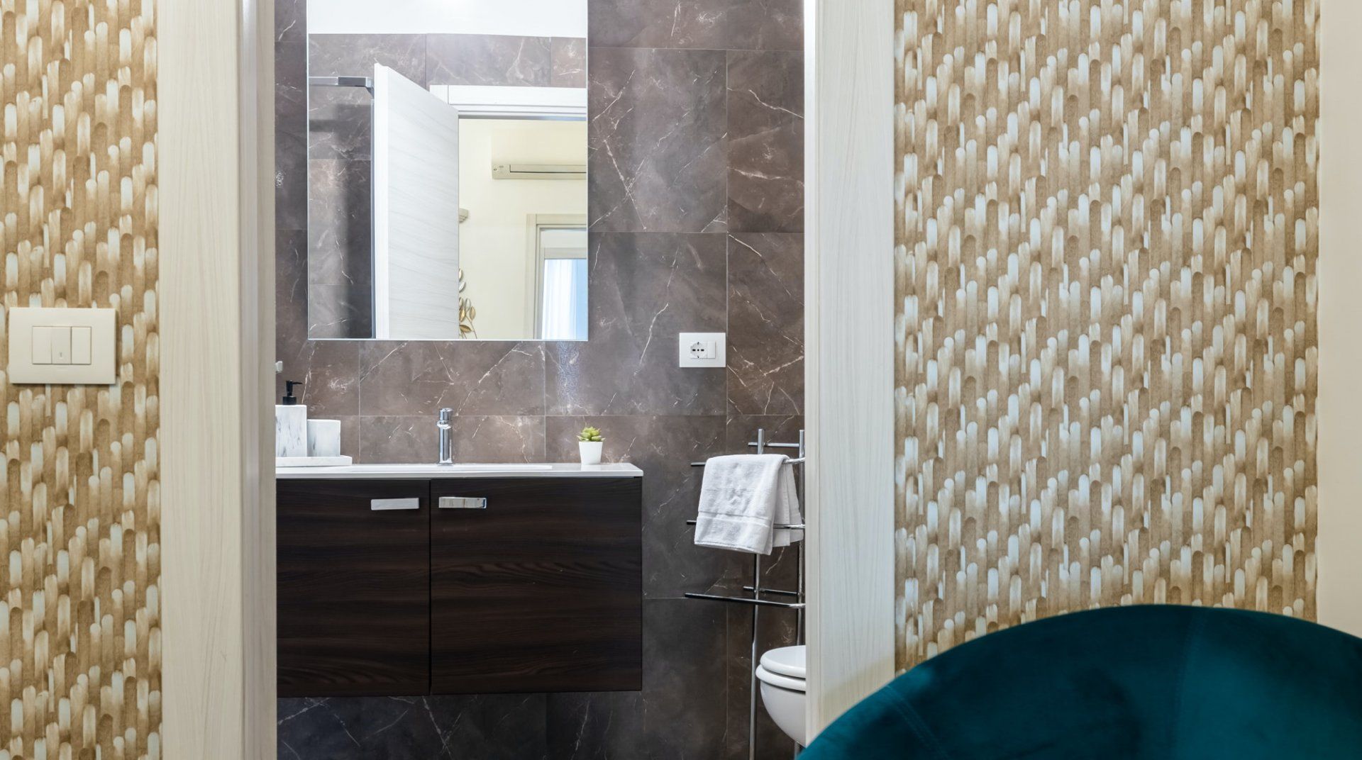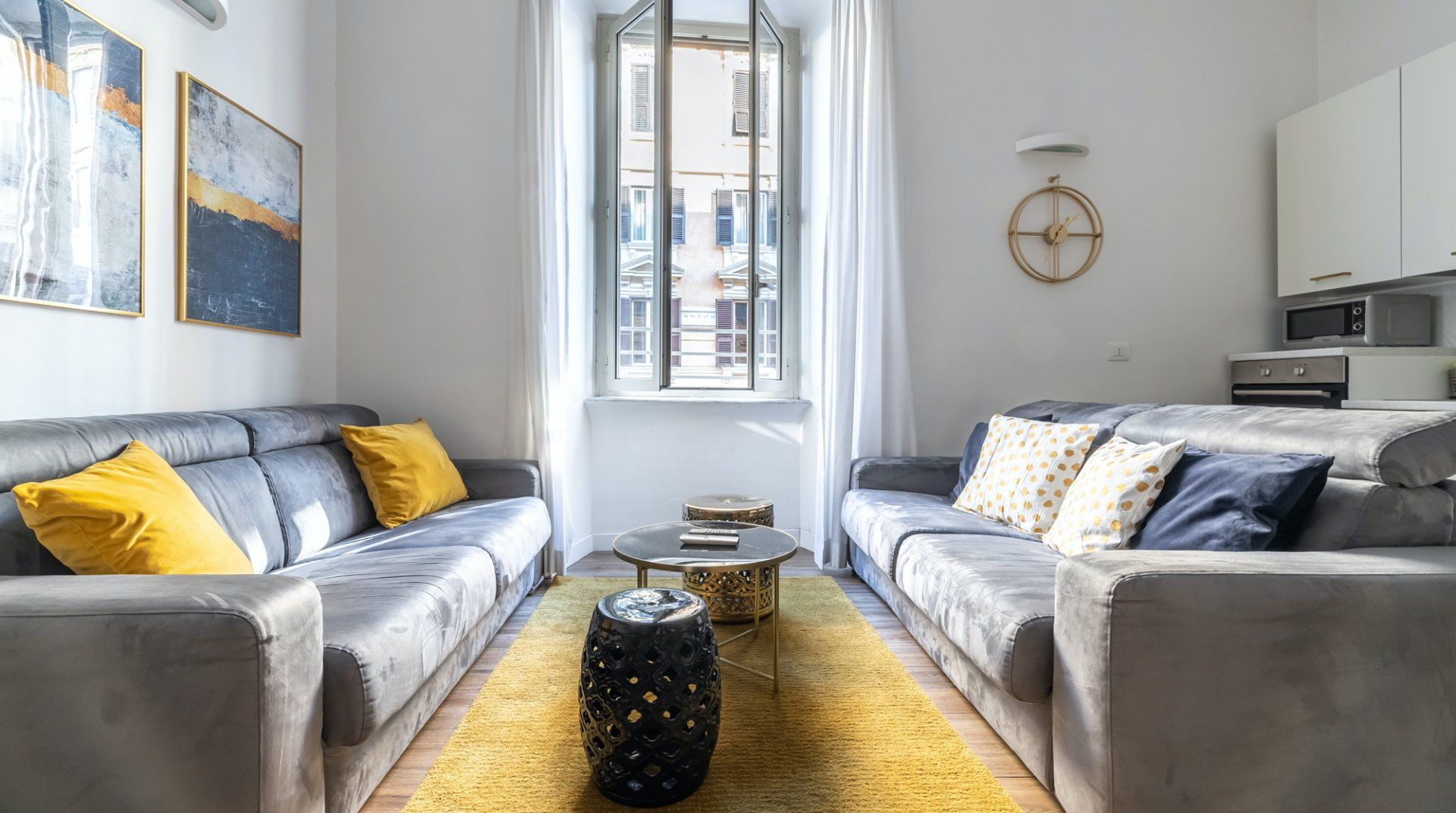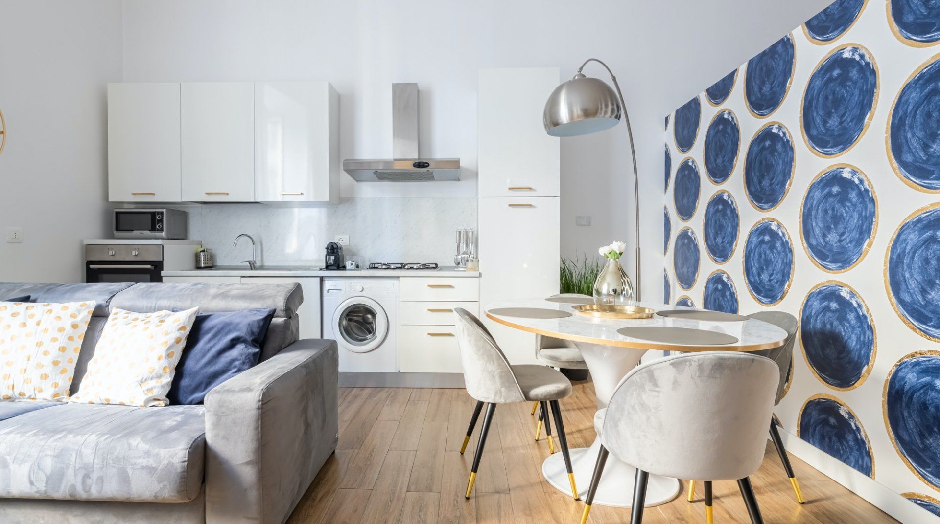 This second-floor apartment in a Prati building dating back to the 1940s illustrates how to incorporate some eccentricity into a home's interior design without going overboard. Colourful pieces of artwork, gold motifs and boldly patterned feature walls pop off satisfyingly against the white walls, while the silverback gorilla in the living room is a playful addition. The kitchen and bathrooms play it relatively simple in comparison but are equally notable for their high quality — we especially liked the whirlpool bathtub. The location is another plus point in our books. Castel Sant'Angelo and the surrounding Parco della Mole Adriana are only ten minutes' walk away, while Vatican City takes about a quarter of an hour to reach on foot.