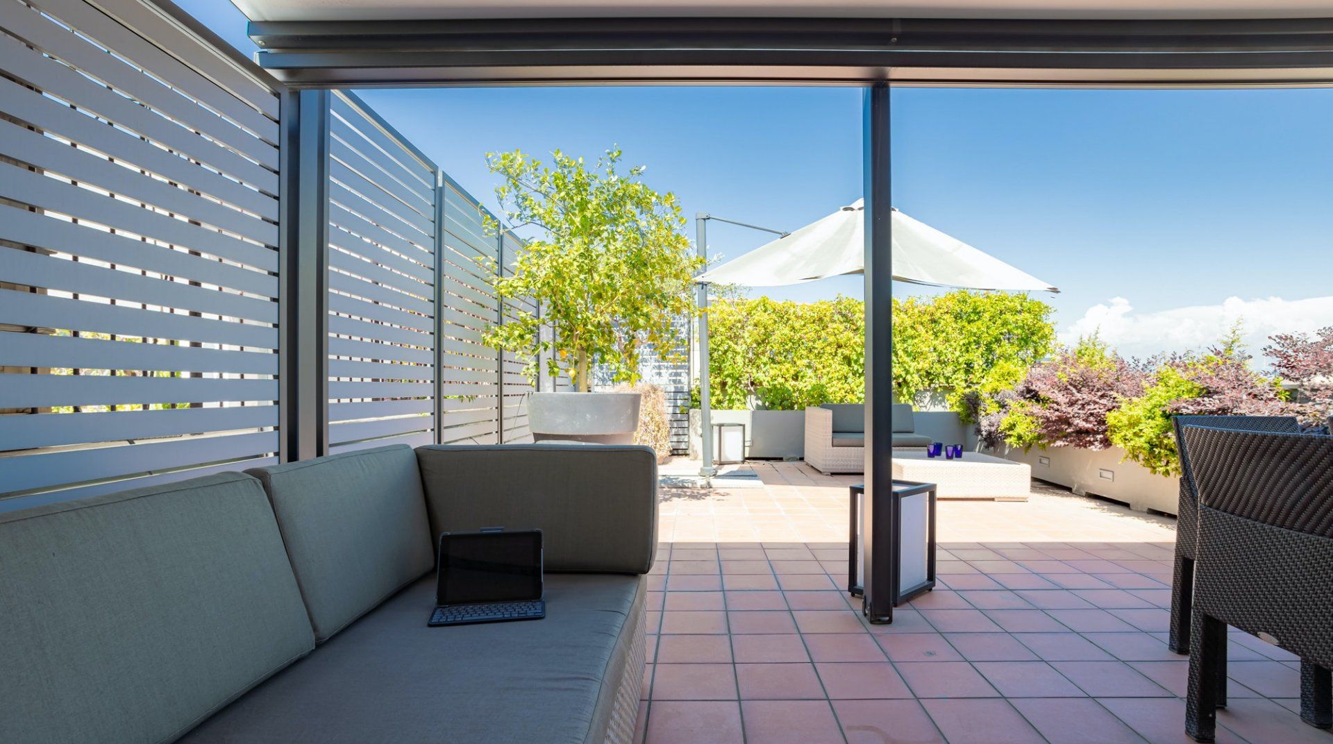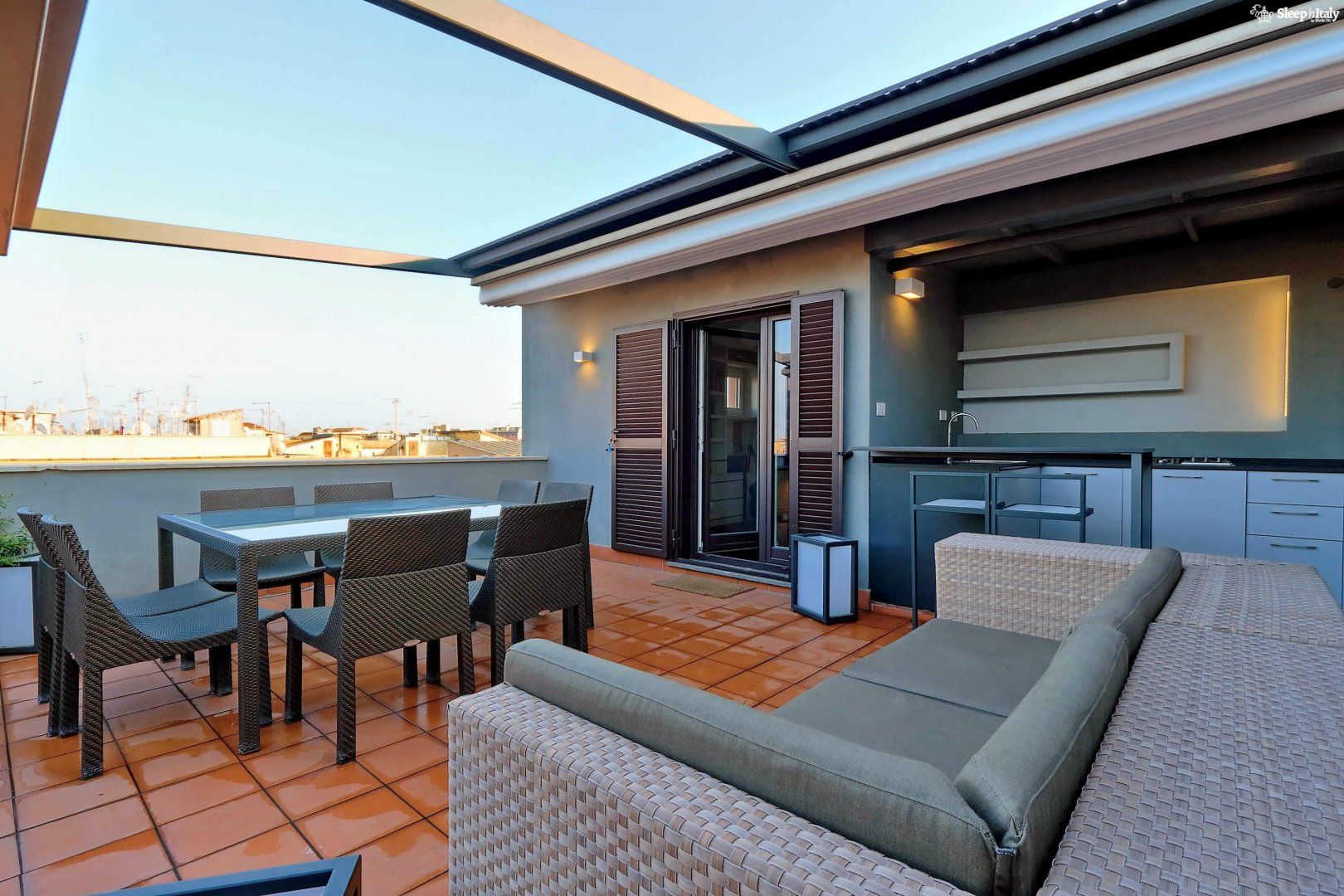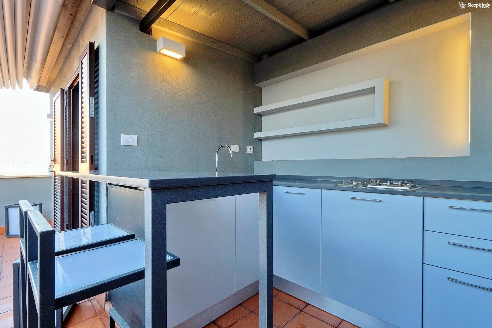 In this Termini apartment, the roof terrace is the first thing that grabs your attention, and with good reason. It’s a little world in itself, with furniture, awnings, vibrant shrubbery and even a kitchen. You’re well set up for balmy summers days outside, hosting slap-up feasts in the sunshine or enjoying a moment to yourself with a cappuccino—but if you want to do as the Romans do—never after 11am. Inside, the apartment oozes comfort with a quiet study space for reading and a stylish living room, where you can put your feet up after a hectic day. The flat is well positioned for places to eat—you’re surrounded by pizzerias and historic wine bars. Just over the railway tracks, the city awaits. You can reach the ancient relics of the bustling Municipio I in ten minutes by car.