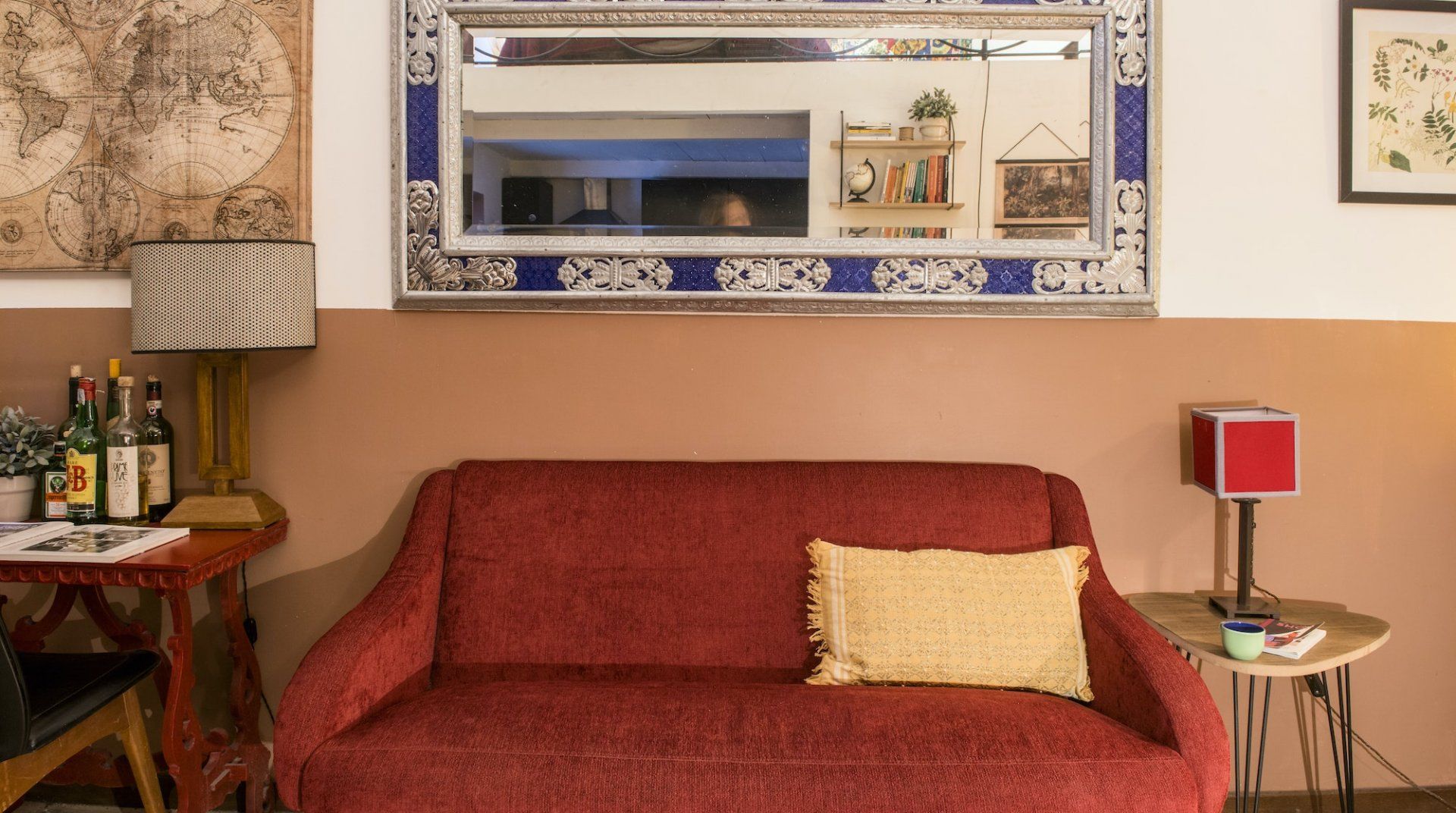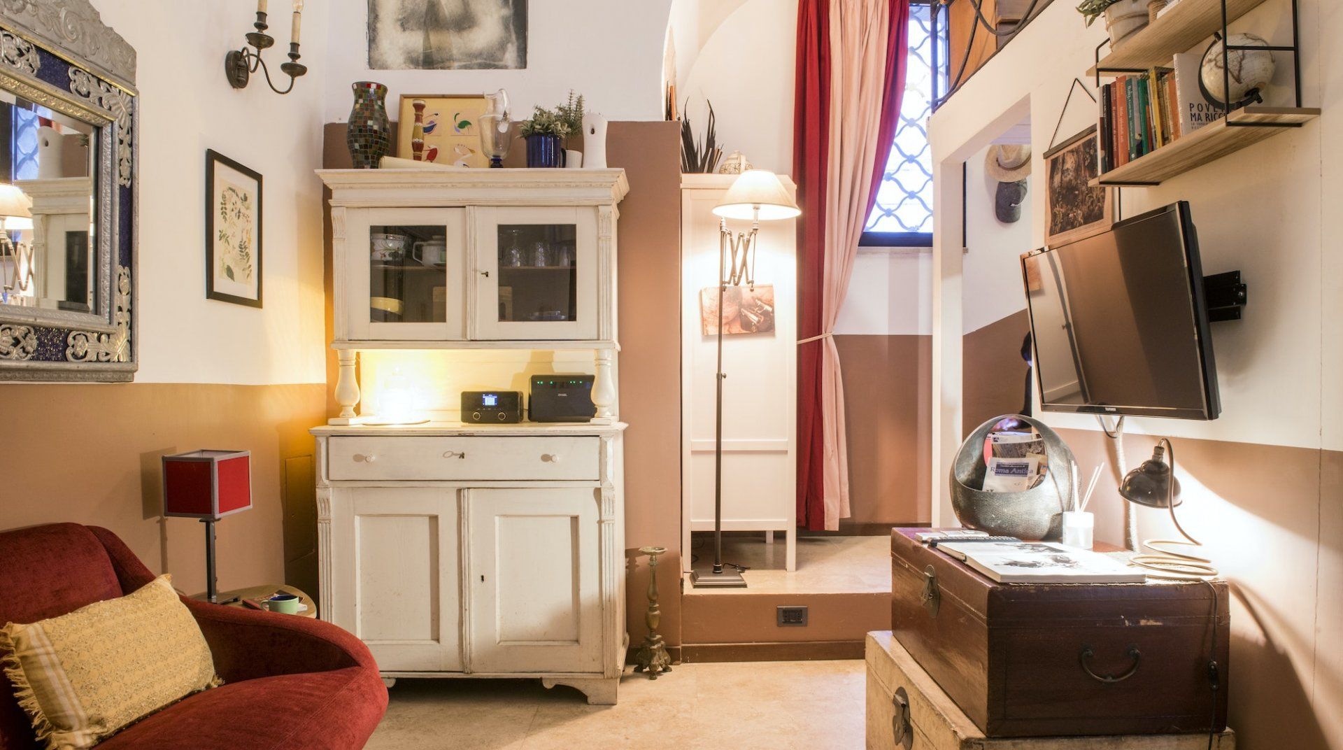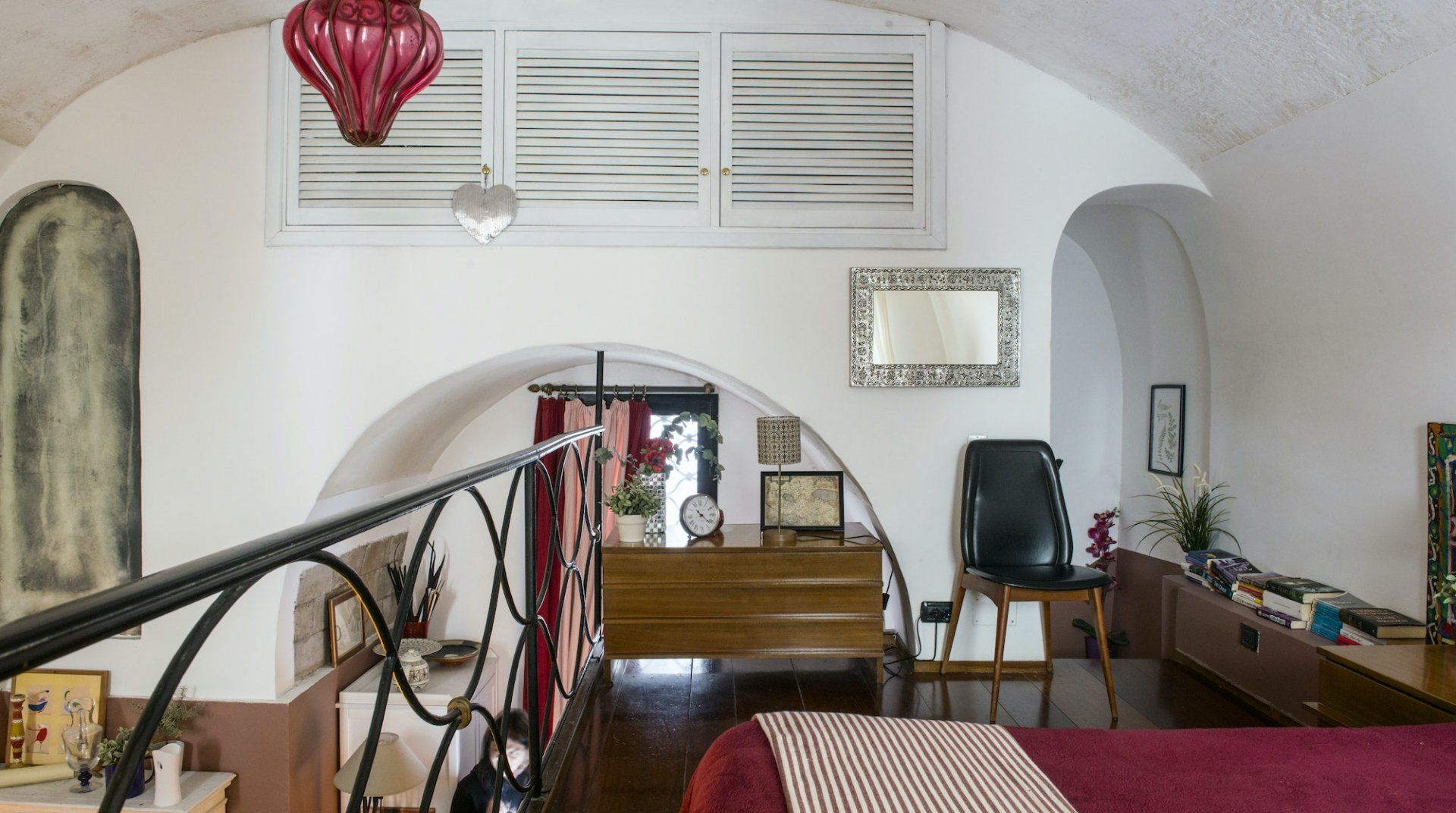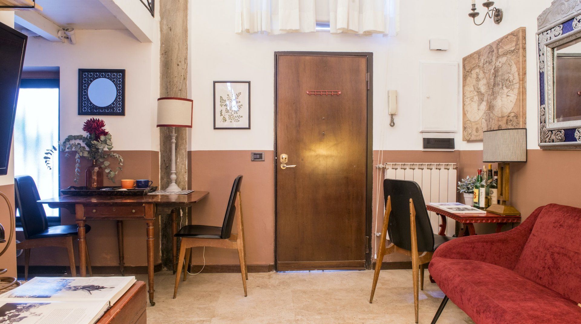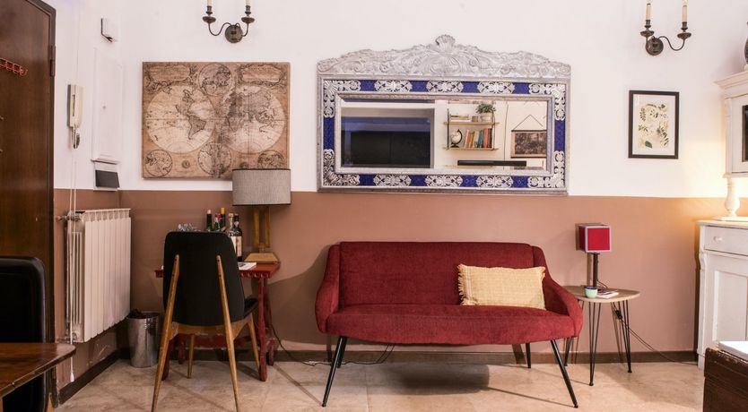 Housed in a former church in Rome’s scenic Jewish Quarter, this home is full of characterful details and historic charm, as well as being just a ten-minute stroll from picturesque Piazza Navona. Enter through the building’s grand outer door and step into an ornate courtyard where you’ll find this apartment quietly tucked away. Inside, rustic traditionalism meets quirky stylings, with a good dose of classic elegance thrown in for good measure. We love the arched windows here and the old Roman column with its elegant capital along the wall. There’s a definite air of romance in the mezzanine bedroom, framed by a wrought-iron balcony, while the pops of red in the draped curtains and sofa give the whole space a sumptuous, intimate feel. When you’re ready to explore, you've got the city's best sights within easy reach. Piazza Navona and the Pantheon are a mere ten-minute stroll away, while the Trevi Fountain and the Colosseum are a twenty-minute walk from your door. After a day of sightseeing, come back home for a glass of wine and an intimate meal at home, or discover the countless delicious trattorias right on your doorstep.
