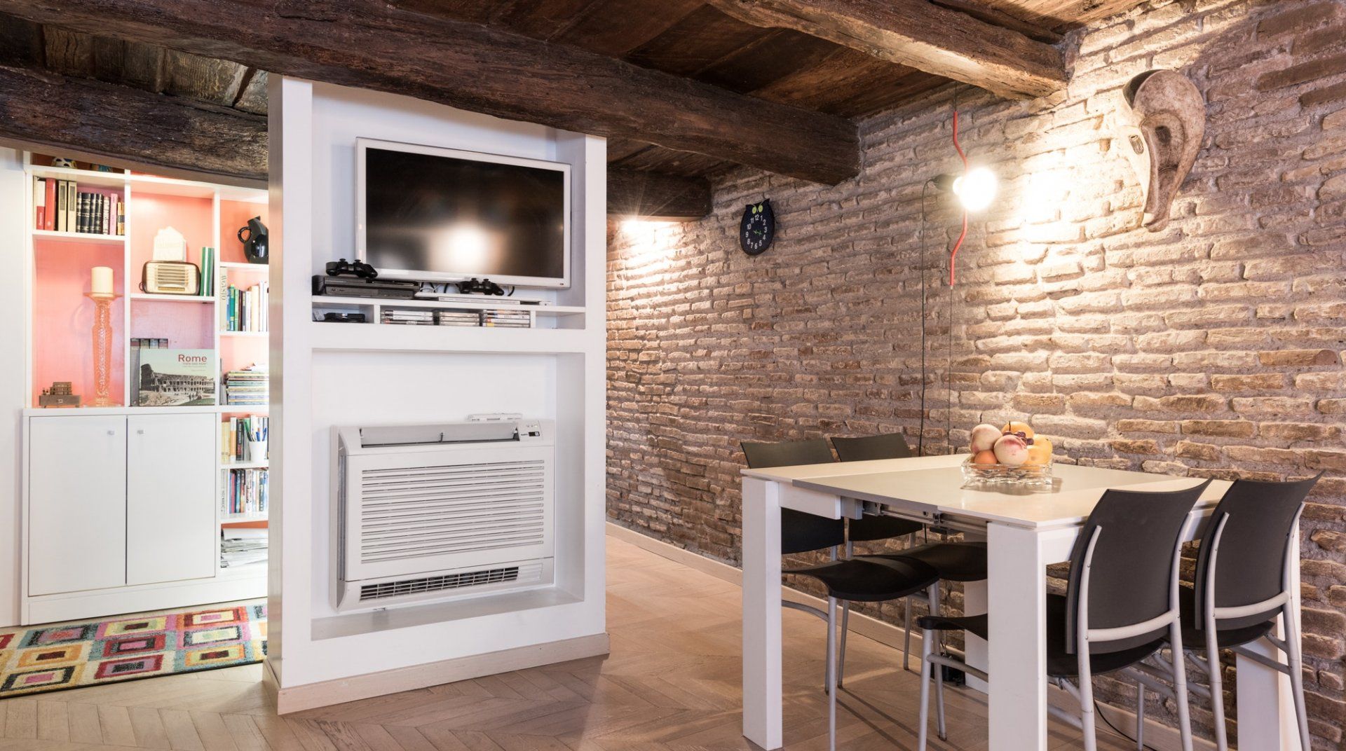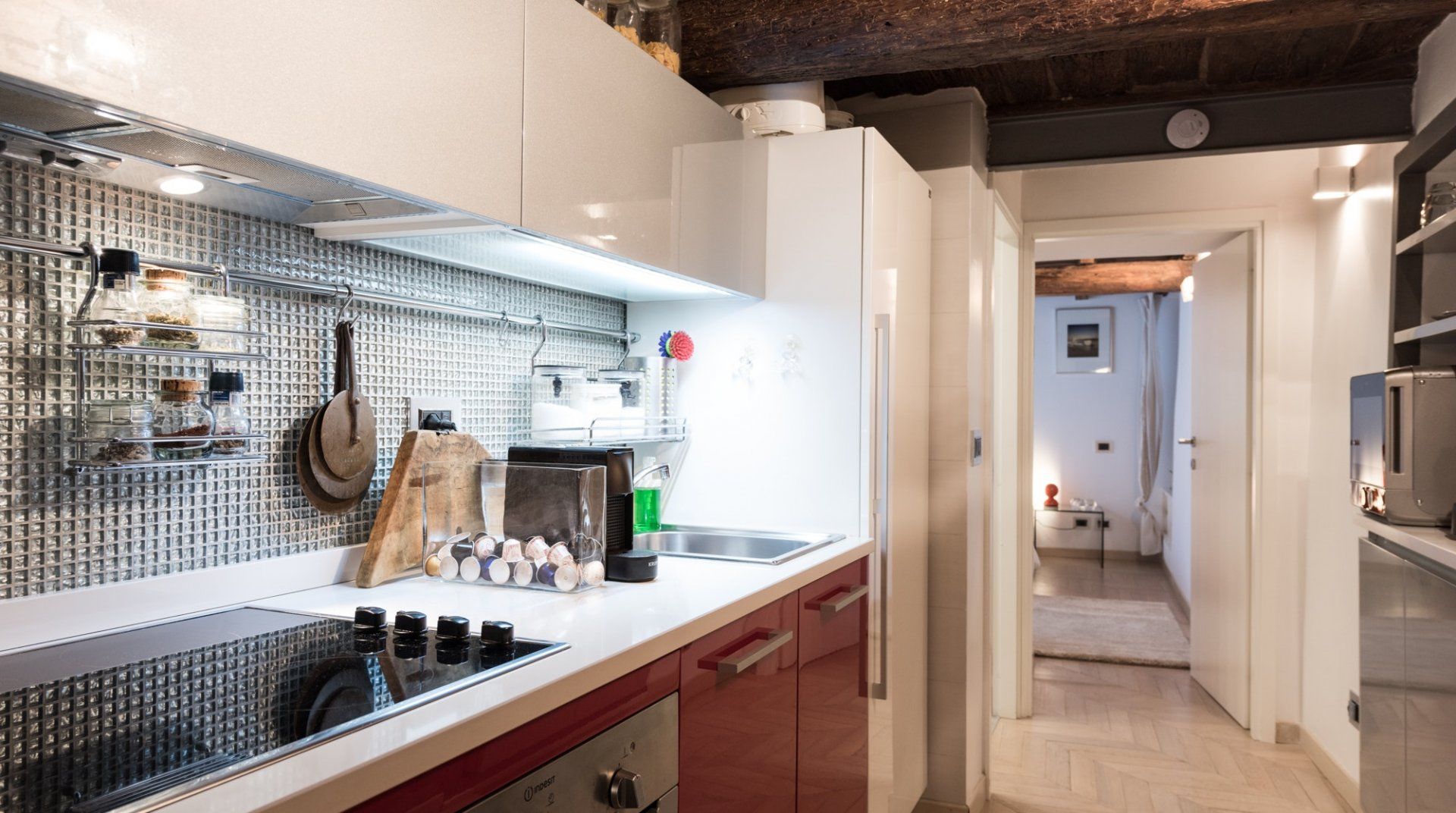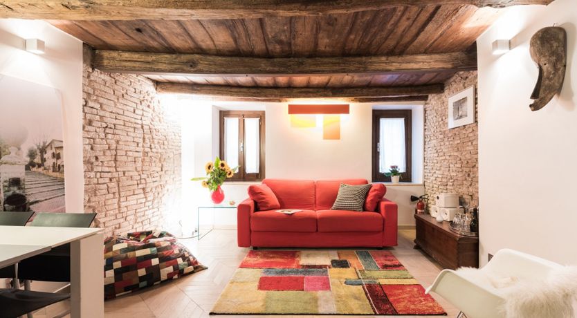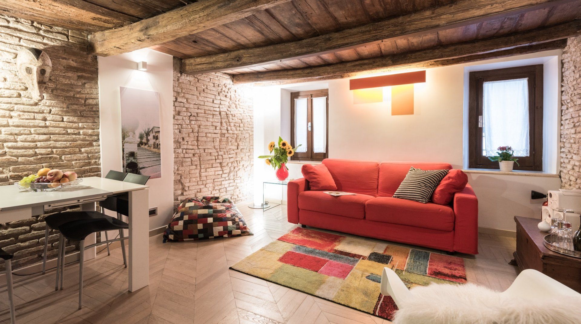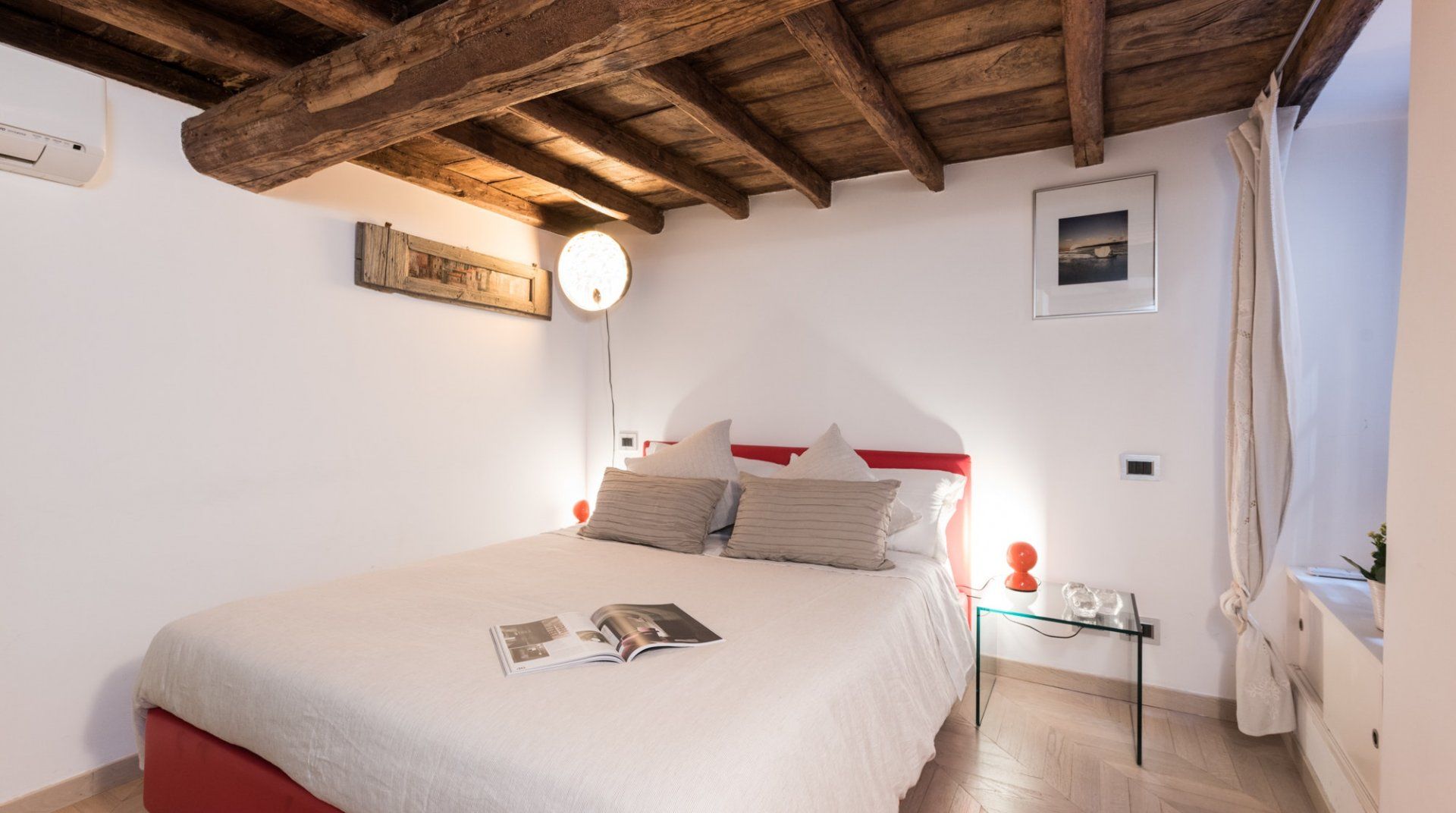 Footsteps from the Foro Romano complex and a five-minute stroll to the monumental Colosseum, this 17th-century apartment pairs original features with modern detail to create a captivating home in the heart of the eclectic Monti neighbourhood. Expect rustic timber beams, exposed brick walls and herringbone parquet floors. Splashes of cherry red bridge the gap between old and new worlds, and the sleek up-to-date kitchen showcases contemporary design. Slip into your locale’s romantic honeyed streets. You’re metres from family-run trattorias, trendy wine bars and tempting gelaterias. In the evenings, hang out at Piazza della Madonna dei Monti, a three-minute walk away. People-watch by the 16th-century fountain before ducking into a bohemian bar for cocktails and aperitivo. When it’s time to call it a night, head home to rest easy in your comfy-cosy bed.