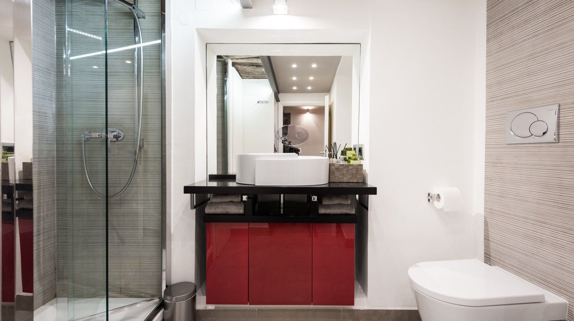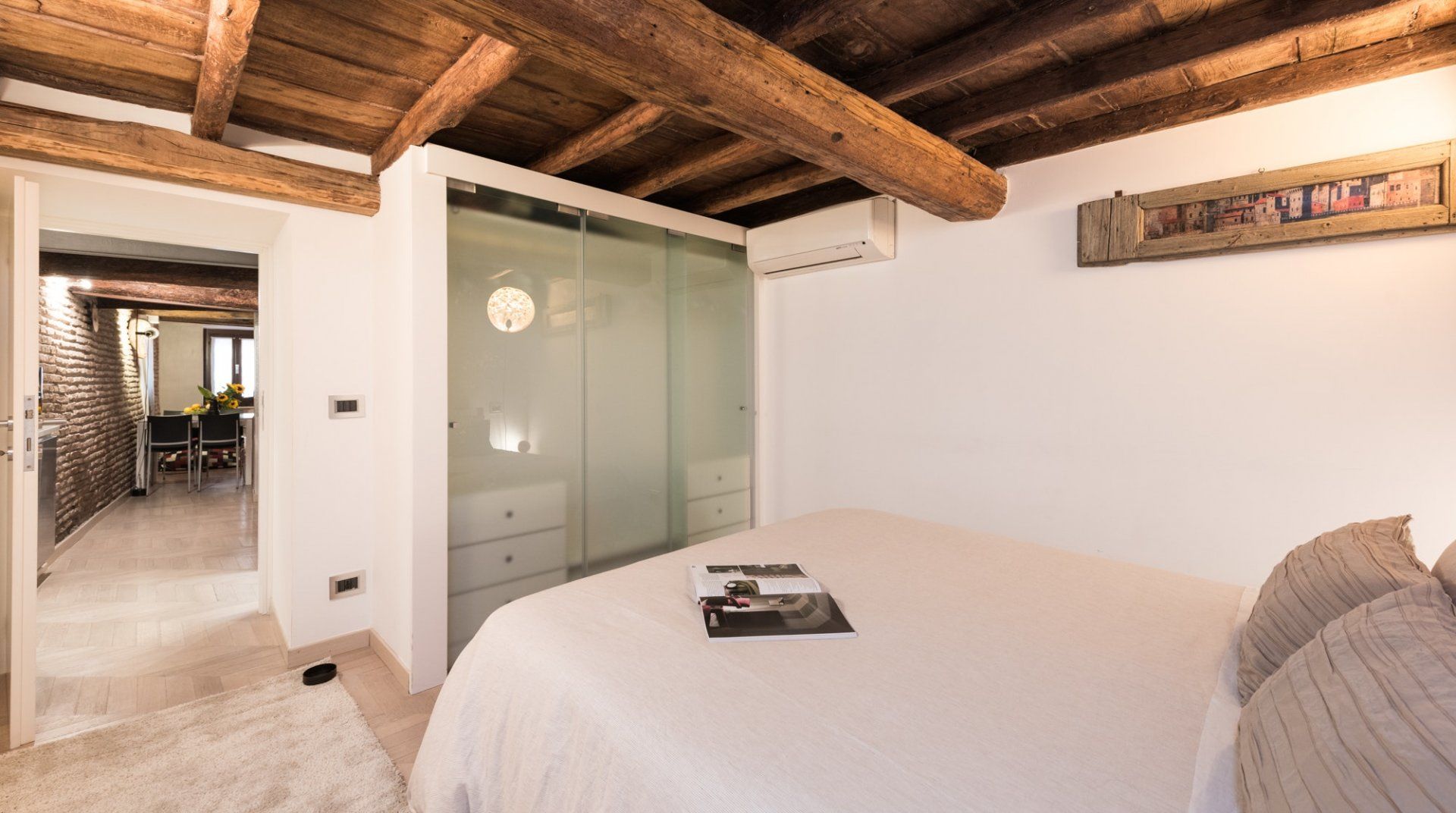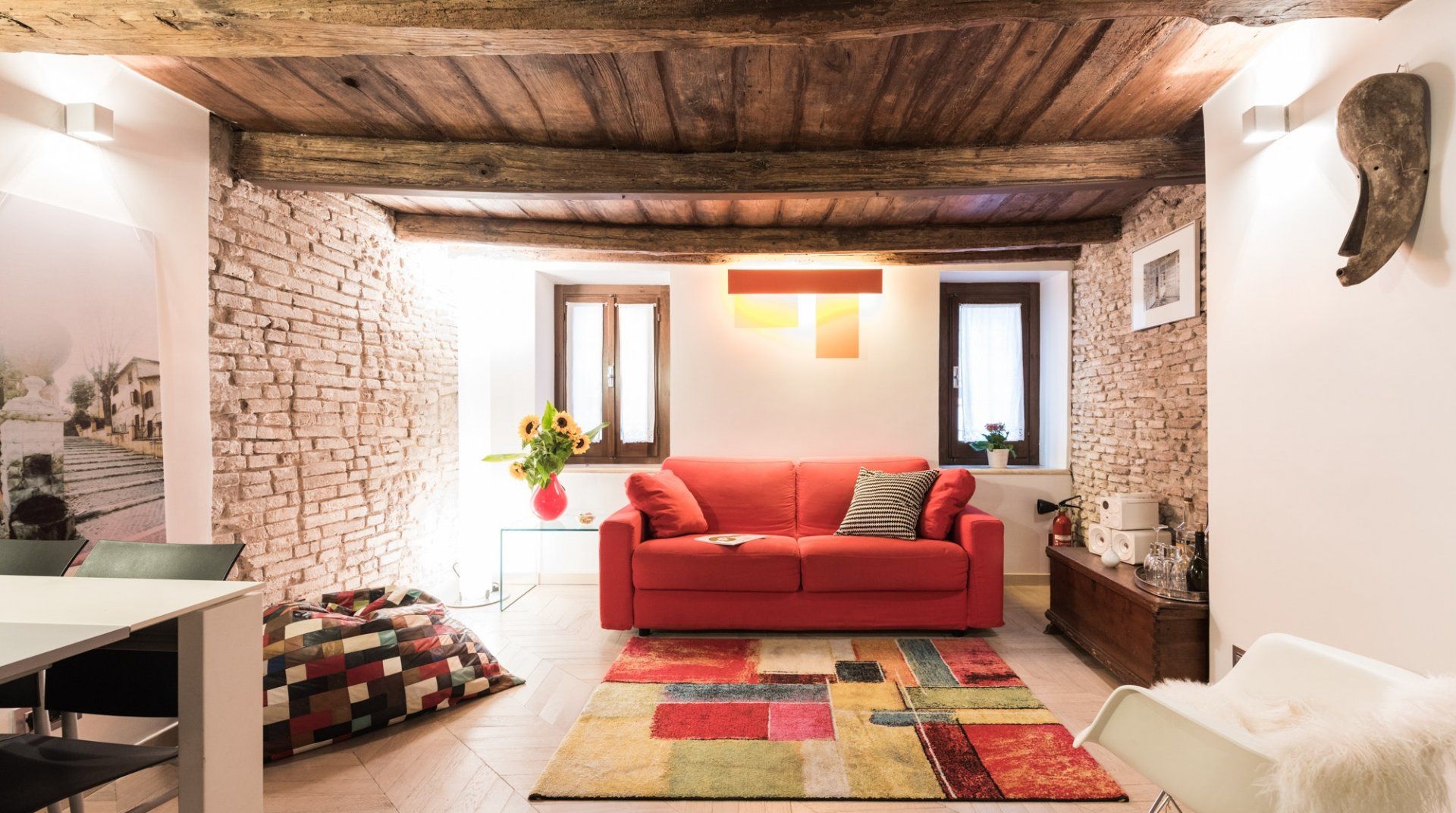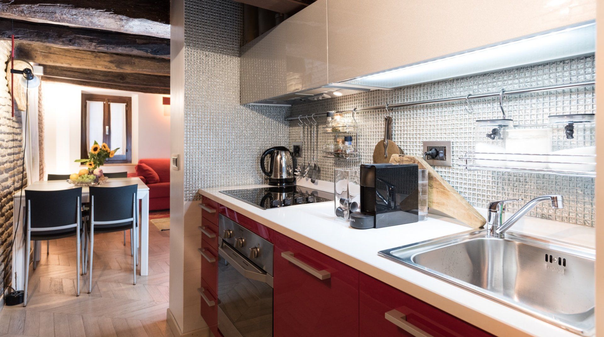 Footsteps from the Foro Romano complex and a five-minute stroll to the monumental Colosseum, this 17th-century apartment pairs original features with modern detail to create a captivating home in the heart of the eclectic Monti neighbourhood. Expect rustic timber beams, exposed brick walls and herringbone parquet floors. Splashes of cherry red bridge the gap between old and new worlds, and the sleek up-to-date kitchen showcases contemporary design. Slip into your locale’s romantic honeyed streets. You’re metres from family-run trattorias, trendy wine bars and tempting gelaterias. In the evenings, hang out at Piazza della Madonna dei Monti, a three-minute walk away. People-watch by the 16th-century fountain before ducking into a bohemian bar for cocktails and aperitivo. When it’s time to call it a night, head home to rest easy in your comfy-cosy bed.