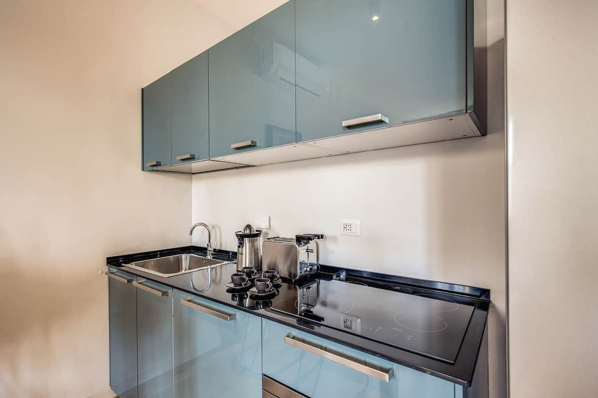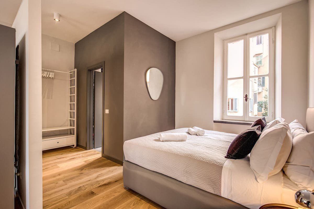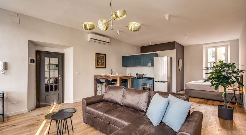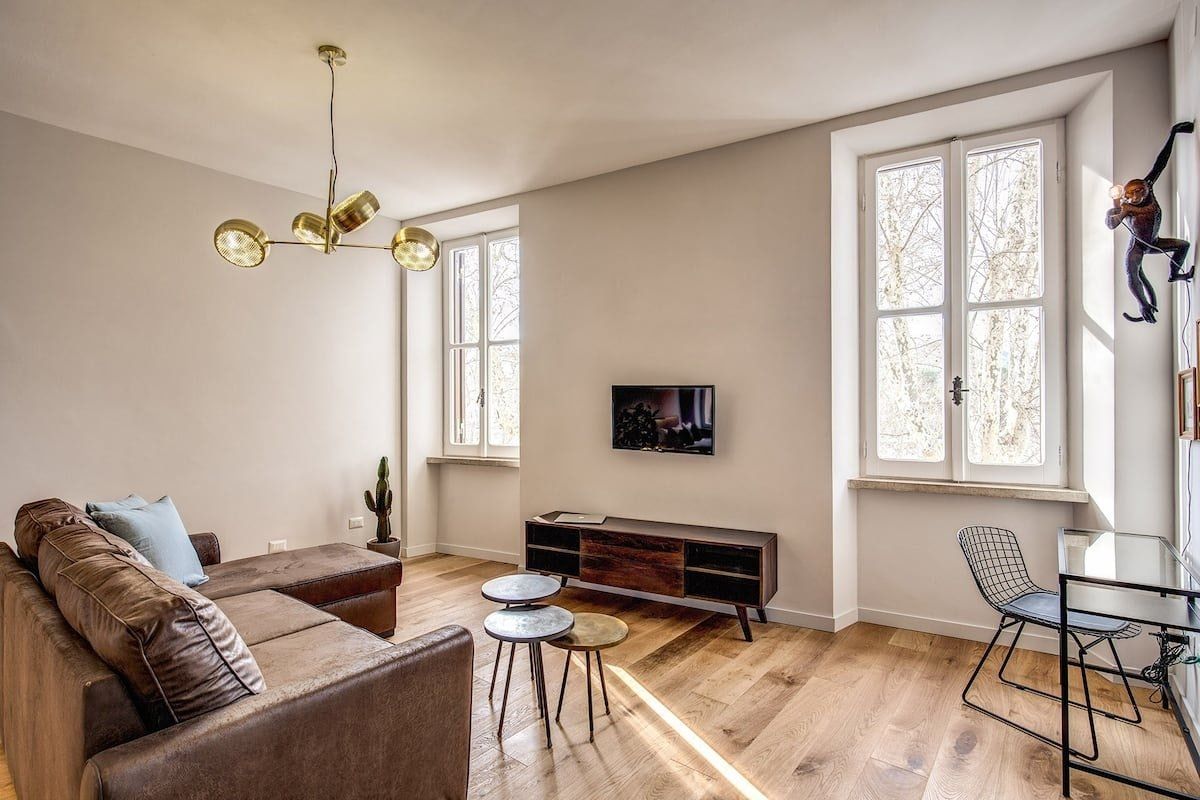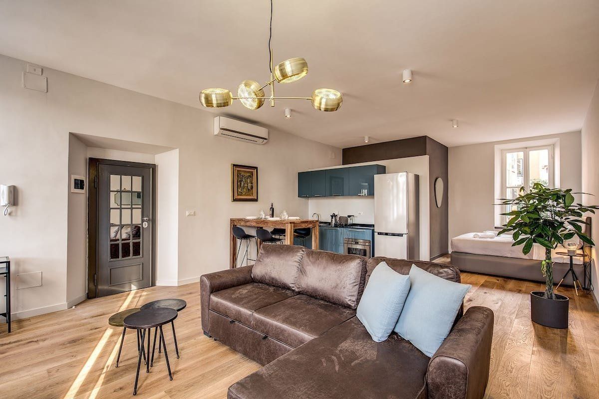 Halfway between Trastevere and Campo de’ Fiori, and footsteps from the banks of the River Tiber, this apartment is enviably located. Inside, the place has been tastefully finished with relaxation in mind. Furnishings in rich brown are complemented by pops of teal and subtle gold accents. There’s a comfy L-shaped sofa that calls for reclining with a good book and a dining nook should you fancy taking your meals at home. Take a walk through Rome’s historic streets. You’ll reach the Spada Gallery and the old-school trattorias of Via del Pellegrino in five minutes by foot, the Moor Fountain in ten and the Pantheon in fifteen. To reach the Roman Forum and the Colosseum, catch a taxi and arrive in just over ten minutes or opt to wander through the city and reach them in a leisurely thirty.