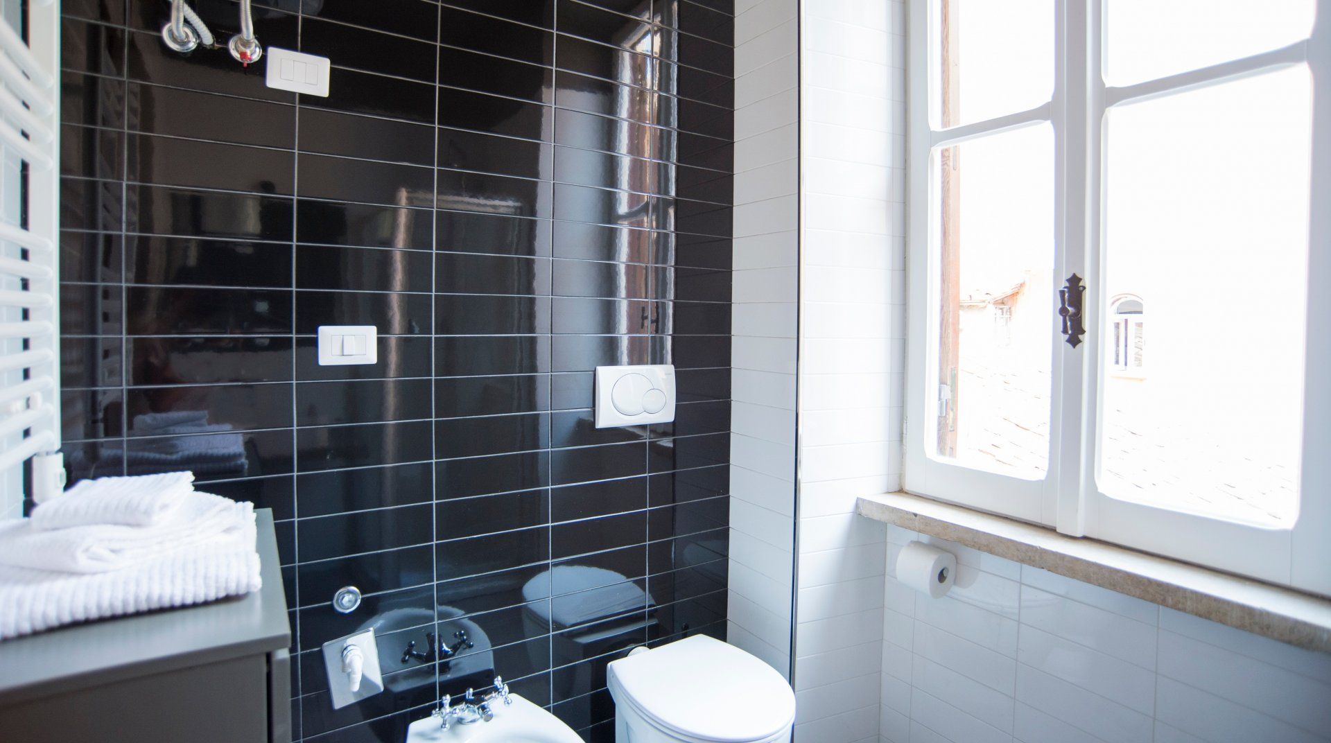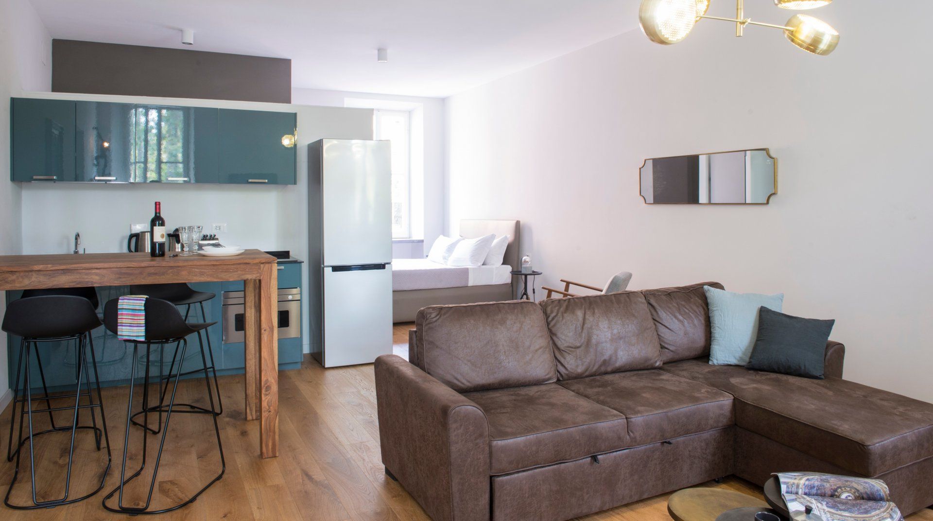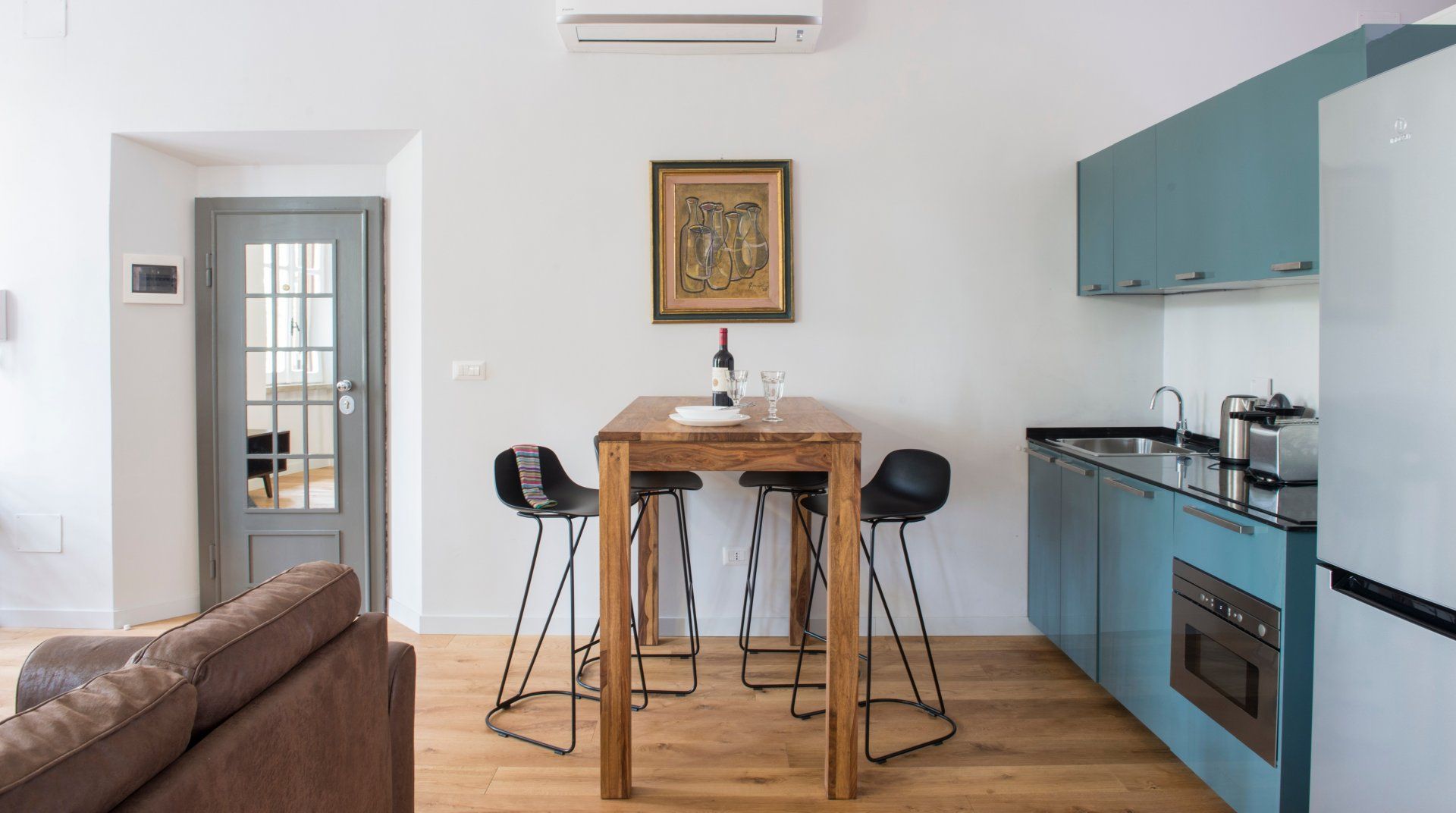 Halfway between Trastevere and Campo de’ Fiori, and footsteps from the banks of the River Tiber, this apartment is enviably located. Inside, the place has been tastefully finished with relaxation in mind. Furnishings in rich brown are complemented by pops of teal and subtle gold accents. There’s a comfy L-shaped sofa that calls for reclining with a good book and a dining nook should you fancy taking your meals at home. Take a walk through Rome’s historic streets. You’ll reach the Spada Gallery and the old-school trattorias of Via del Pellegrino in five minutes by foot, the Moor Fountain in ten and the Pantheon in fifteen. To reach the Roman Forum and the Colosseum, catch a taxi and arrive in just over ten minutes or opt to wander through the city and reach them in a leisurely thirty.