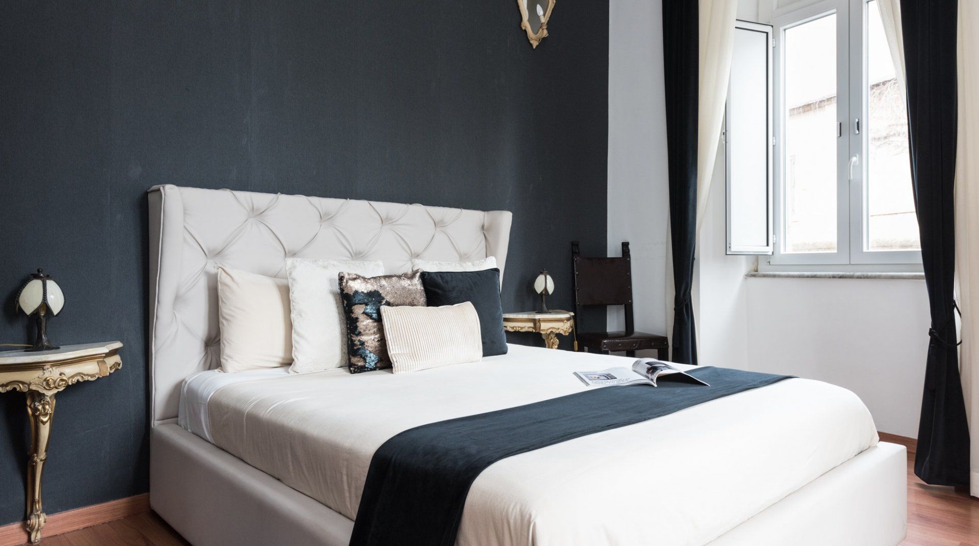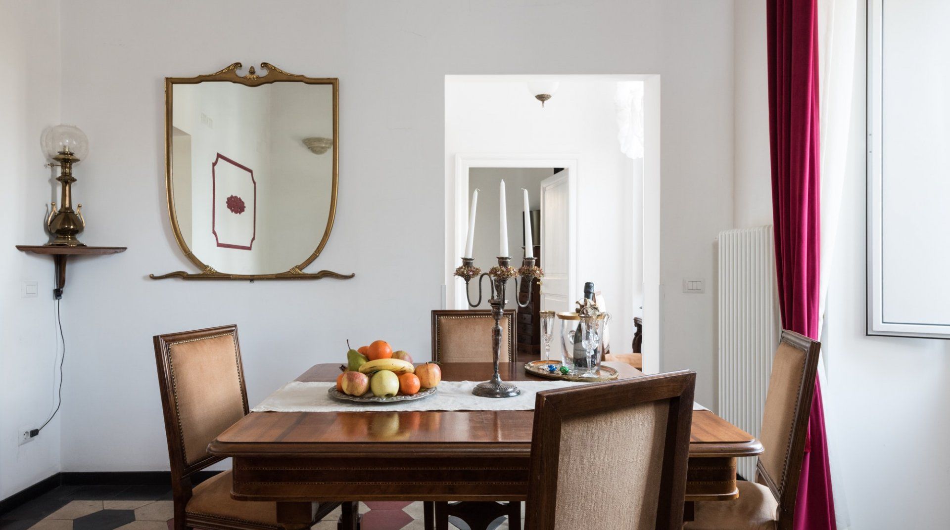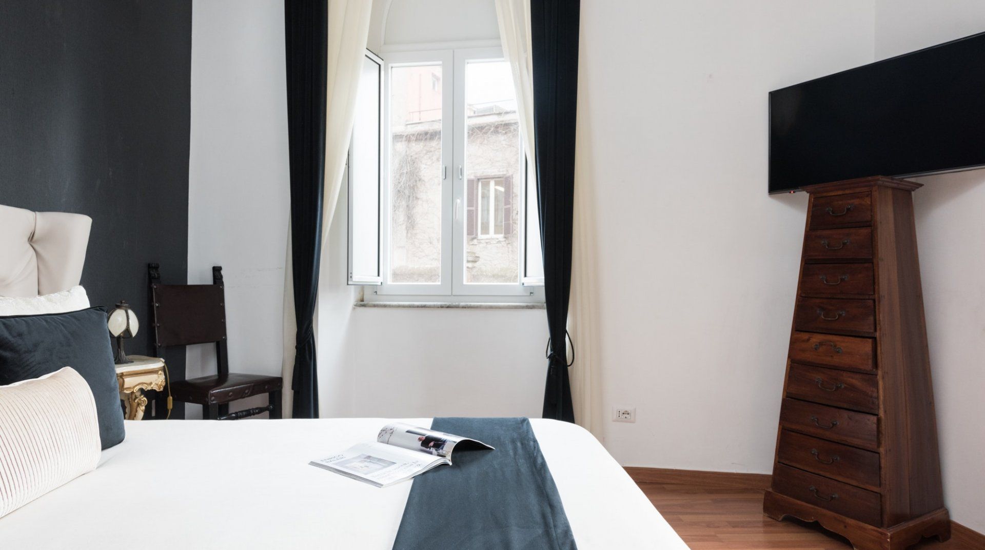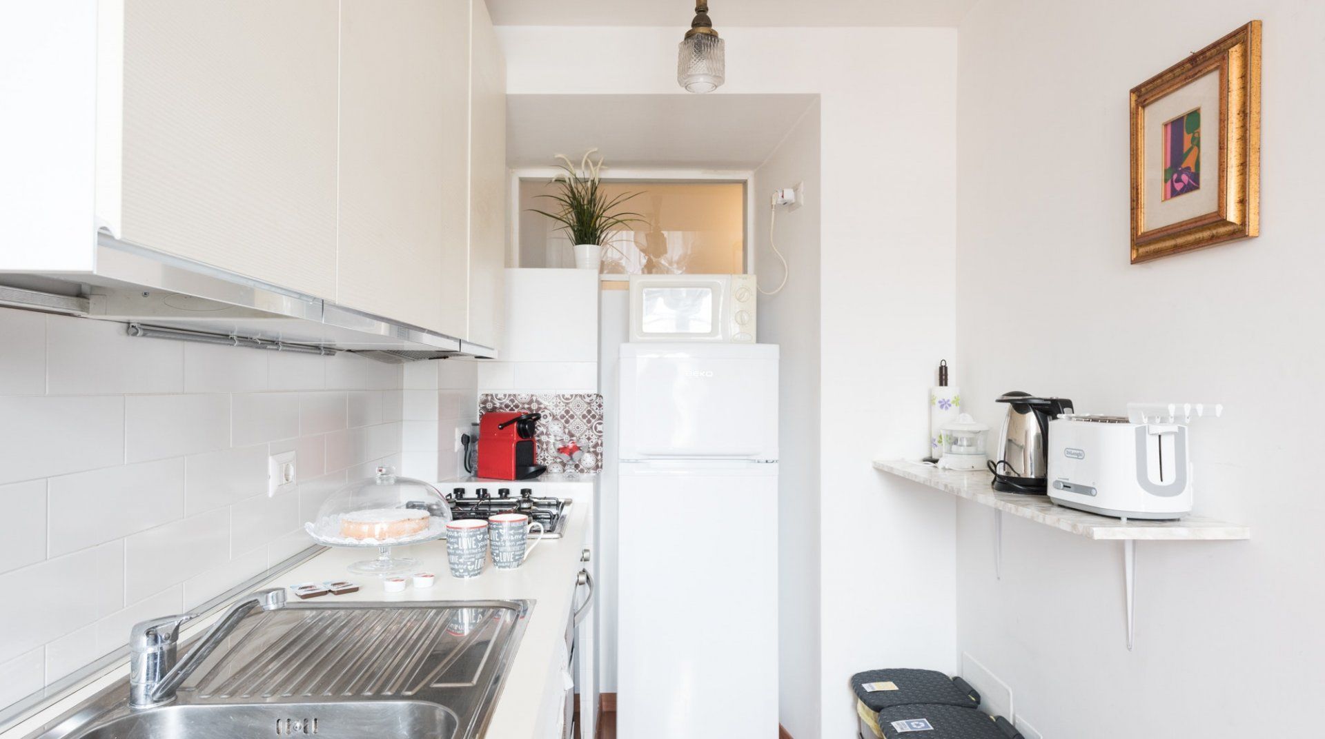 In among the original hills of Rome, The Bathhouse is completely surrounded by history. On one side, the Nero’s infamous palace – the Domus Aurea – and on the other, the Colosseum and the Imperial Forums. Its position alone would sell, but the flat itself is not underwhelming. It has lovely views, and the kitchen is pretty big for a place of its size. There’s an antique desk in the corner, which although not making as much sense as a breakfast table, is far prettier.
