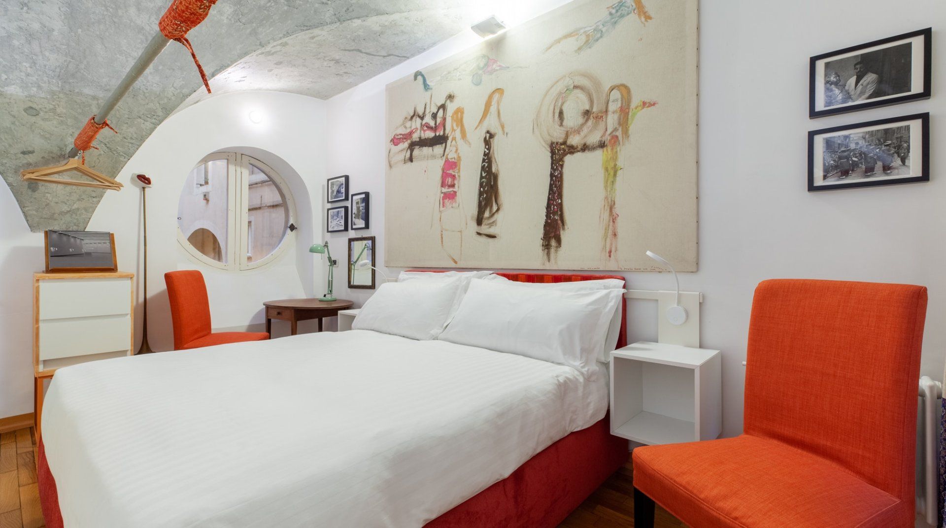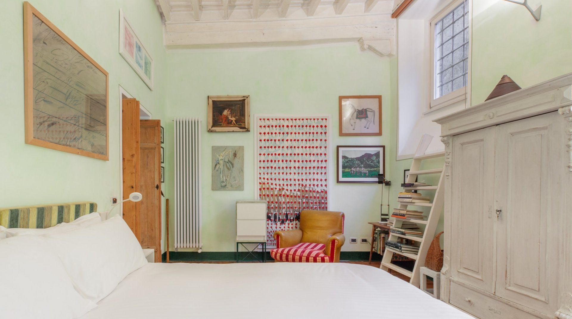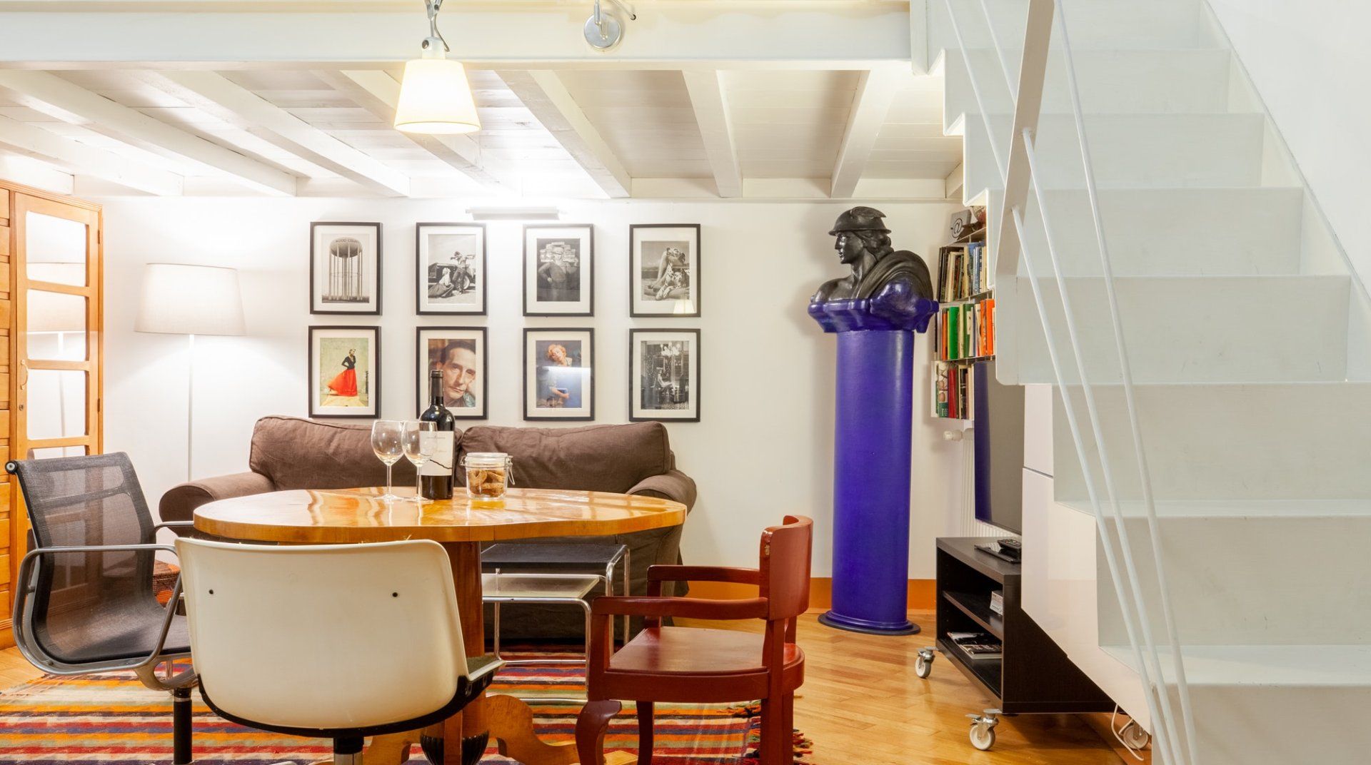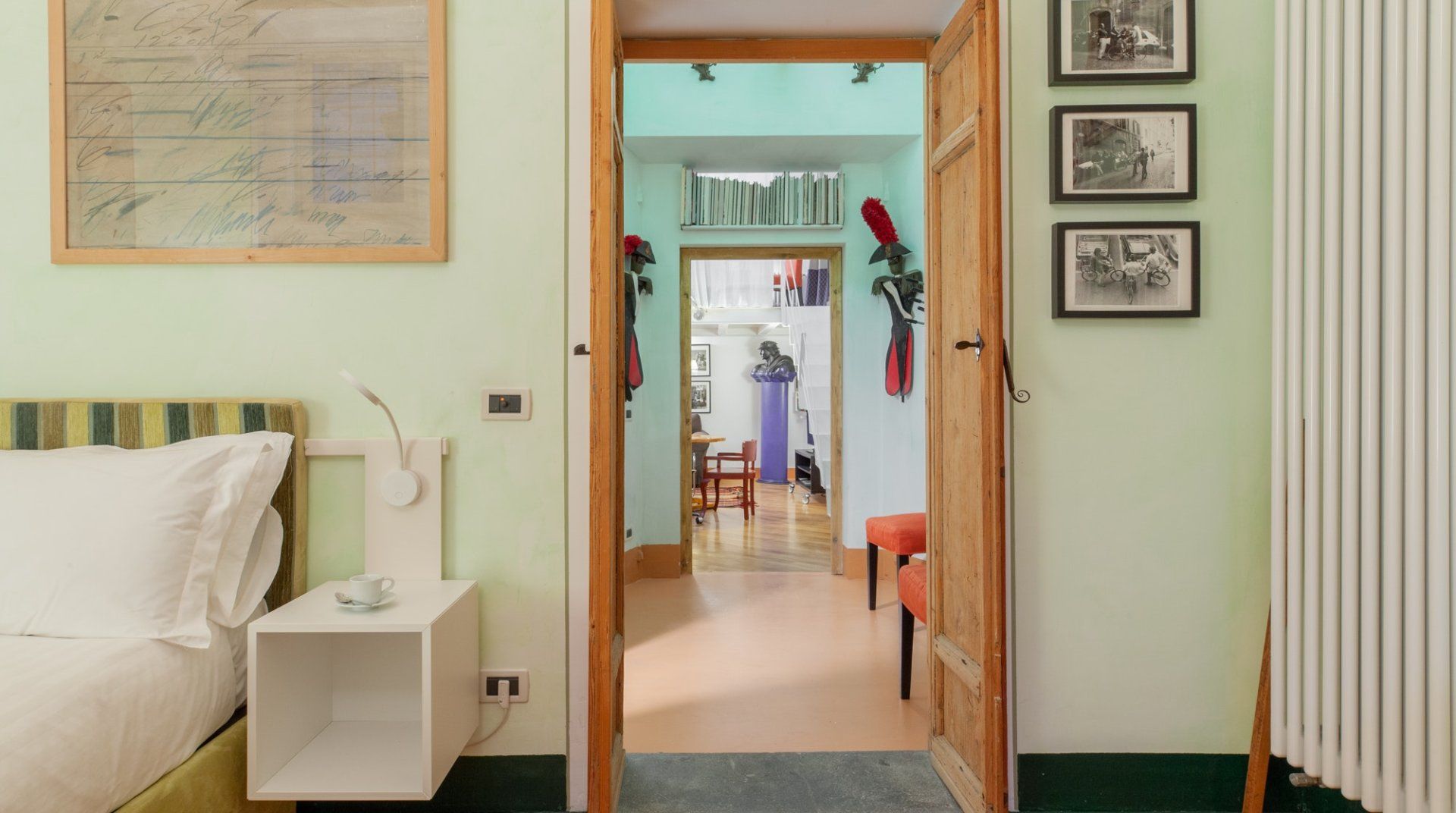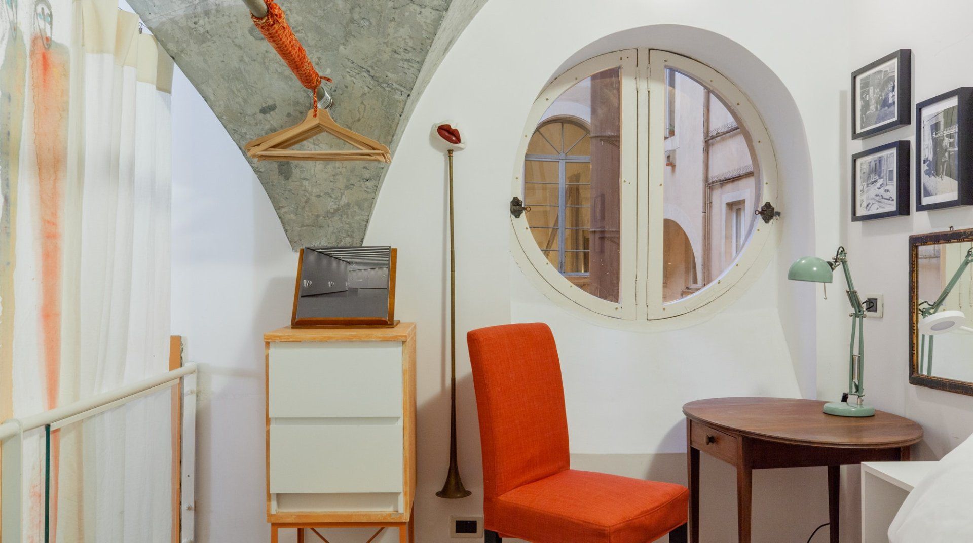 Filled to the brim with unique artwork and quirky trinkets, this playful apartment embraces maximalism like there's no tomorrow. The apartment is full of colour and a sense of fun, though it's fair to say it won't appeal to lovers of neutral tones and pared-back decor. It's in an old building on one of the more characteristic streets in the charming Regola district. Several details remind you of that, such as the stone arches, vaulted ceilings and the ornate entryway at street level. Step out onto the cobbles and you're a five-minute walk from the lively Campo de' Fiori, seven minutes from the baroque beauty of Piazza Navona, and just over twenty minutes from the labyrinthine streets of trendy Trastevere.