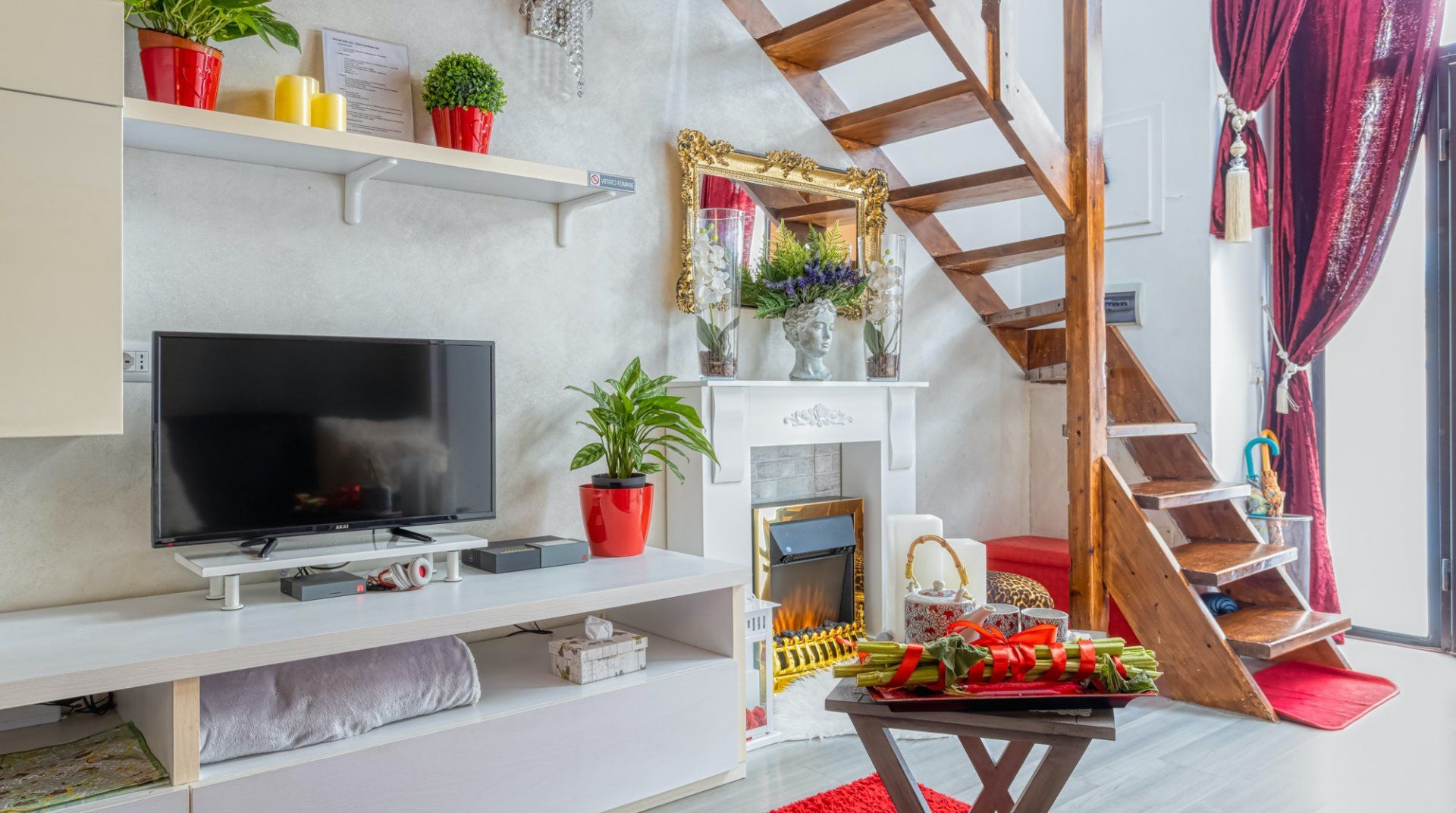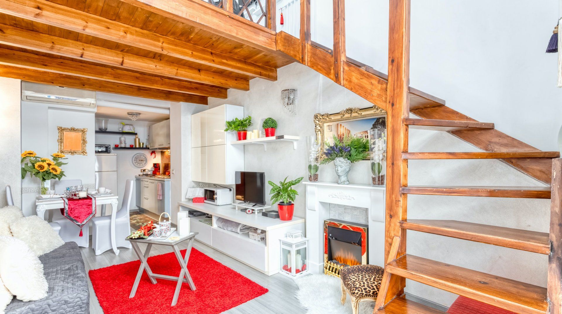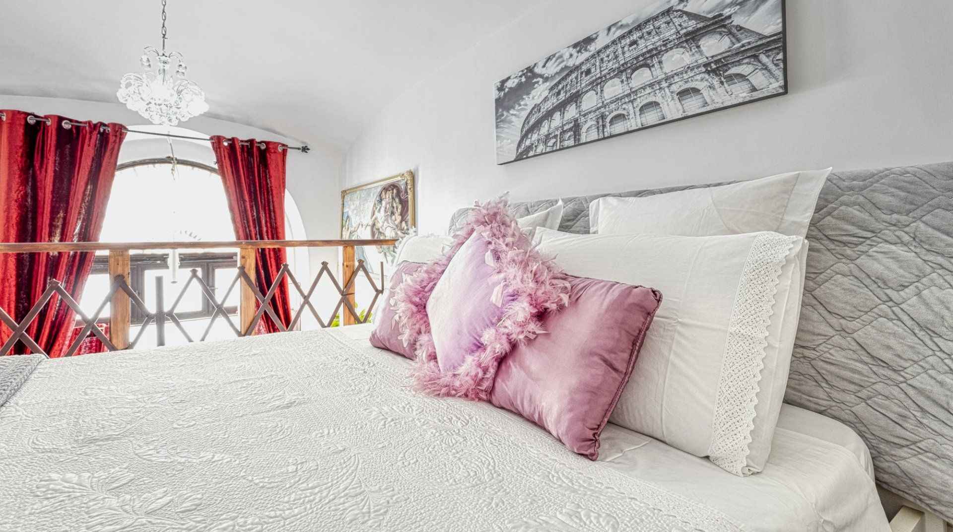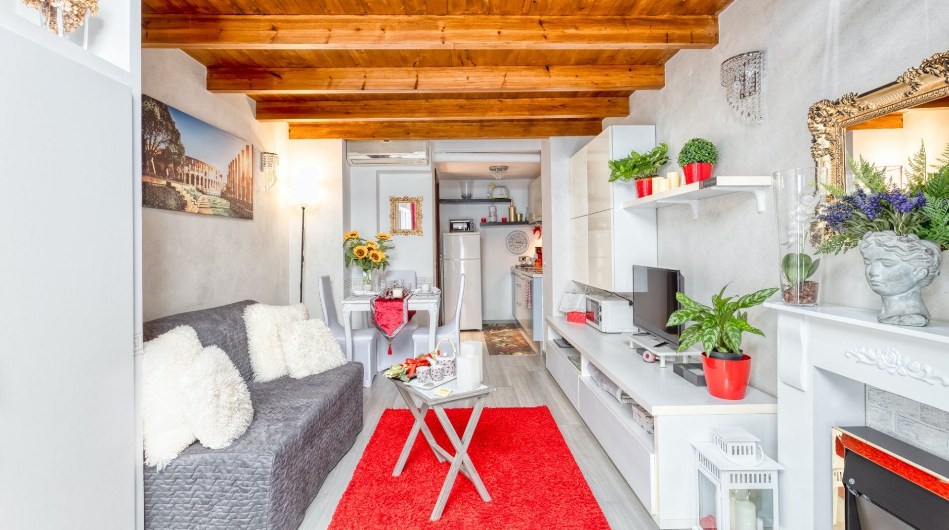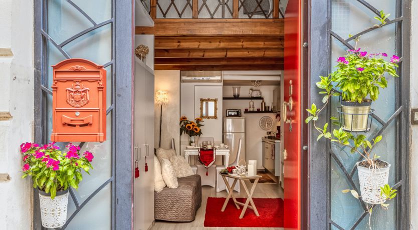 On a quiet street near San Giovanni in Laterano, this eclectic apartment offers a haven to return to after a day in the bustling centre. Though the neighbourhood is quiet, you’re still only a fifteen-minute stroll away from the Colosseum and Roman Forum. If you don’t fancy stretching your legs, the Manzoni metro station is a three-minute walk, putting all of Rome at your fingertips. This loft apartment is a mix of glamour and kitsch – think gilded mirrors, leopard-print throws and thick, red velvet curtains. Though the arched windows and exposed beam ceiling reassure that you’re in an old quarter of Rome. The eclectic fireplace set in a traditional mantle is a nice homely touch too.