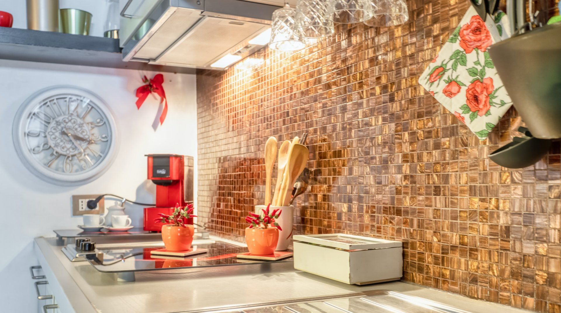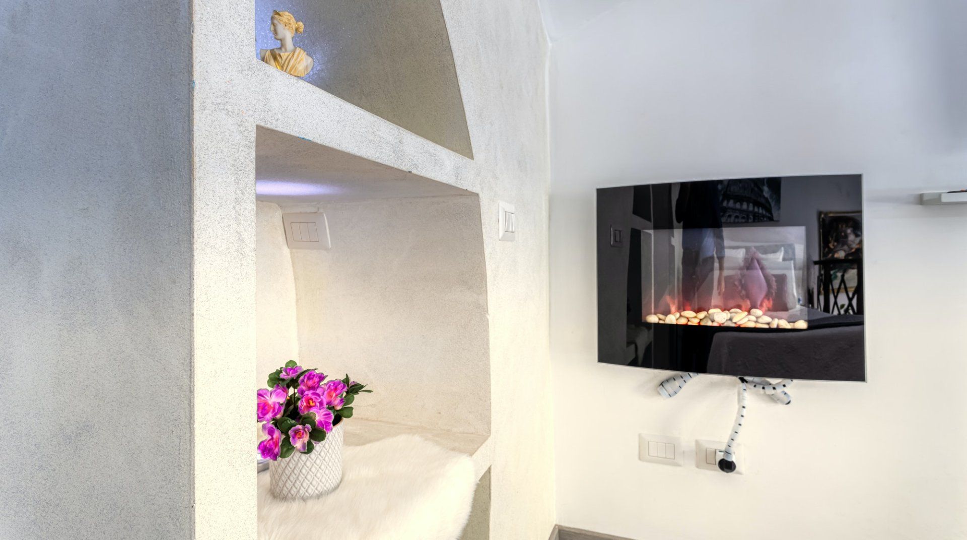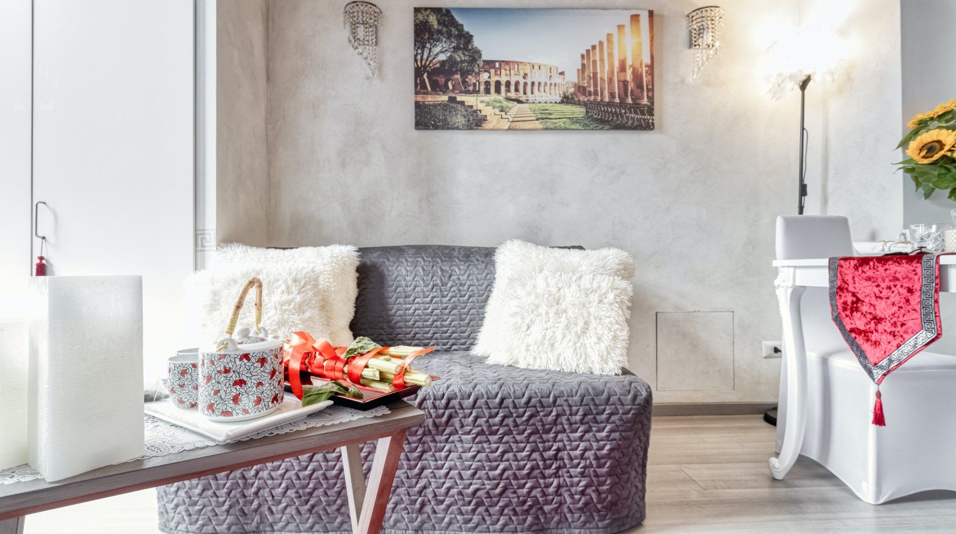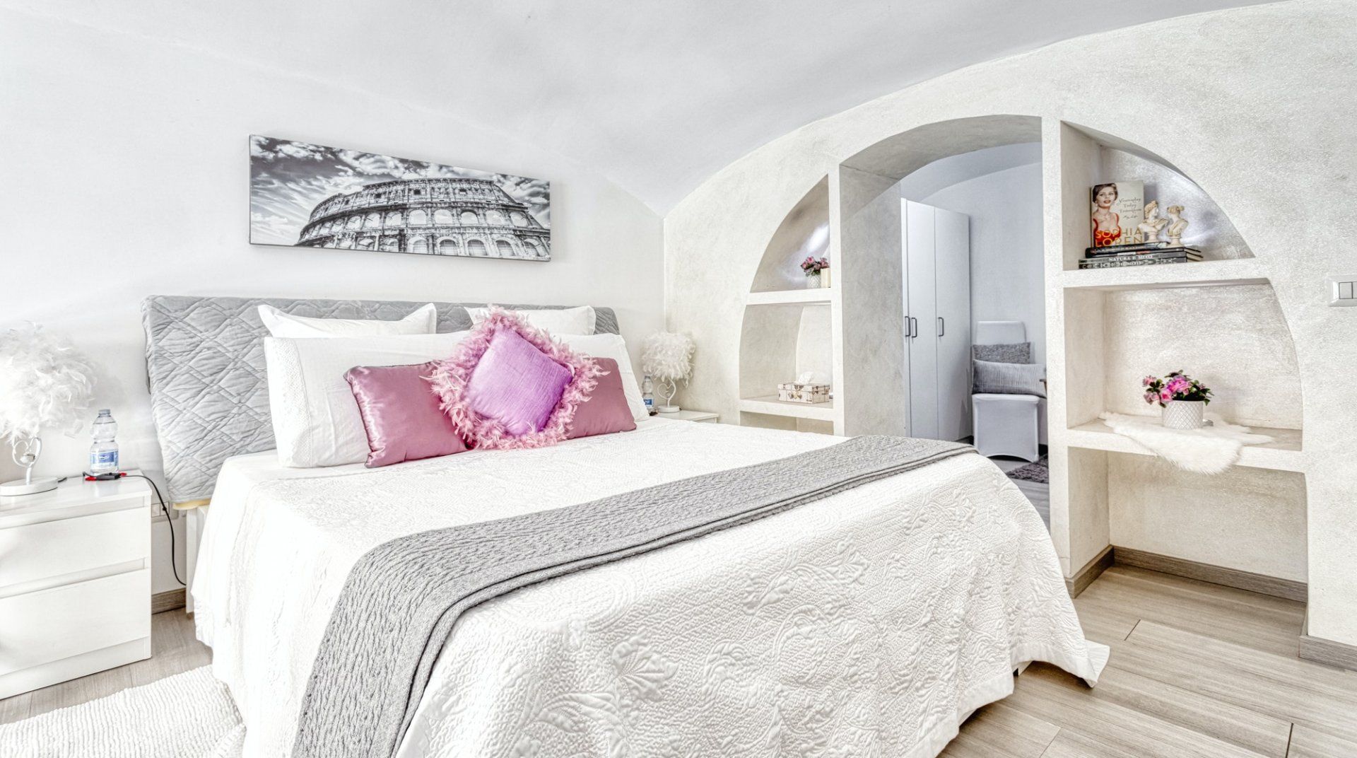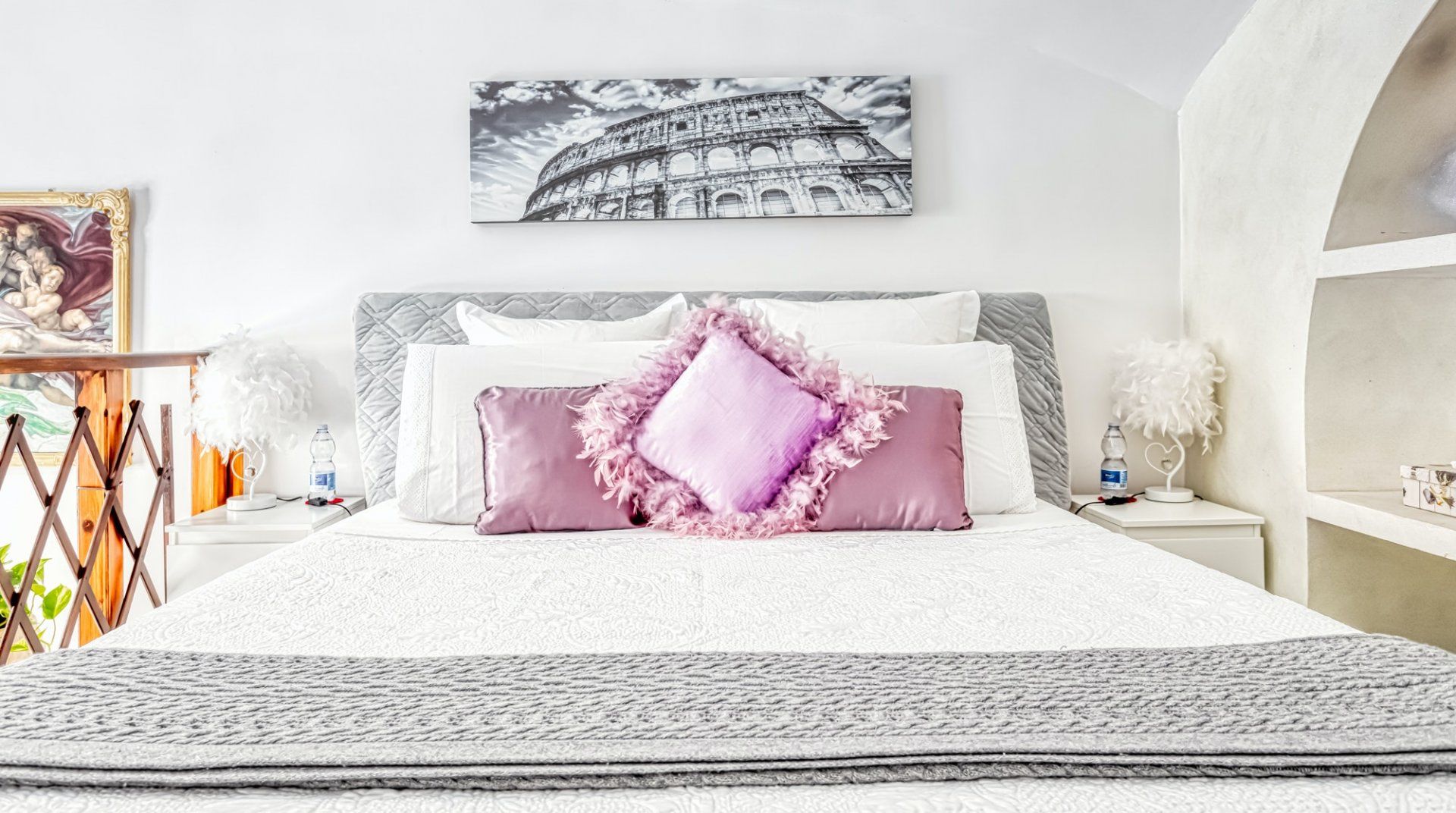 On a quiet street near San Giovanni in Laterano, this eclectic apartment offers a haven to return to after a day in the bustling centre. Though the neighbourhood is quiet, you’re still only a fifteen-minute stroll away from the Colosseum and Roman Forum. If you don’t fancy stretching your legs, the Manzoni metro station is a three-minute walk, putting all of Rome at your fingertips. This loft apartment is a mix of glamour and kitsch – think gilded mirrors, leopard-print throws and thick, red velvet curtains. Though the arched windows and exposed beam ceiling reassure that you’re in an old quarter of Rome. The eclectic fireplace set in a traditional mantle is a nice homely touch too.