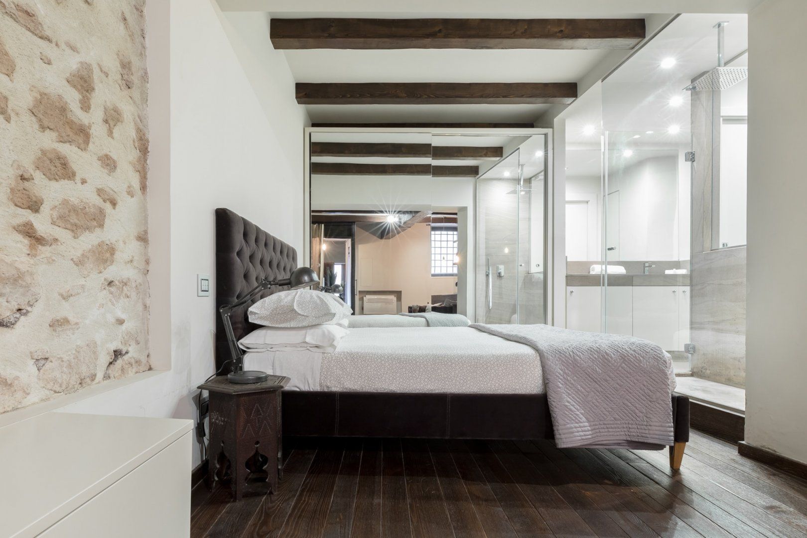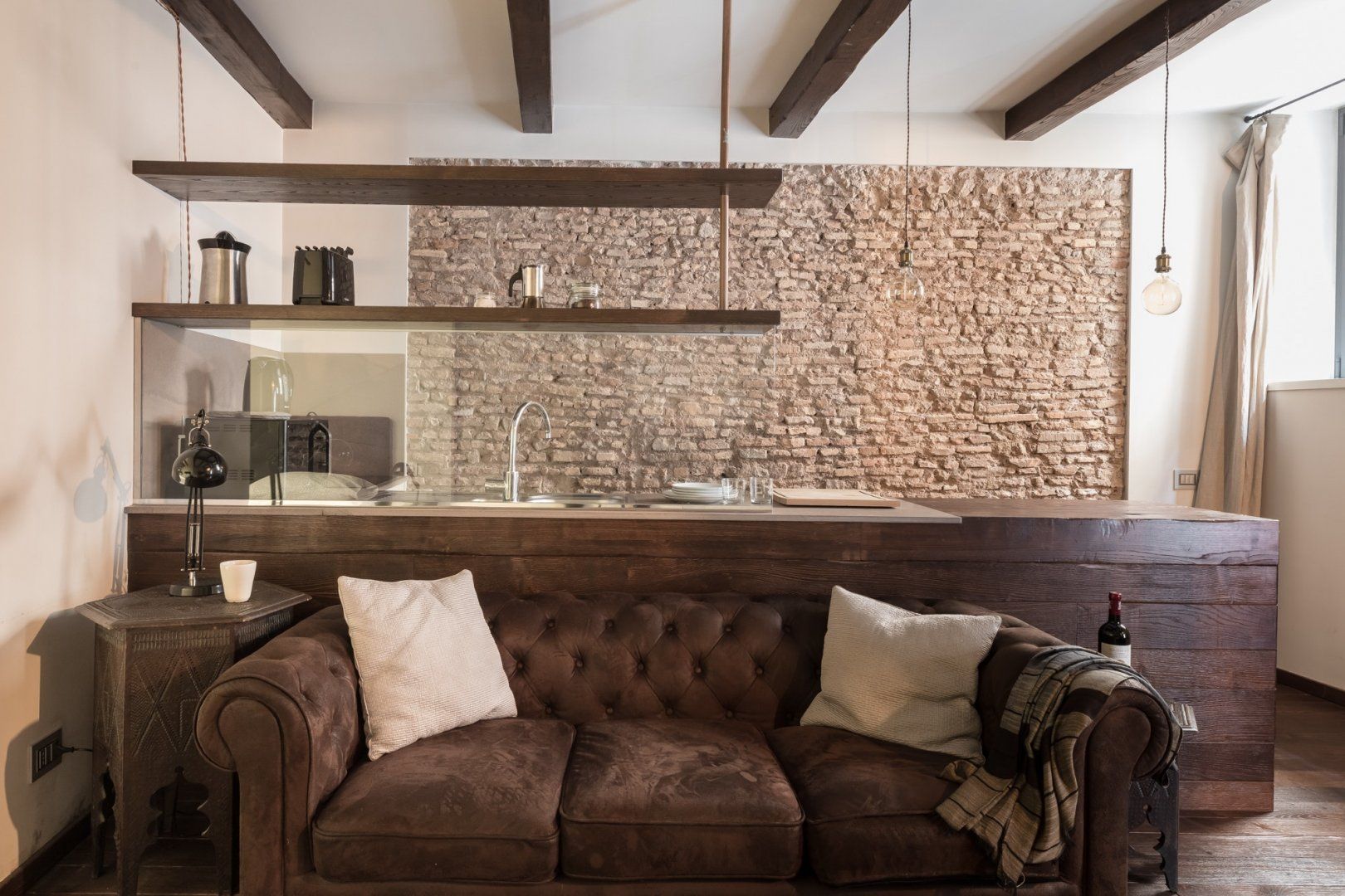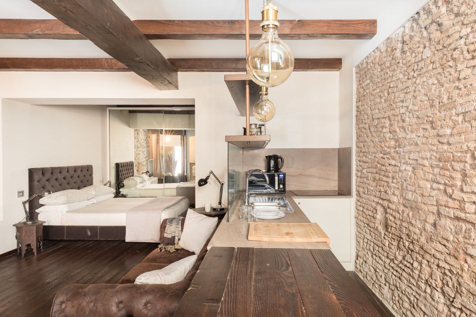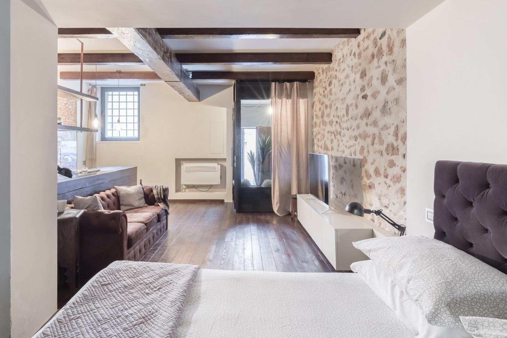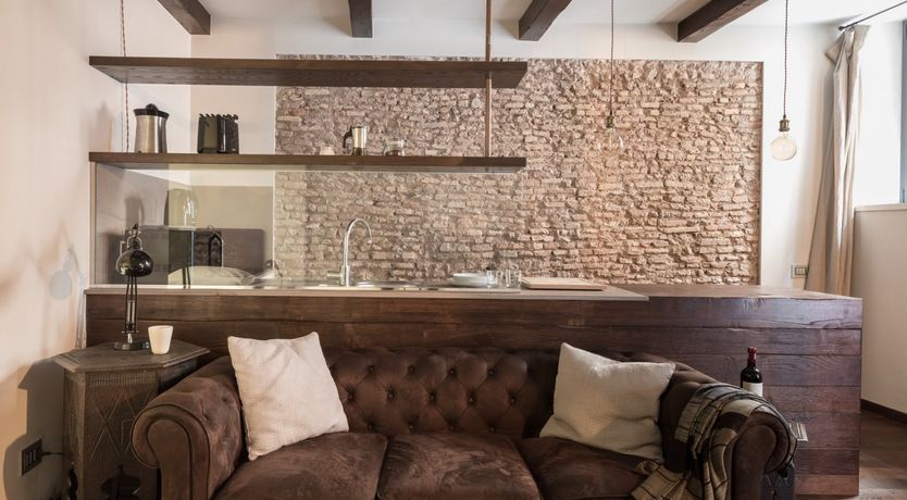 In a quiet backstreet just off the legendary Via Vittorio Veneto, this apartment would make an excellent retreat for a couple visiting Rome. It’s an eight-minute walk to the Spanish Steps, and less than ten minutes on foot to the Trevi Fountain. The elegant decor of this studio apartment will certainly have you tossing three coins in the fountain, hoping to return. Exposed beams and stonework create a sense of the building’s history. The stylish kitchen area with its sleek breakfast bar illuminated by Edison bulbs is particularly spacious for a studio in central Rome. Although there’s no door between the bedroom area and living area, an archway and the generally large floorspace makes it feel like a one-bed rather than a studio.