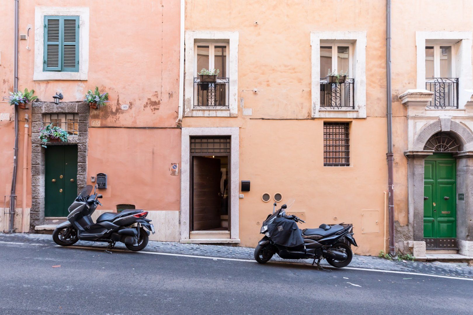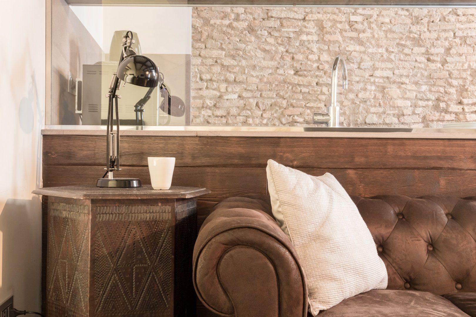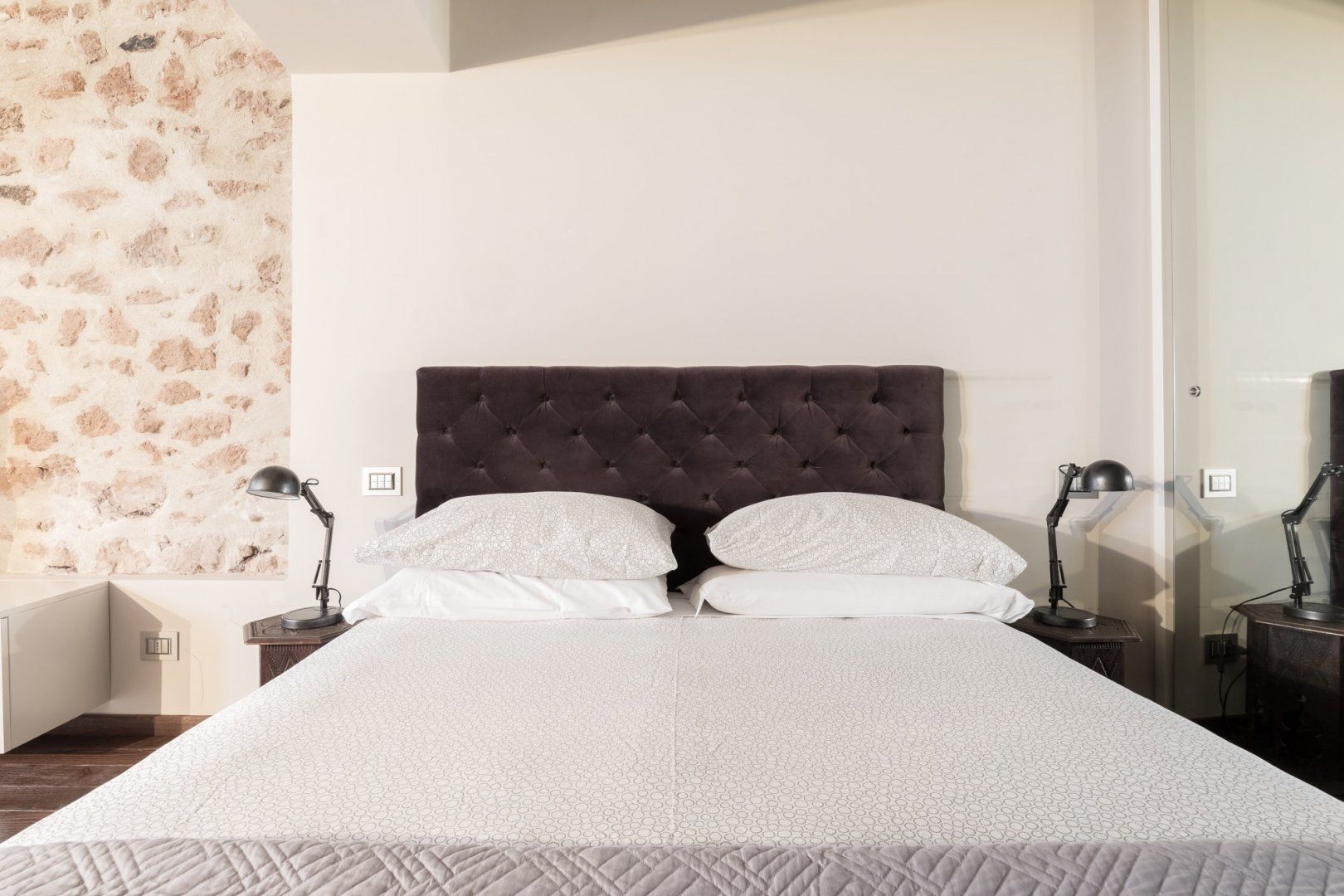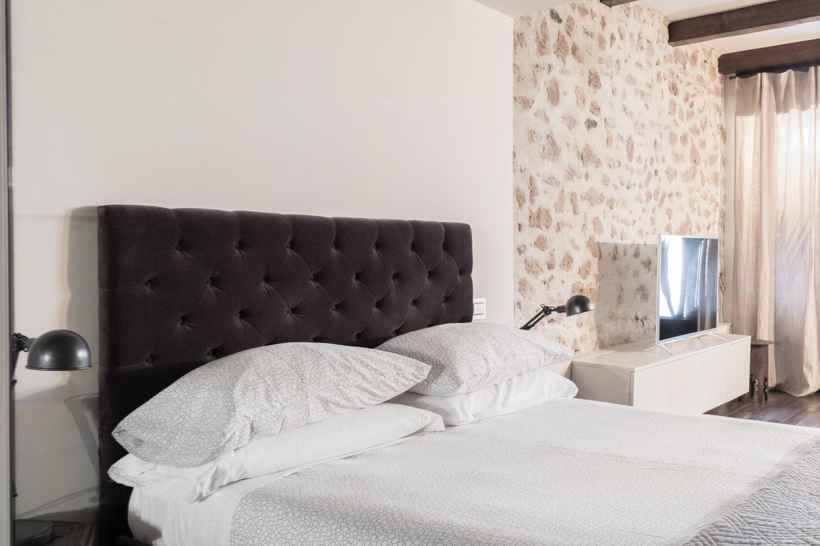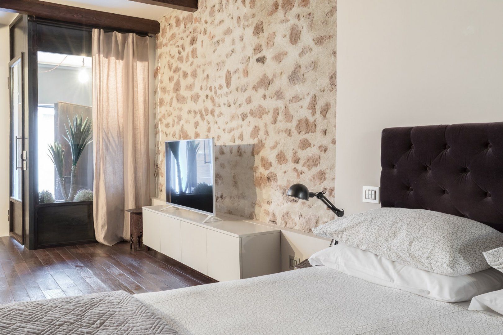 In a quiet backstreet just off the legendary Via Vittorio Veneto, this apartment would make an excellent retreat for a couple visiting Rome. It’s an eight-minute walk to the Spanish Steps, and less than ten minutes on foot to the Trevi Fountain. The elegant decor of this studio apartment will certainly have you tossing three coins in the fountain, hoping to return. Exposed beams and stonework create a sense of the building’s history. The stylish kitchen area with its sleek breakfast bar illuminated by Edison bulbs is particularly spacious for a studio in central Rome. Although there’s no door between the bedroom area and living area, an archway and the generally large floorspace makes it feel like a one-bed rather than a studio.