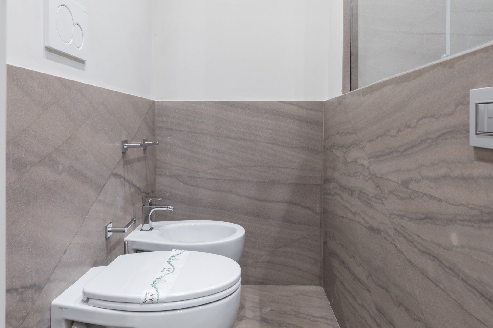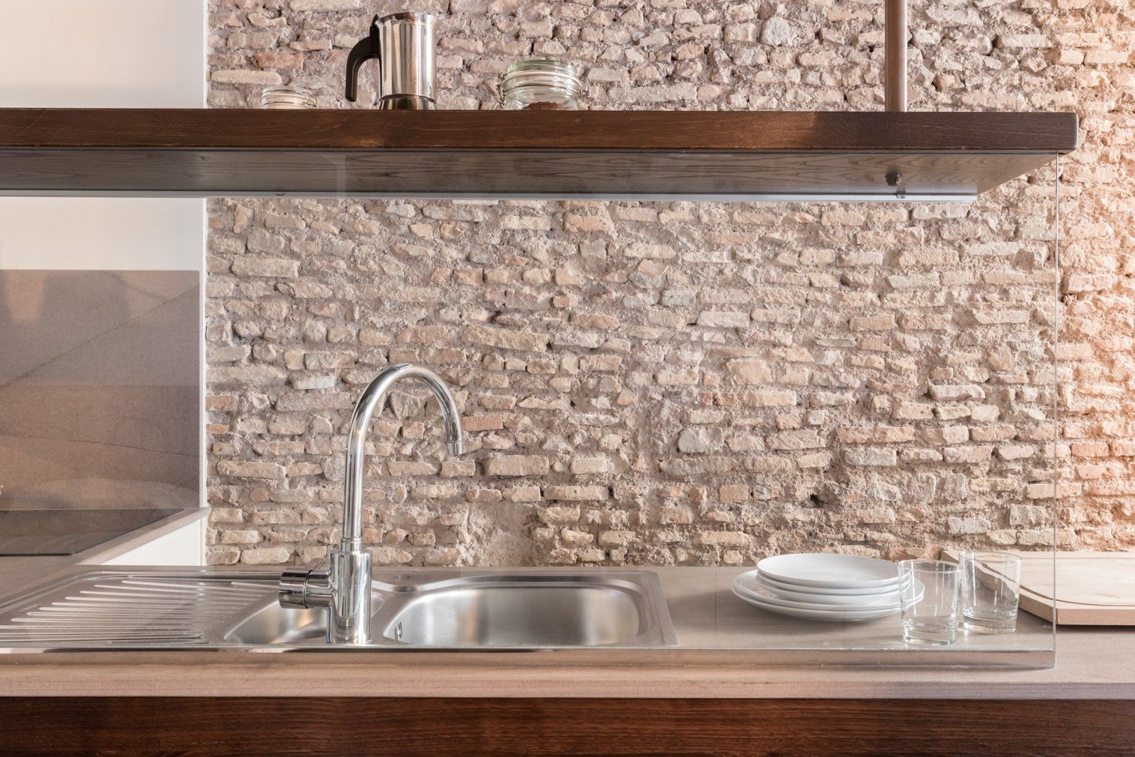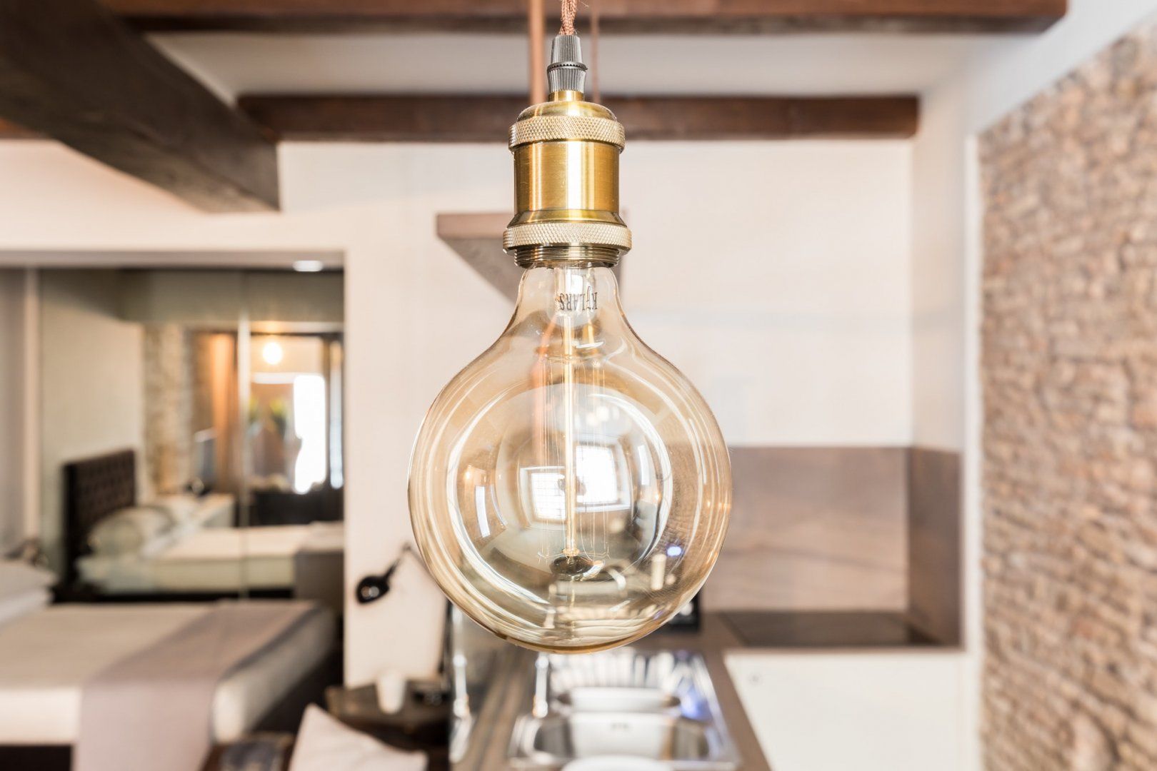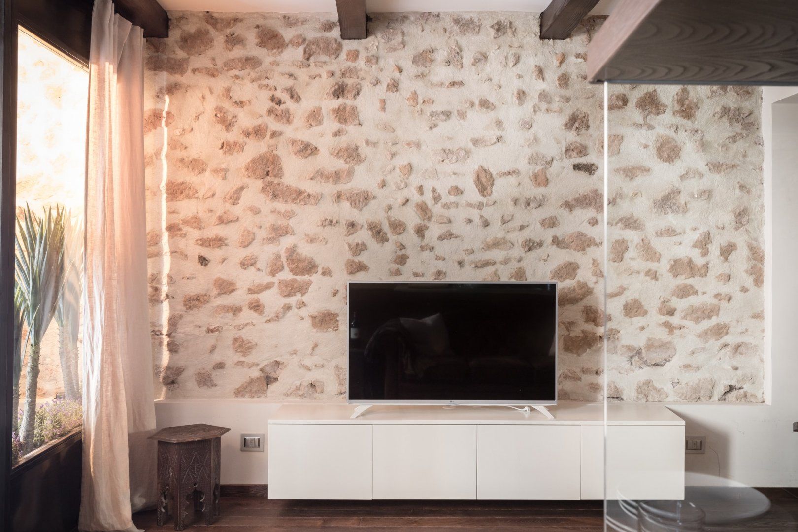 In a quiet backstreet just off the legendary Via Vittorio Veneto, this apartment would make an excellent retreat for a couple visiting Rome. It’s an eight-minute walk to the Spanish Steps, and less than ten minutes on foot to the Trevi Fountain. The elegant decor of this studio apartment will certainly have you tossing three coins in the fountain, hoping to return. Exposed beams and stonework create a sense of the building’s history. The stylish kitchen area with its sleek breakfast bar illuminated by Edison bulbs is particularly spacious for a studio in central Rome. Although there’s no door between the bedroom area and living area, an archway and the generally large floorspace makes it feel like a one-bed rather than a studio.