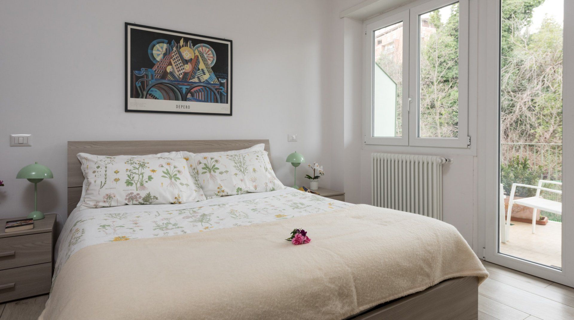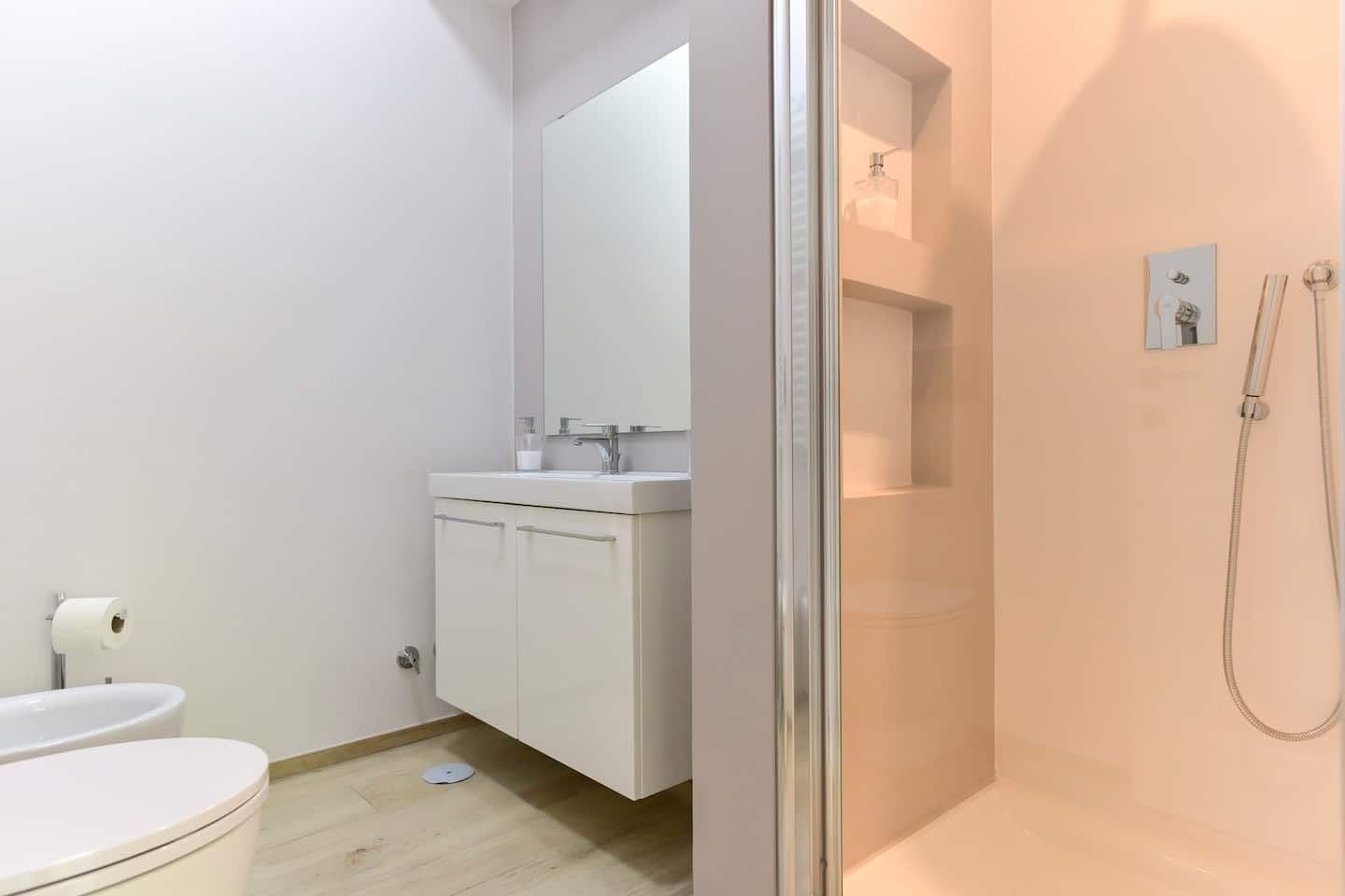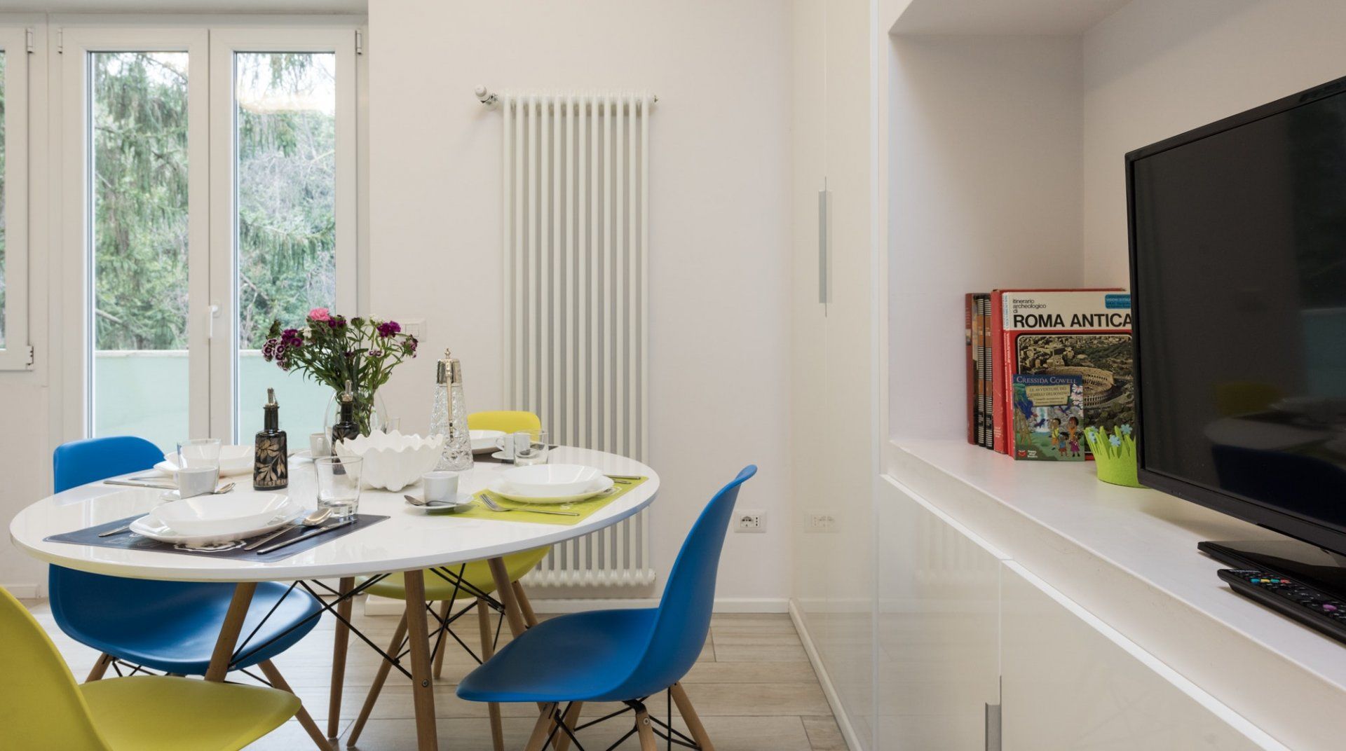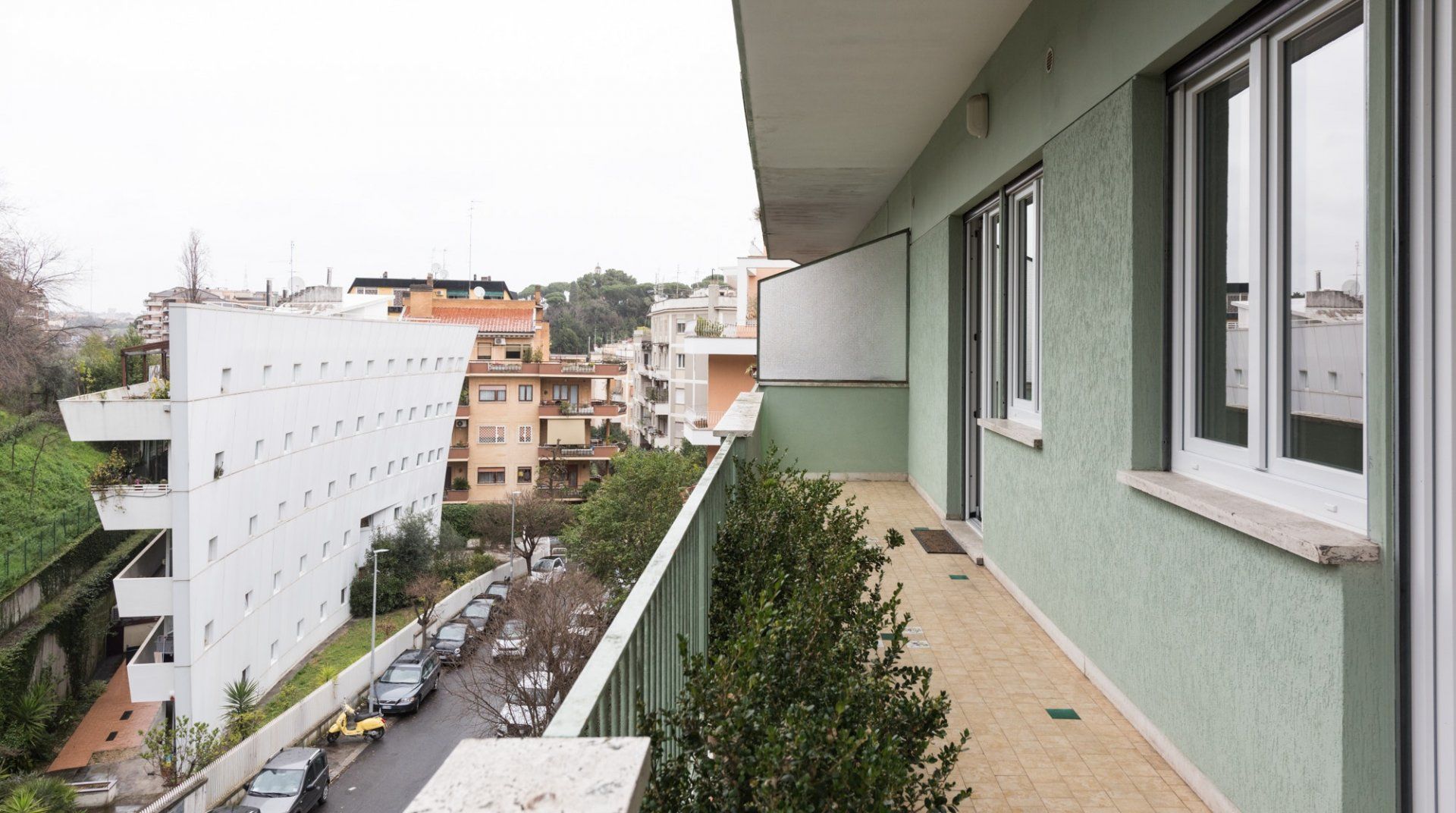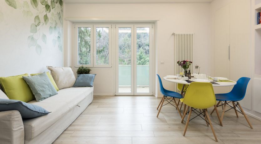 The word simple is often used as a putdown, but this apartment in the Rome suburbs is a great example of pared-back design being more than the sum of its parts. The interior is dominated by muted neutrals and light pastel colours, but it feels bright and instantly welcoming. It certainly helps that there's a lot of natural light coming in through the glass doors, which in turn lead out to a long balcony. There's seating out here, as well as a view of the green hillside which is rather peaceful — especially for the Italian capital. The same could be said for the surrounding suburb of Aurelio, which feels a world away from the touristy haunts but is actually quite close when it comes down to it. You can go from your front door to the Pantheon in twenty-five minutes via public transit if you put your mind to it. The sprawling grounds of Villa Doria Pamphilj can be reached in ten minutes on foot, too.