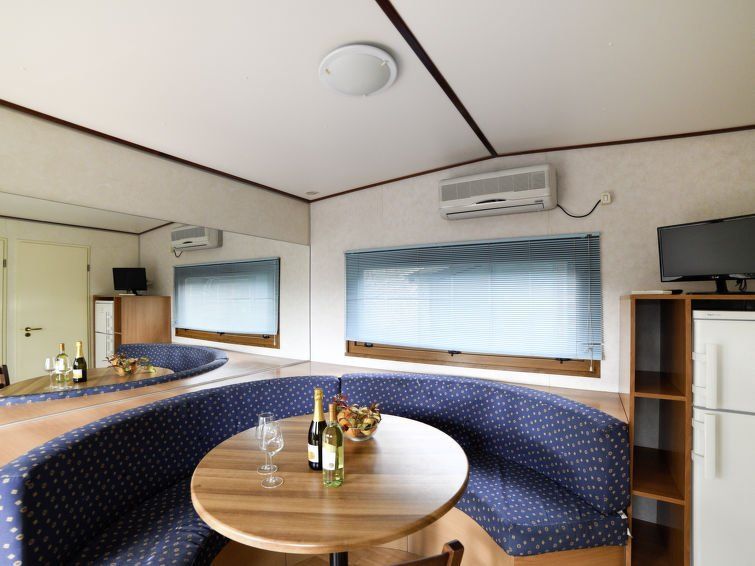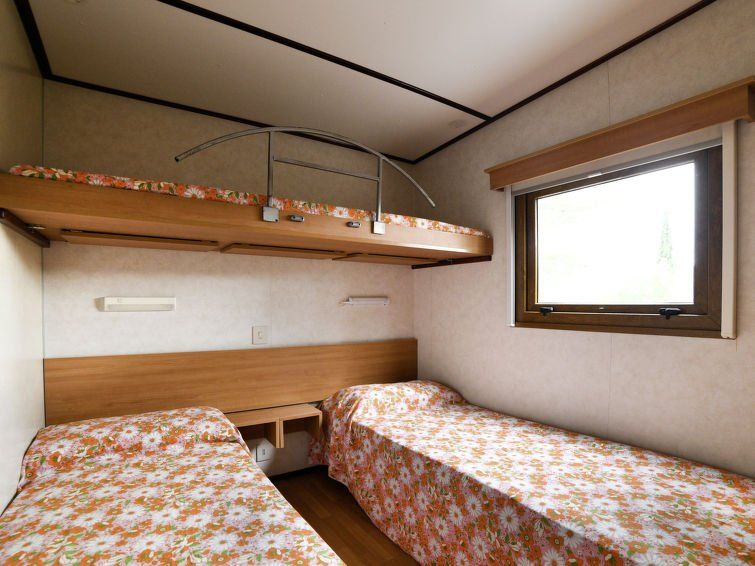 "Mobilhome E (AEG403)", 3-room mobile home 30 m2. Simple furnishings: living/dining room with dining nook and TV. 1 room with 1 french bed (160 cm). 1 room with 2 beds (70 cm), 1 x 1 bunk beds. Kitchenette (4 gas rings, freezer). Shower/WC. Electric heating, air-conditioning. Patio 12 m2.
