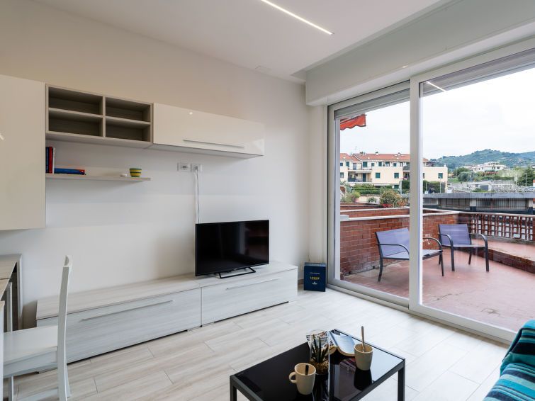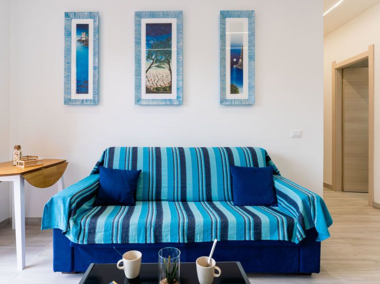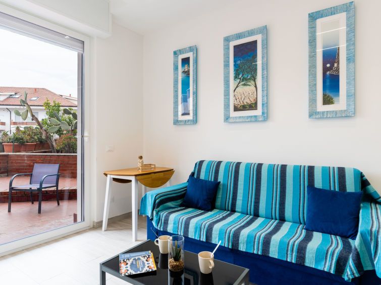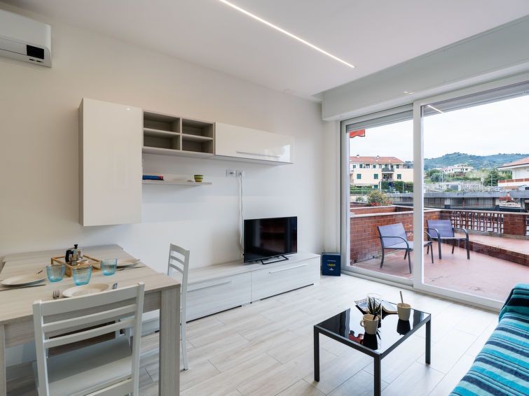 "Diano Center Manuela", 2-room apartment 50 m2 on 1st floor. Bright, renovated in 2023, practical and modern furnishings: living/dining room with 1 double sofabed (160 cm, length 200 cm), TV. Exit to the terrace. 1 double bedroom. Kitchenette (oven, dishwasher, 4 induction hot plates, toaster, kettle).