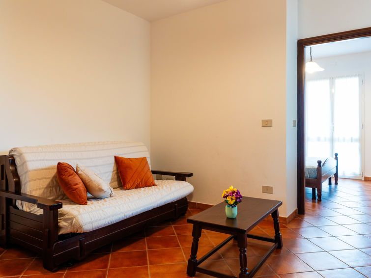 "La Vista (DIA142)", 4-room apartment 75 m2 on 1st floor. Rustic furnishings: living/sleeping room with 1 double sofabed and satellite TV. 1 room with 1 french bed (160 cm). Exit to the balcony. 1 room with 2 beds (80 cm). Kitchen-/living room (oven, 4 gas rings, toaster, kettle, freezer, electric coffee machine) with dining table.