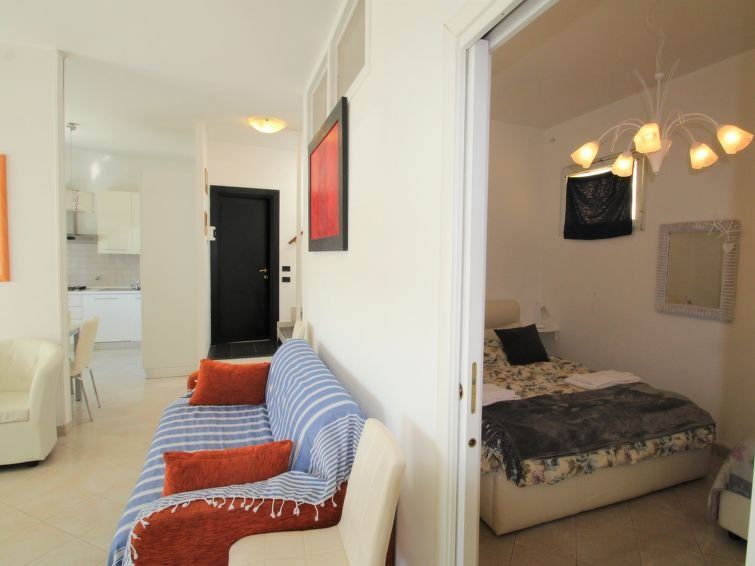 2-room apartment 85 m2 on 1st floor. Practical and modern furnishings: upper floor: living/sleeping room with 1 double sofabed, TV and electric shutters. Exit to the balcony. 1 room with rooflight with 1 bed and 1 double bed. Open kitchen (4 hot plates, oven, kettle) with small dining table.
