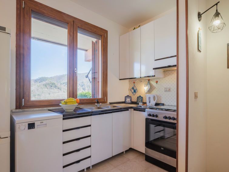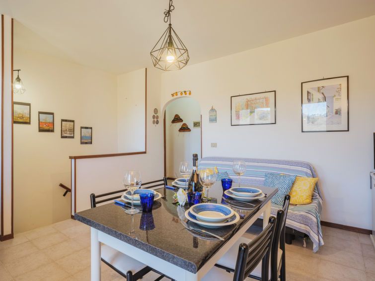 2-room apartment 60 m2, on the ground floor. Practical and cosy furnishings: open living/dining room with TV and flat screen. Exit to the terrace. Kitchenette (4 hot plates, oven, toaster, kettle, electric coffee machine). Sep. WC. No heating option. On the lower ground floor: 1 double bedroom.