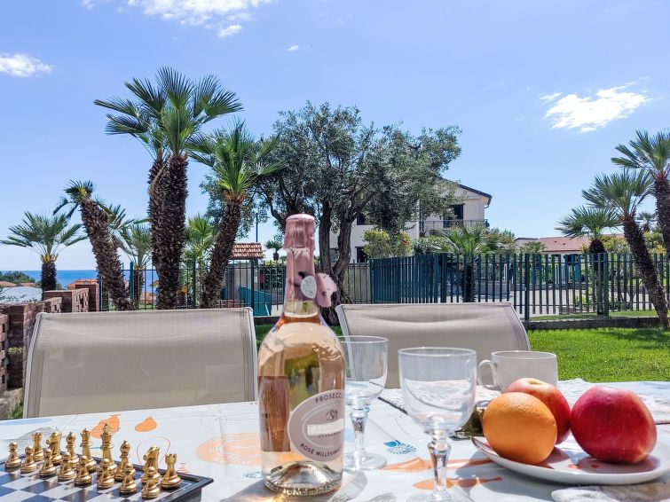 "Le Margherite (SLR264)", 4-room apartment 70 m2, on the ground floor. Living room with dining table and TV. Exit to the terrace. 1 room with 1 double bed (160 cm). Exit to the garden. 1 room with 1 double fold-away bed (140 cm). 1 room with 1 x 2 bunk beds (80 cm). Open kitchen (4 gas rings, toaster, microwave, freezer, electric coffee machine).