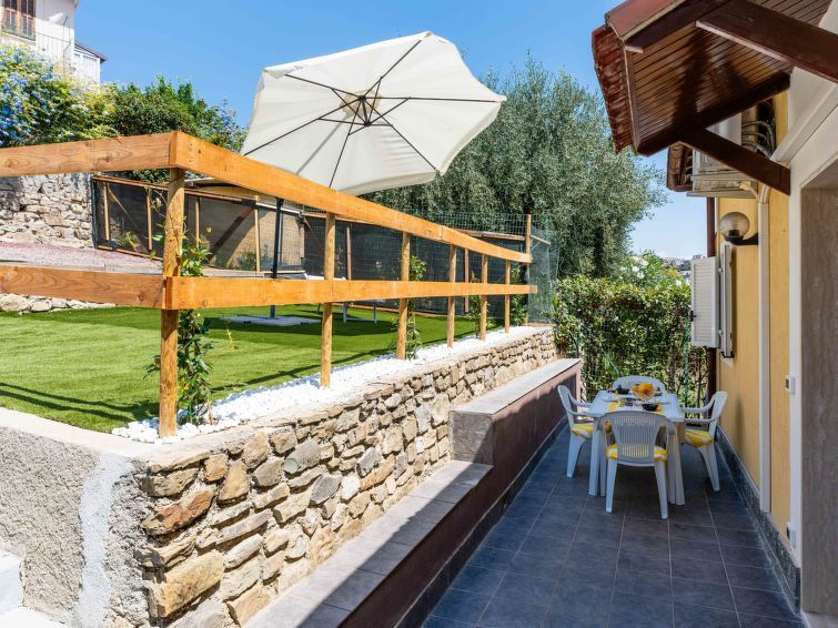 "casa Mimosa", 2-room house 60 m2, on the ground floor. Tasteful and cosy furnishings: living/dining room with 1 double sofabed (160 cm, length 200 cm). Exit to the garden. 1 double bedroom. Open kitchen (oven, dishwasher, 4 gas rings, toaster, kettle). Shower/bidet/WC. Gas heating, air-conditioning, forced-air heating.